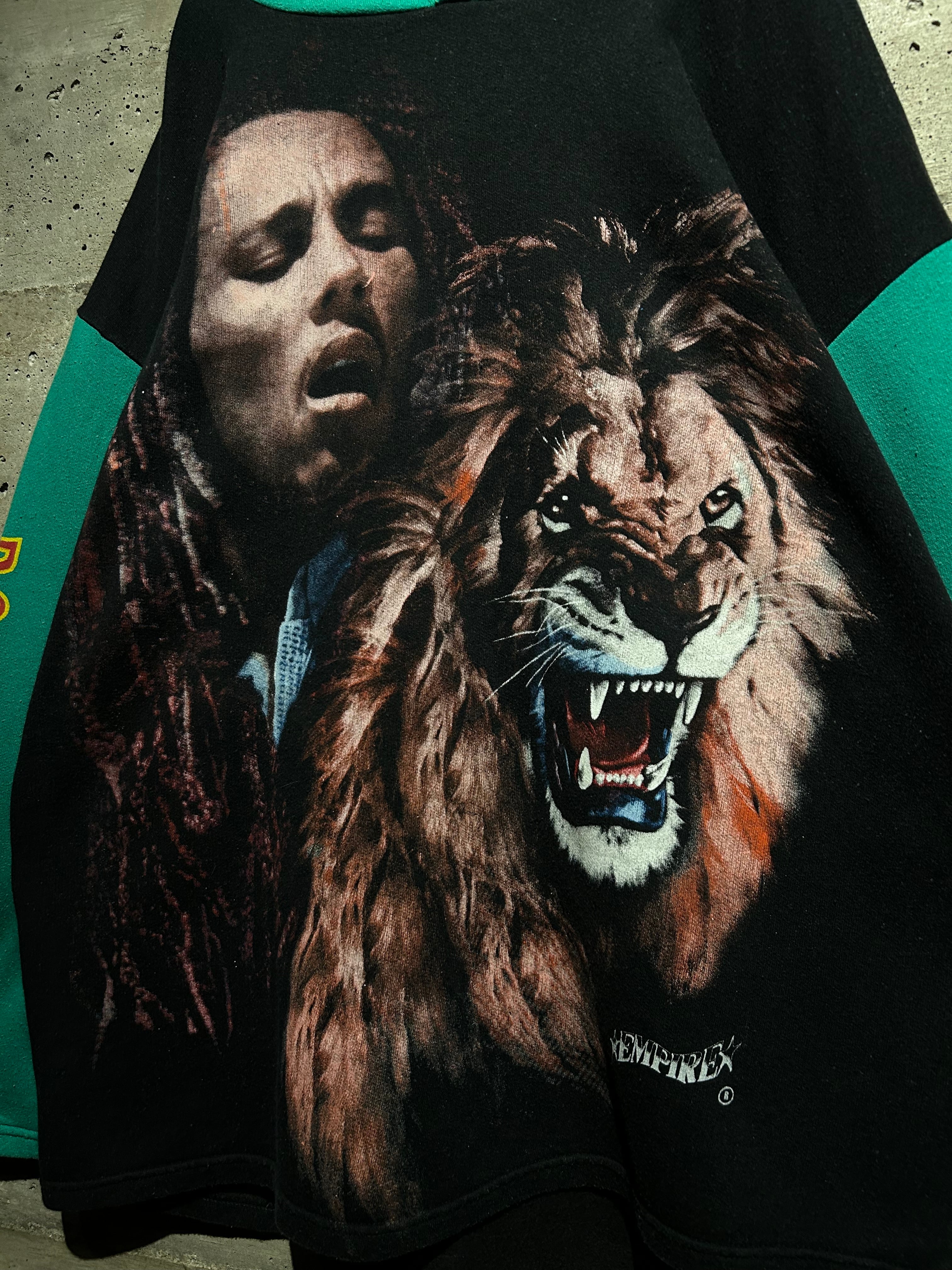 フロントにはBob Marleyのポートレートとライオンモチーフを大胆にプリント。何度か買い付けを行なっているラインですが、中でも最高峰レベルで洒落が効き、ブートレグならではのグラフィックです。