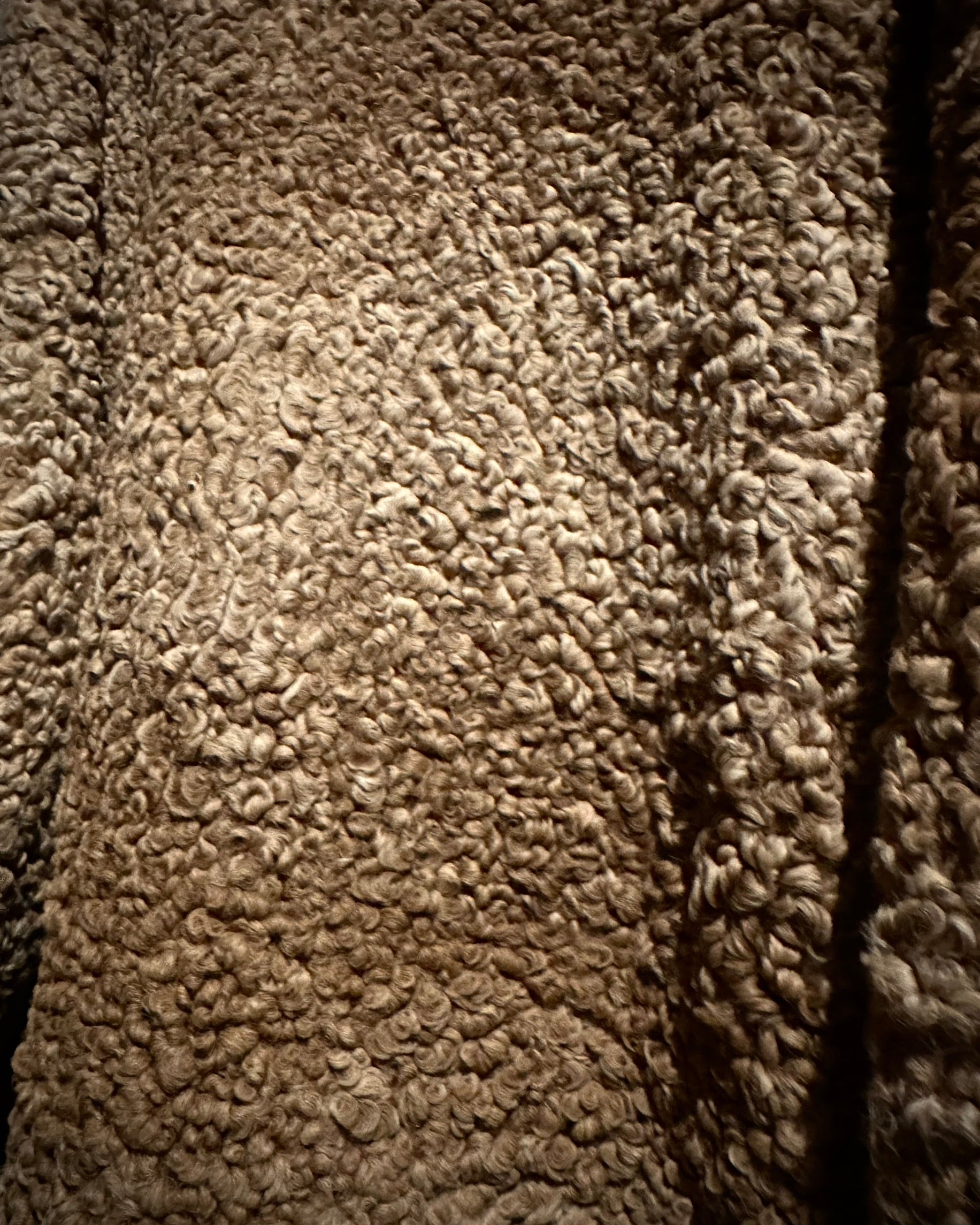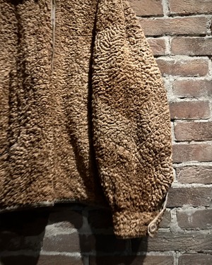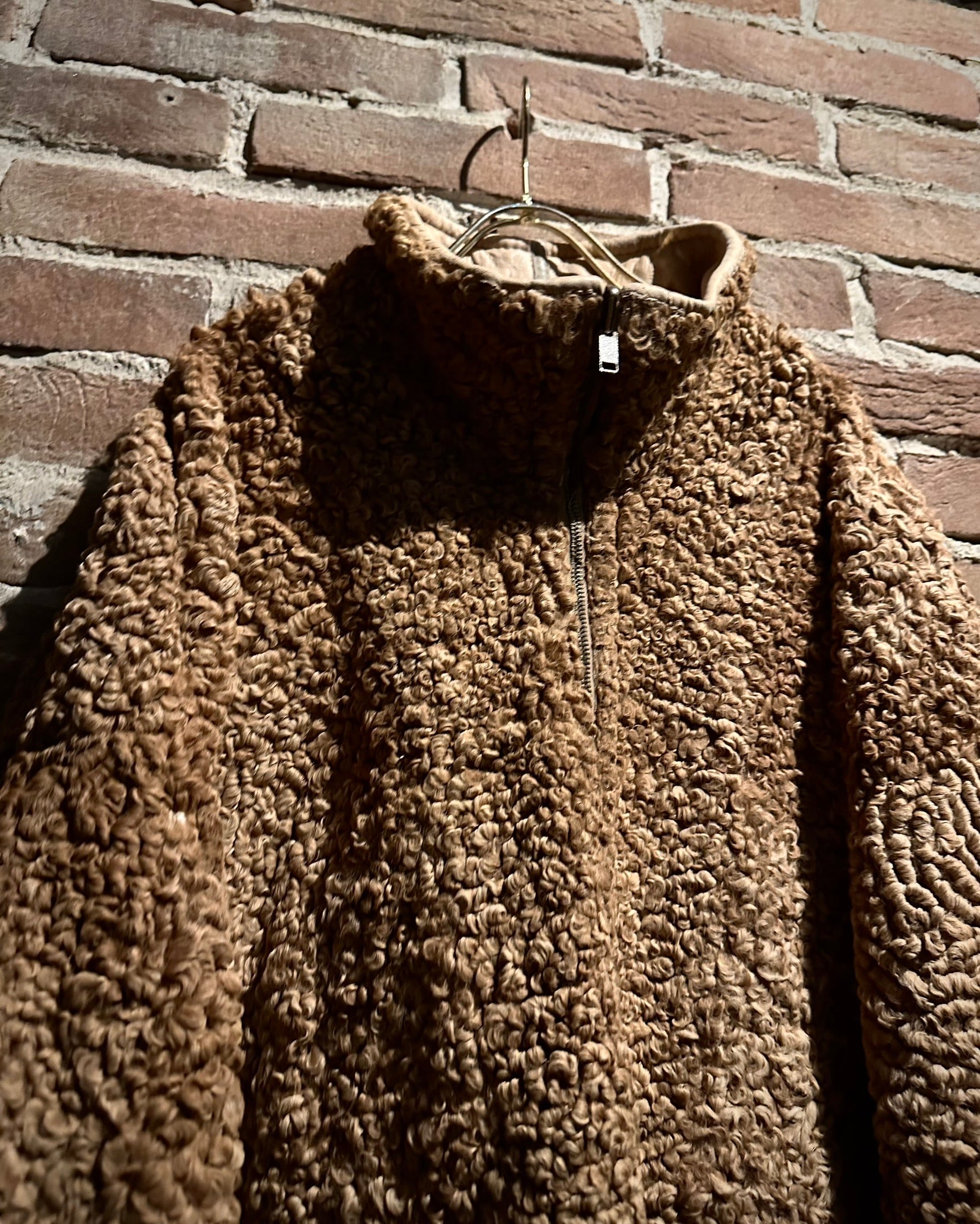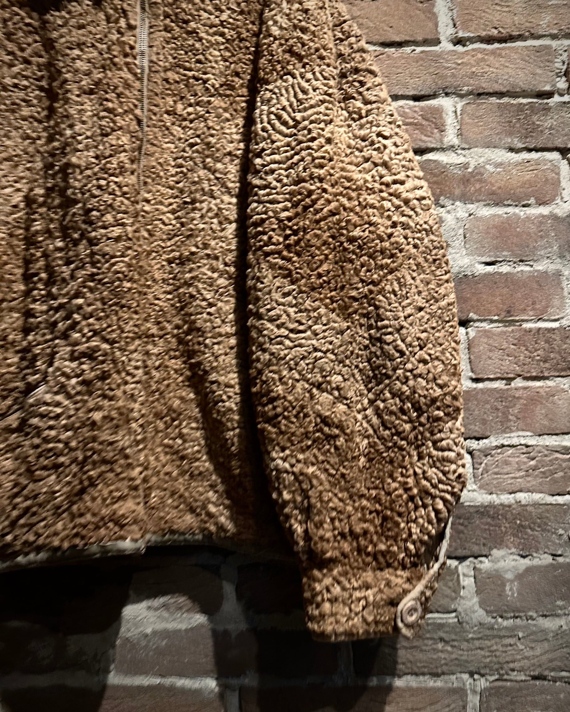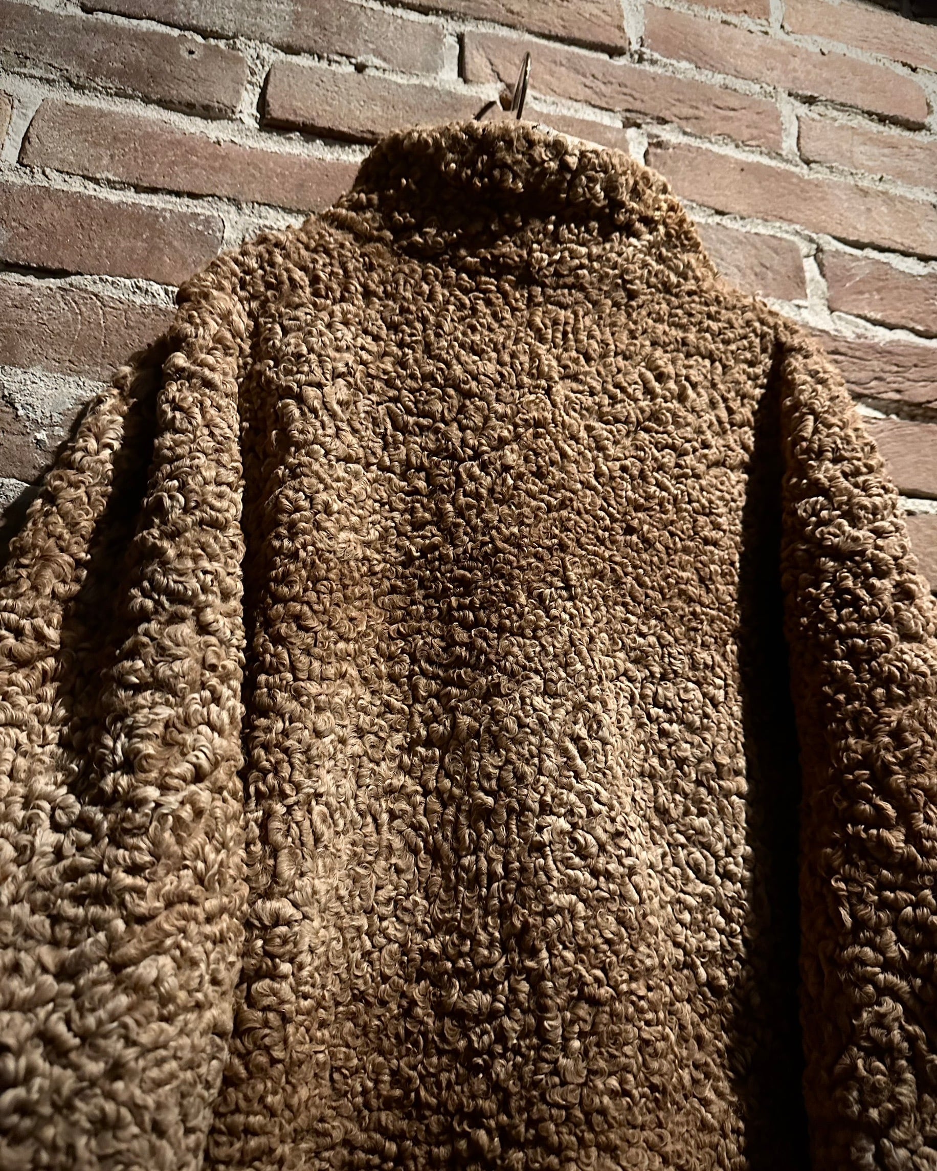 表面には経年変化をしっかりと感じさせるリアルレザーを使用。シボ感のある革質と、切り替えで組まれたパネルデザインが奥行きのある表情を演出します。裏面にはカーリーヘア特有のくるっとした毛並みが全面に広がり、自然なグラデーションも相まって、視覚的にも温かみのあるルックスに仕上がっています。