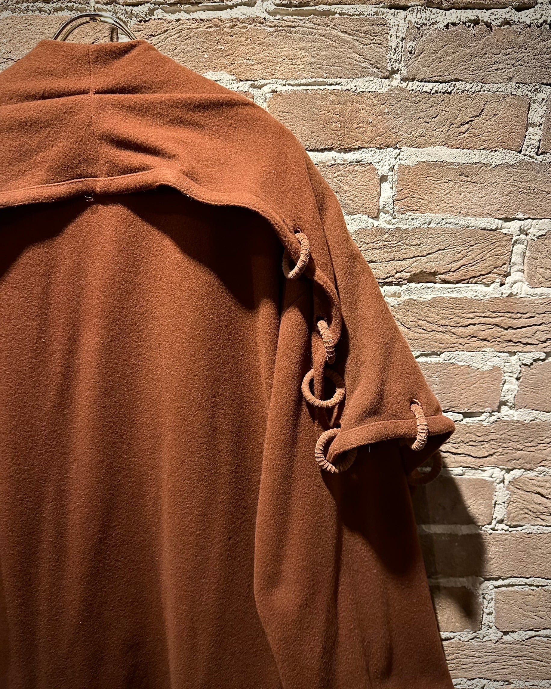 肩にかけて大きく折り返された生地が美しいドレープを生み、落ち着いたカラーリングながら雰囲気はムンムン。随所に配されたループディテールもアクセントとなり、他にはない独特なルックスに仕上がっています。