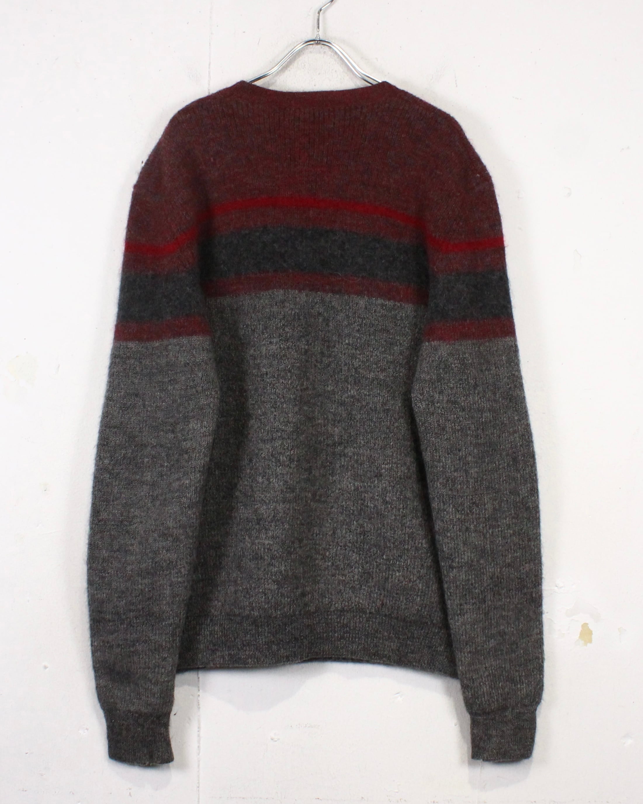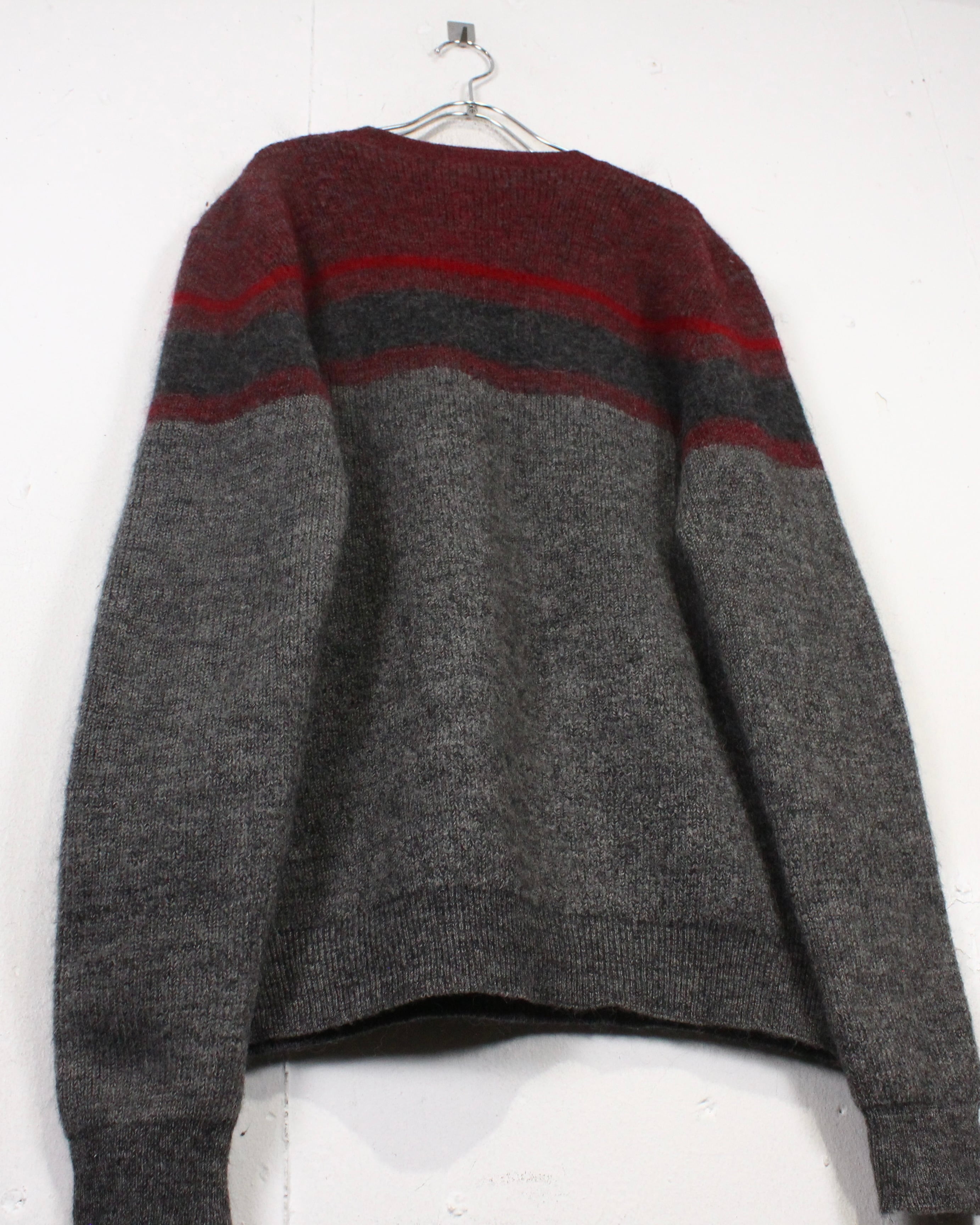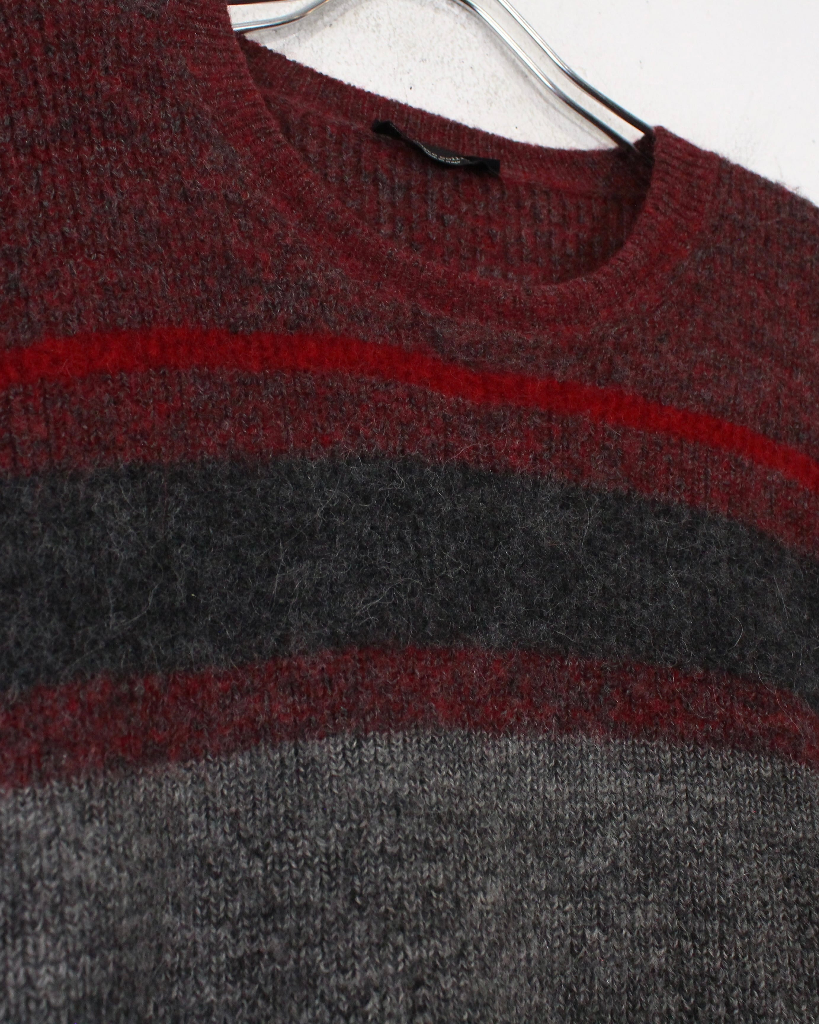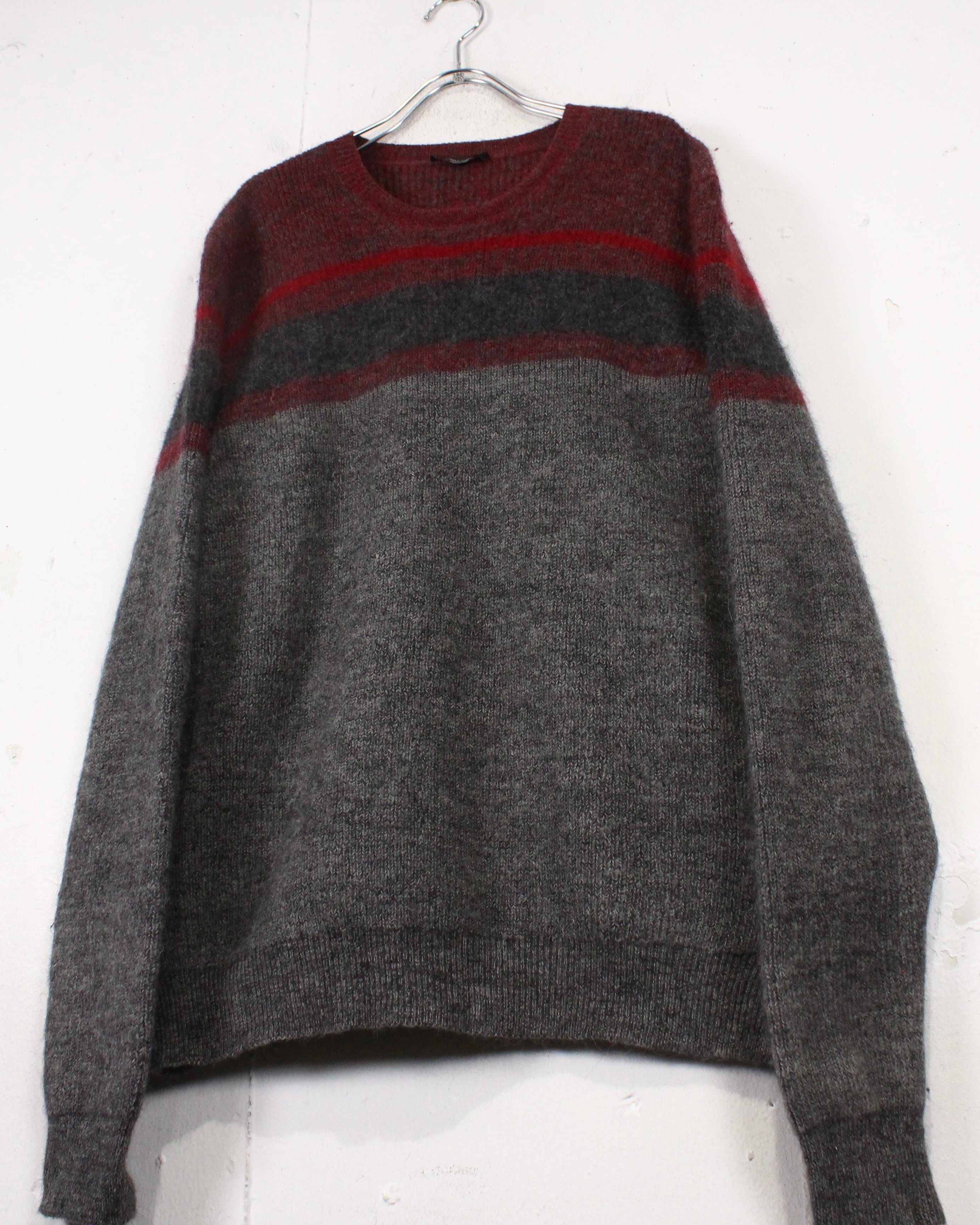 柔らかく起毛感のあるウールニットを用いたクルーネックの1着。グレーをベースに、ボルドーとダークグレーのラインが走る落ち着いた配色で、派手さは抑えつつ、確かな存在感を残すバランス感が非常に洒落てます。