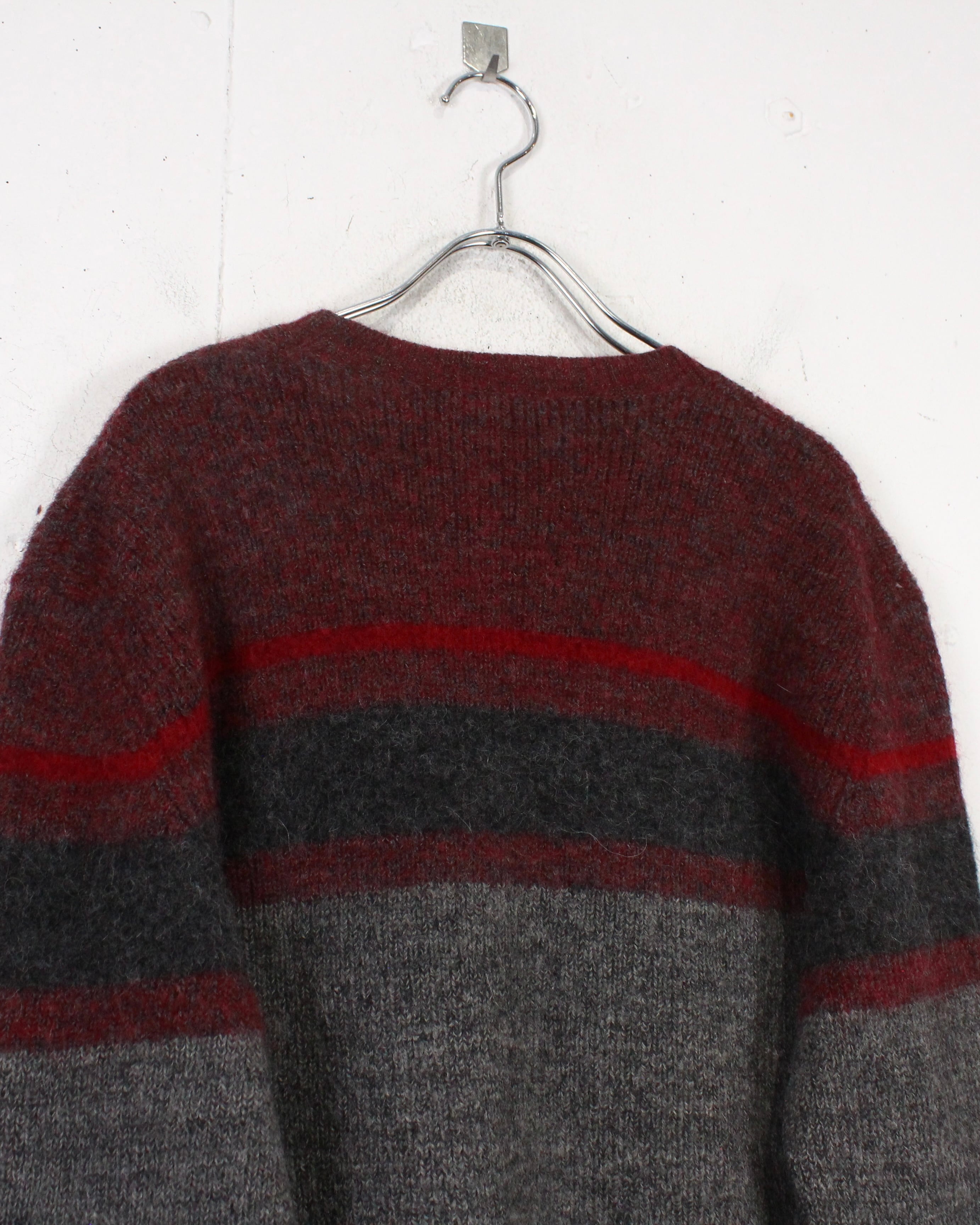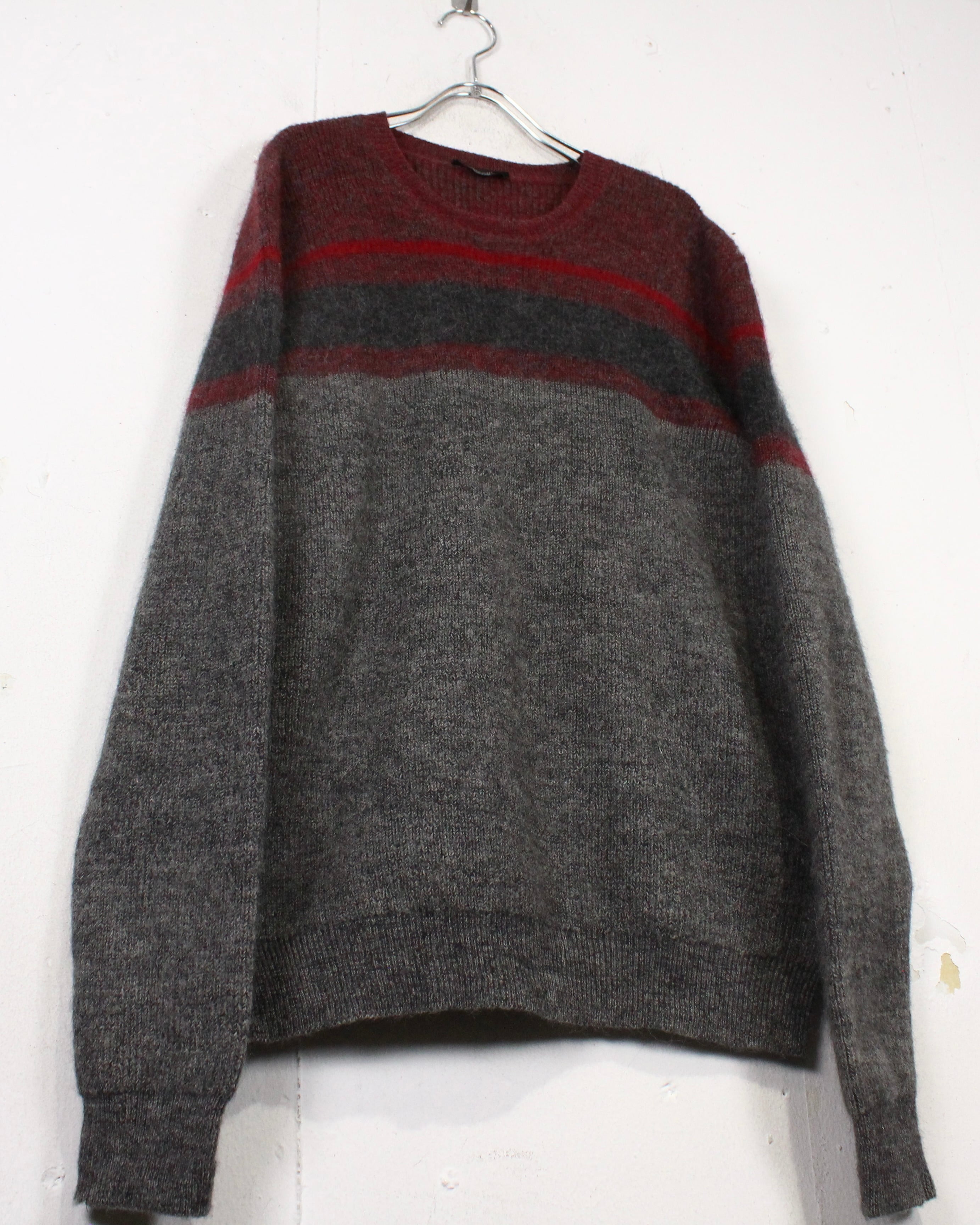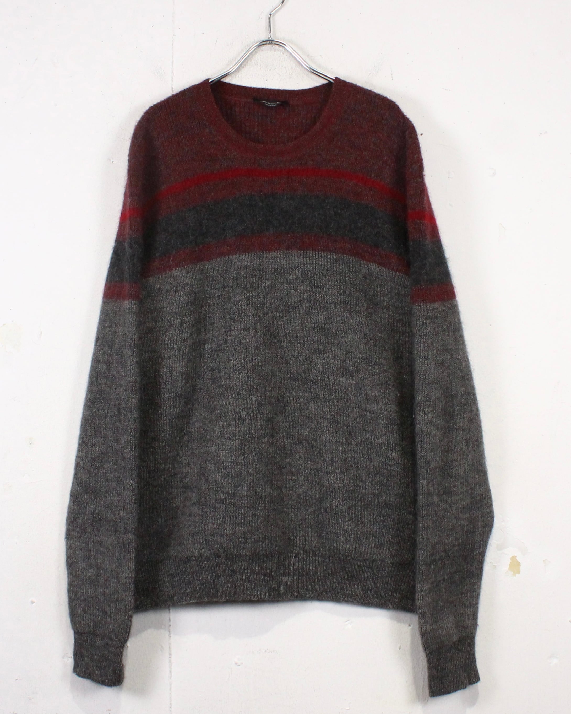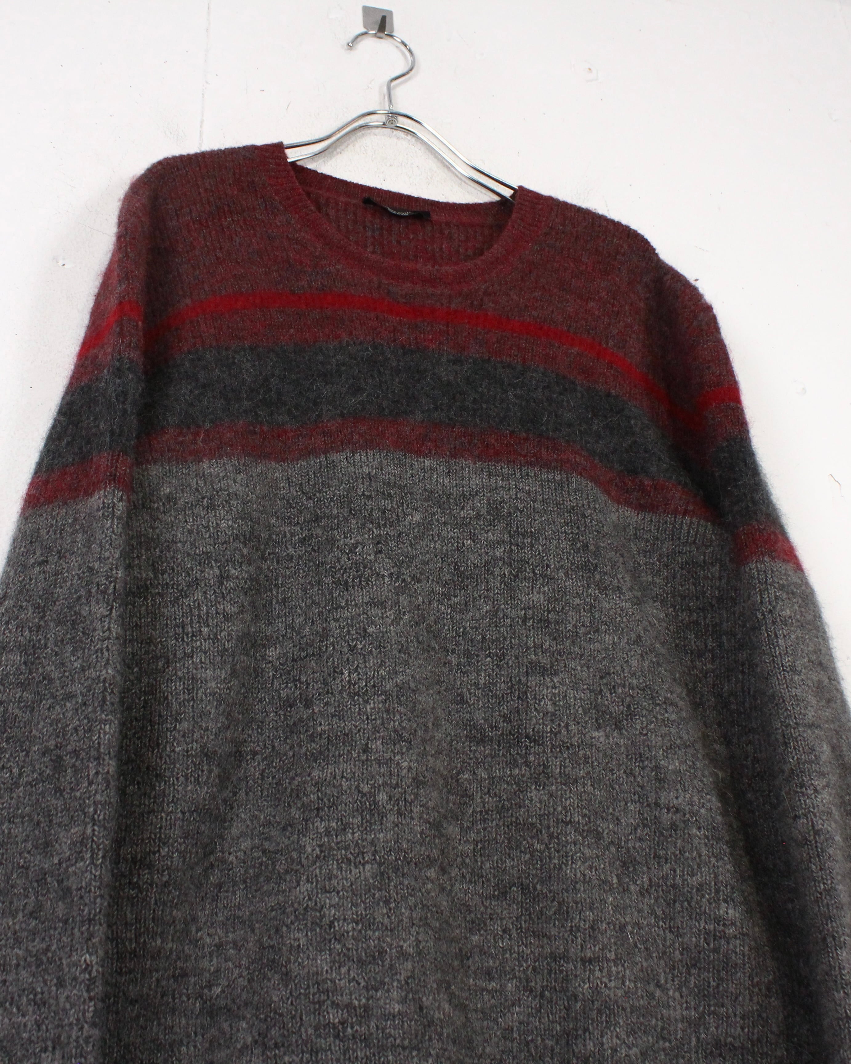 柔らかく起毛感のあるウールニットを用いたクルーネックの1着。グレーをベースに、ボルドーとダークグレーのラインが走る落ち着いた配色で、派手さは抑えつつ、確かな存在感を残すバランス感が非常に洒落てます。
