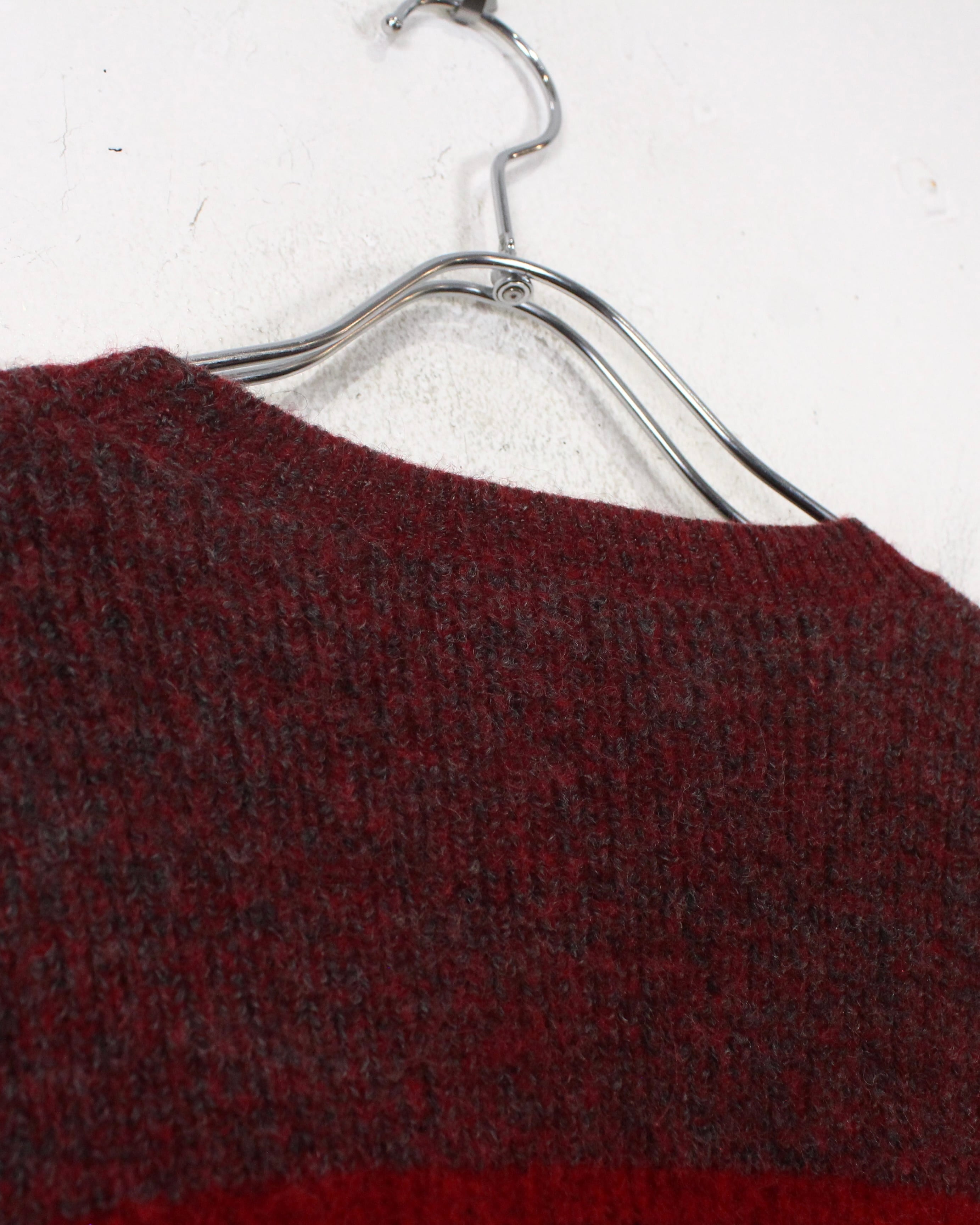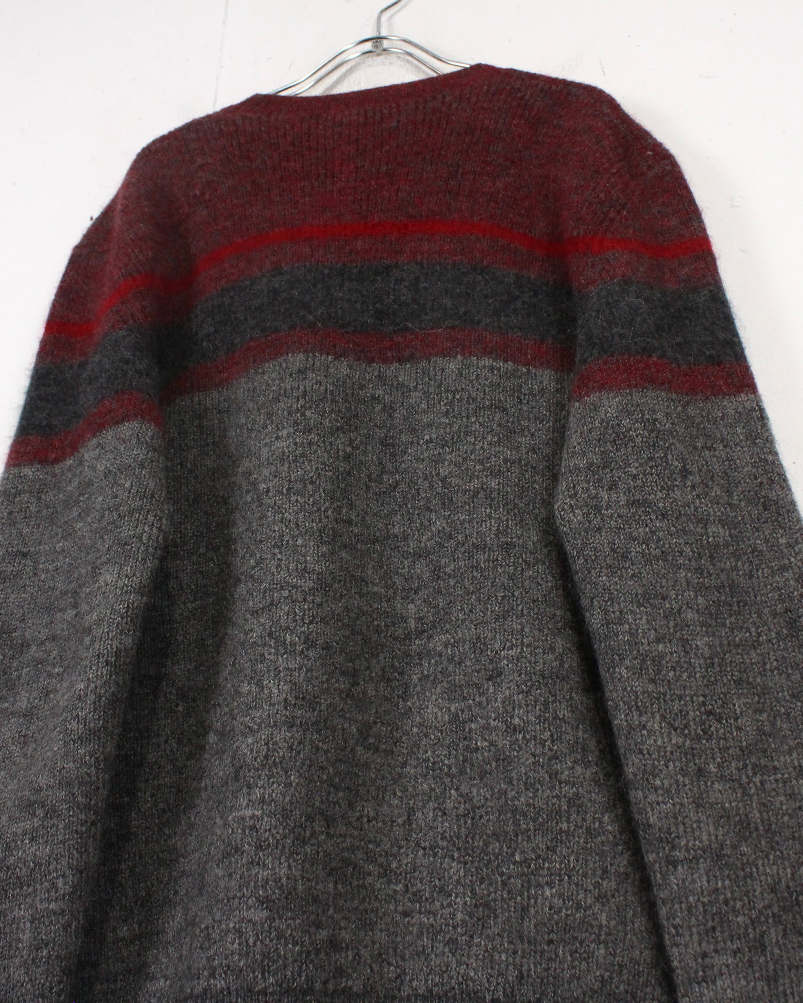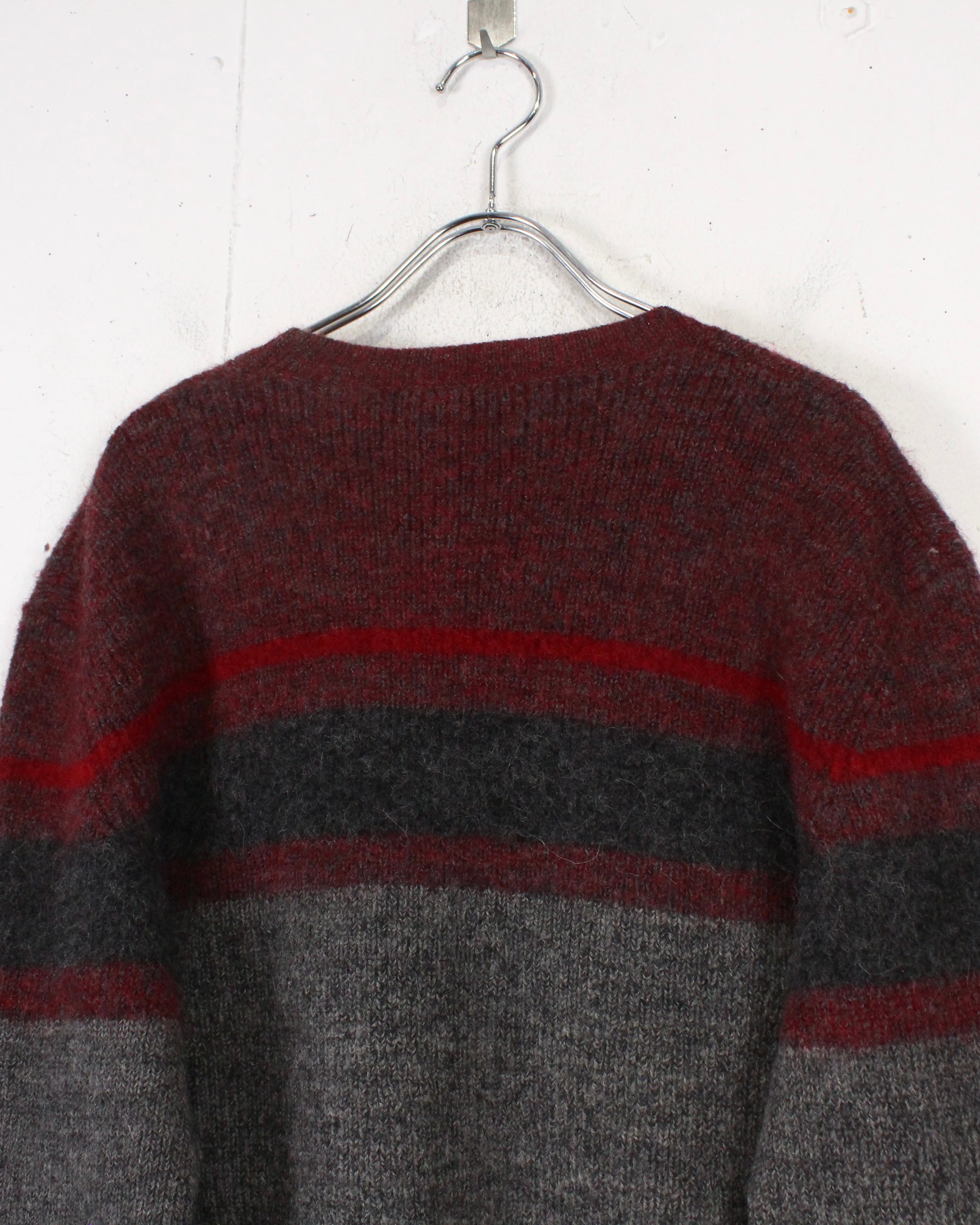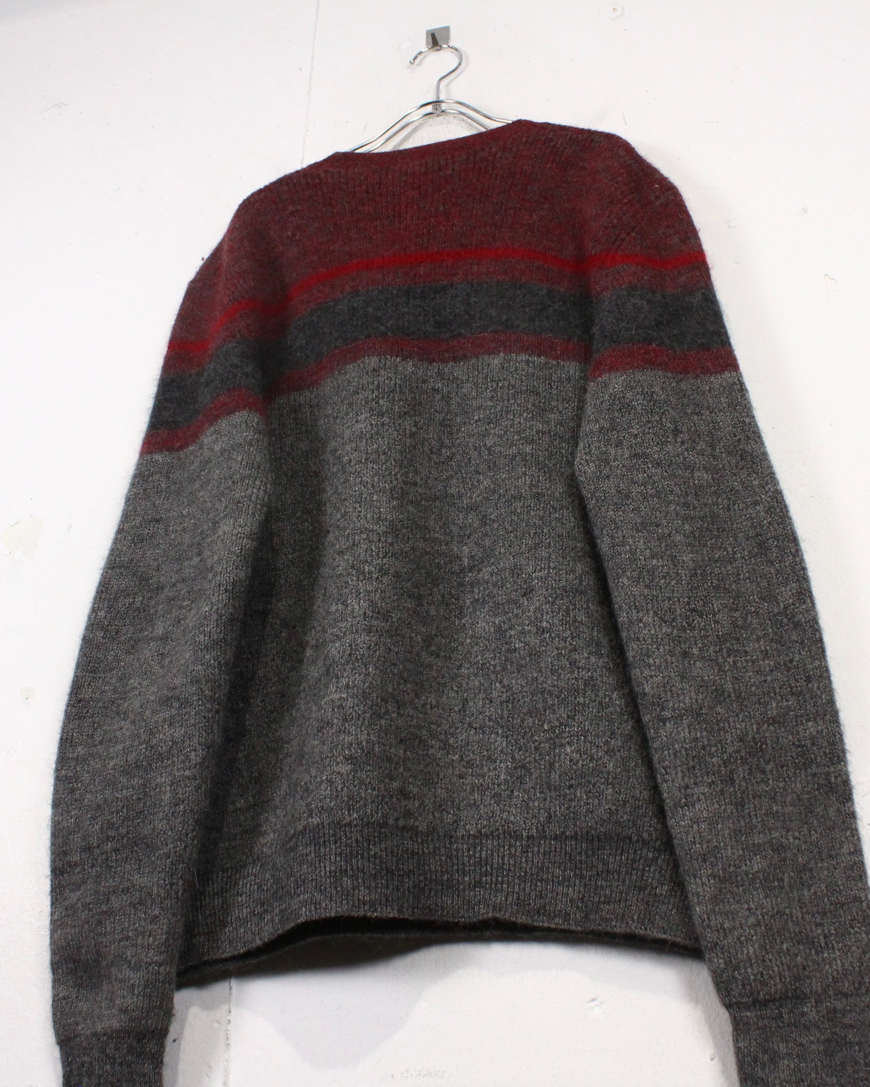 柔らかく起毛感のあるウールニットを用いたクルーネックの1着。グレーをベースに、ボルドーとダークグレーのラインが走る落ち着いた配色で、派手さは抑えつつ、確かな存在感を残すバランス感が非常に洒落てます。