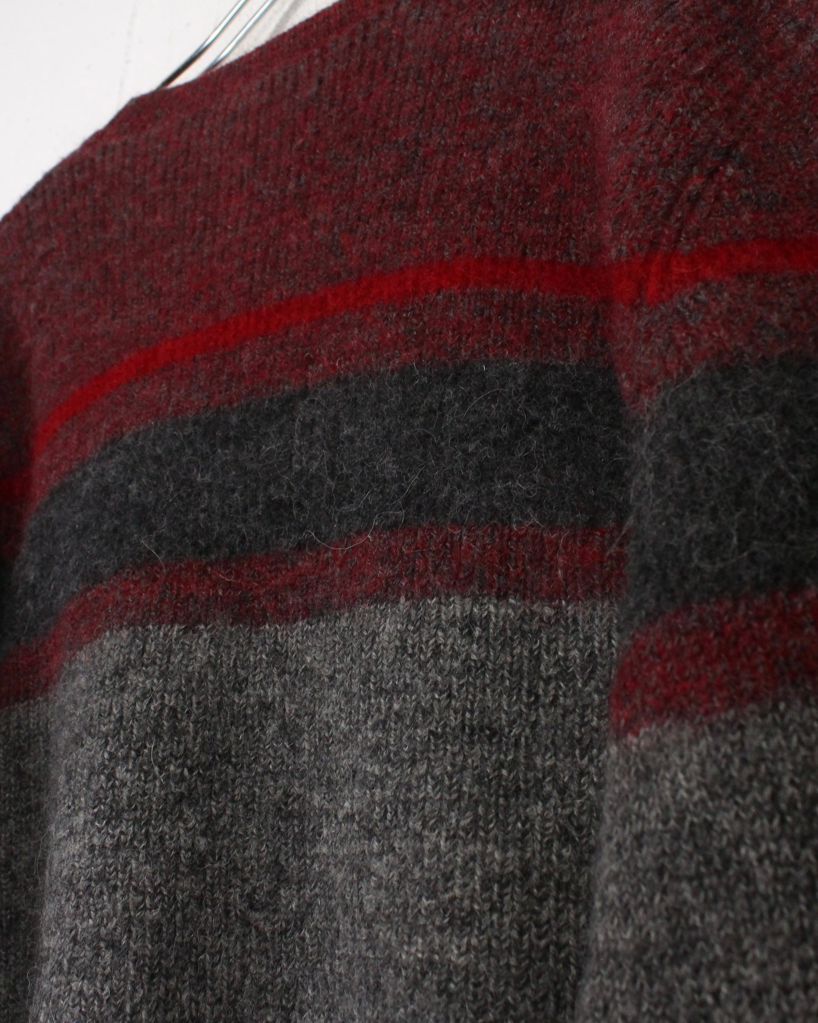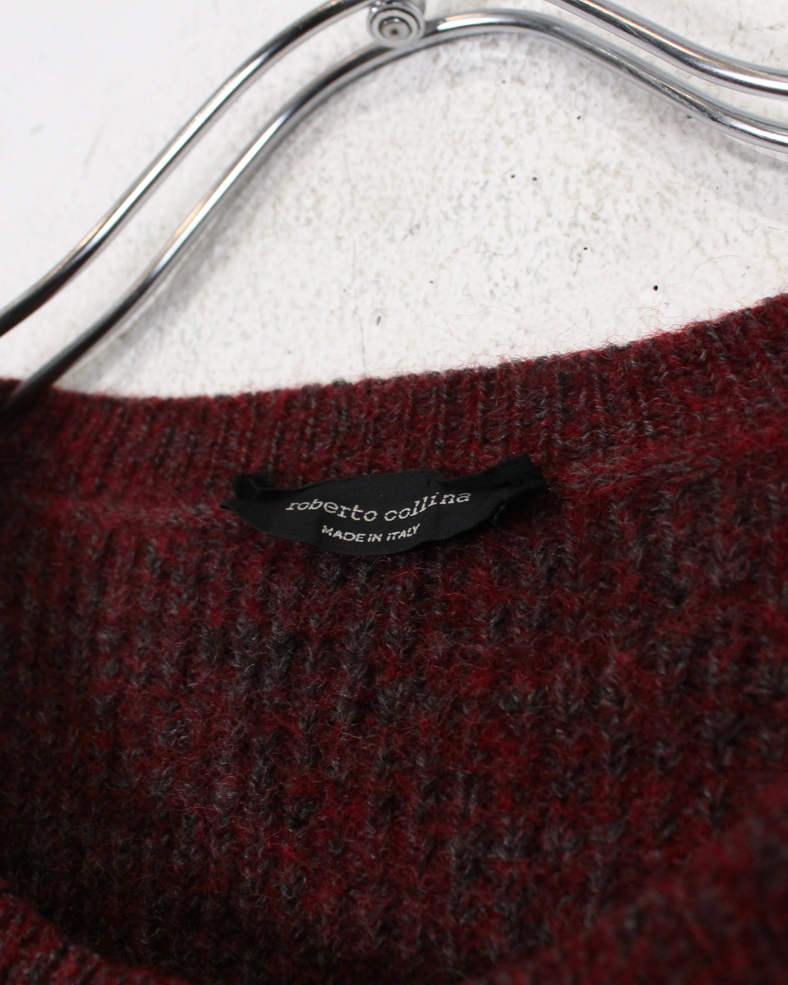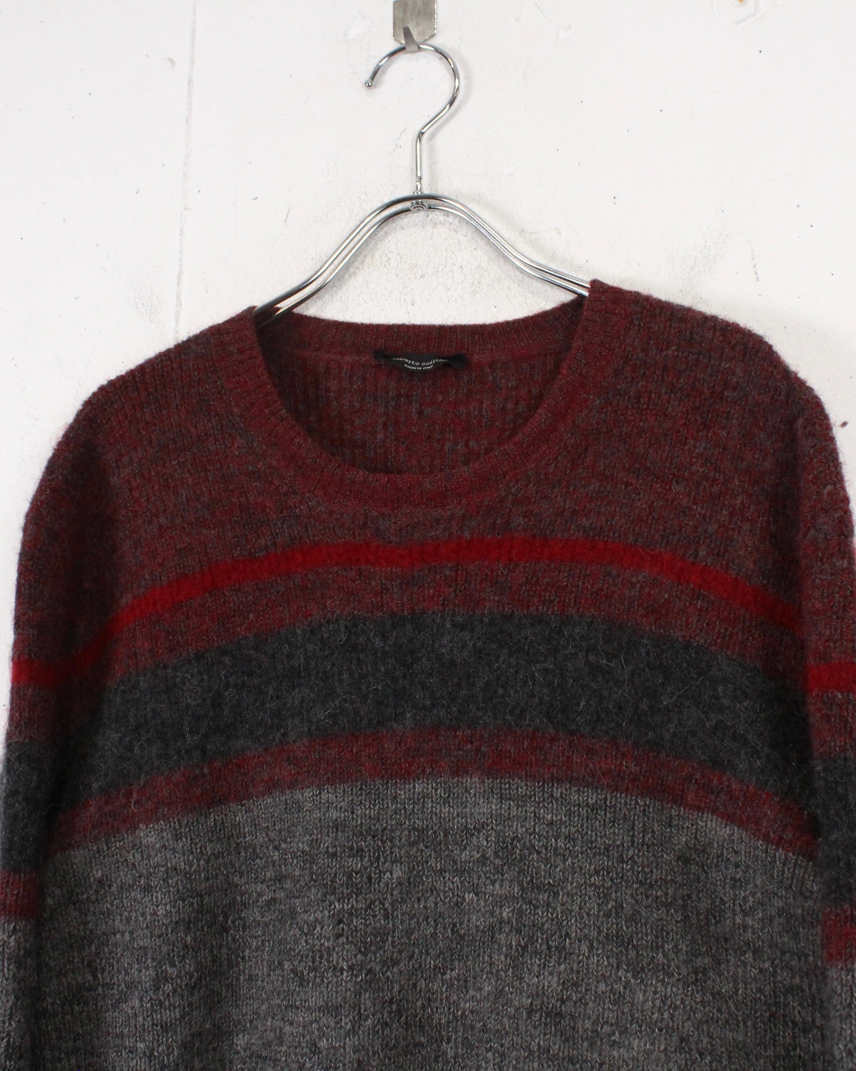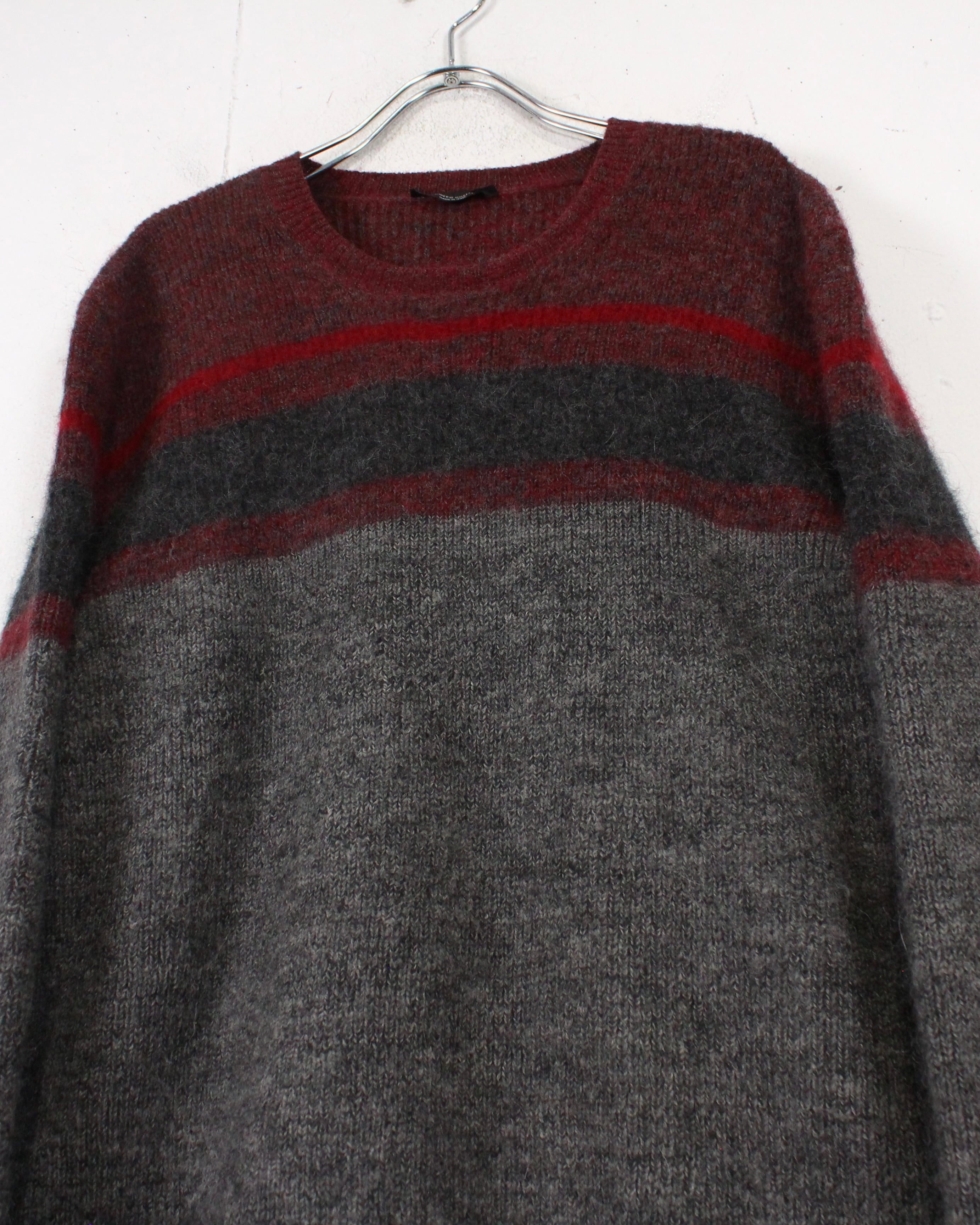 柔らかく起毛感のあるウールニットを用いたクルーネックの1着。グレーをベースに、ボルドーとダークグレーのラインが走る落ち着いた配色で、派手さは抑えつつ、確かな存在感を残すバランス感が非常に洒落てます。