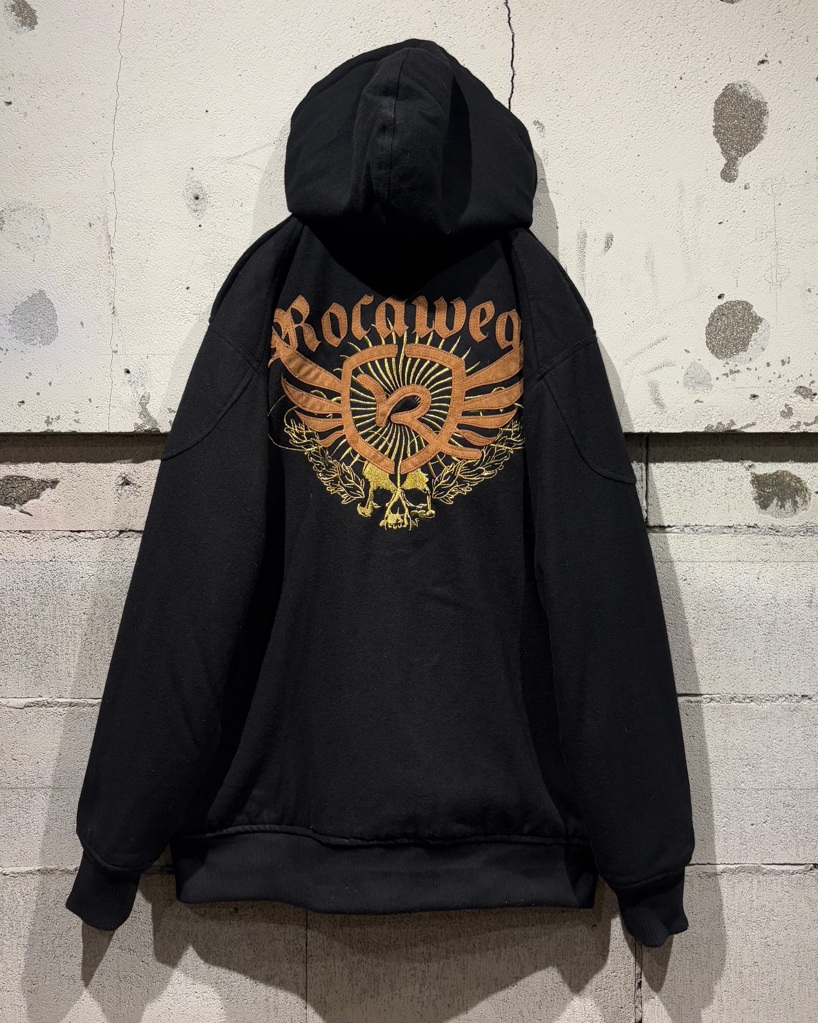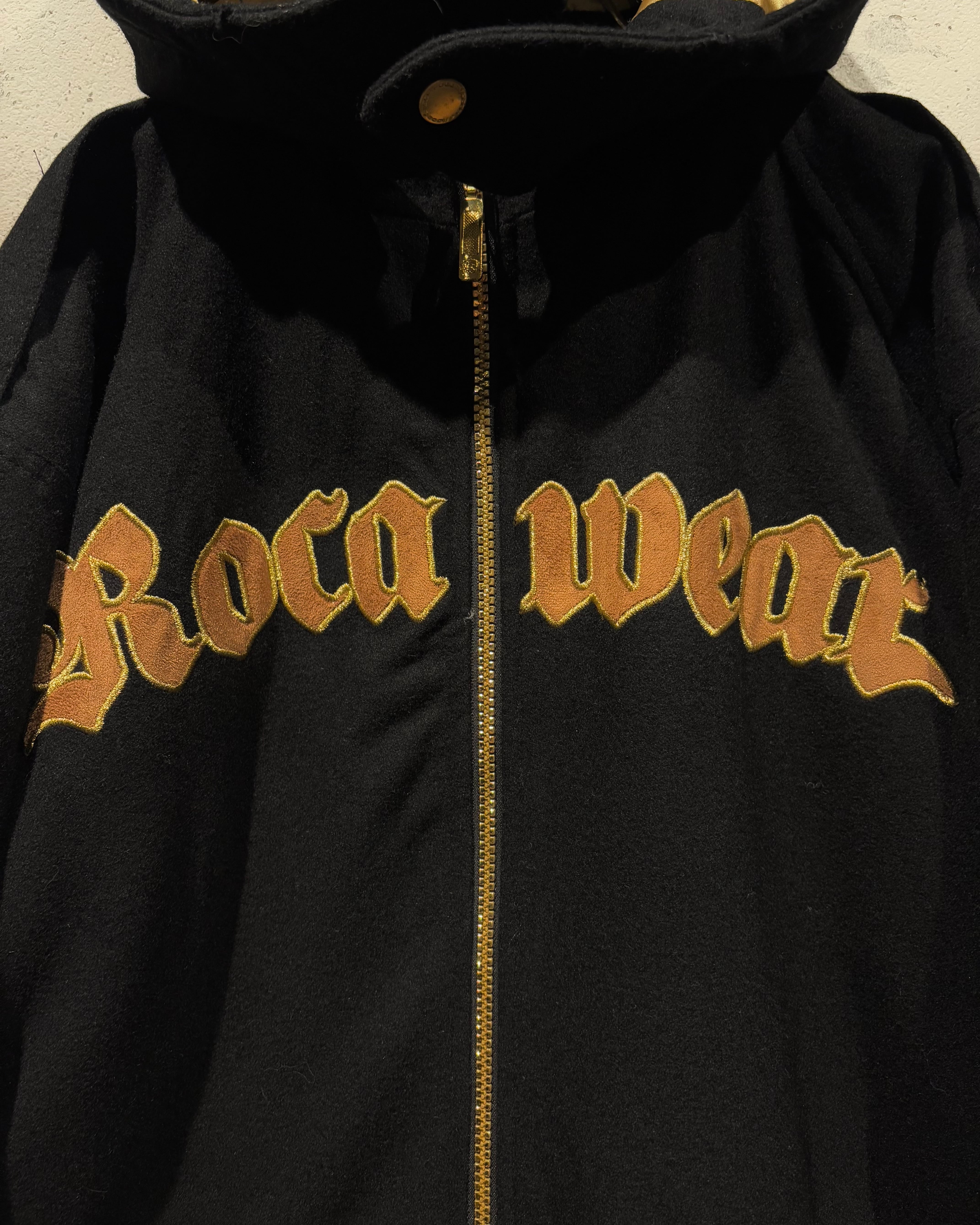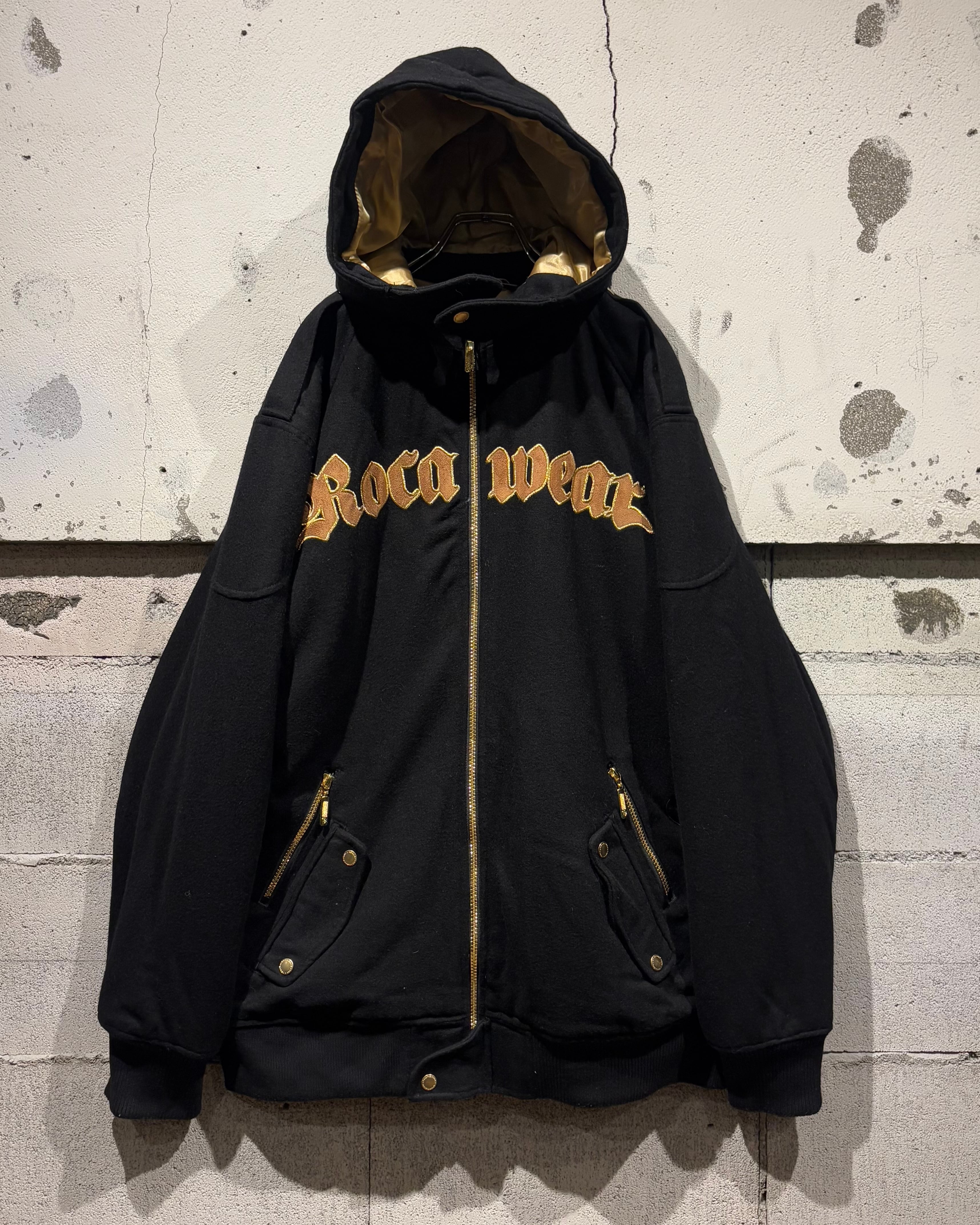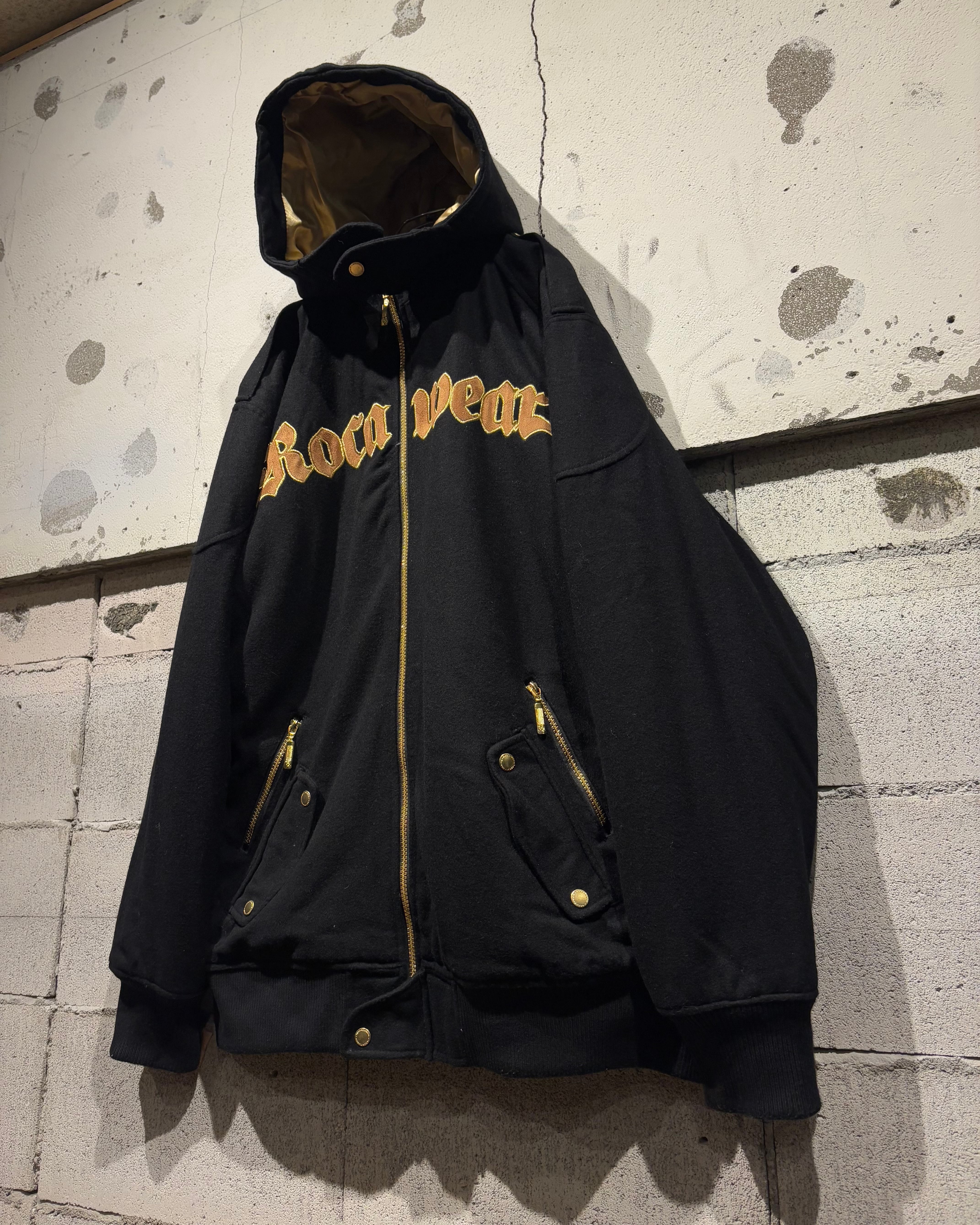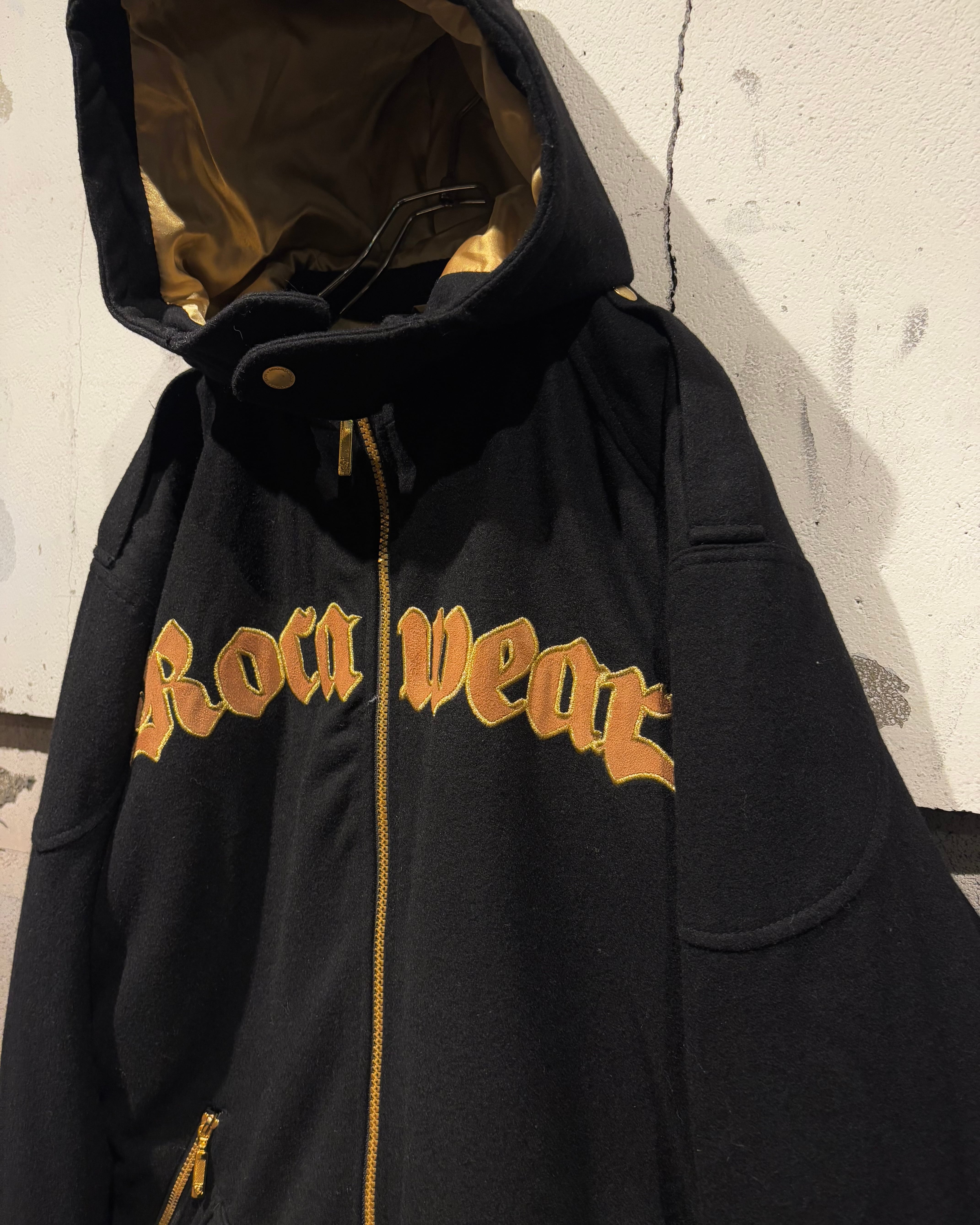 フロントにはブランドロゴ、バックにはエンブレム調の刺繍を大胆に配置。ゴールドジップやフード裏の光沢感ある切り替え、肩のエポレットなど、ROCAWEARらしい当時のムードを感じさせるディテールが随所に落とし込まれています。