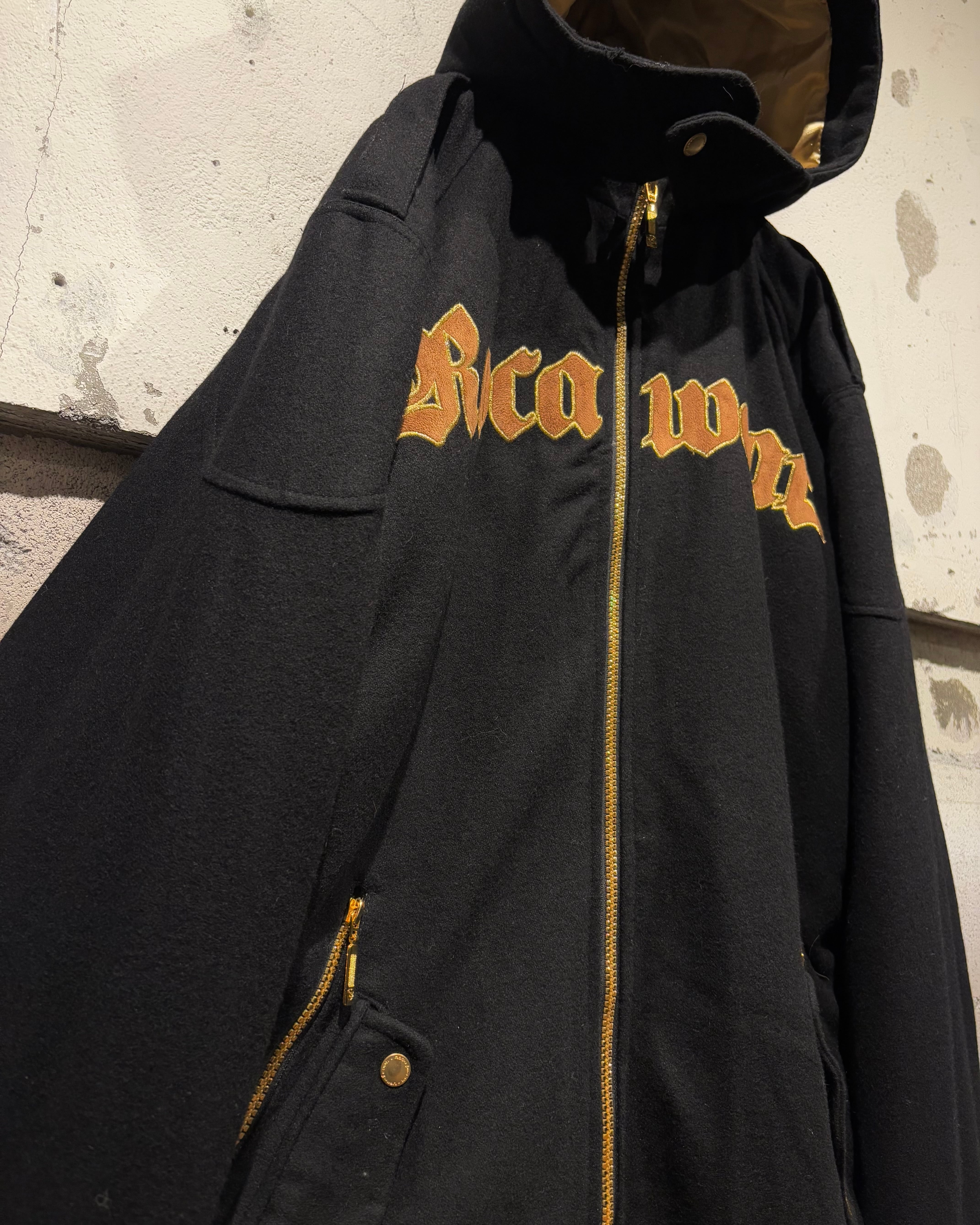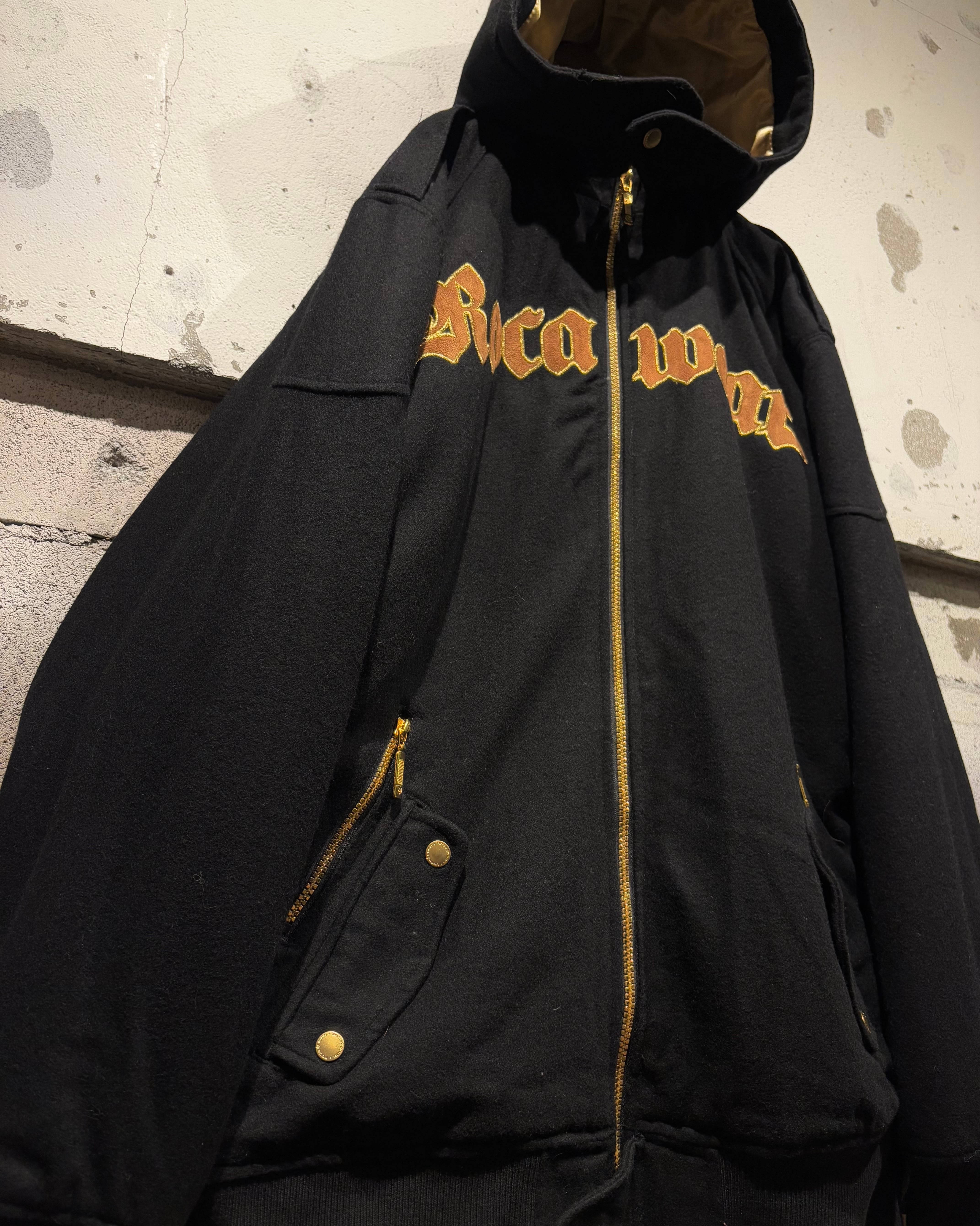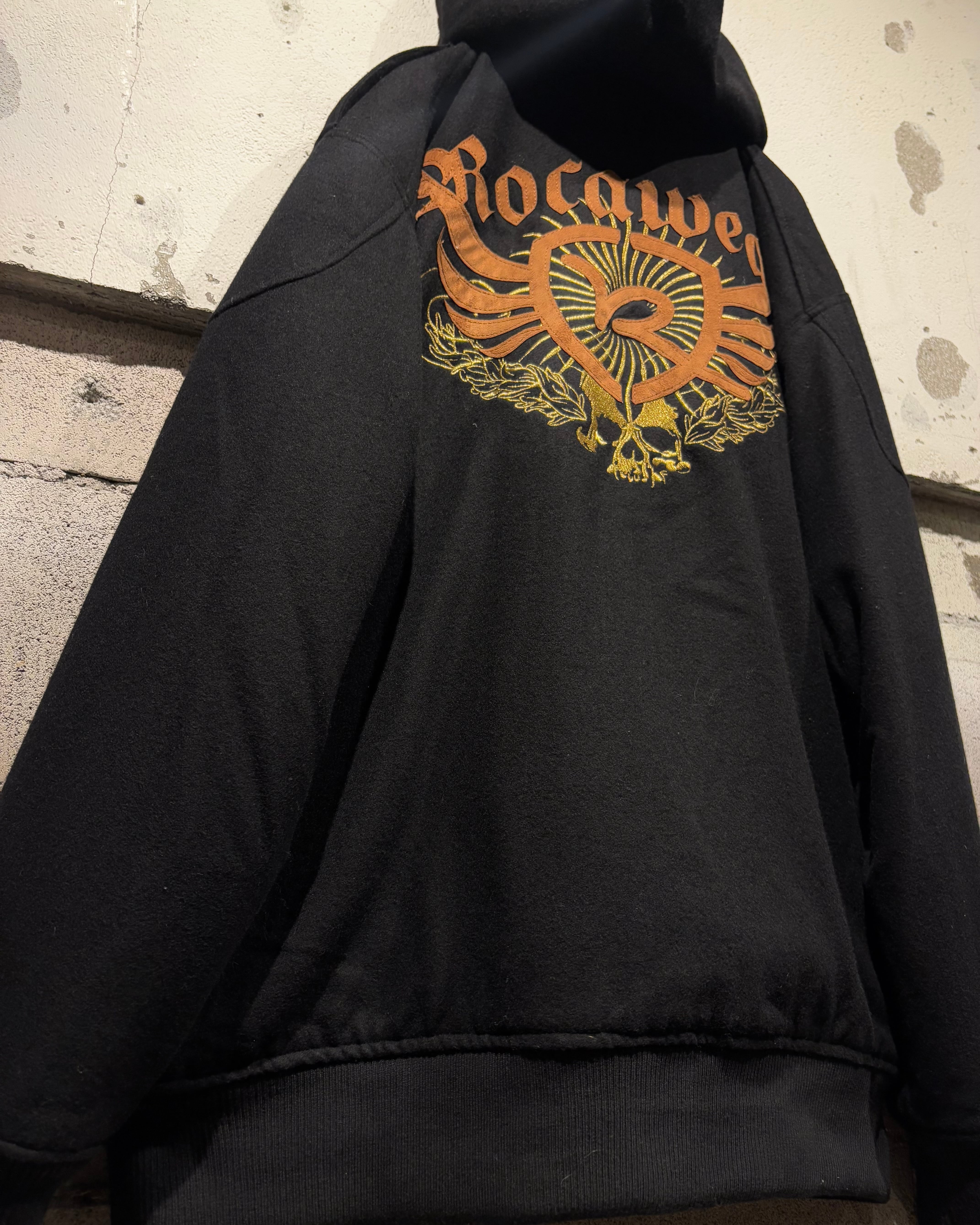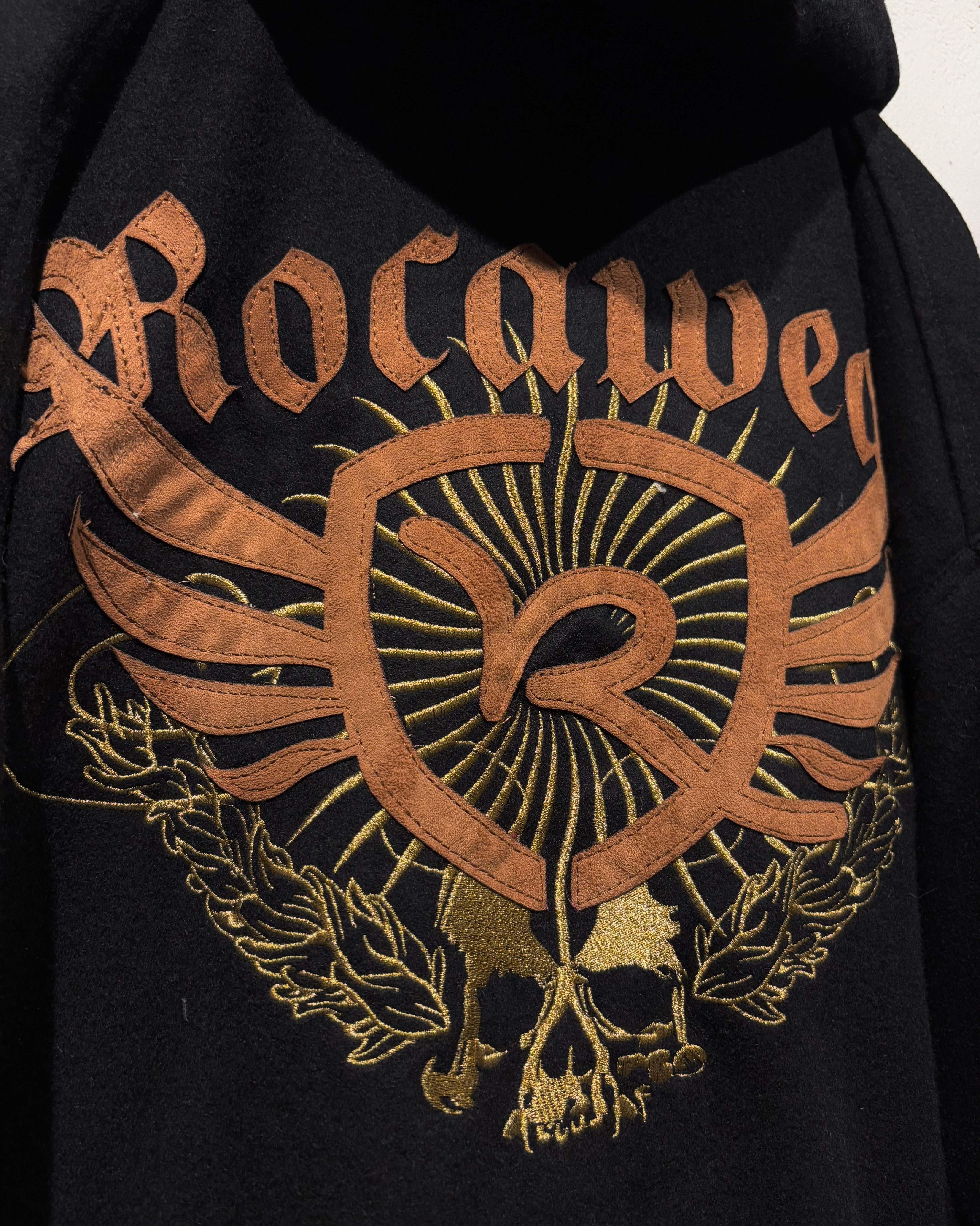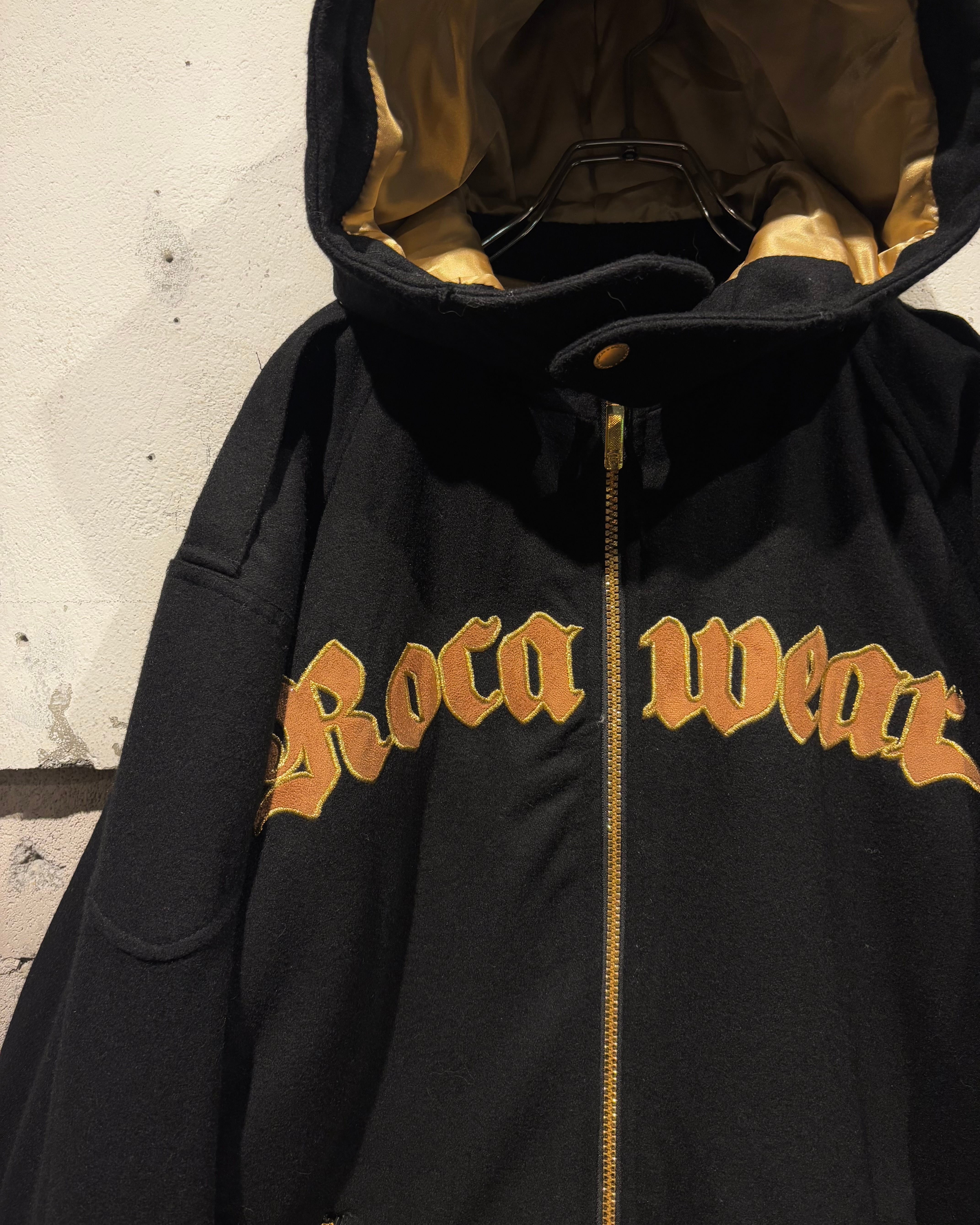 フロントにはブランドロゴ、バックにはエンブレム調の刺繍を大胆に配置。ゴールドジップやフード裏の光沢感ある切り替え、肩のエポレットなど、ROCAWEARらしい当時のムードを感じさせるディテールが随所に落とし込まれています。