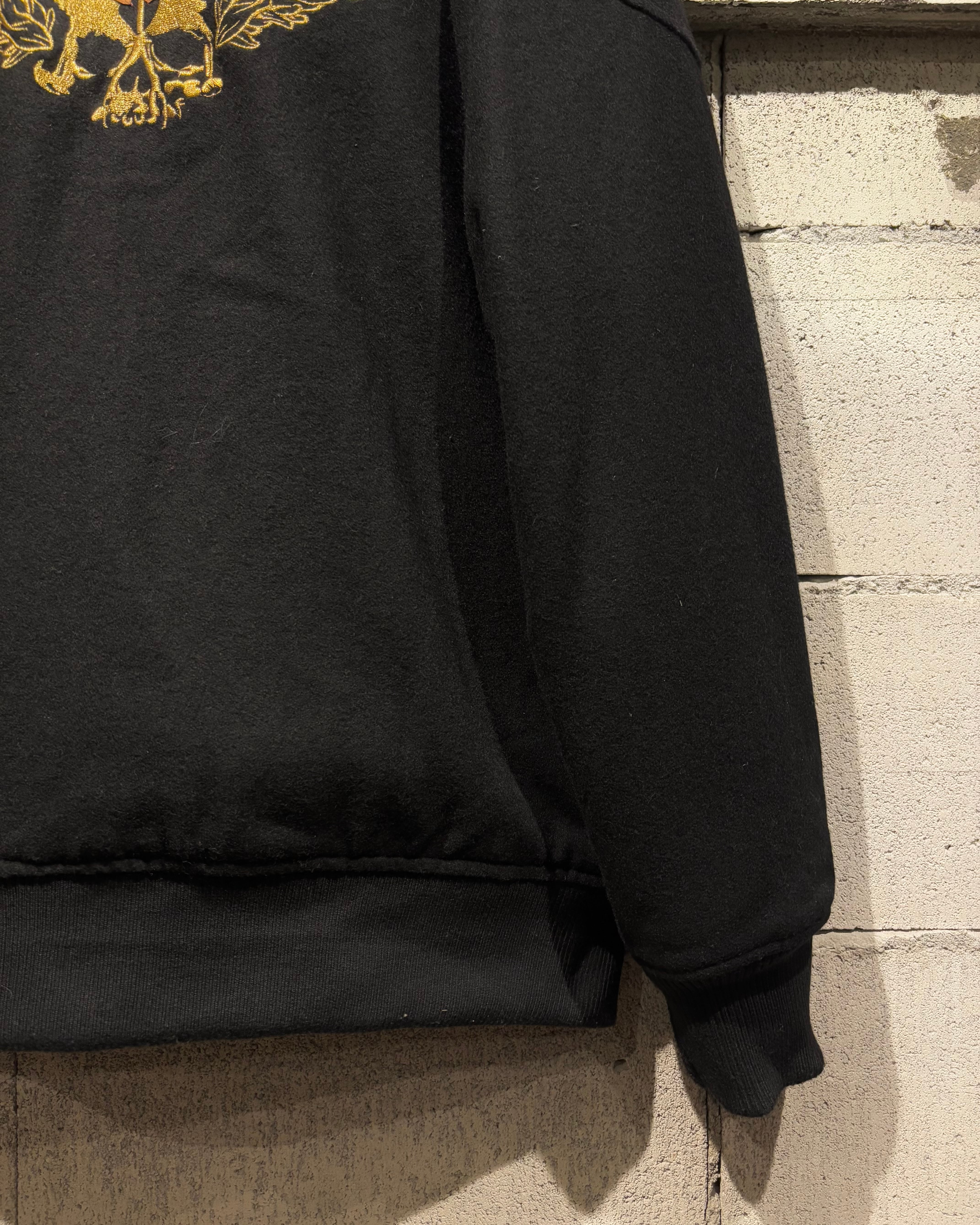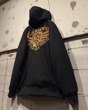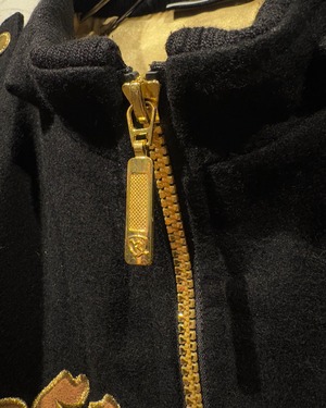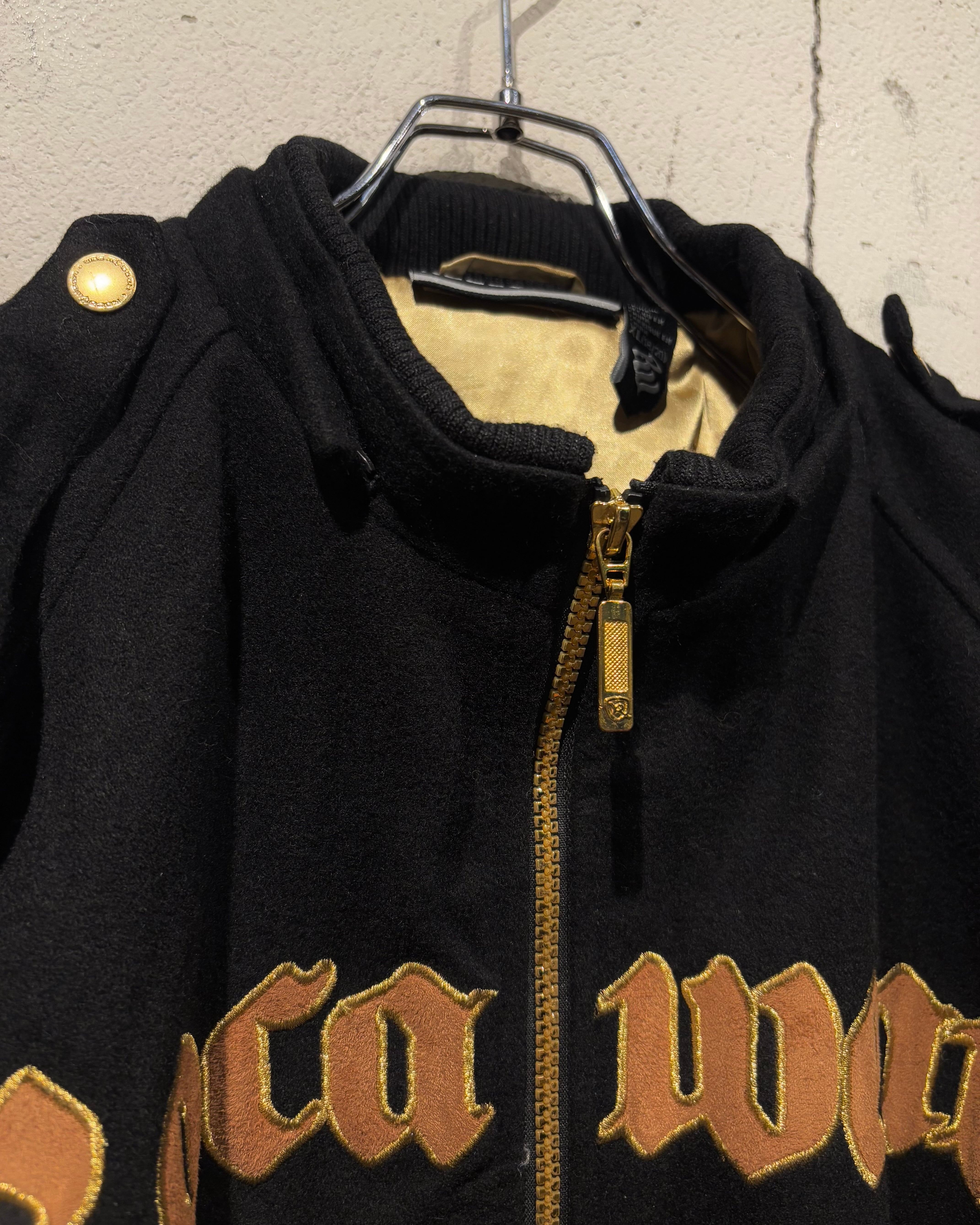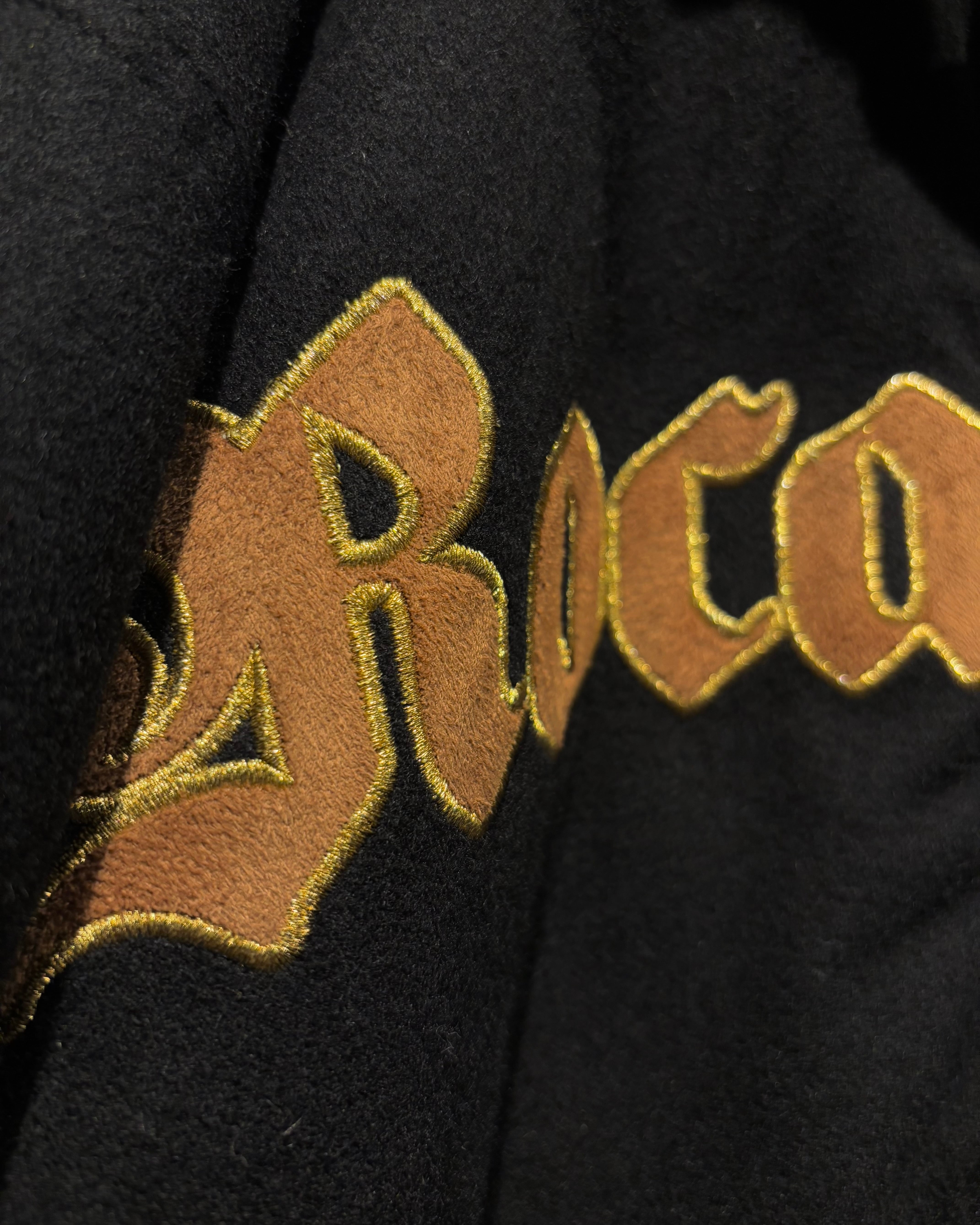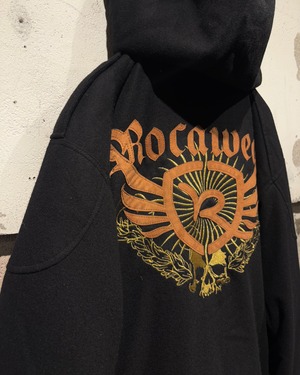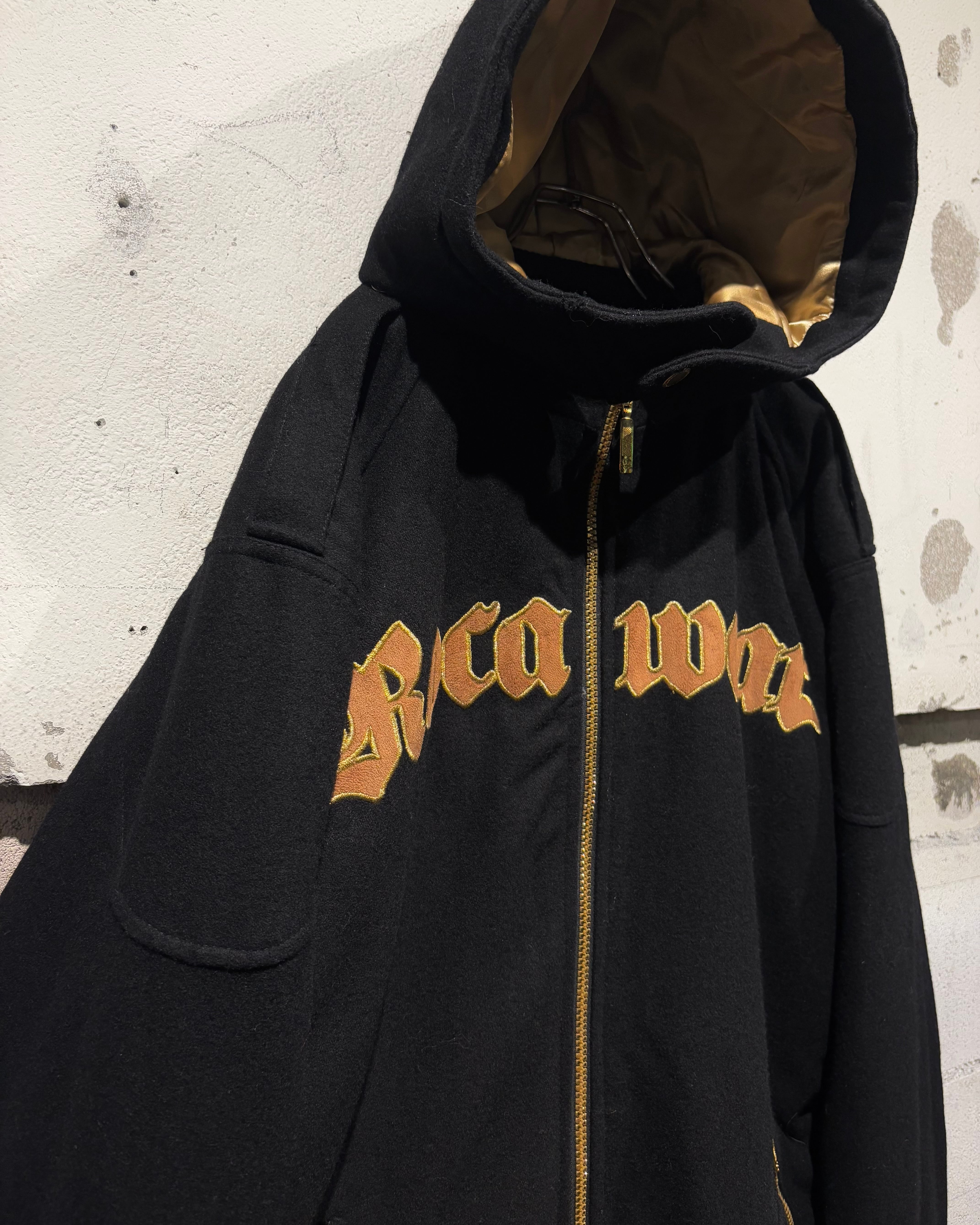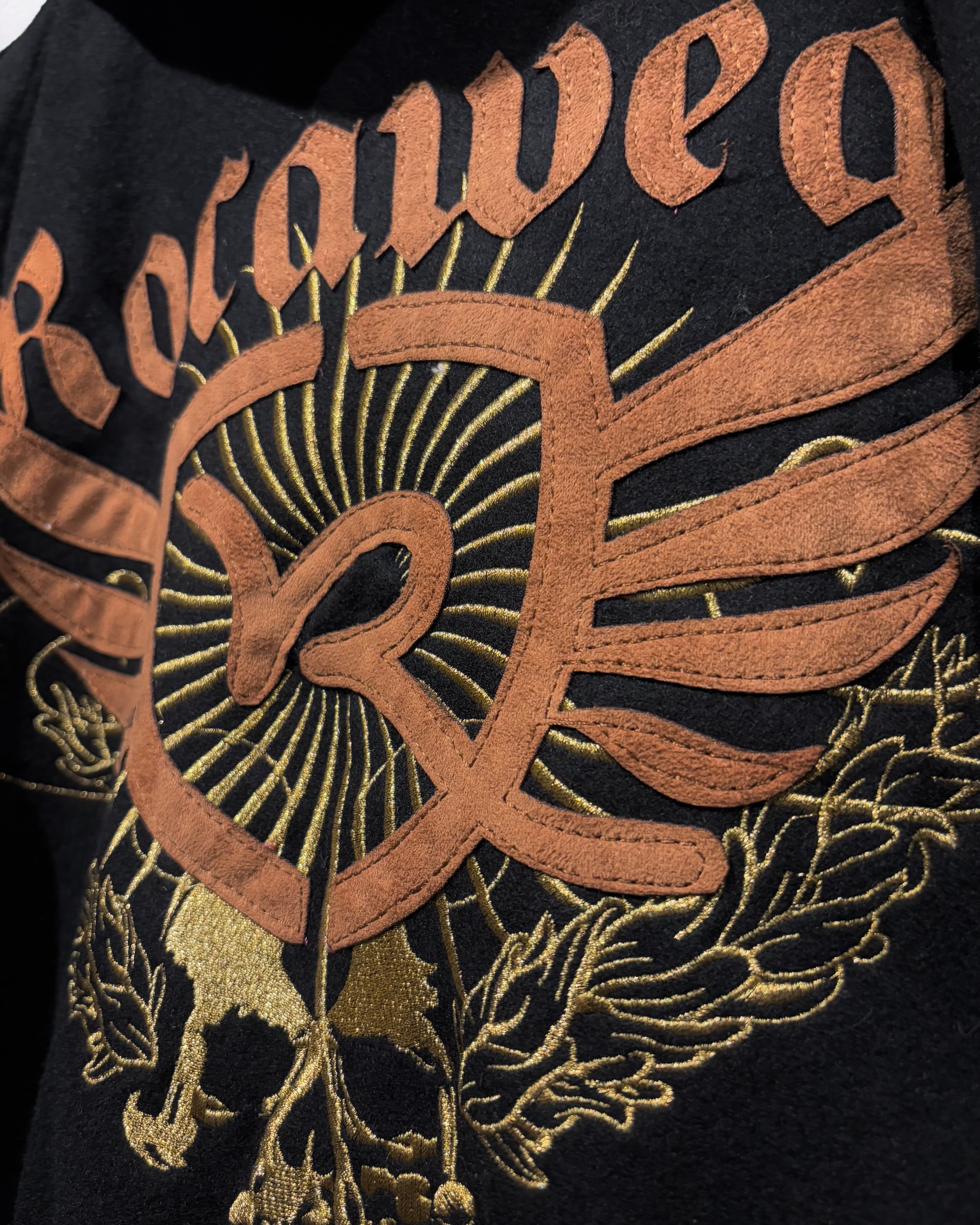 フロントにはブランドロゴ、バックにはエンブレム調の刺繍を大胆に配置。ゴールドジップやフード裏の光沢感ある切り替え、肩のエポレットなど、ROCAWEARらしい当時のムードを感じさせるディテールが随所に落とし込まれています。