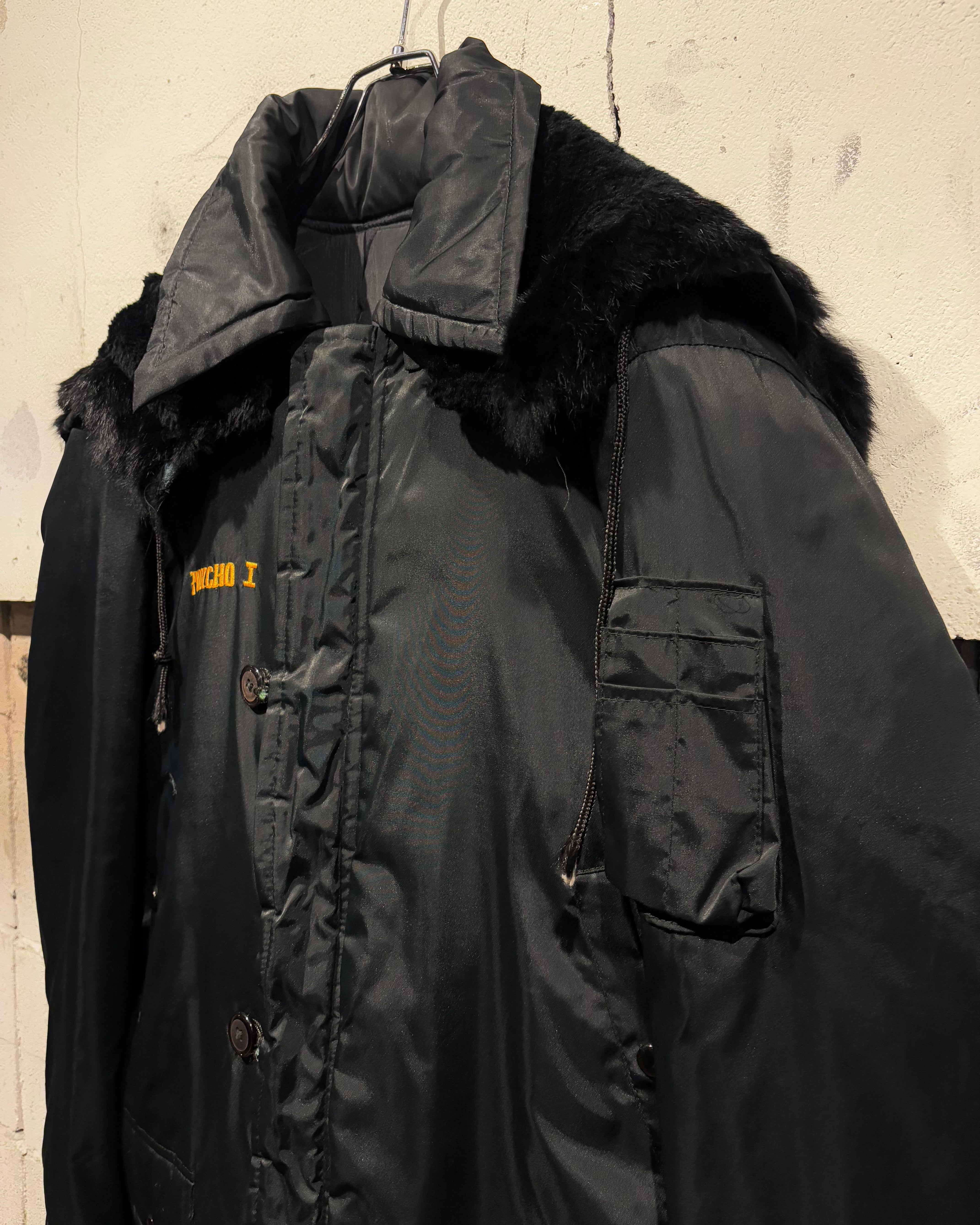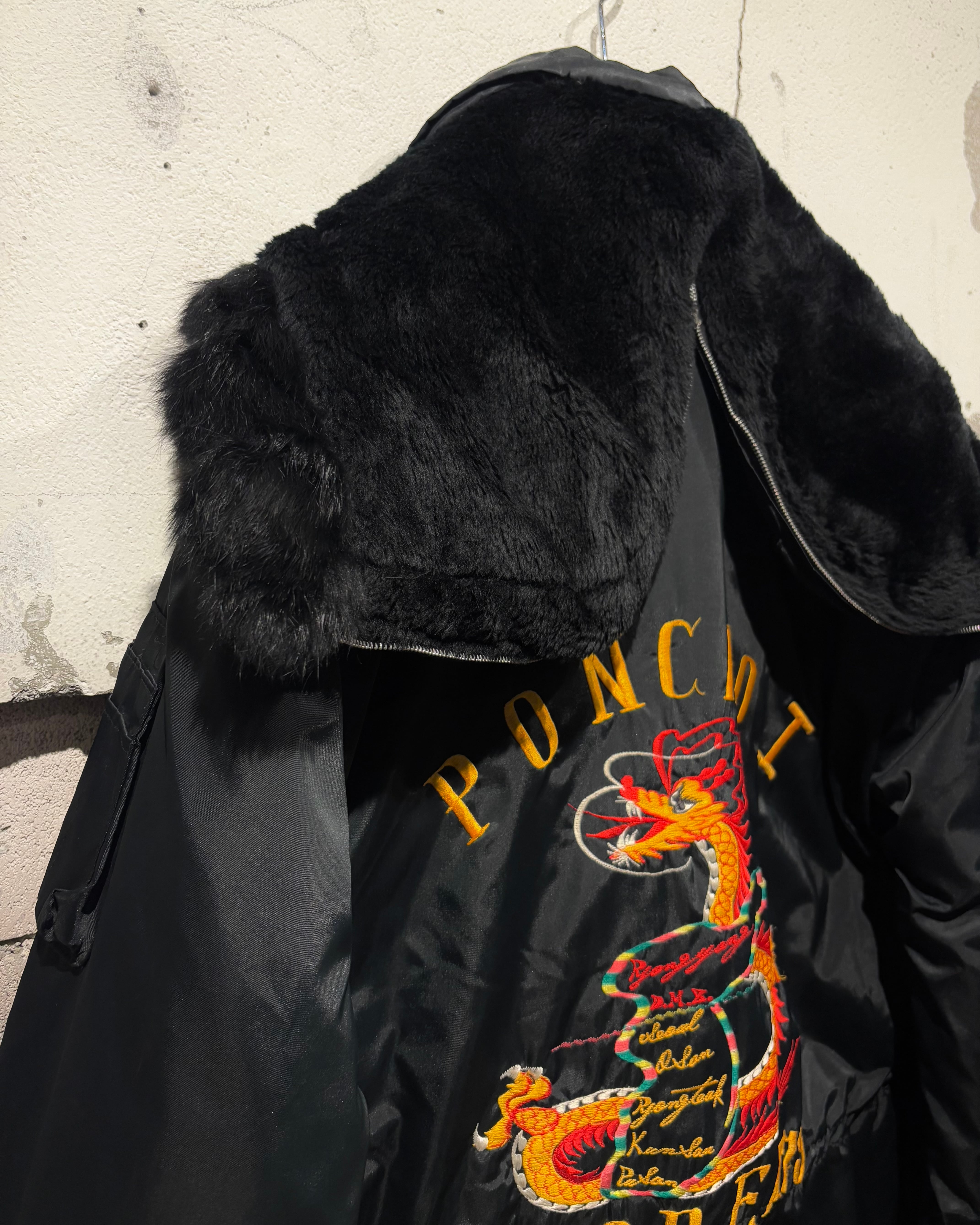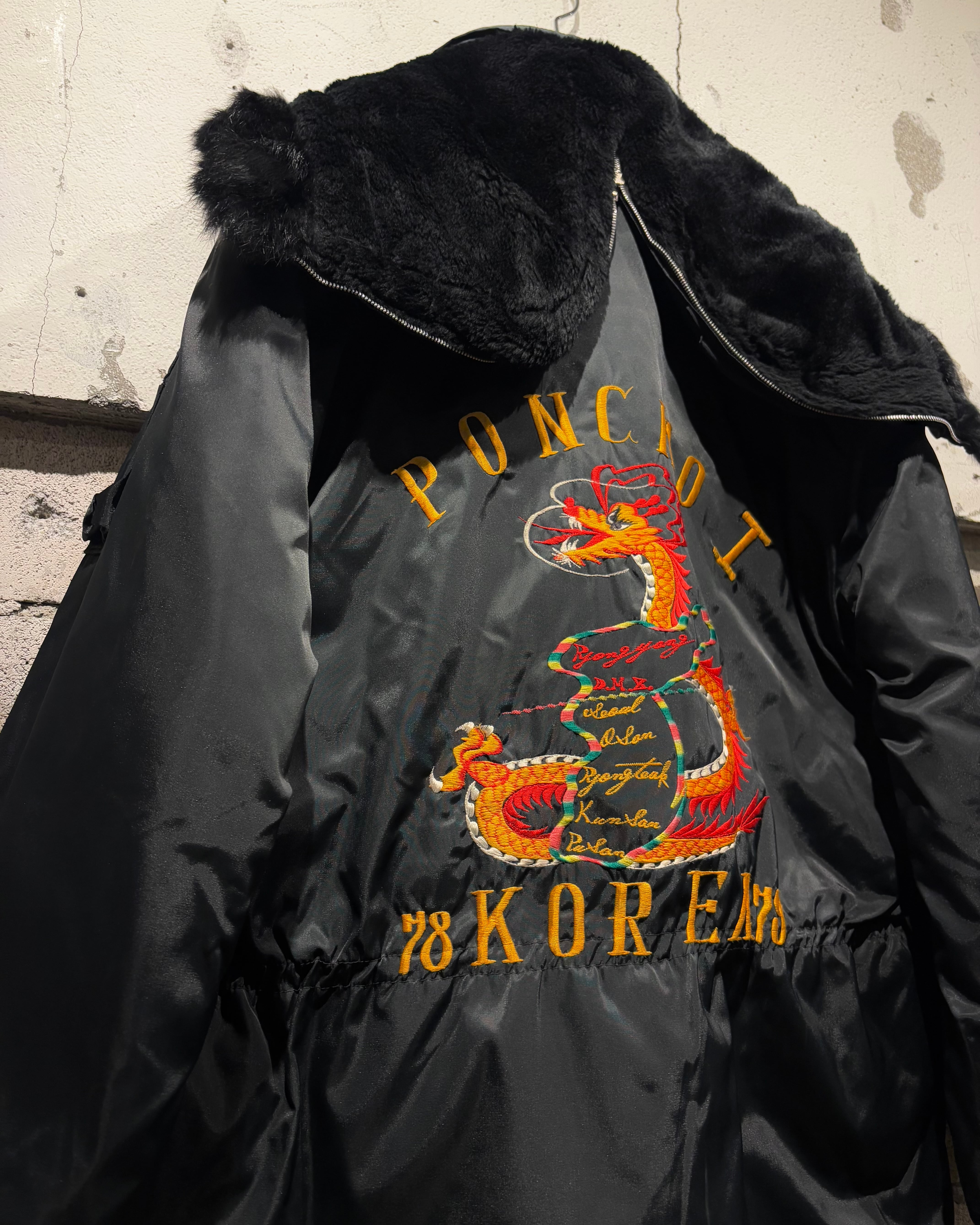 背面には存在感抜群の龍刺繍を配置。N-3Bという無骨なベースに、オリエンタルな刺繍表現を重ねることで、他にはない唯一無二の表情に仕上がっています。フロントはジップ+ボタンによる二重構造、ハンドウォーマーポケットなど、極寒地仕様のディテールも抜かりなし。