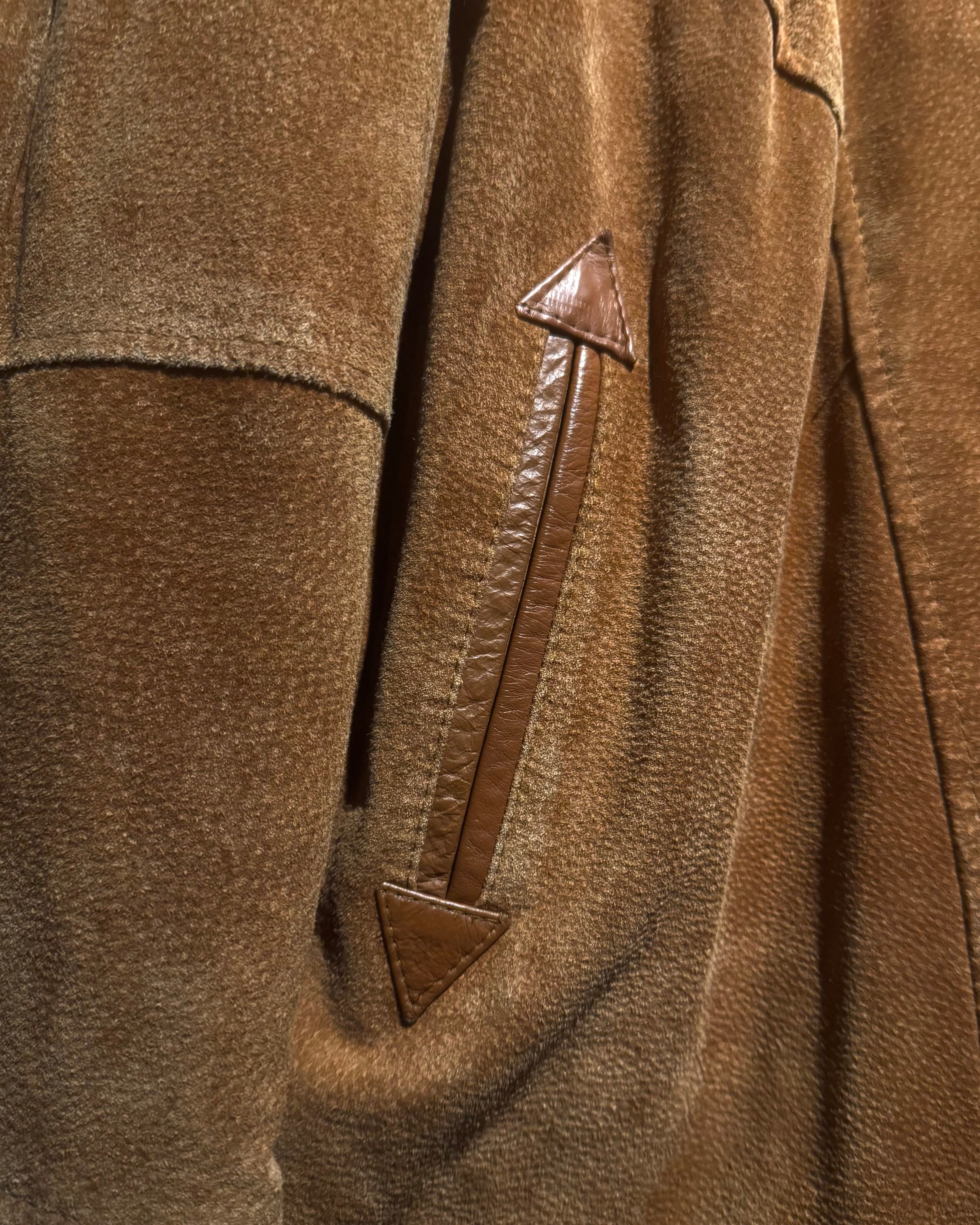 フロントにはトグル仕様を採用し、クラシックでありながらも程よく抜け感のある印象に。レザーパイピングを効かせたポケットや、立体的なパターンワークからも、作り込みの丁寧さが感じ取れますね。