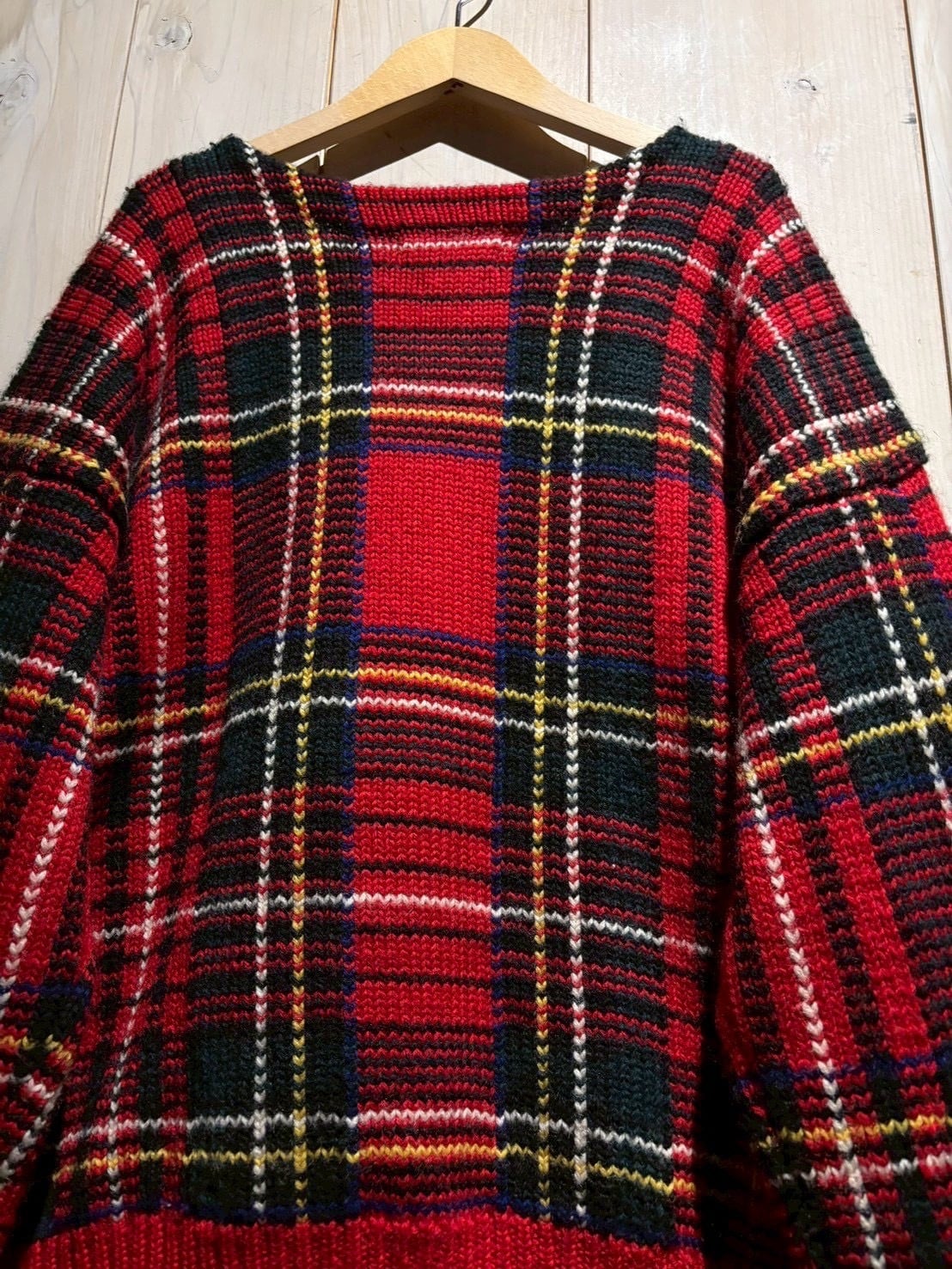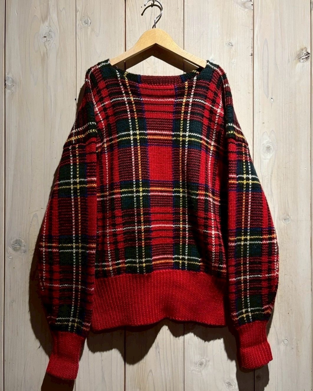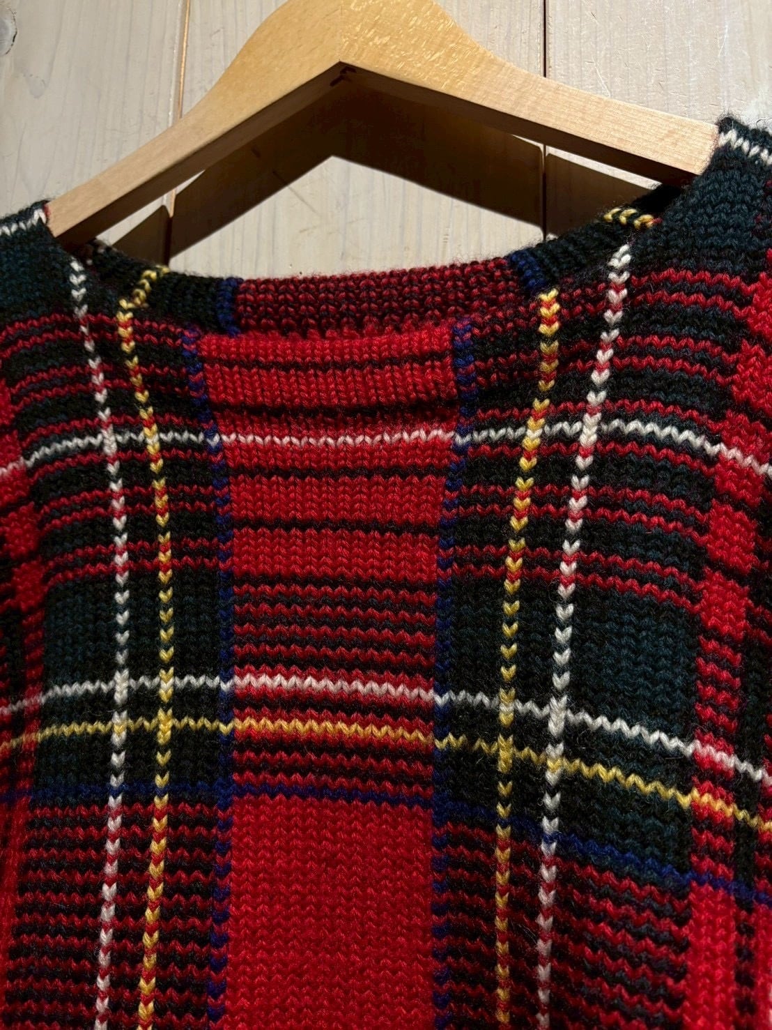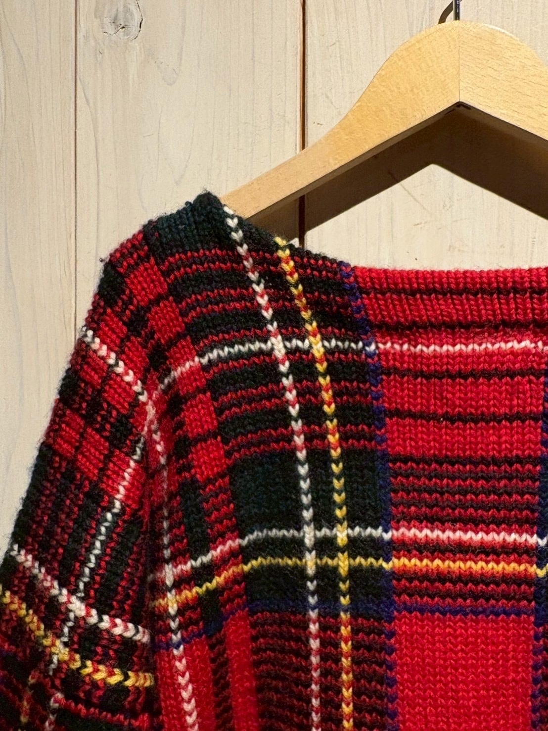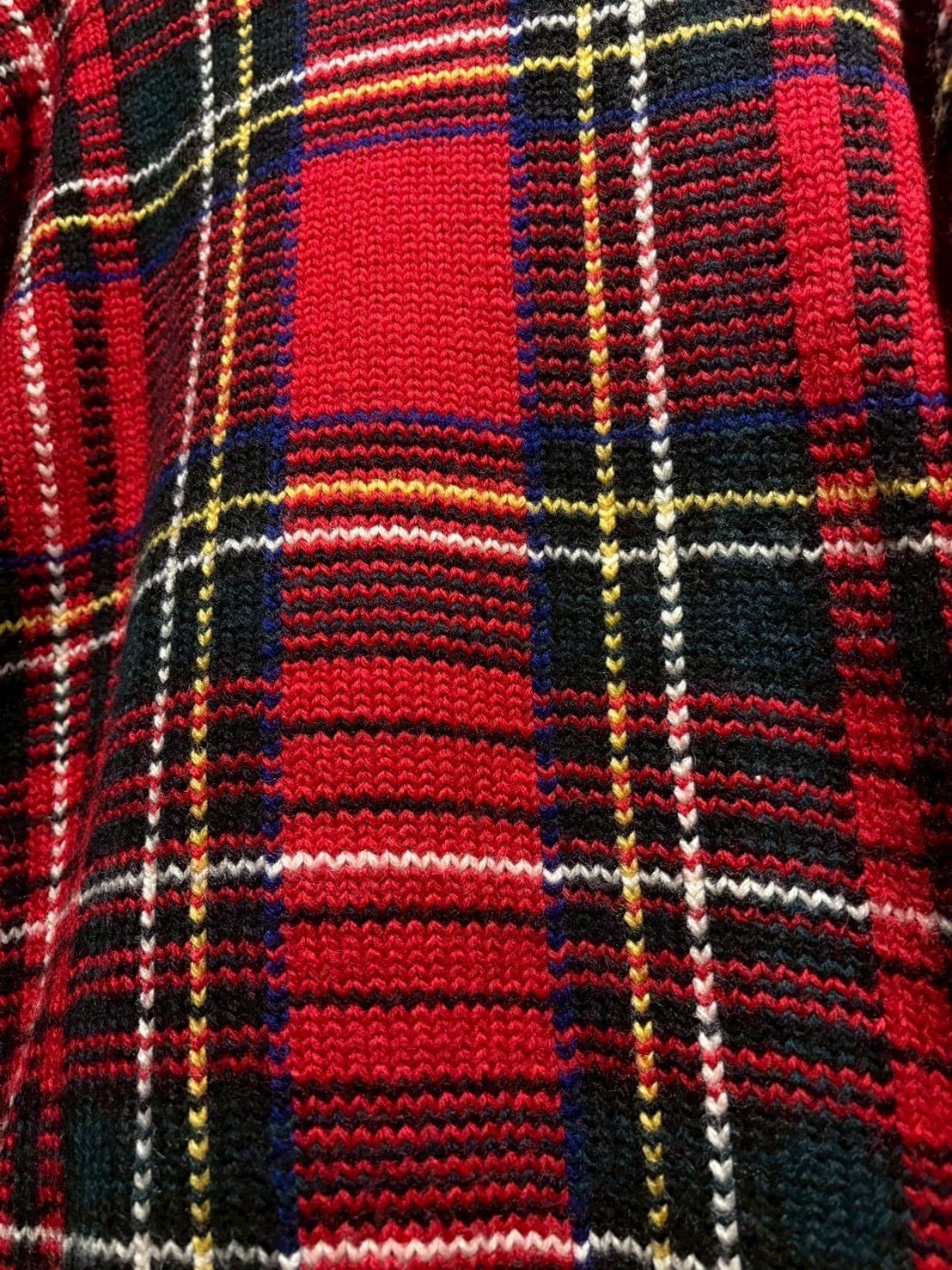 赤を基調に、ブラック、イエロー、ブルー、ホワイトが走るタータンチェック。定番のデザインながら編み地の凹凸によって柄が立体的に浮かび上がり、奥行きのある表情に仕上がっています。