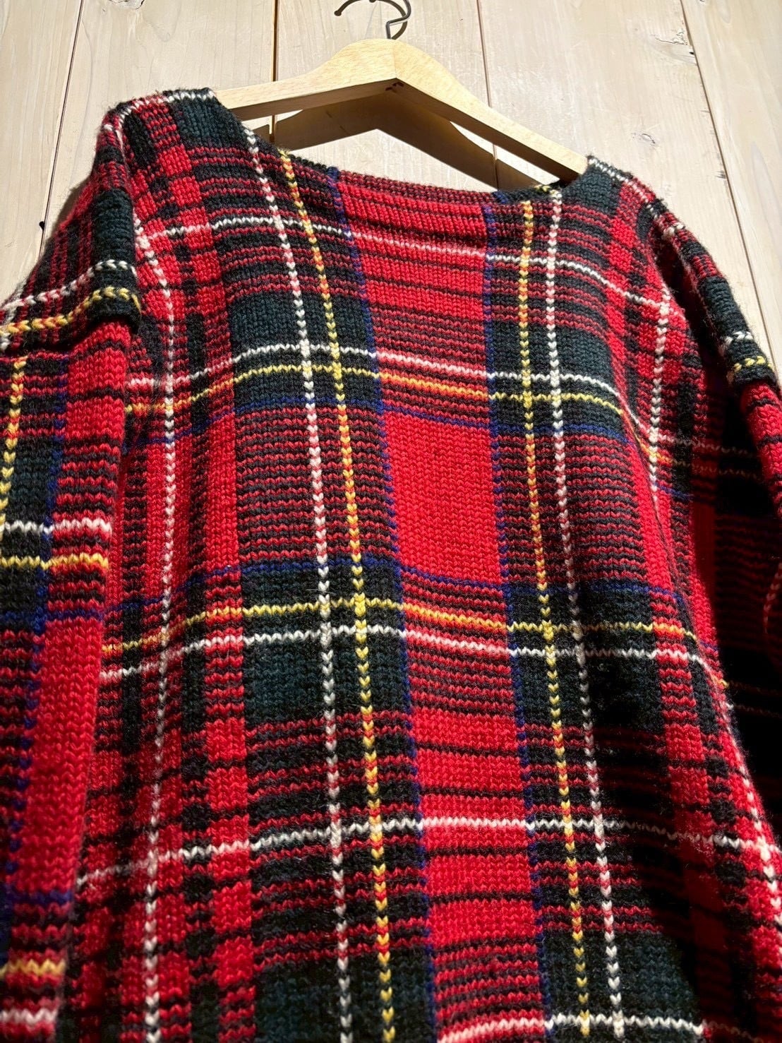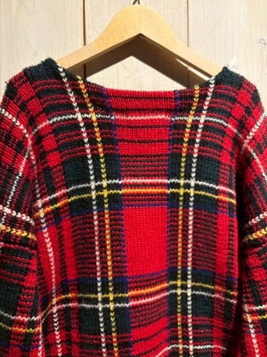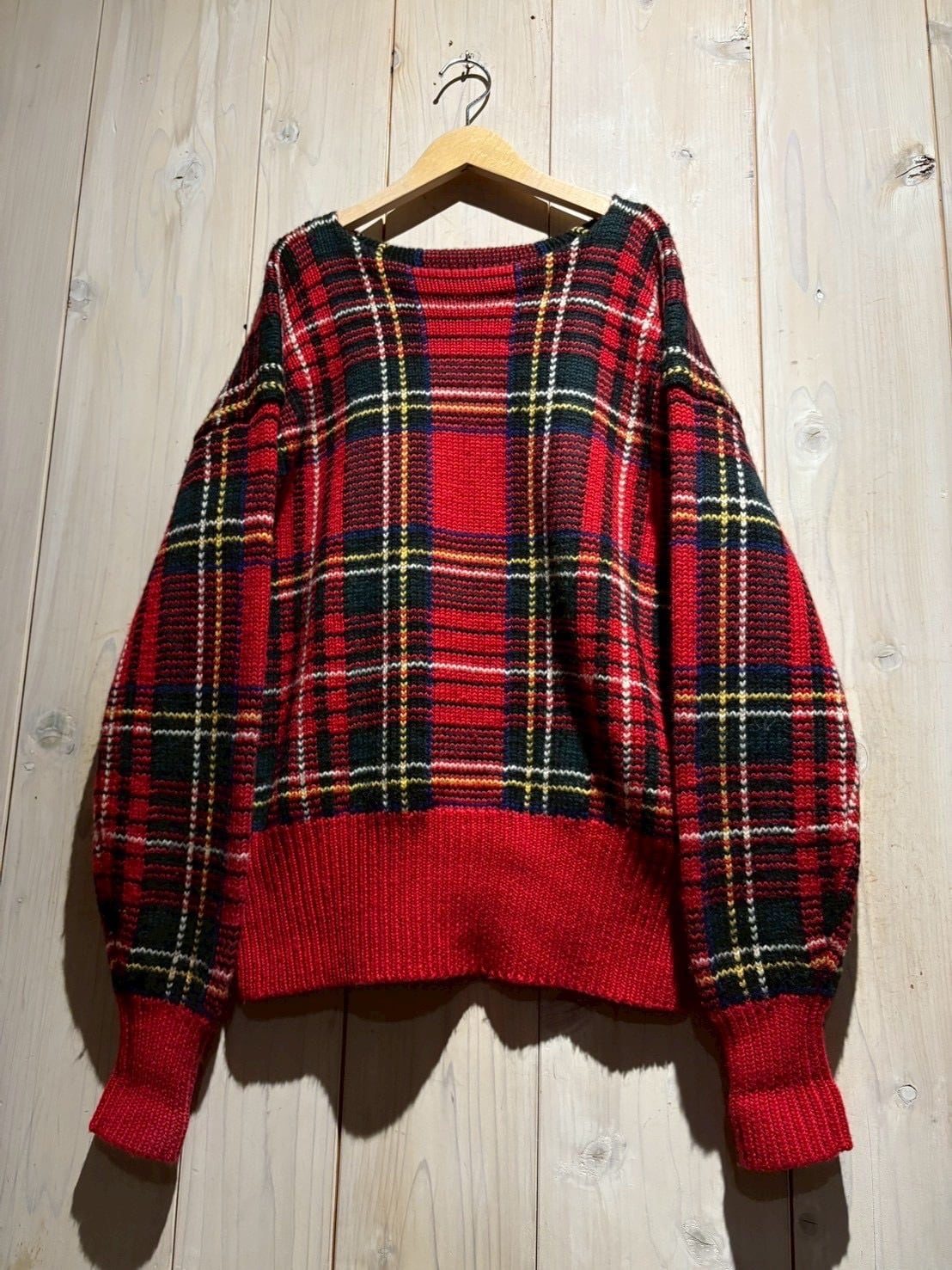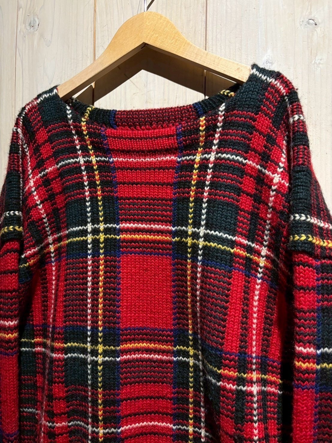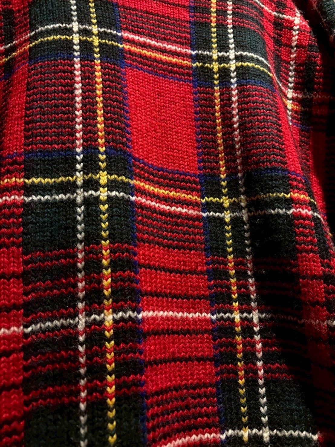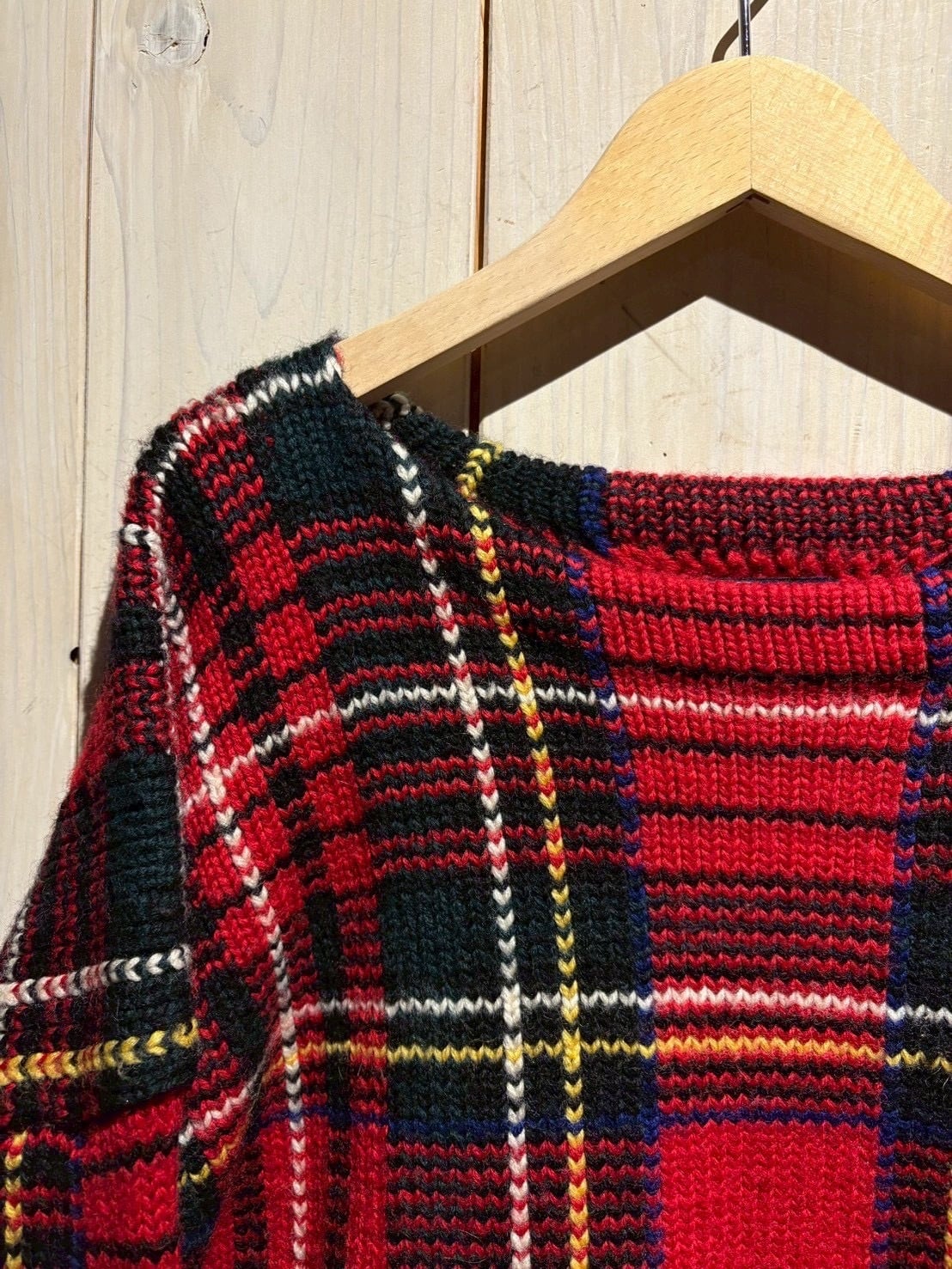 赤を基調に、ブラック、イエロー、ブルー、ホワイトが走るタータンチェック。定番のデザインながら編み地の凹凸によって柄が立体的に浮かび上がり、奥行きのある表情に仕上がっています。