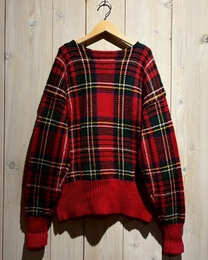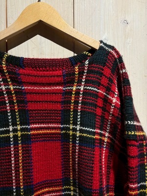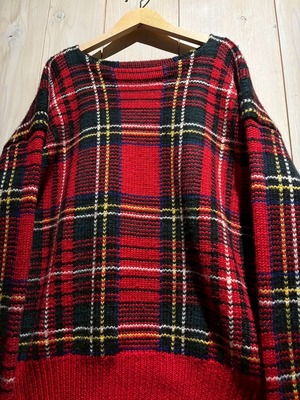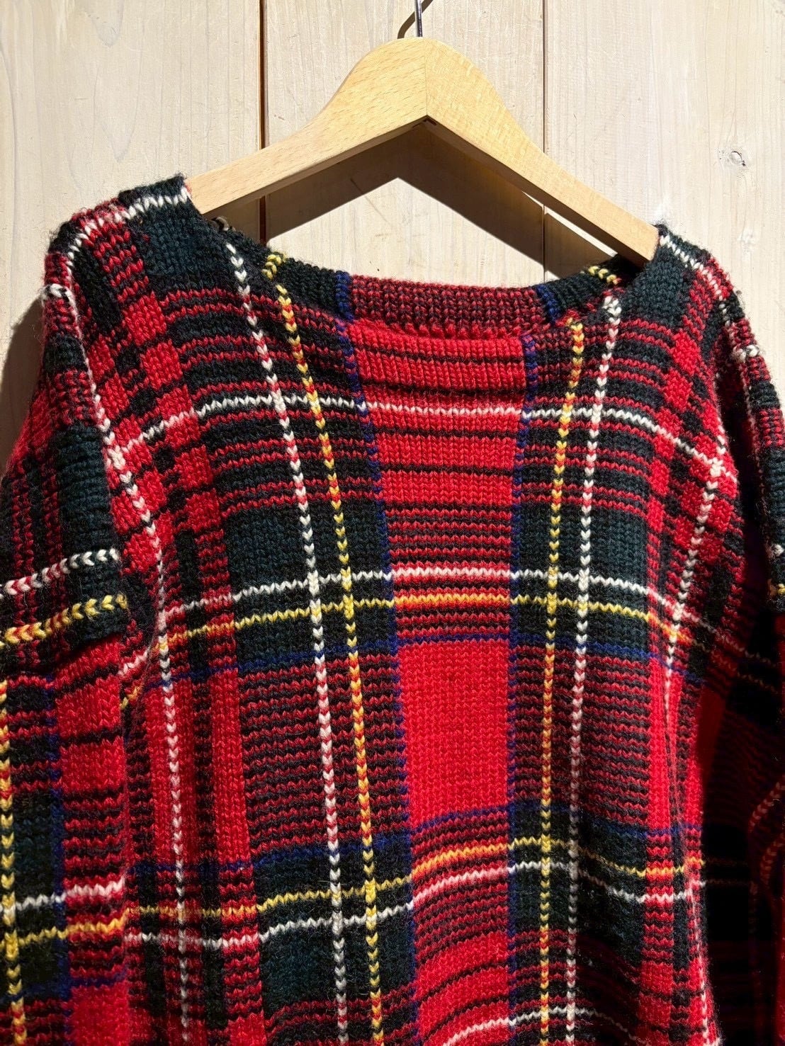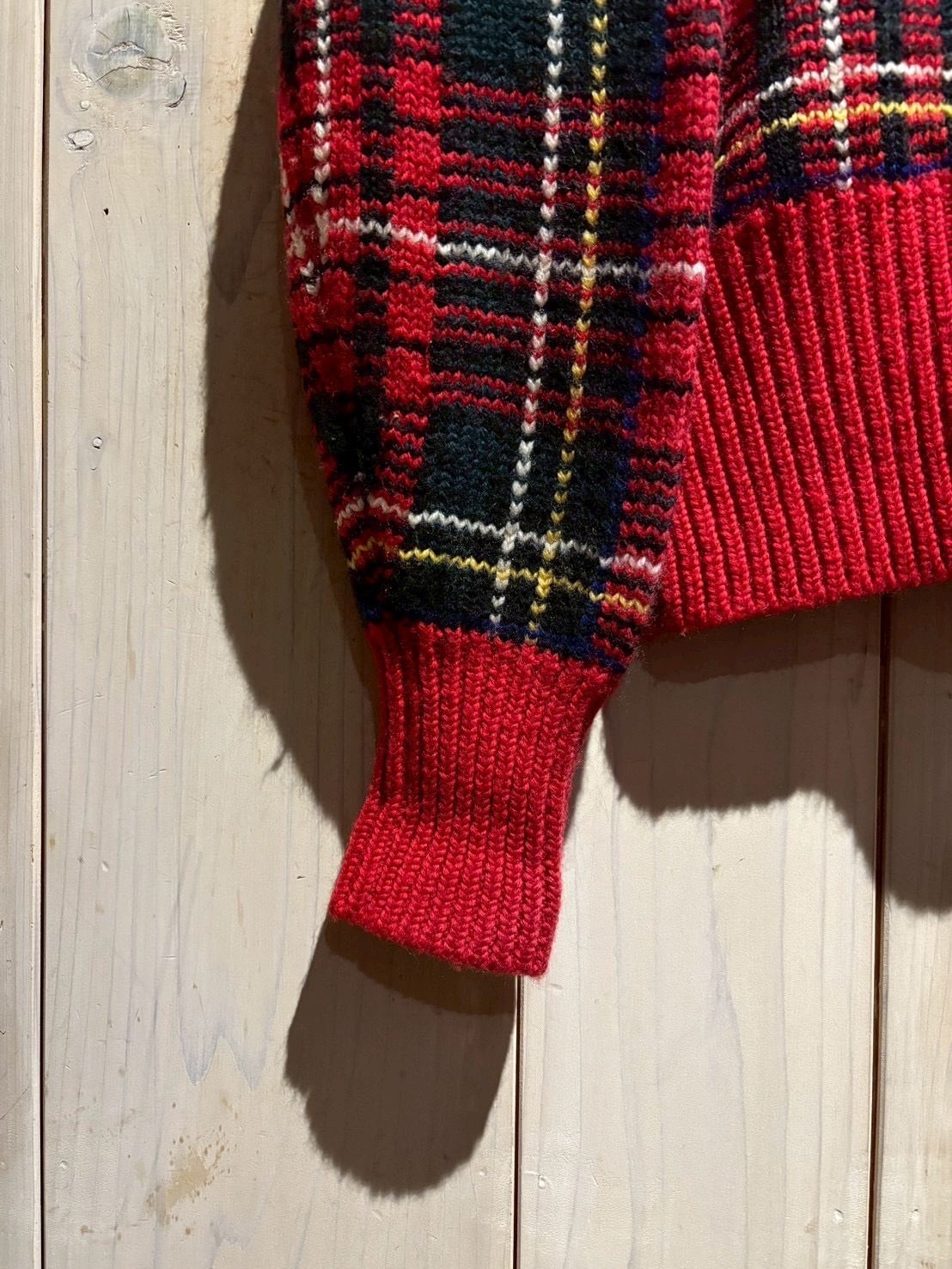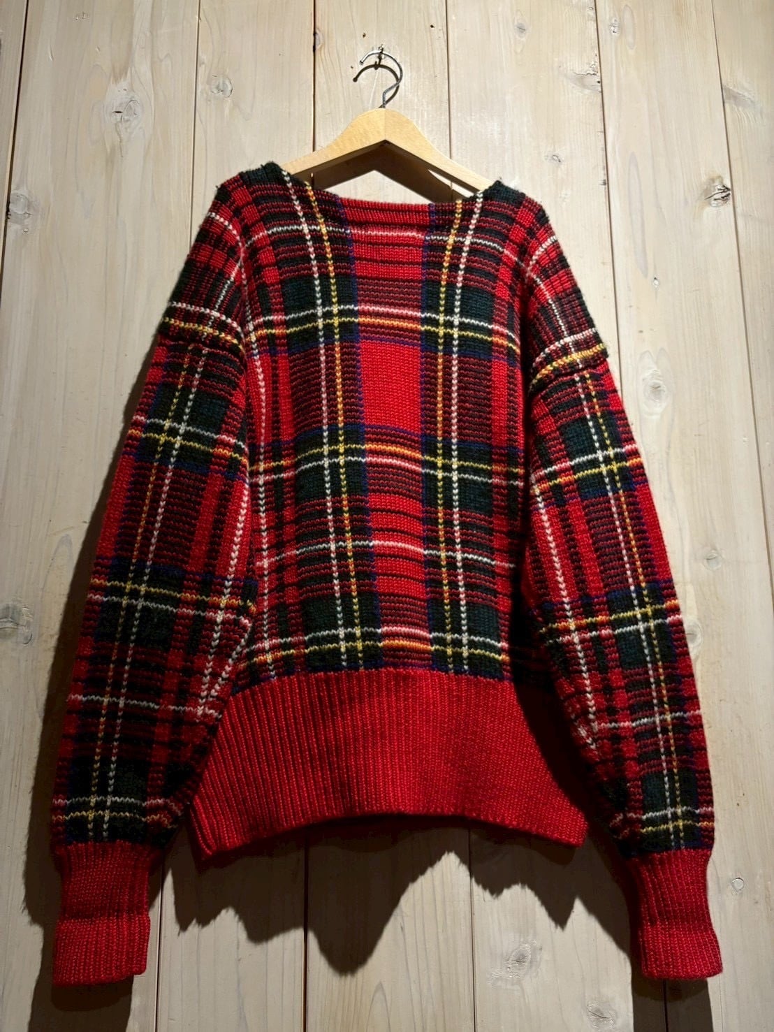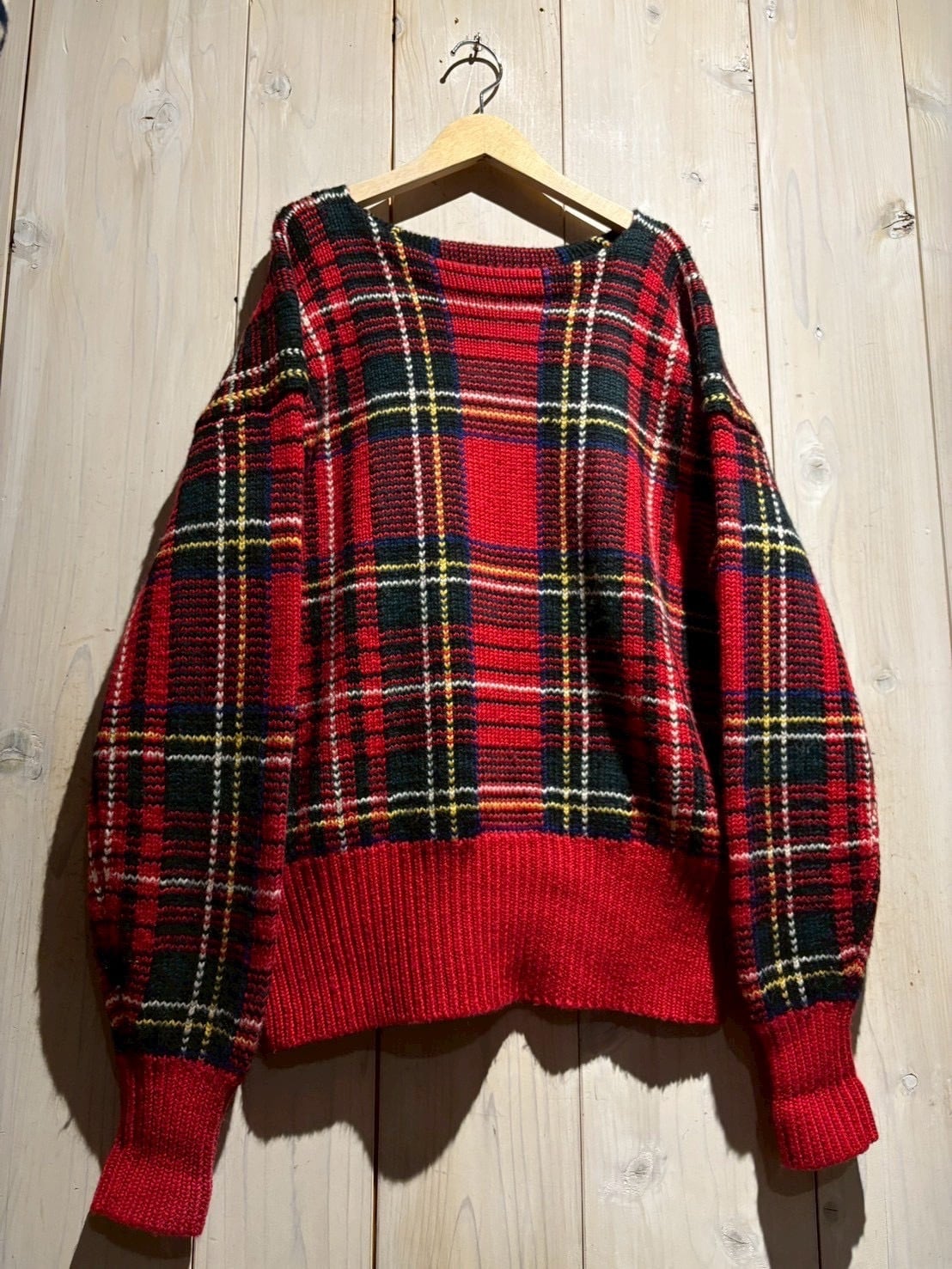 赤を基調に、ブラック、イエロー、ブルー、ホワイトが走るタータンチェック。定番のデザインながら編み地の凹凸によって柄が立体的に浮かび上がり、奥行きのある表情に仕上がっています。