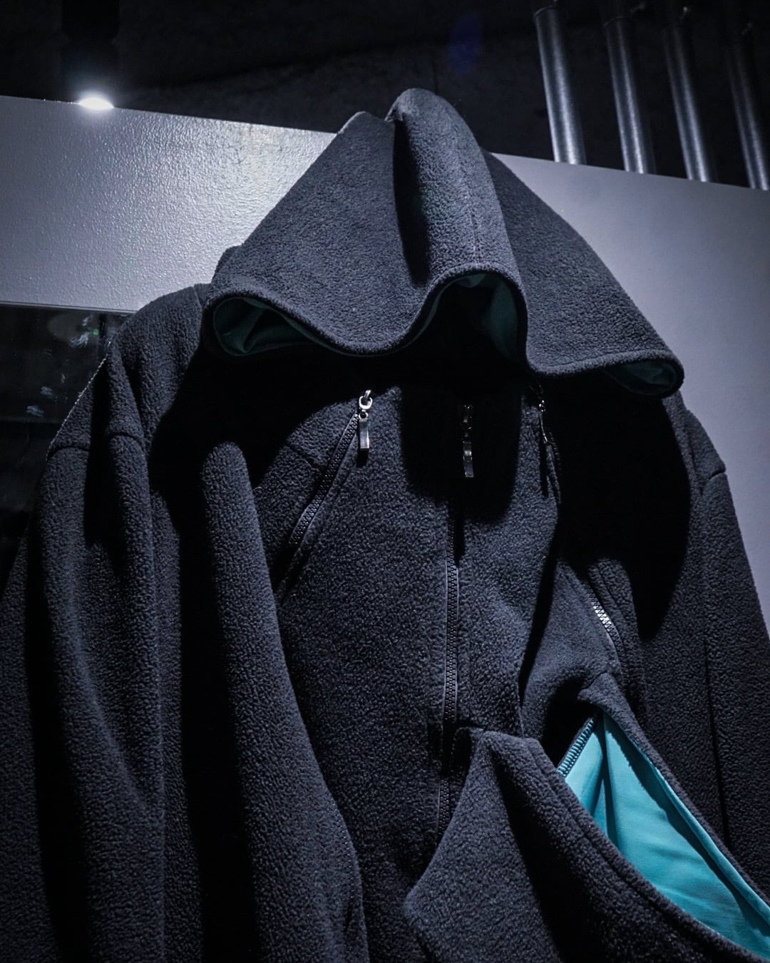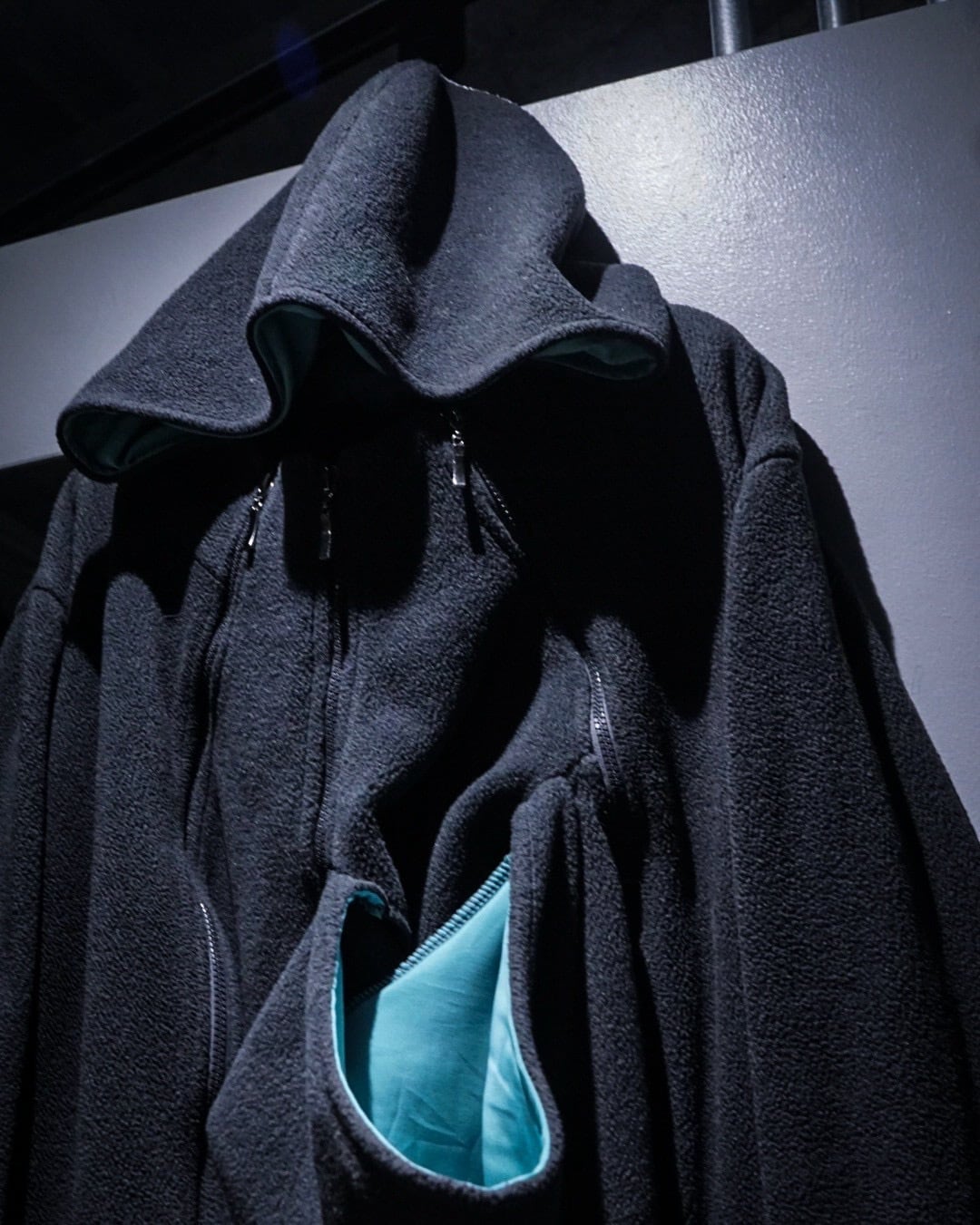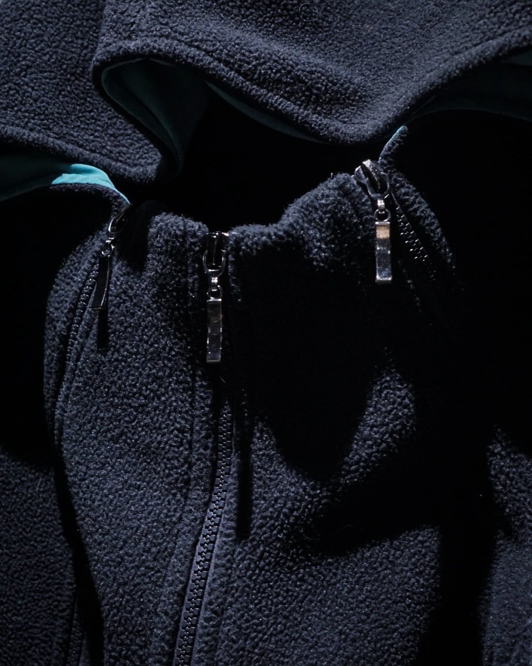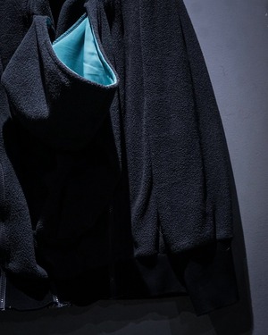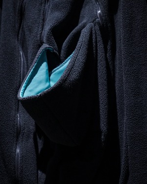 実用的なディテールが自然と興味深いデザインとして落とし込まれ、深いチャコールとアクアブルーで作られた好配色のフリースジップアップフーディ。