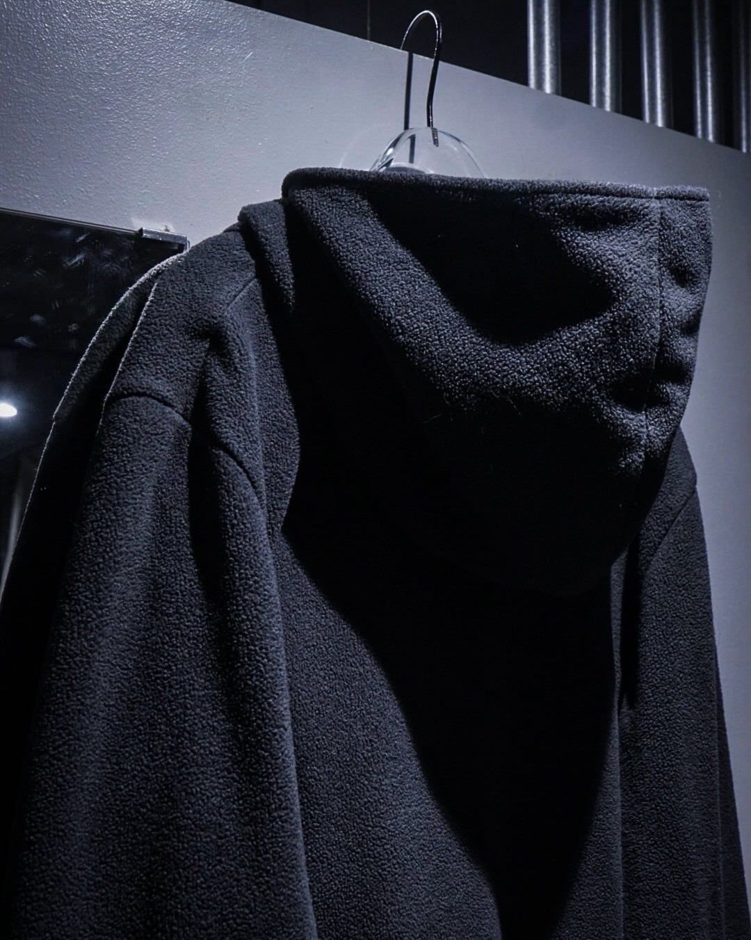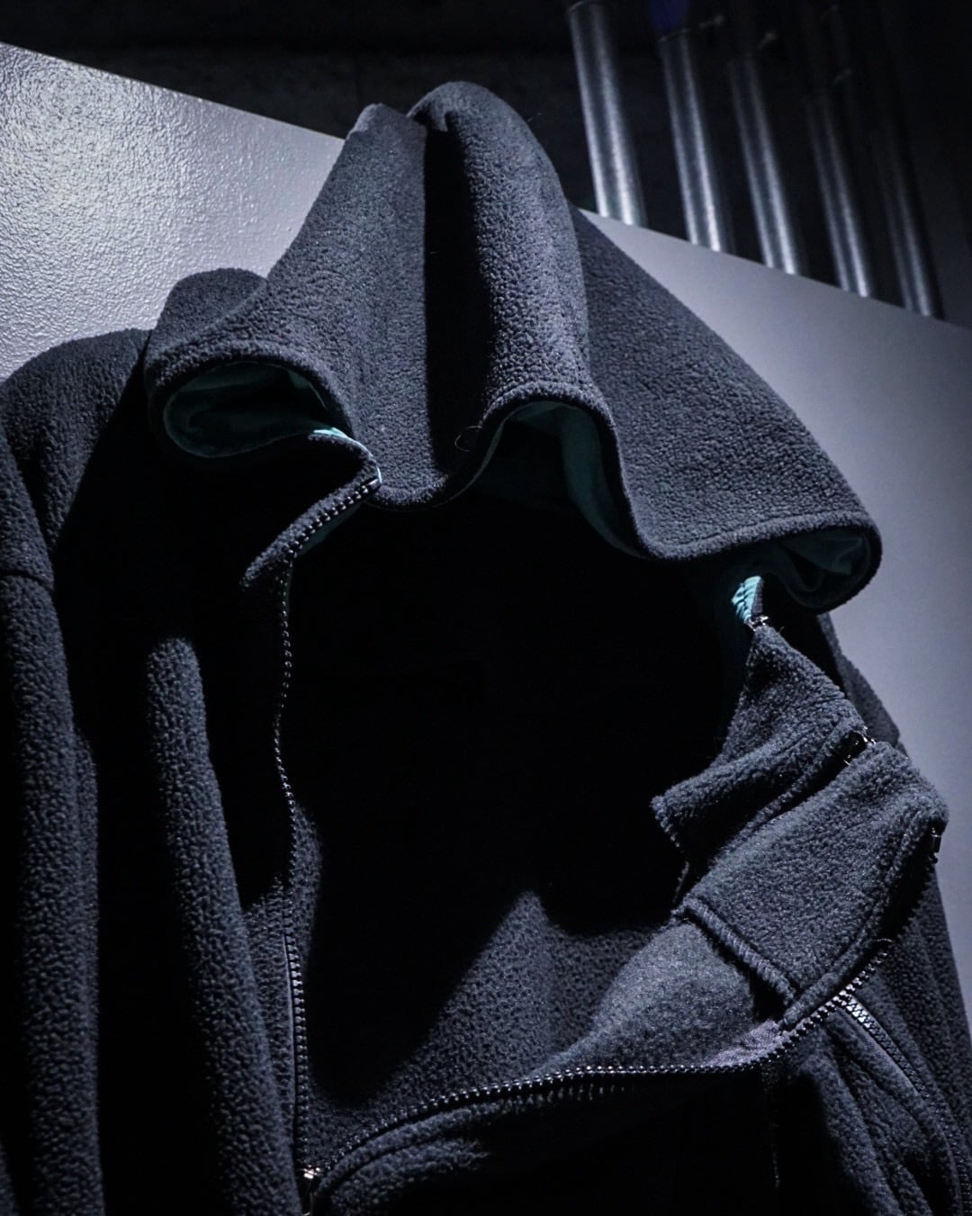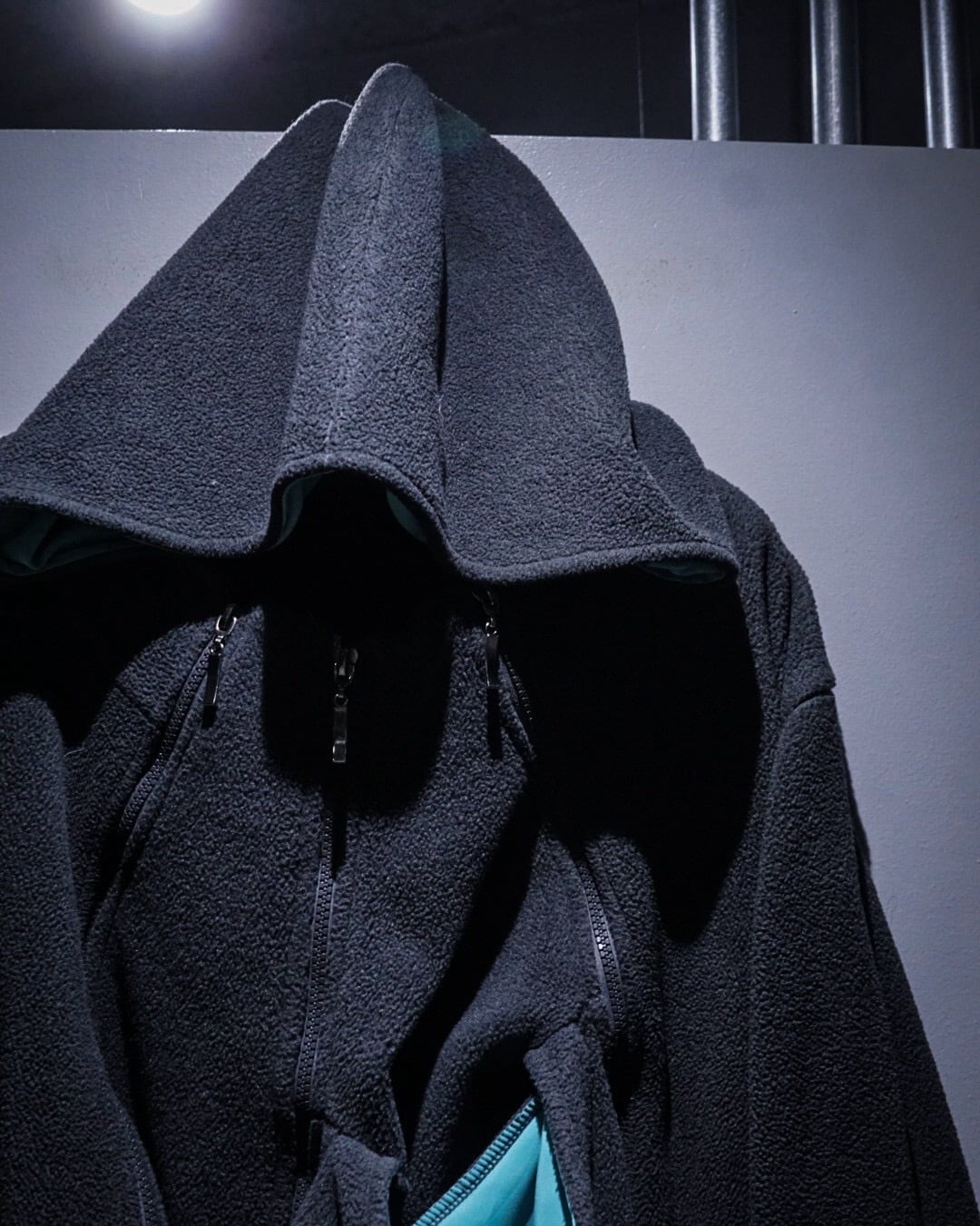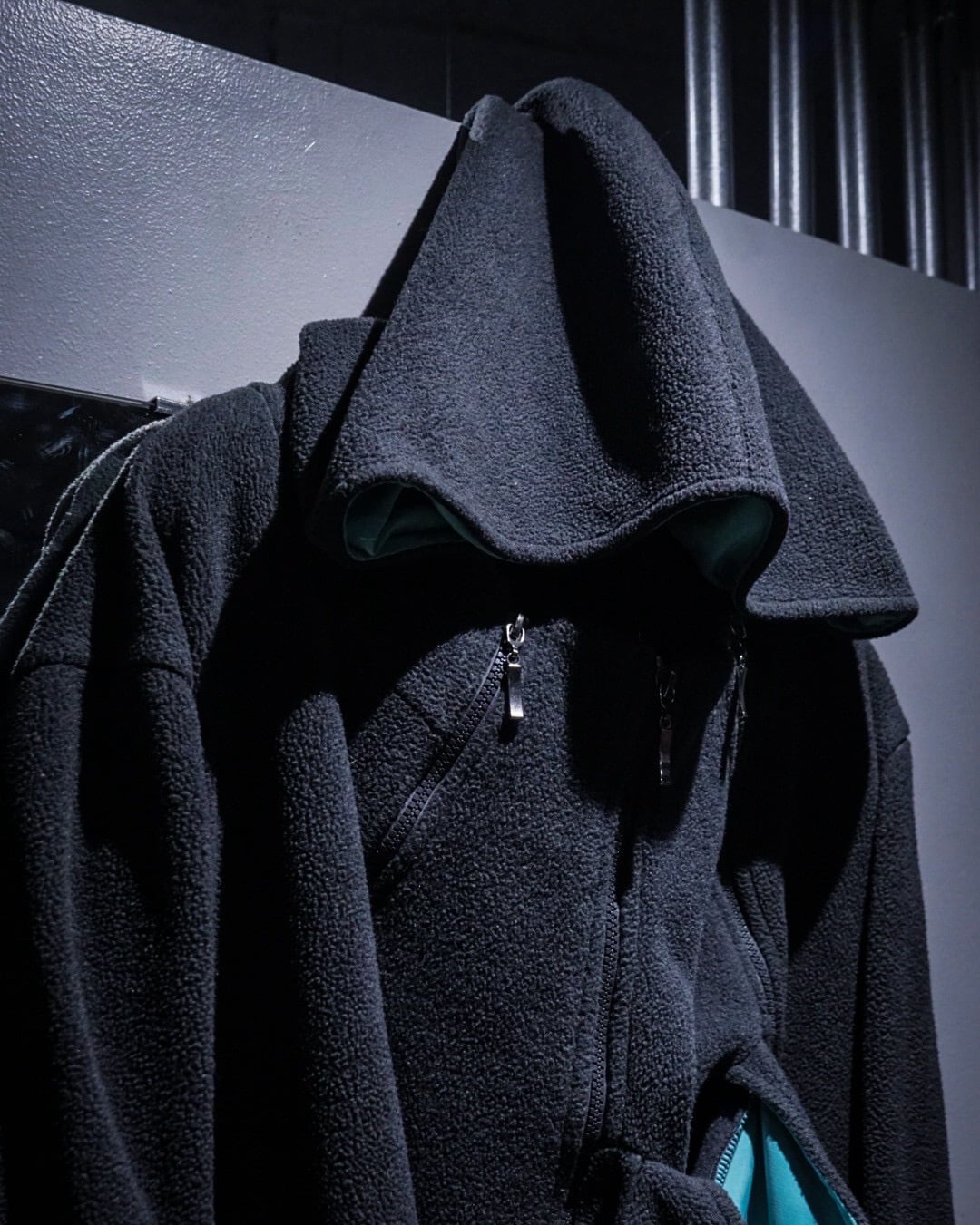 実用的なディテールが自然と興味深いデザインとして落とし込まれ、深いチャコールとアクアブルーで作られた好配色のフリースジップアップフーディ。
