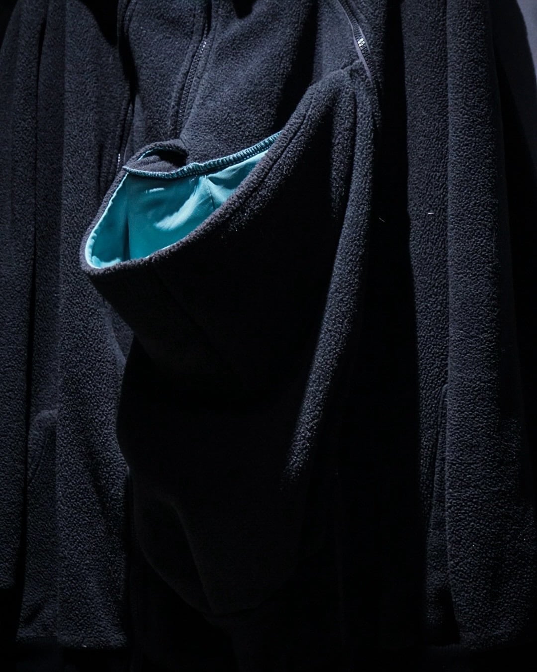 フロントには複数のジップを配置し、開閉によって使い方を調整可能。フード裏には肌触りの良いストレッチ素材を用い、直接触れてもストレスのない仕様に。細かな部分ですが、着用者と赤ちゃん双方への配慮が感じられるポイントです。