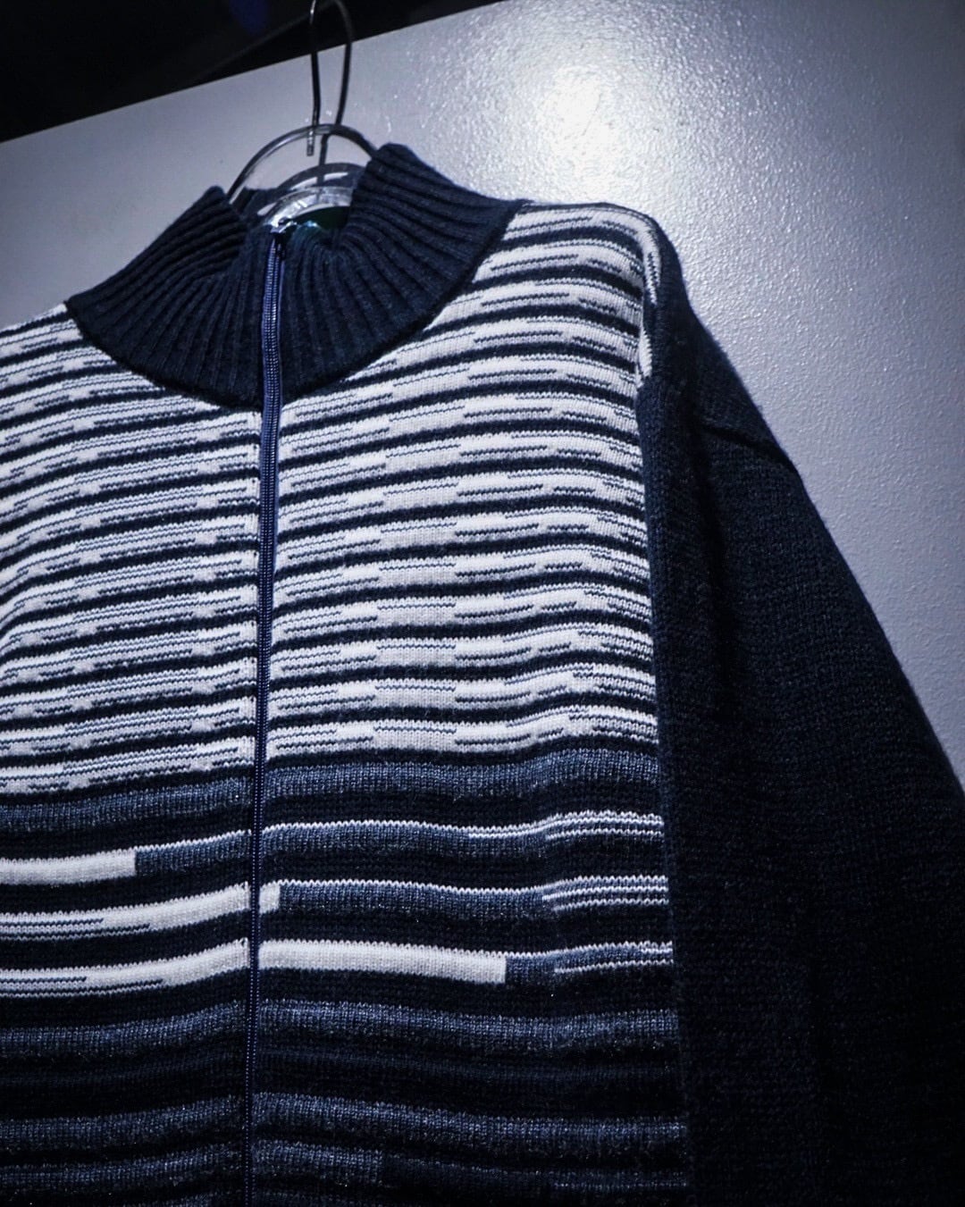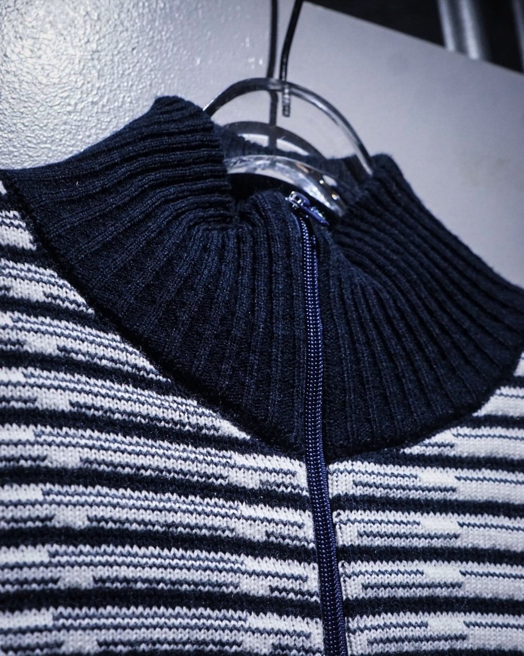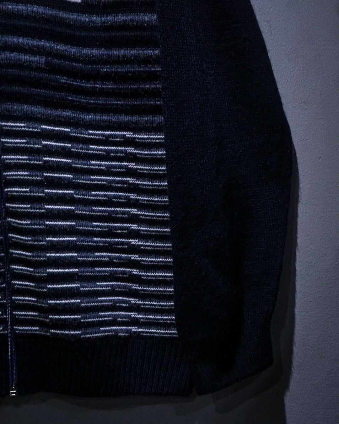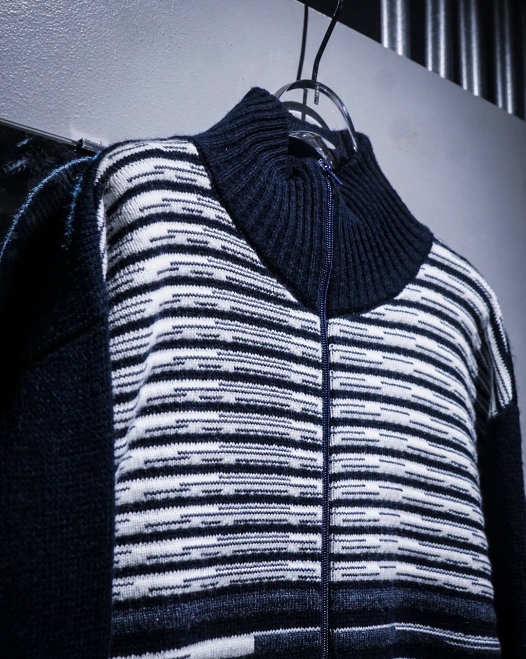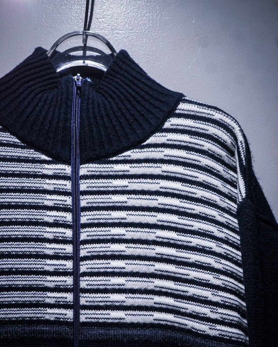 フロントはフルジップ仕様、身頃には濃淡の異なるブラック、グレー、白のモノトーン基調としたボーダー編み柄を配置。視覚的なリズムを持たせつつ、全体は落ち着いたトーンで統一されて、袖と背面は無地ニットで切り替え柄とのコントラストを際立たせています。