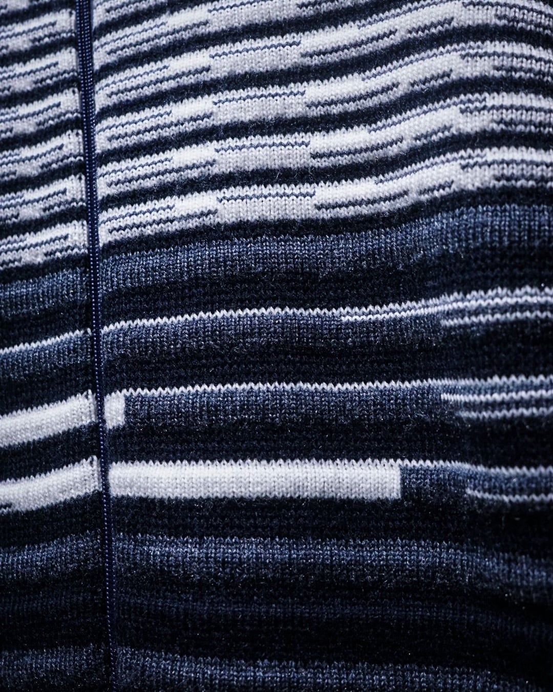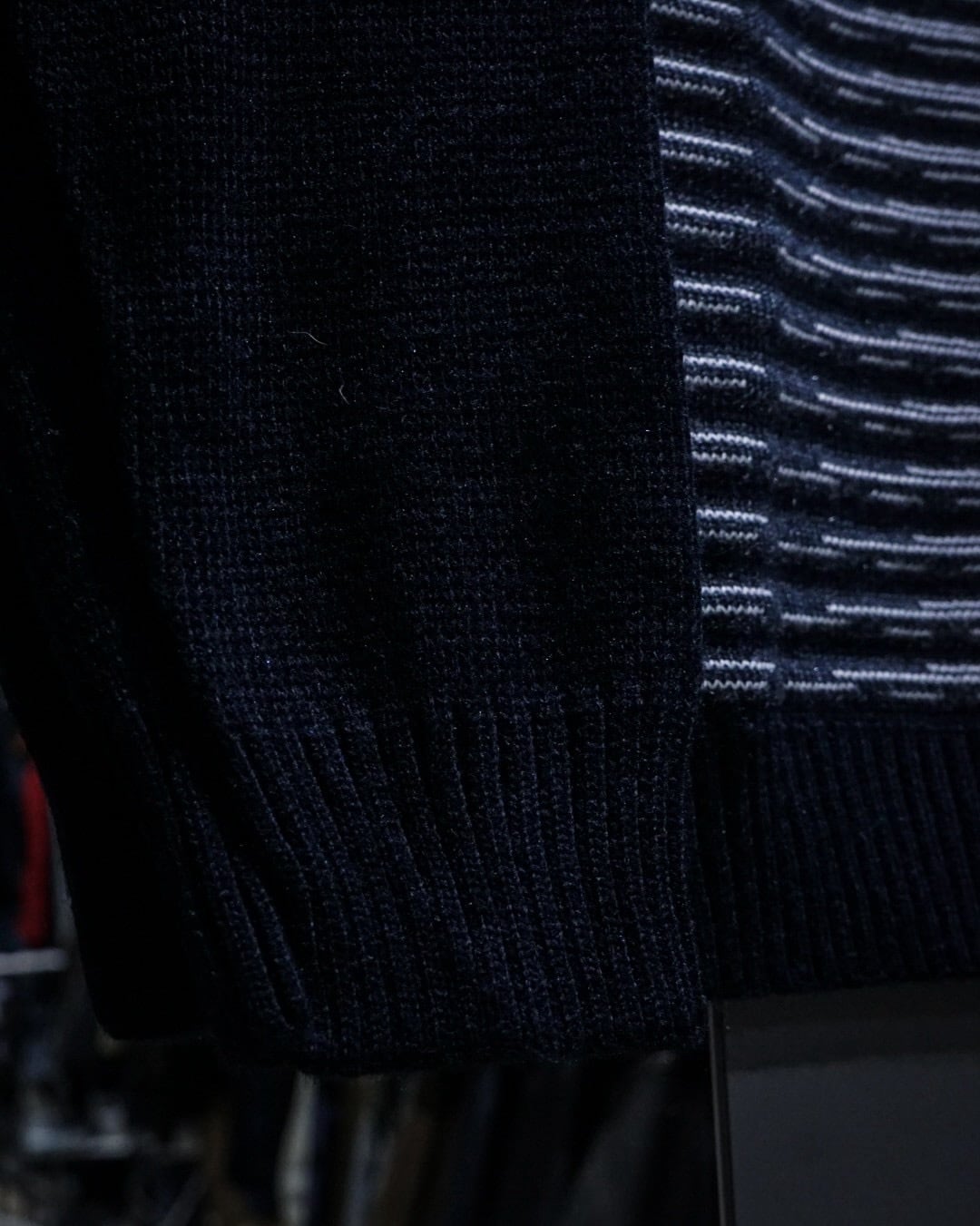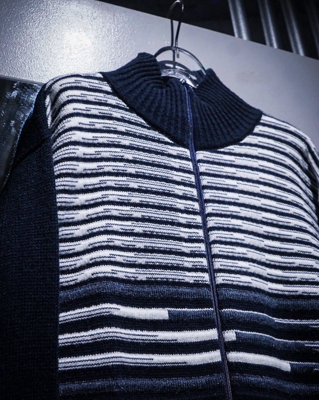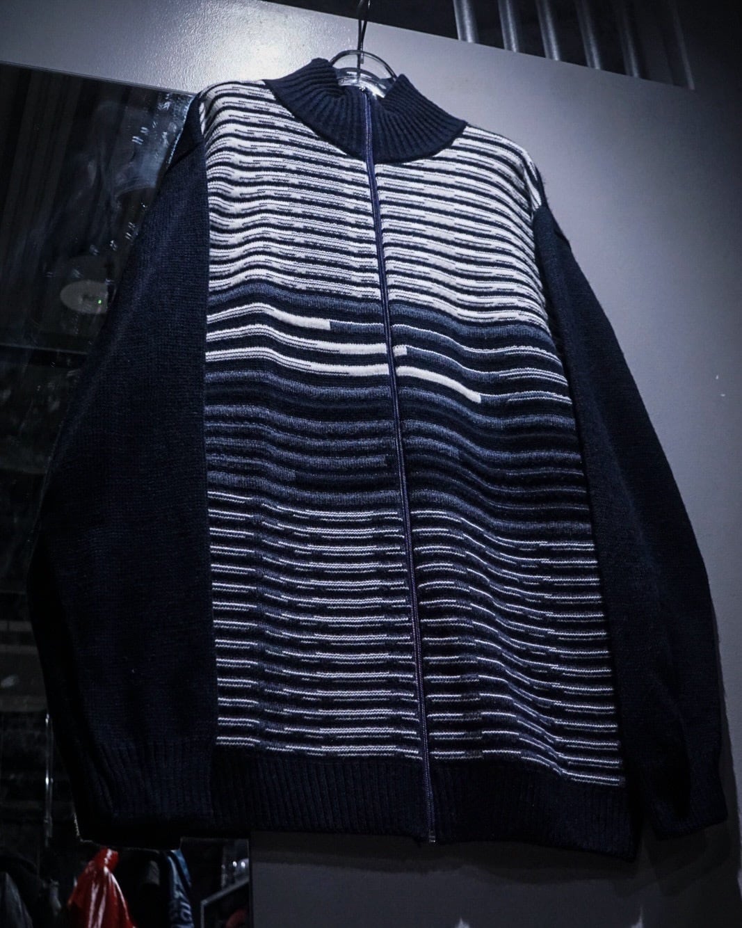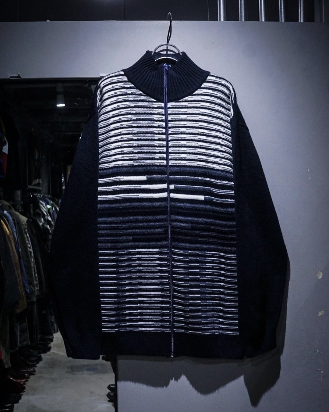 フロントはフルジップ仕様、身頃には濃淡の異なるブラック、グレー、白のモノトーン基調としたボーダー編み柄を配置。視覚的なリズムを持たせつつ、全体は落ち着いたトーンで統一されて、袖と背面は無地ニットで切り替え柄とのコントラストを際立たせています。