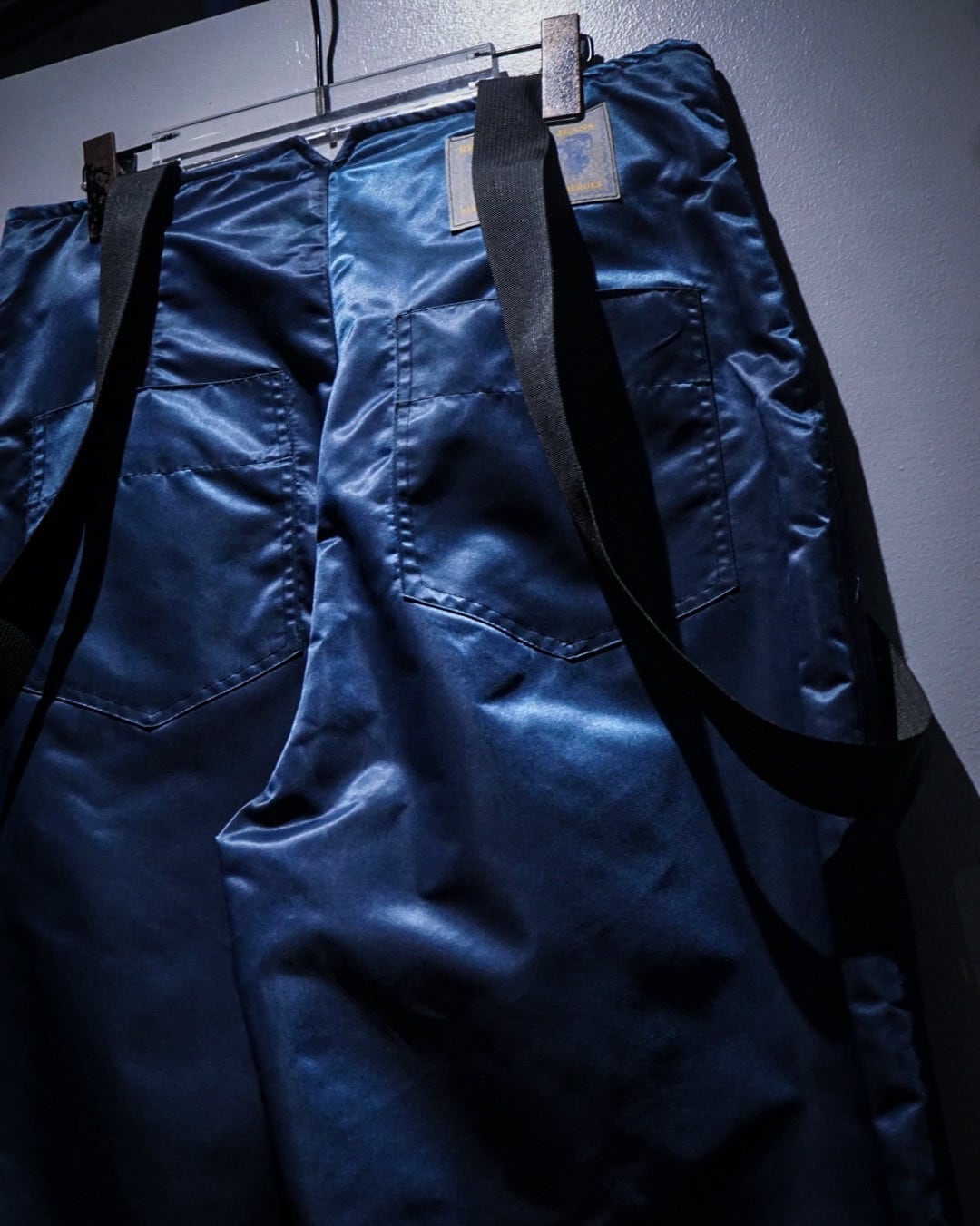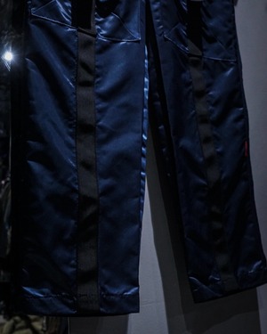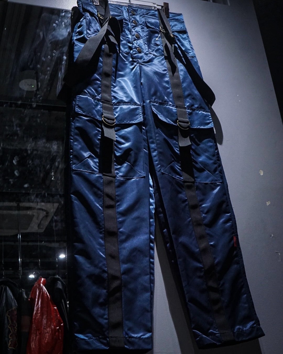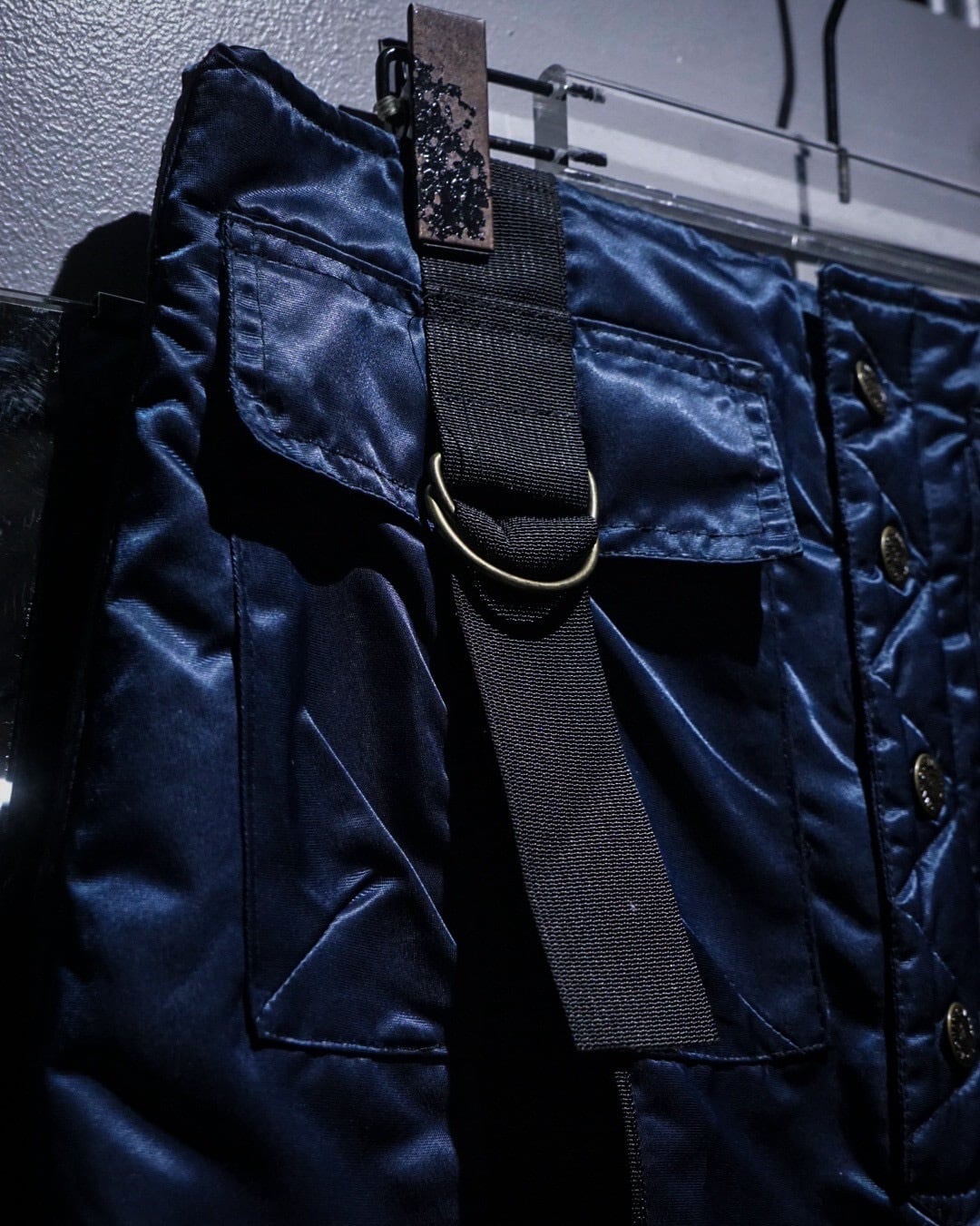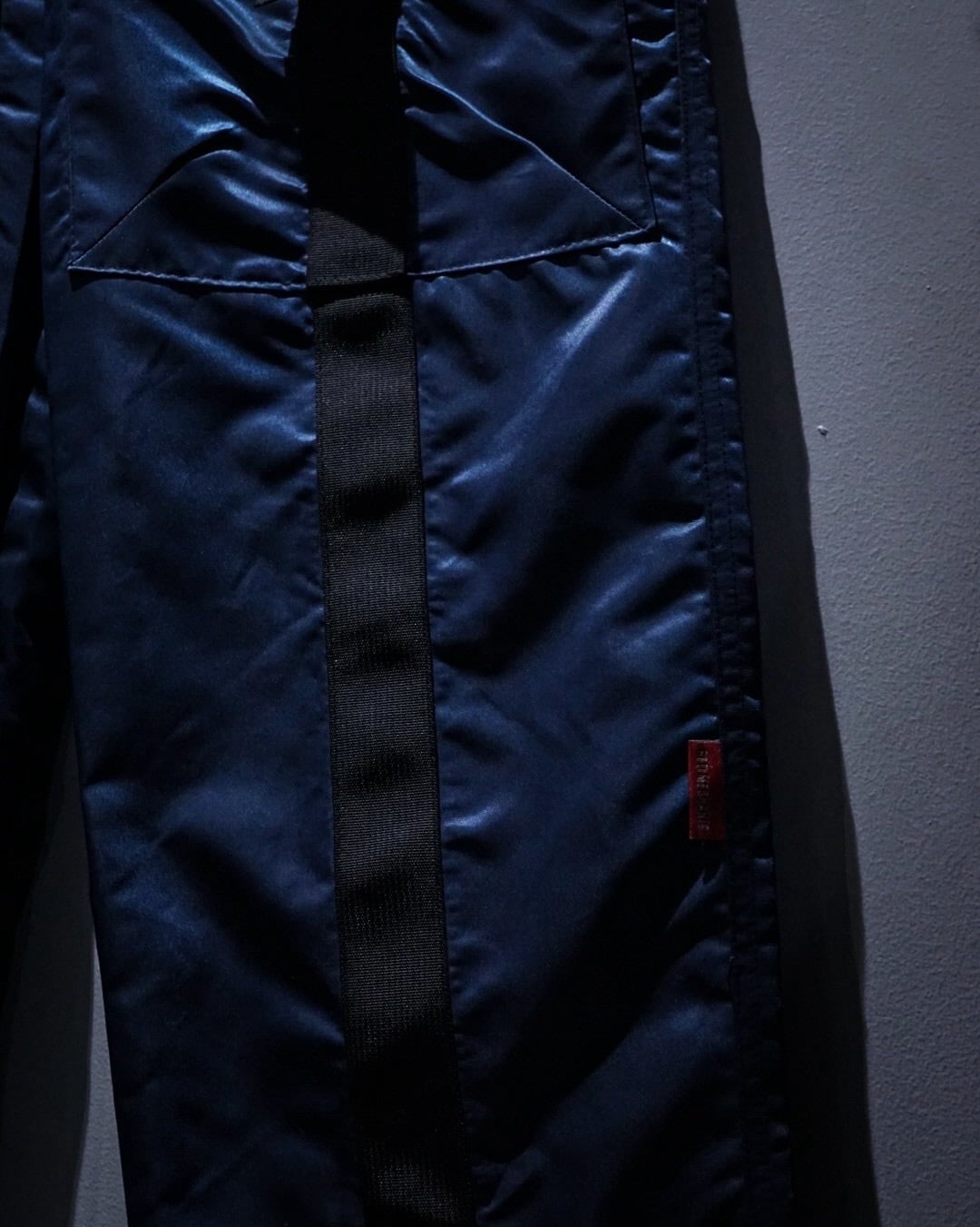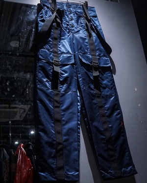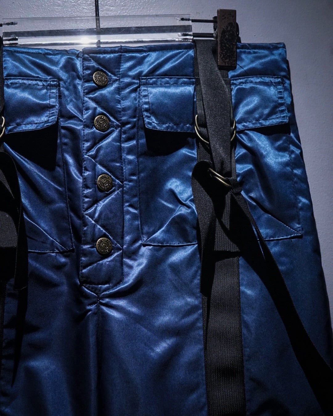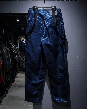 中綿入りのヘヴィなナイロンボディに、ボードパンツを思わせるワイドシルエット。Dカン付きストラップやサスペンダー仕様など、当時のスノー/スケート/レイブカルチャーを象徴するディテールが随所に詰め込まれた一本です。