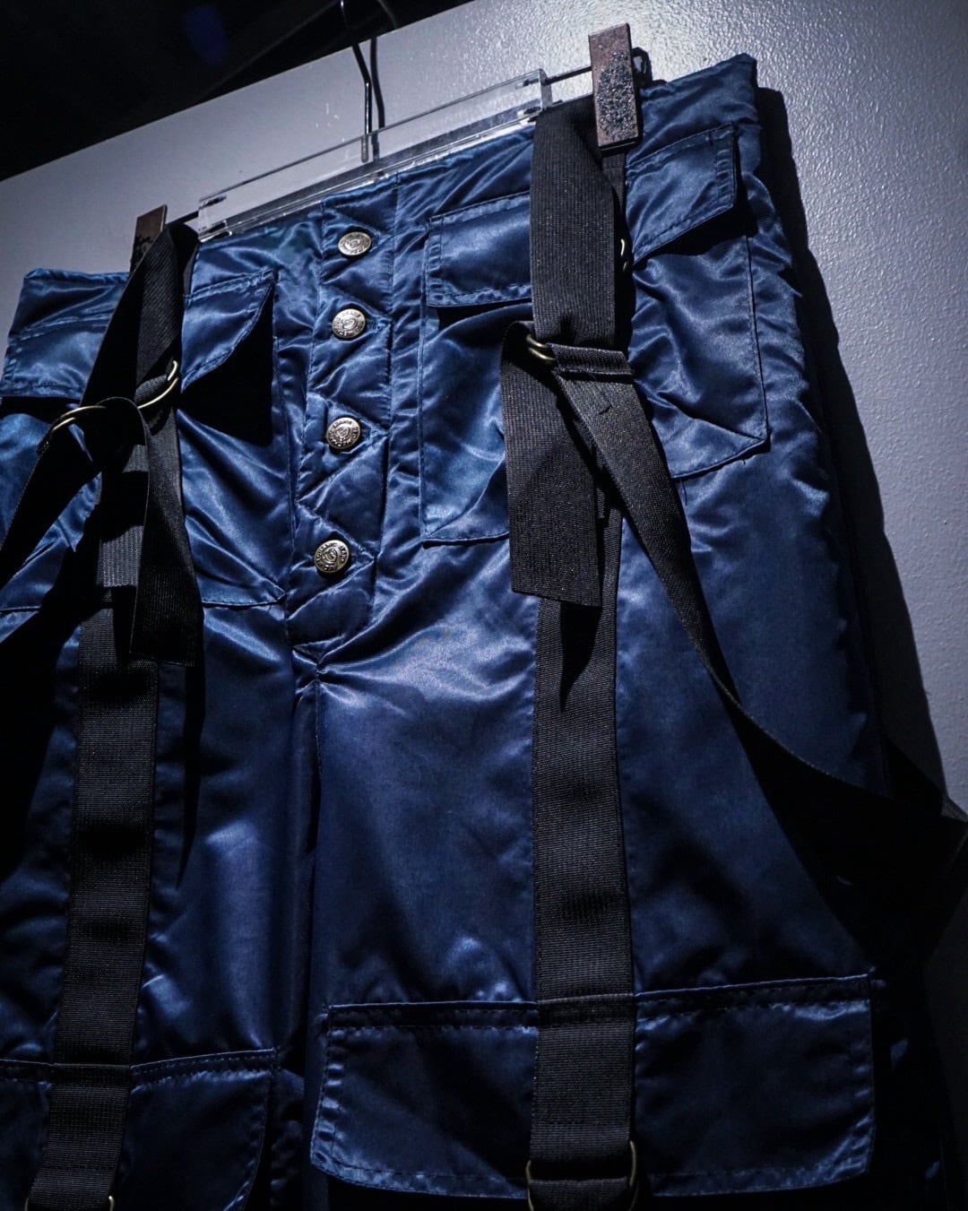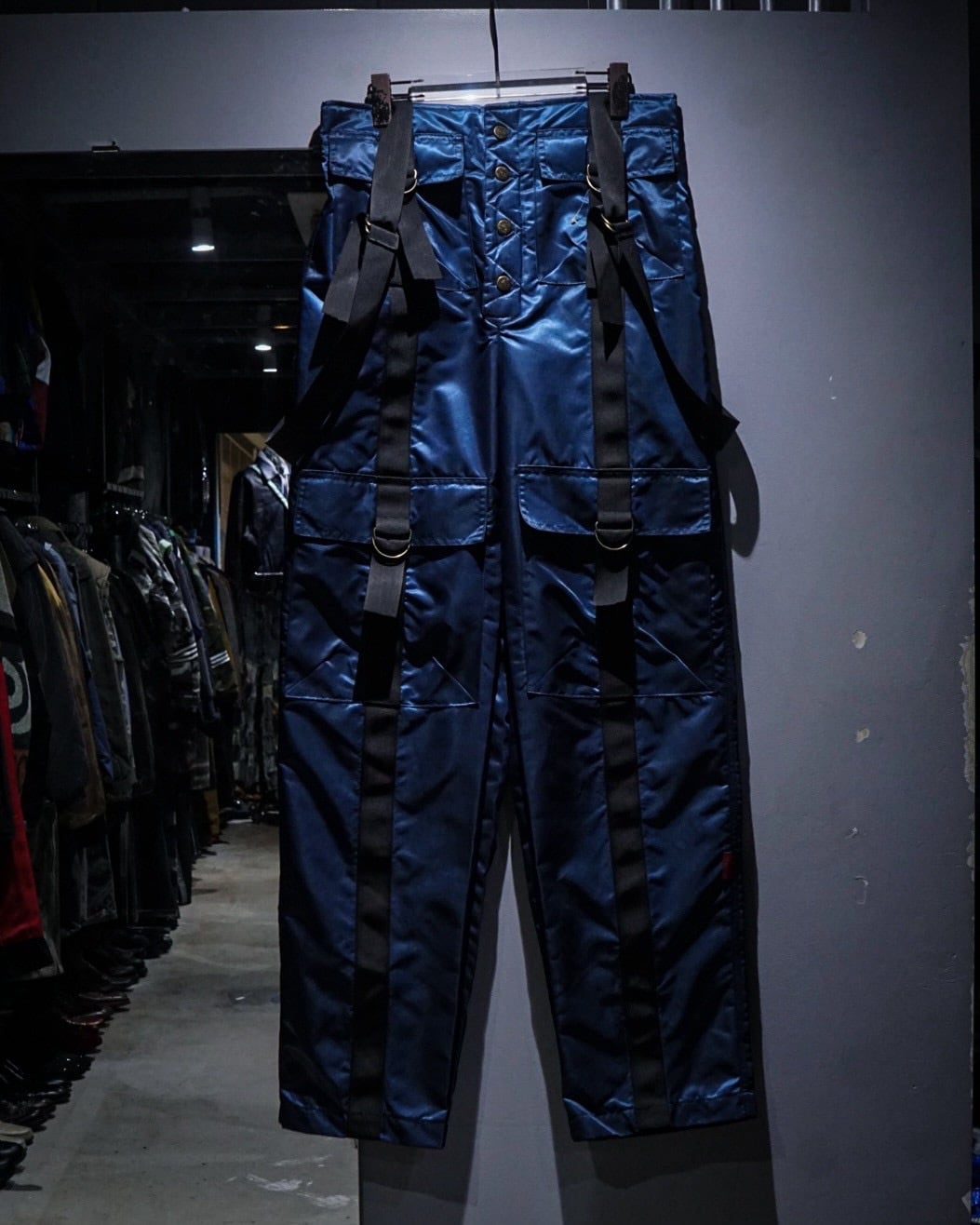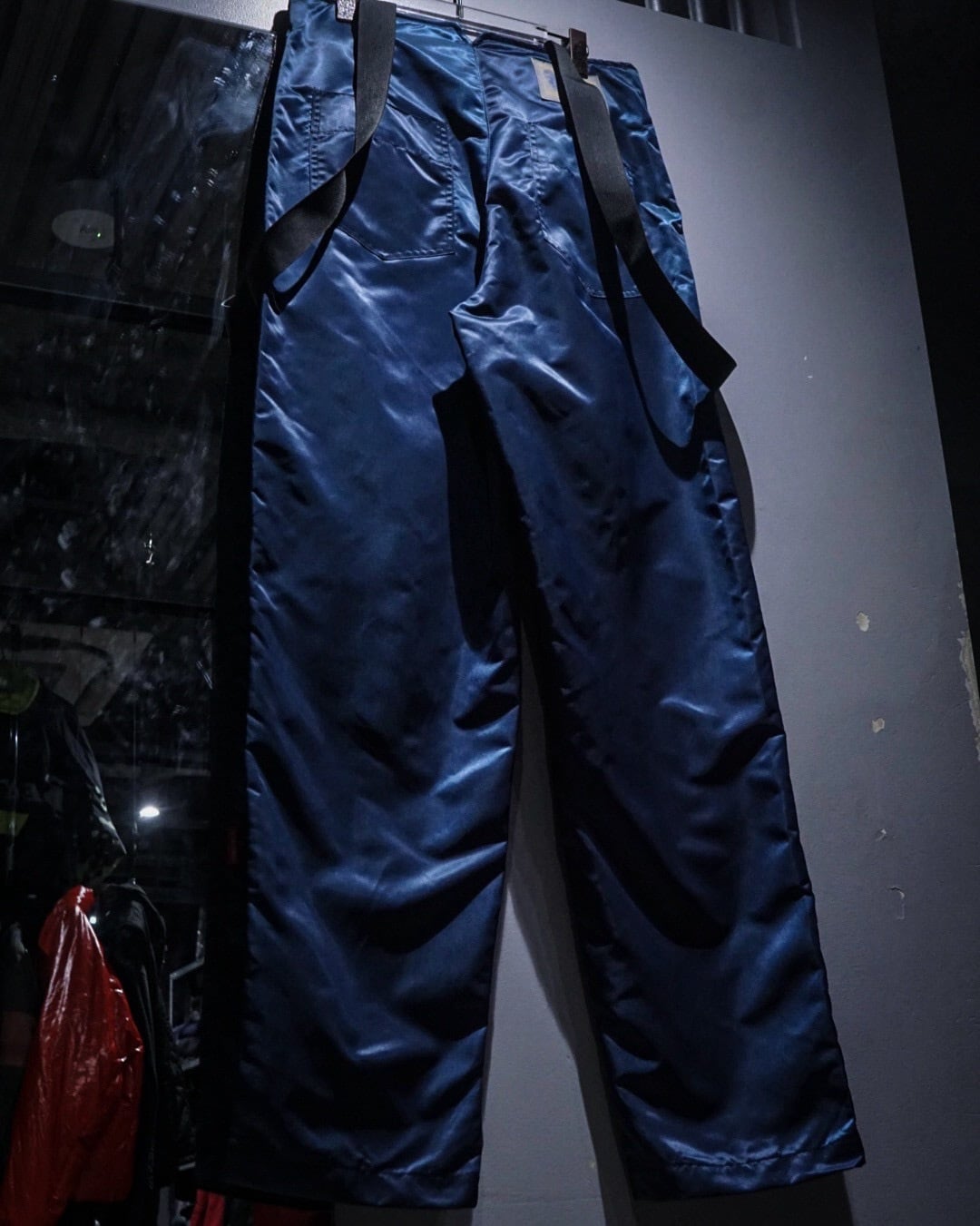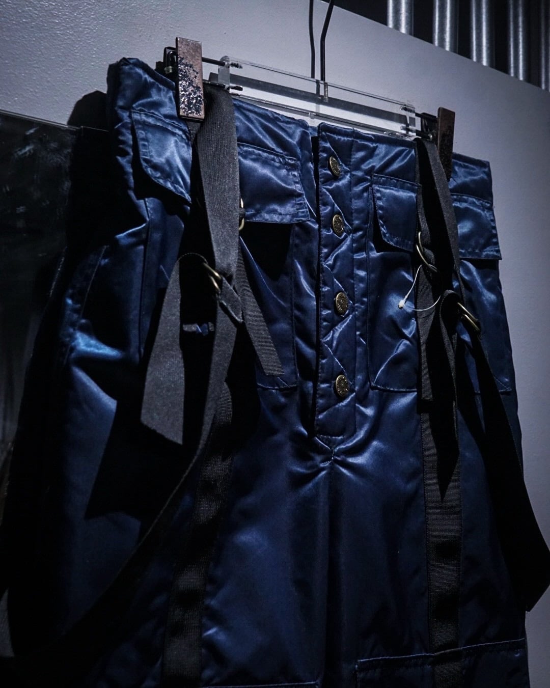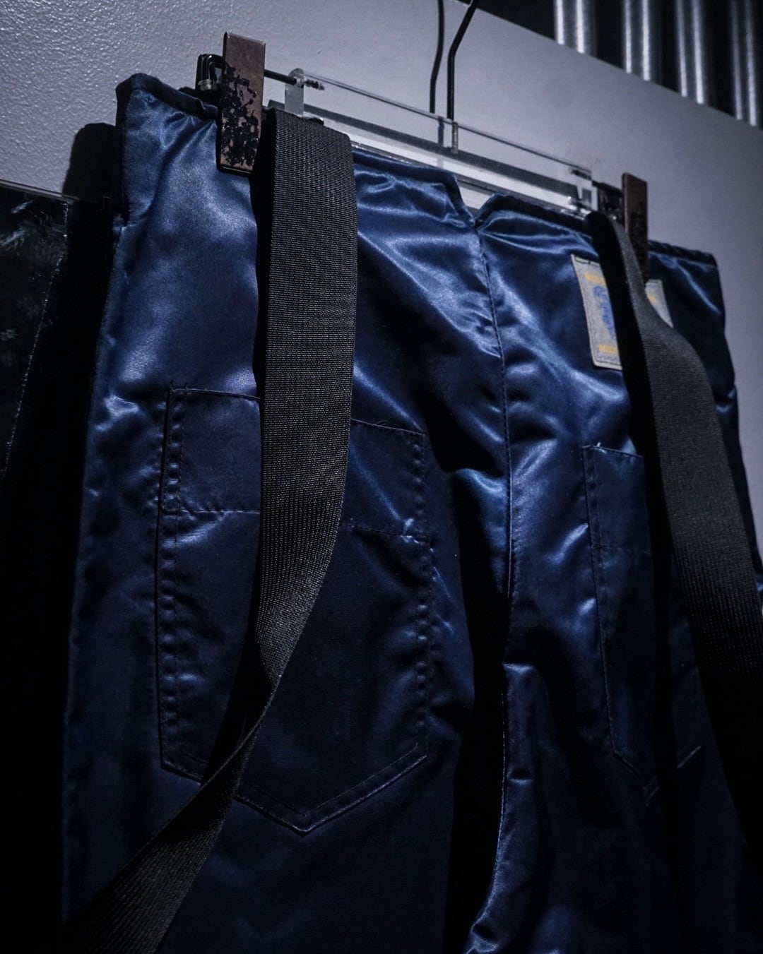 中綿入りのヘヴィなナイロンボディに、ボードパンツを思わせるワイドシルエット。Dカン付きストラップやサスペンダー仕様など、当時のスノー/スケート/レイブカルチャーを象徴するディテールが随所に詰め込まれた一本です。