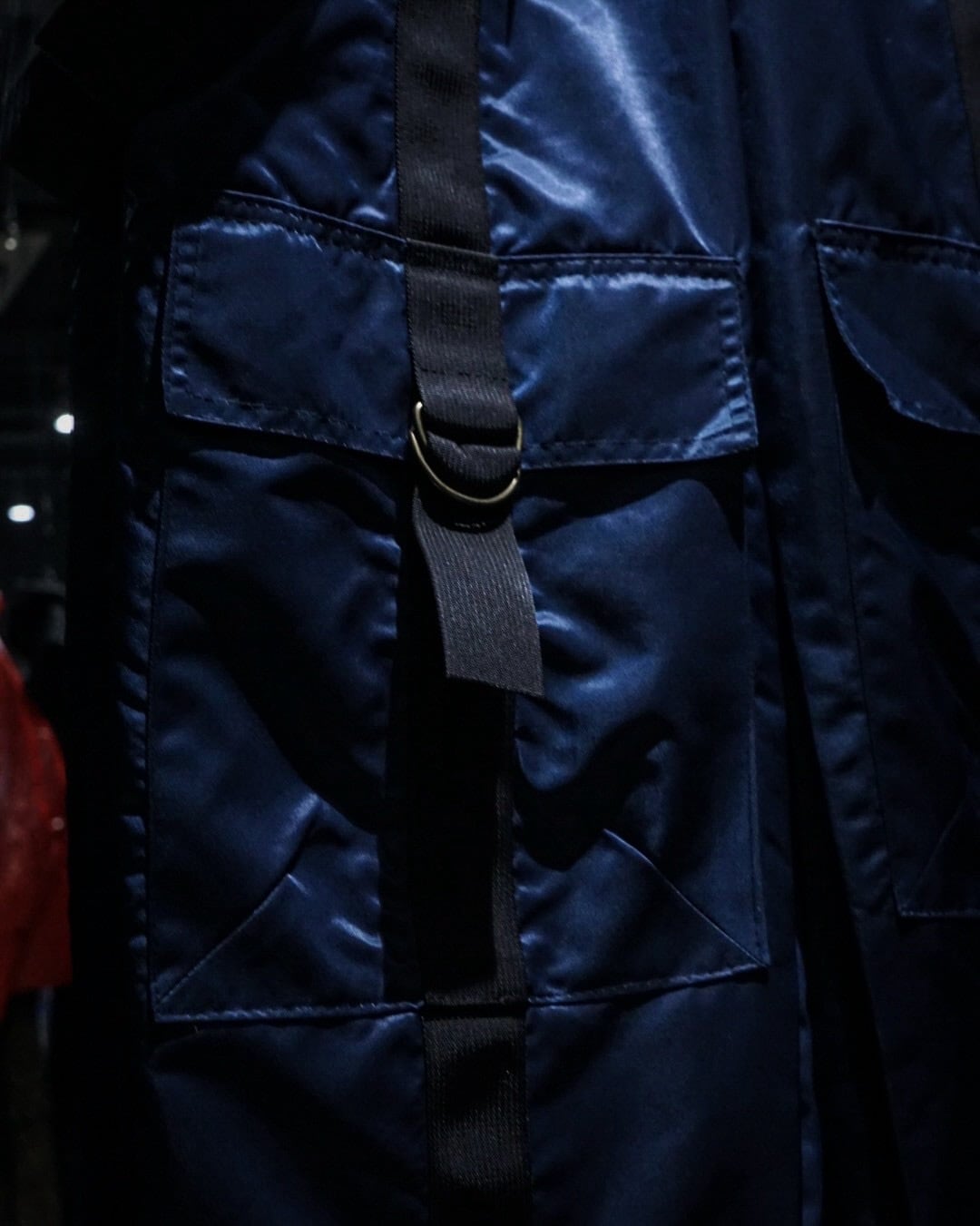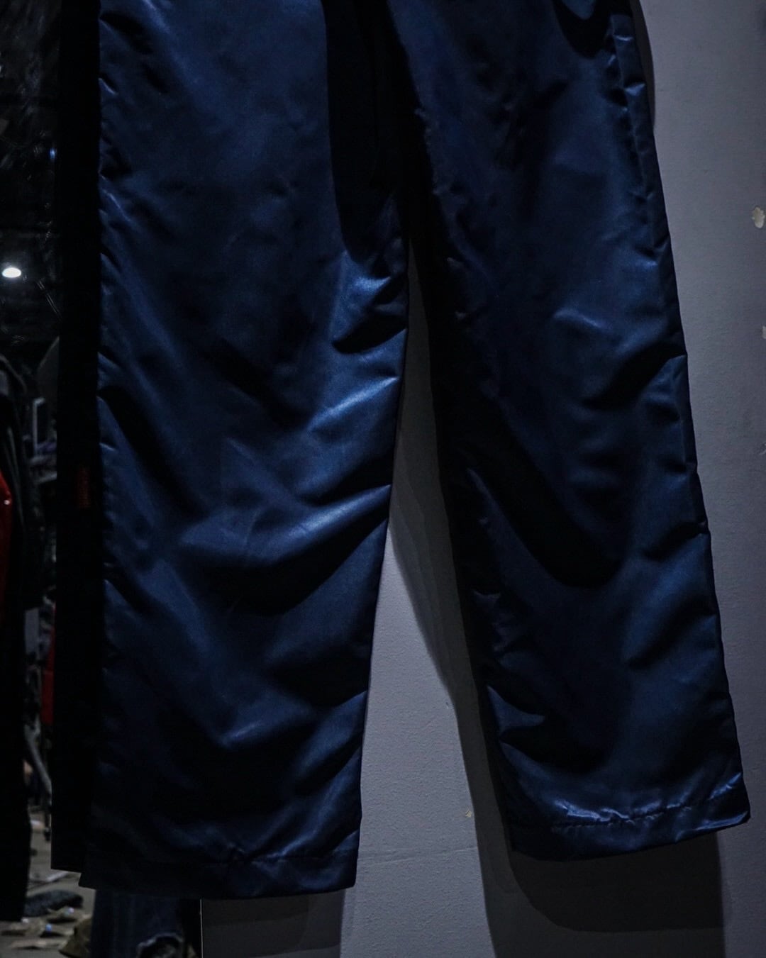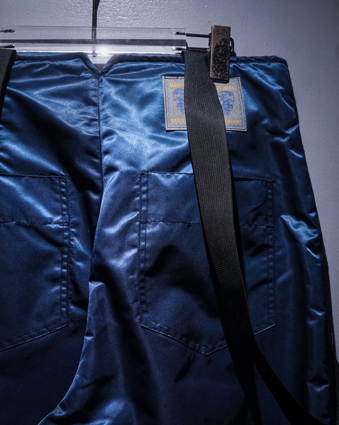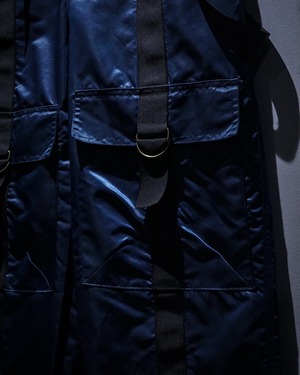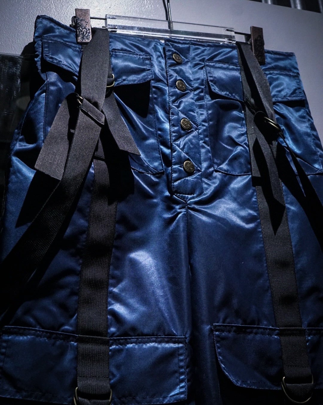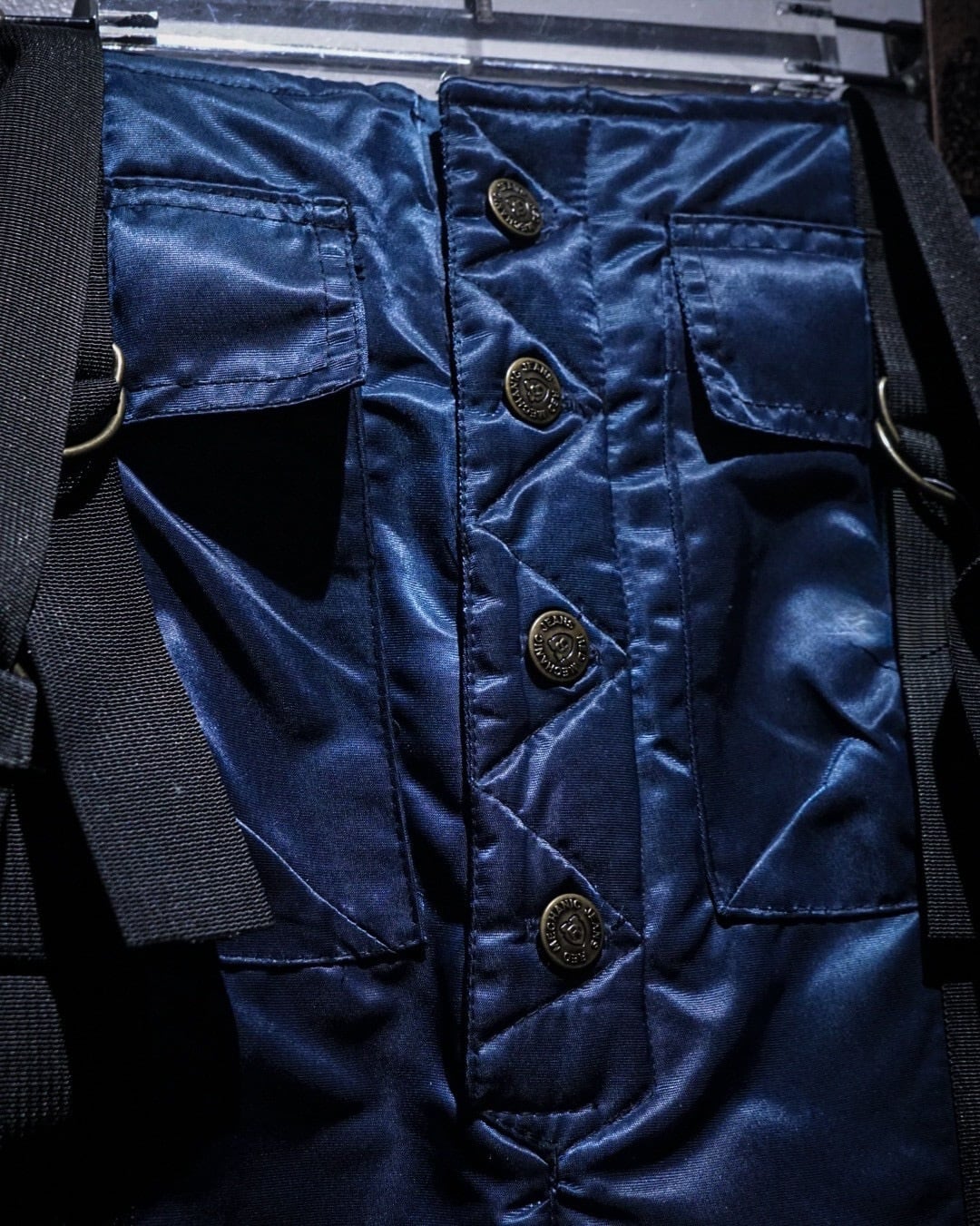 中綿入りのヘヴィなナイロンボディに、ボードパンツを思わせるワイドシルエット。Dカン付きストラップやサスペンダー仕様など、当時のスノー/スケート/レイブカルチャーを象徴するディテールが随所に詰め込まれた一本です。