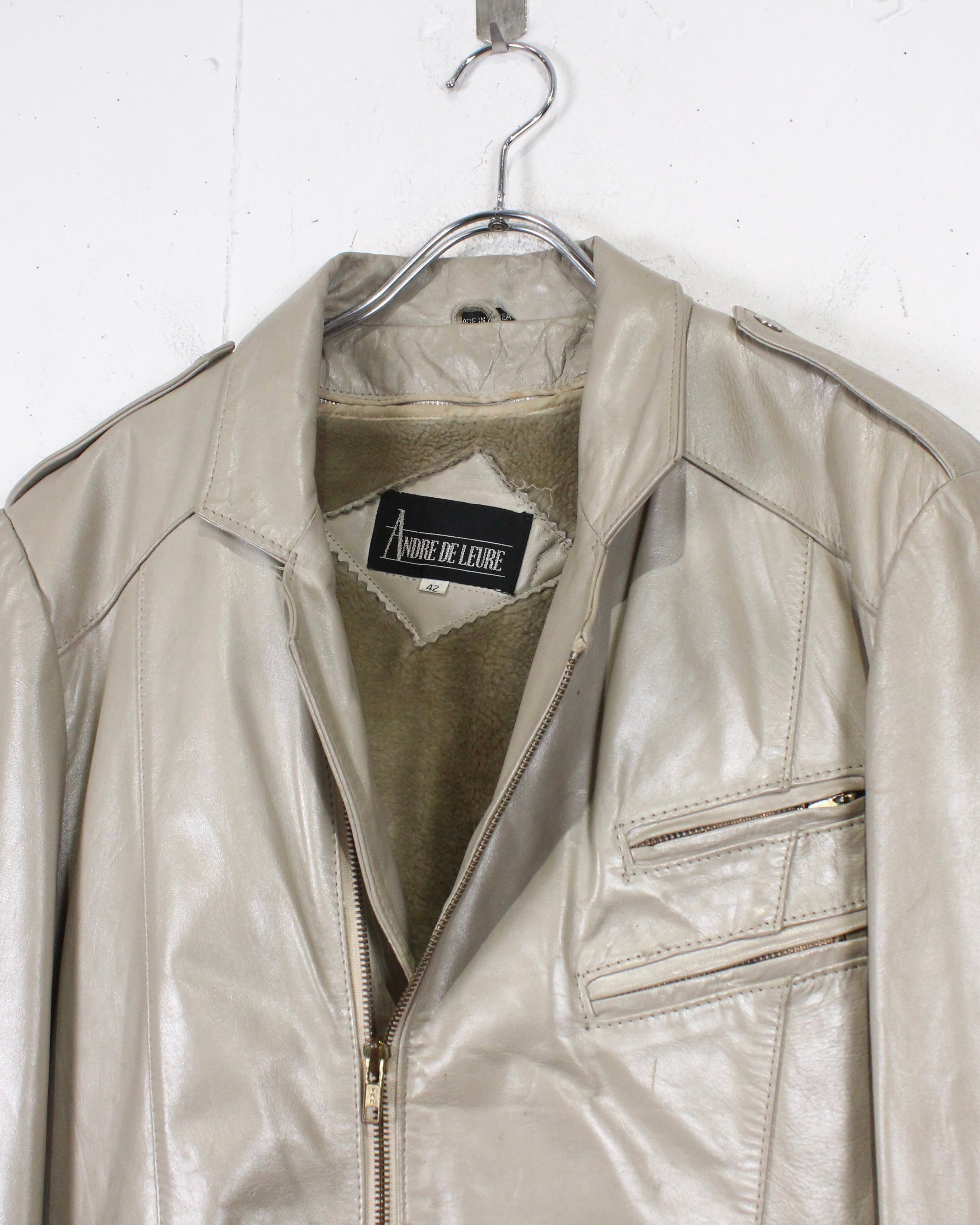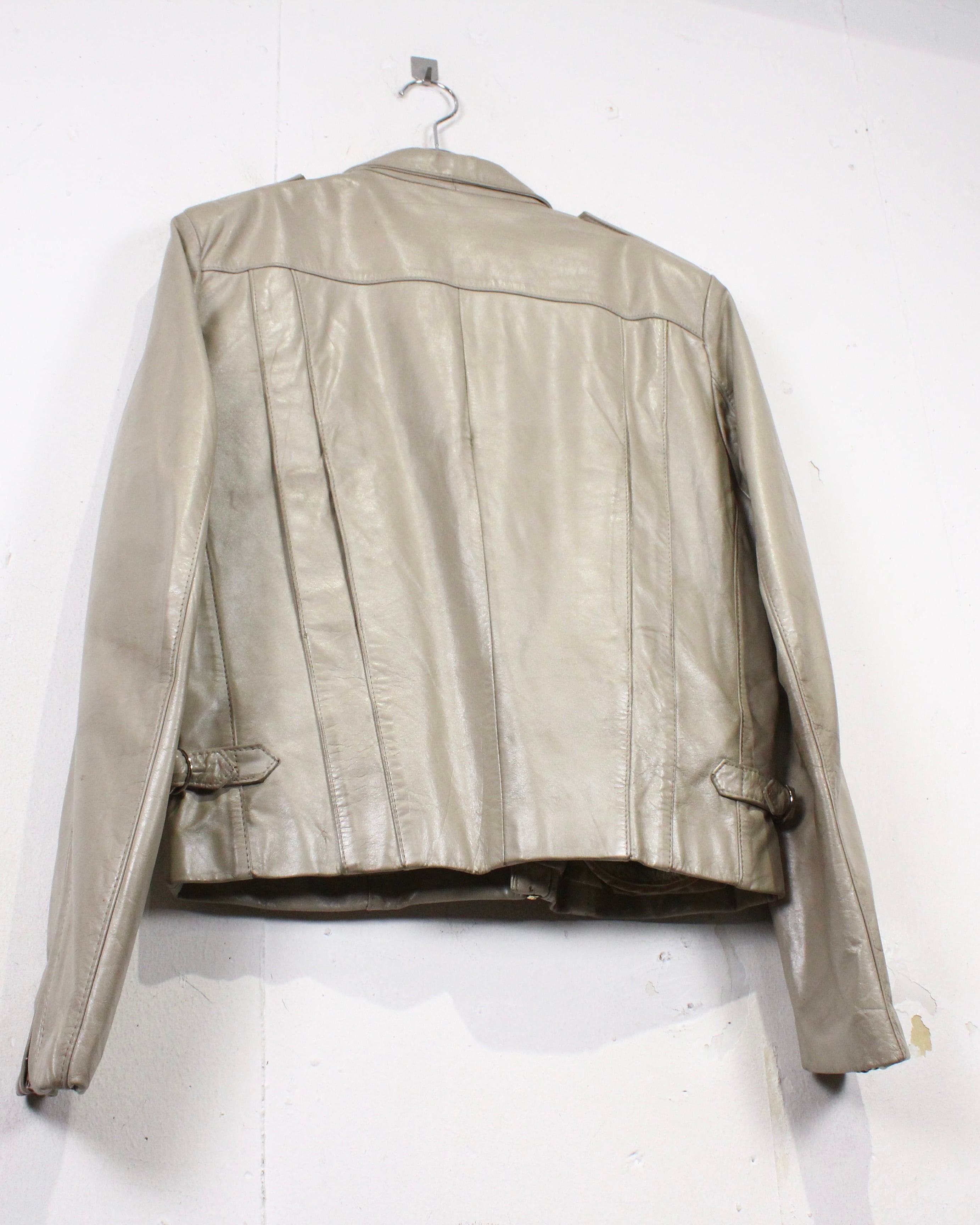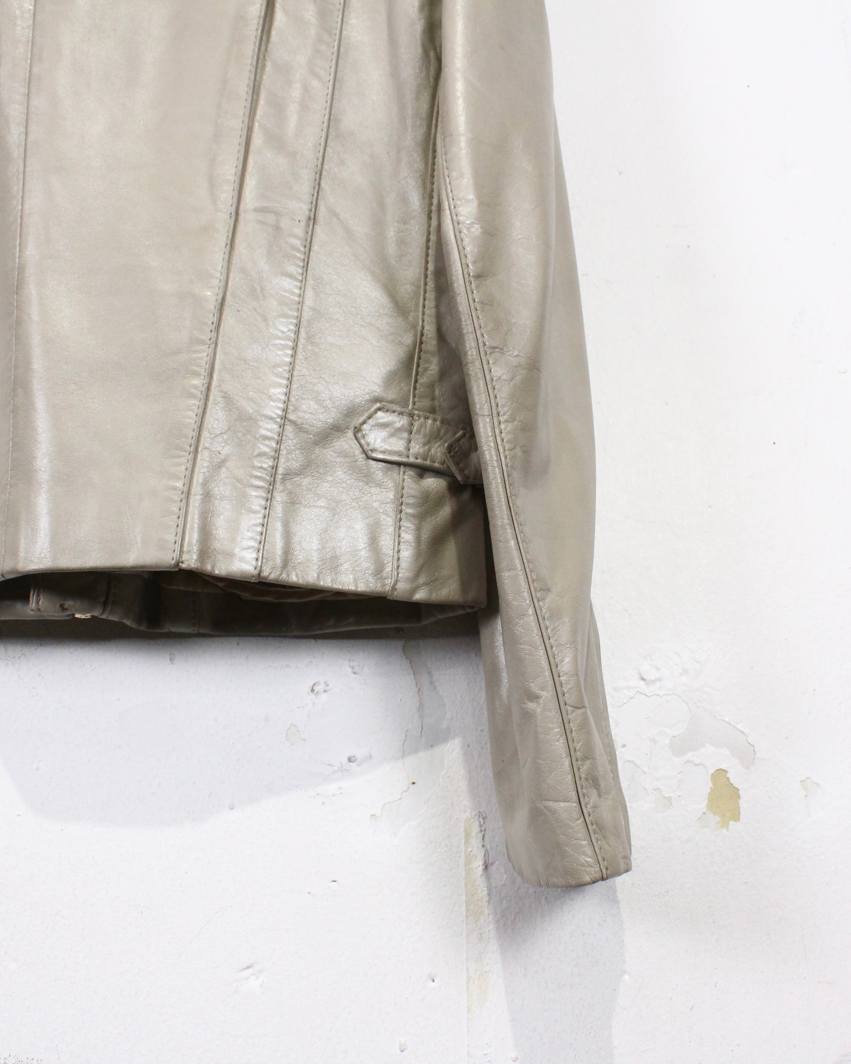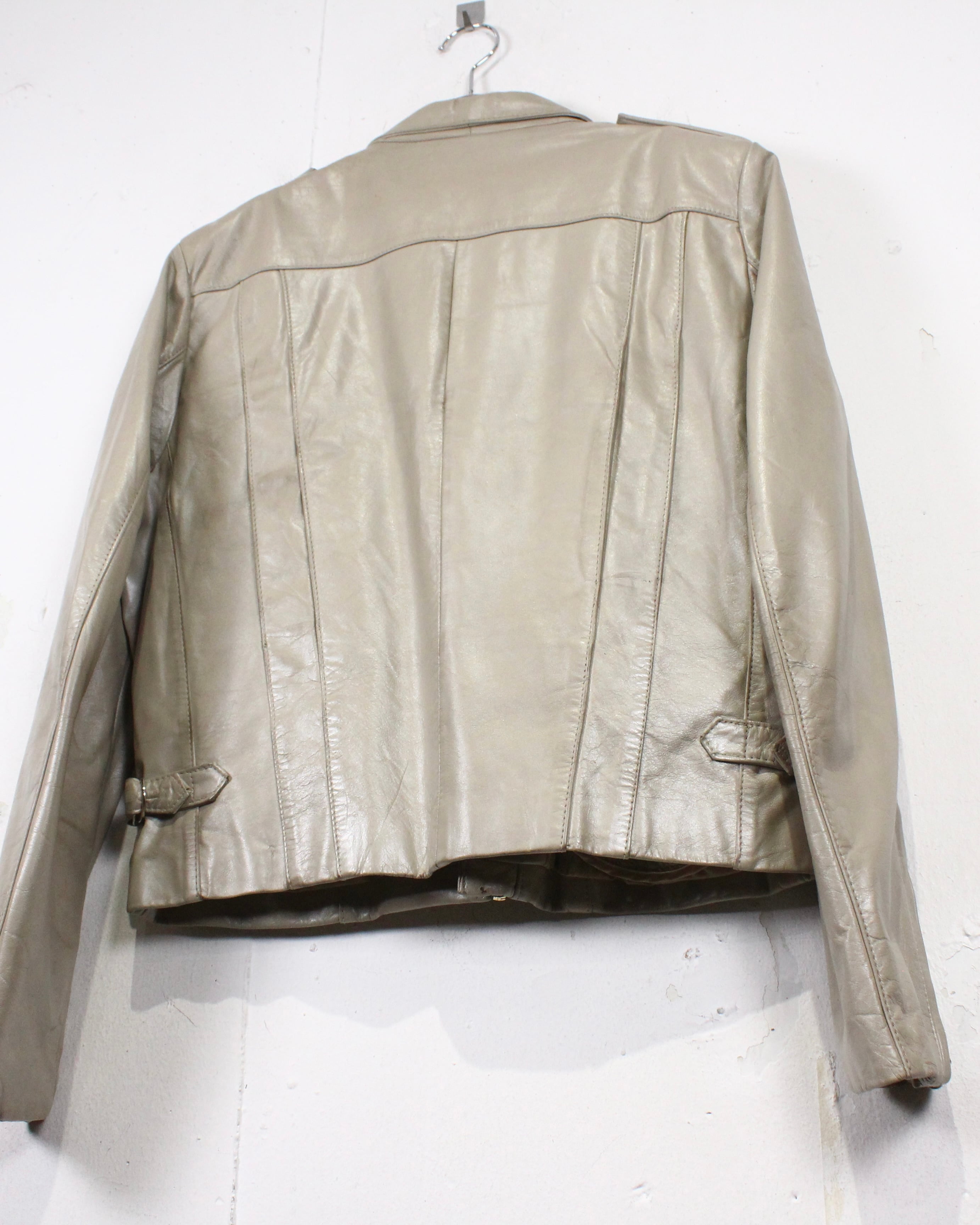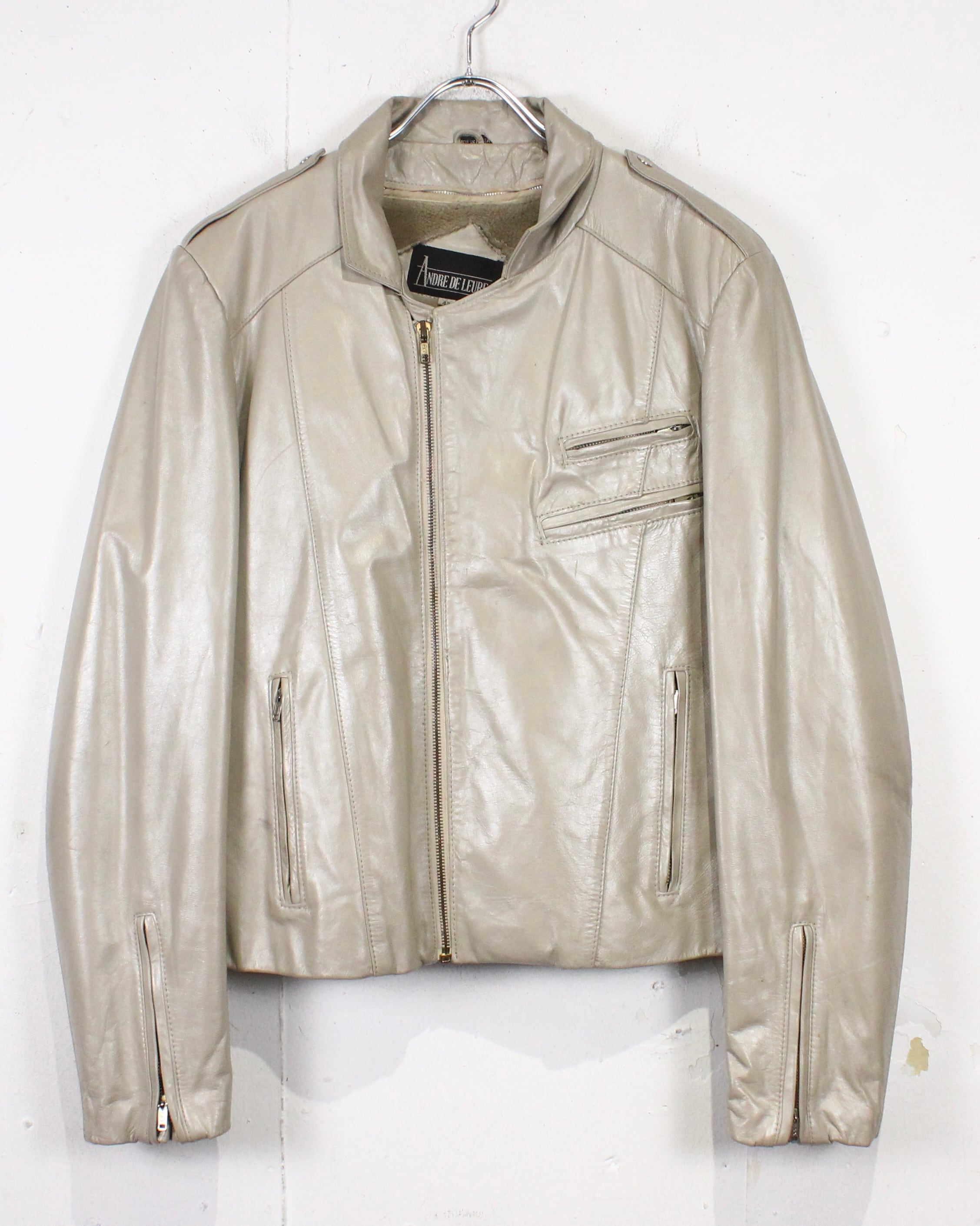 レザー特有の重厚さをしっかり残しながらも、パールホワイトならではの柔らかな発色が加わることで、無骨さとラグジュアリーさが自然に合わさった1着に仕上がっています。