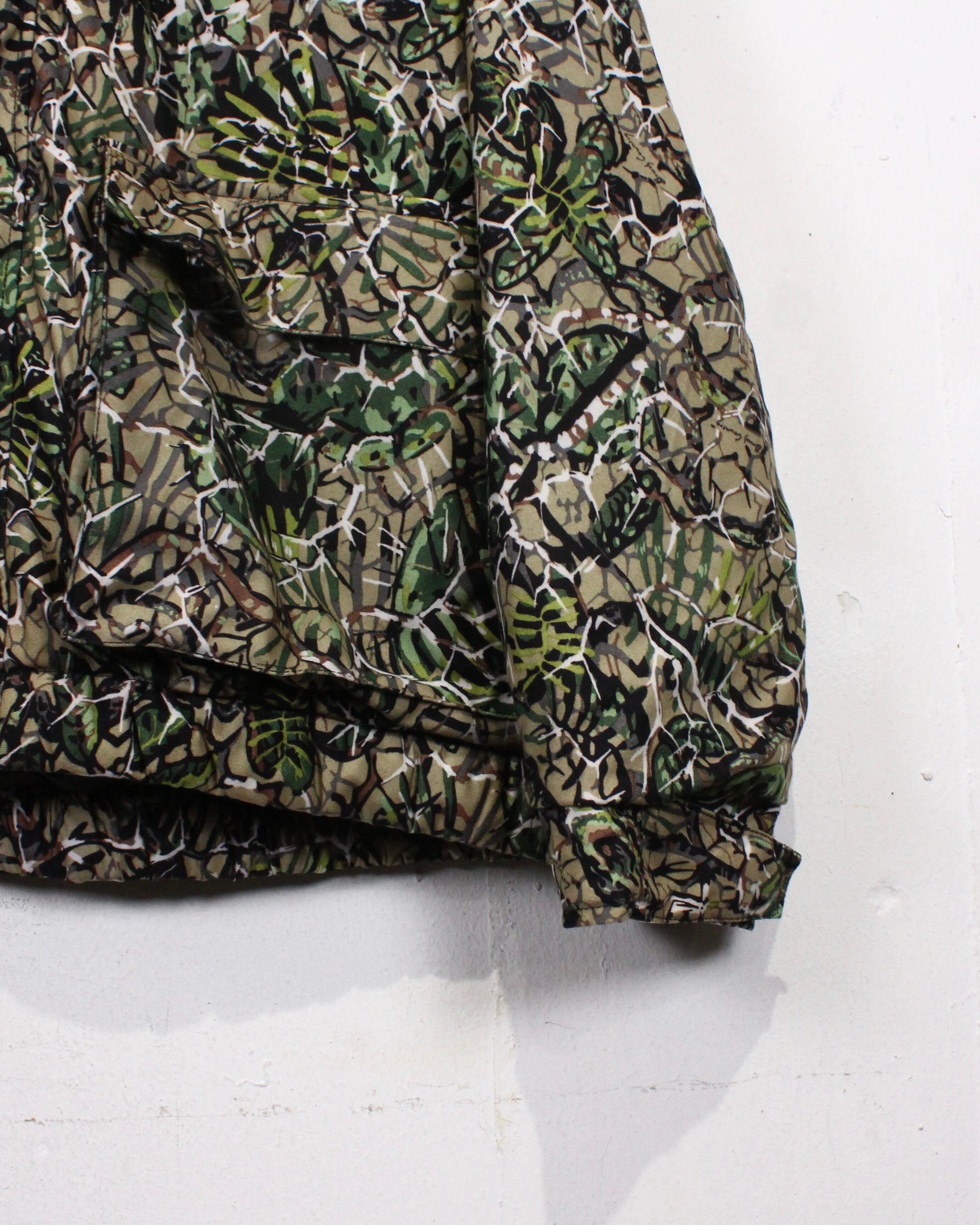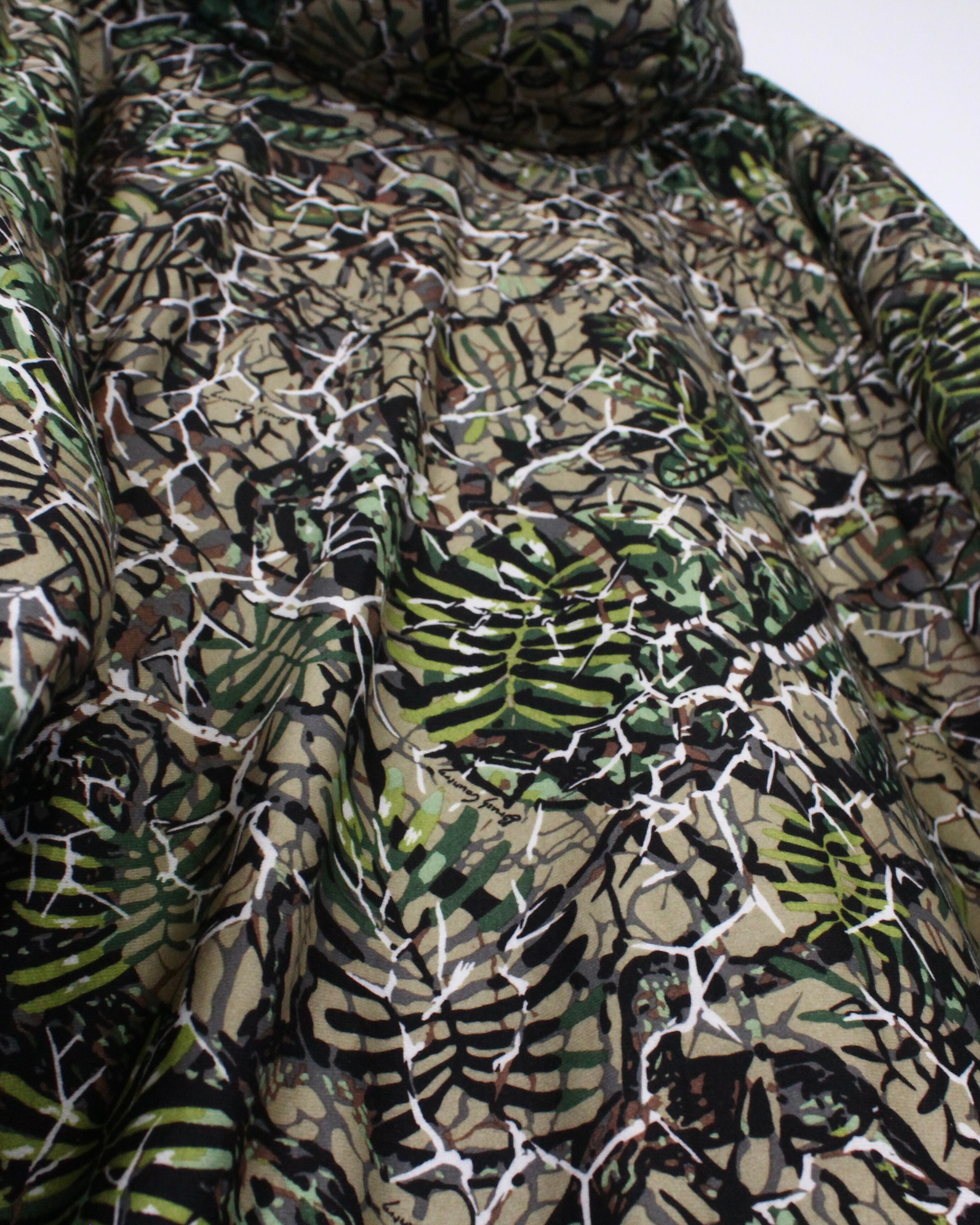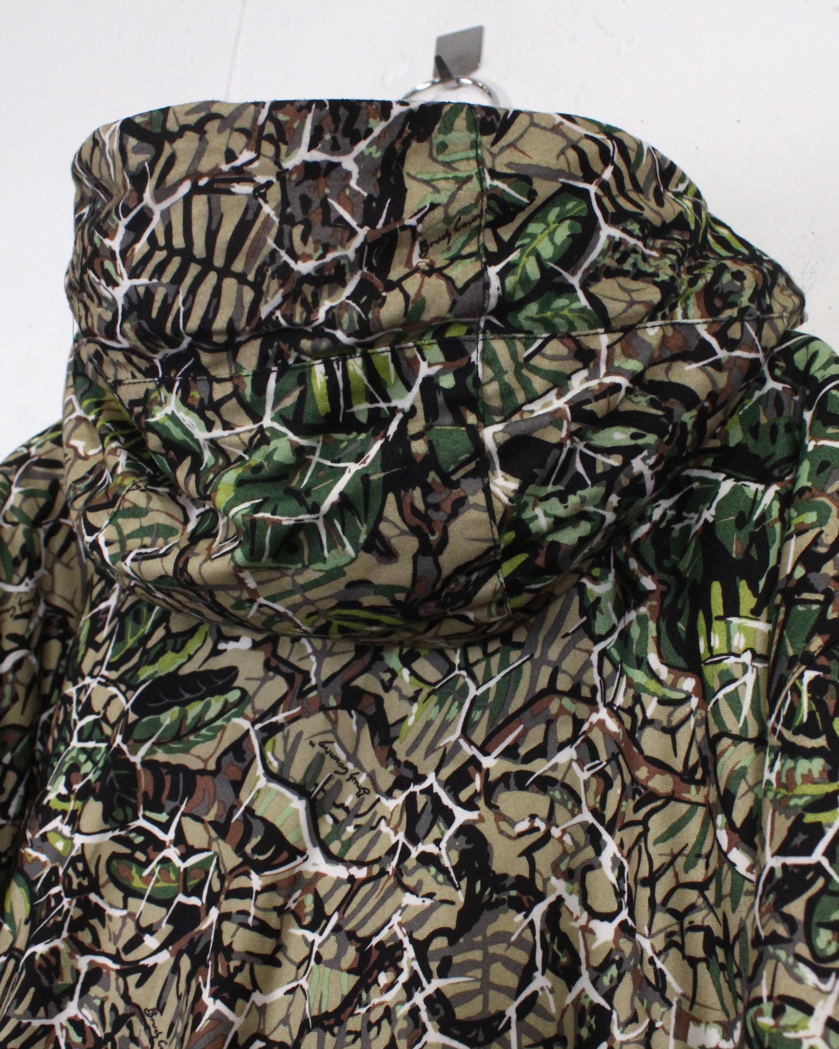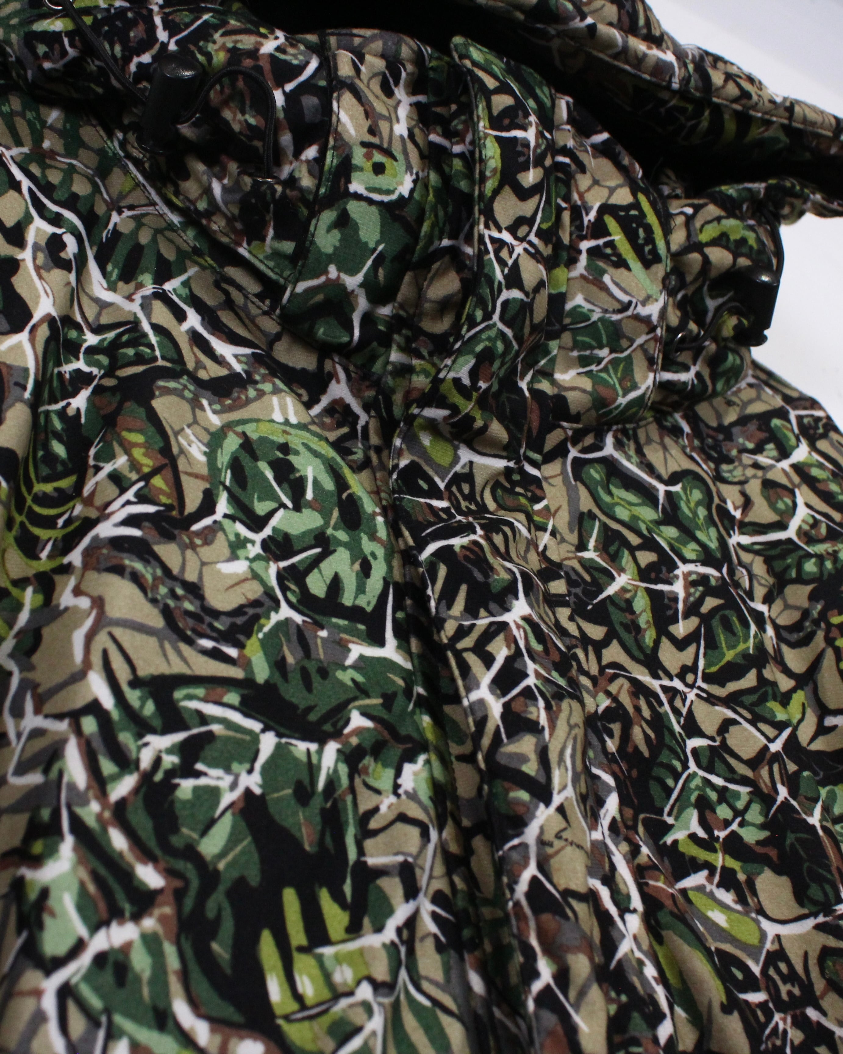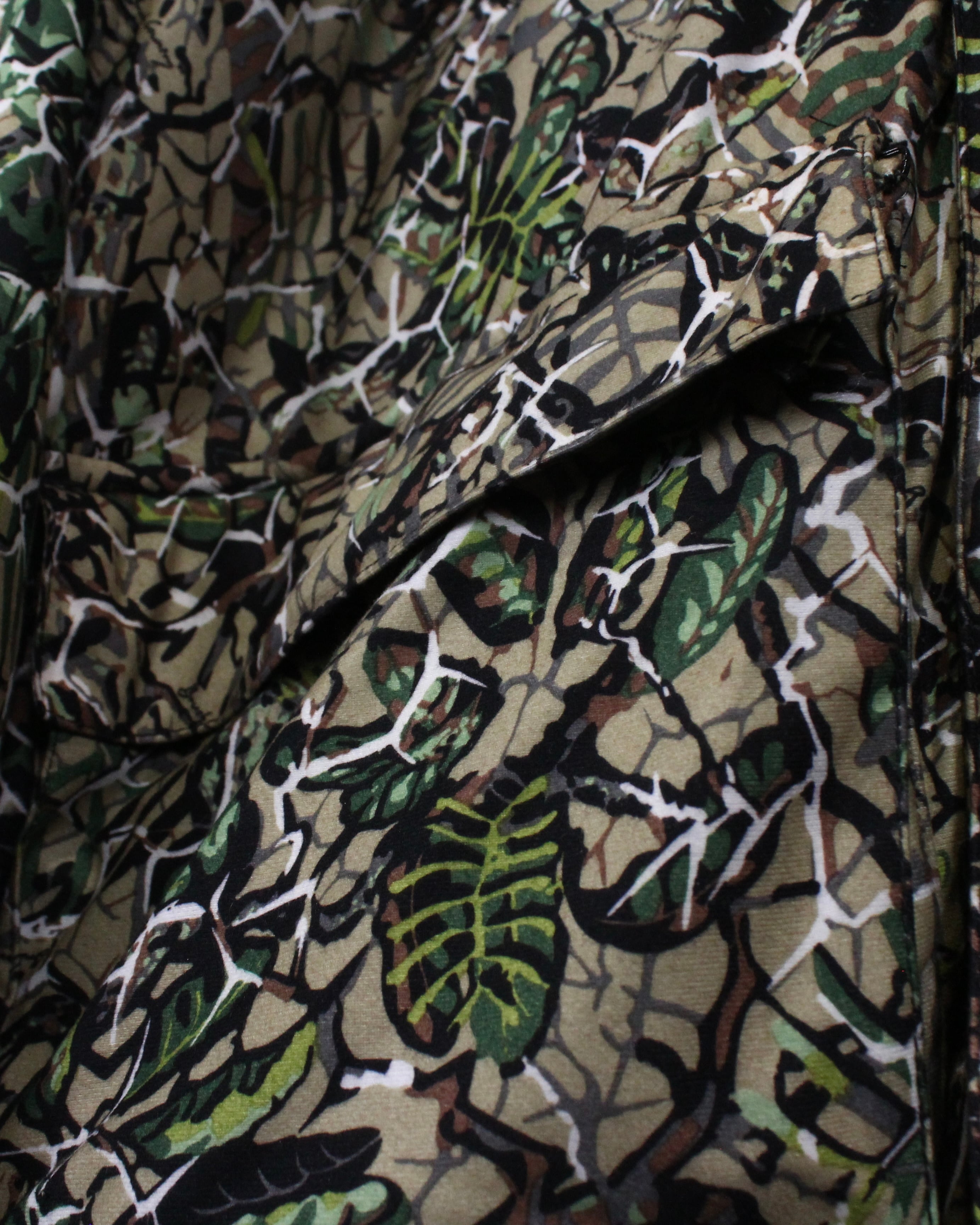 一見ハードな印象ながら、複雑に重なり合うリーフモチーフとカモフラージュパターンによって、奥行きのある表情に仕上げられた1着。アウトドア由来の柄使いでありながら、ファッションとして成立するバランス感が非常に魅力的です。