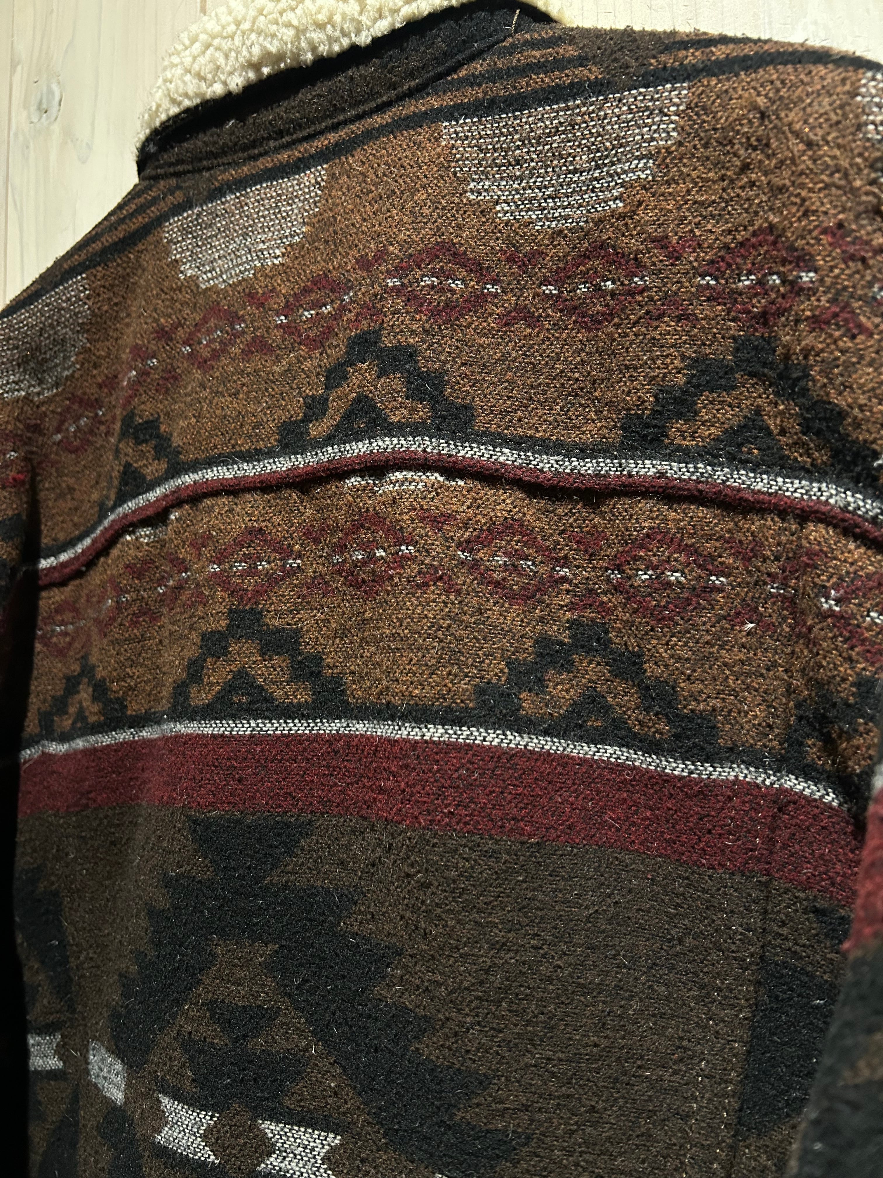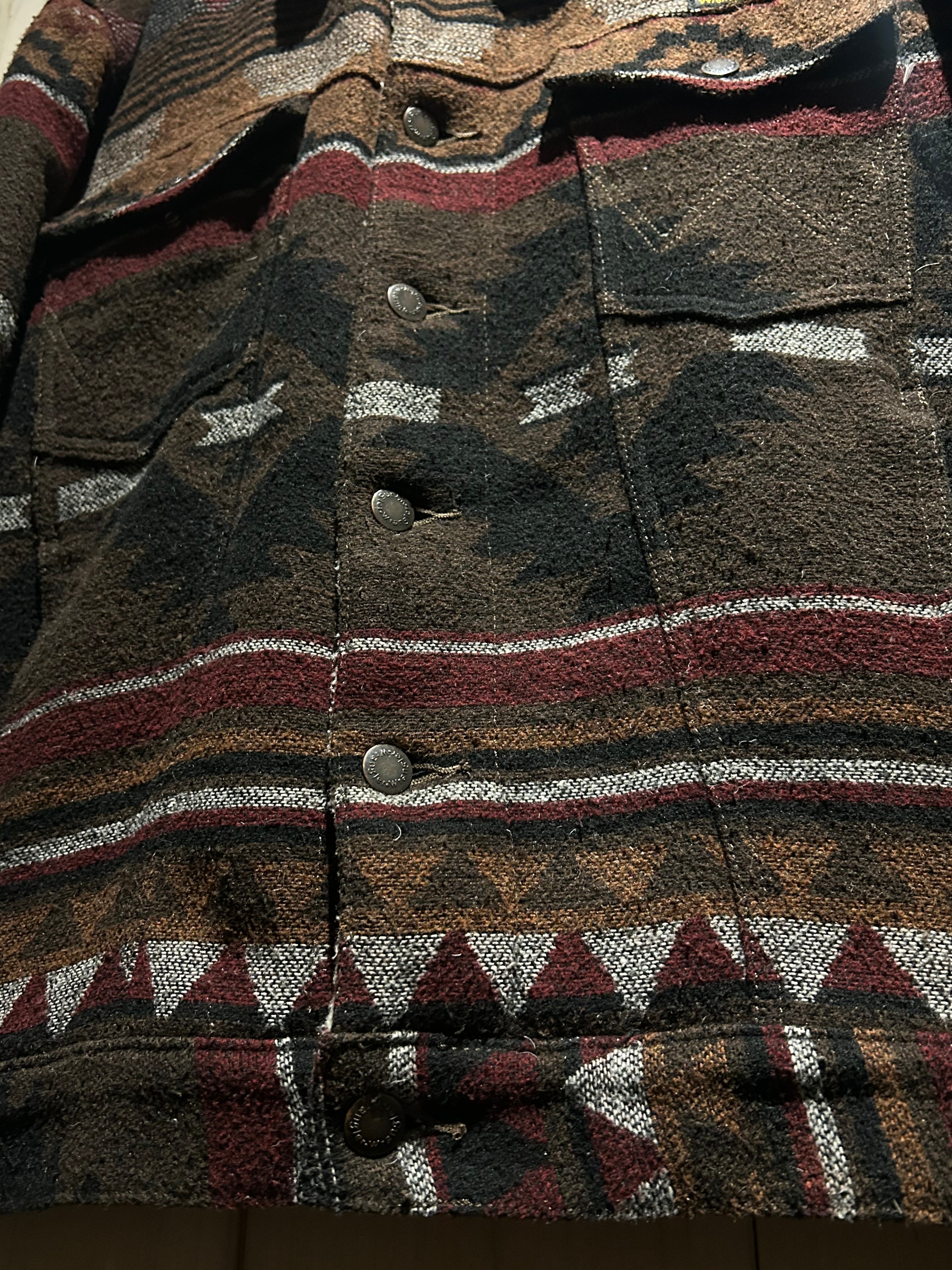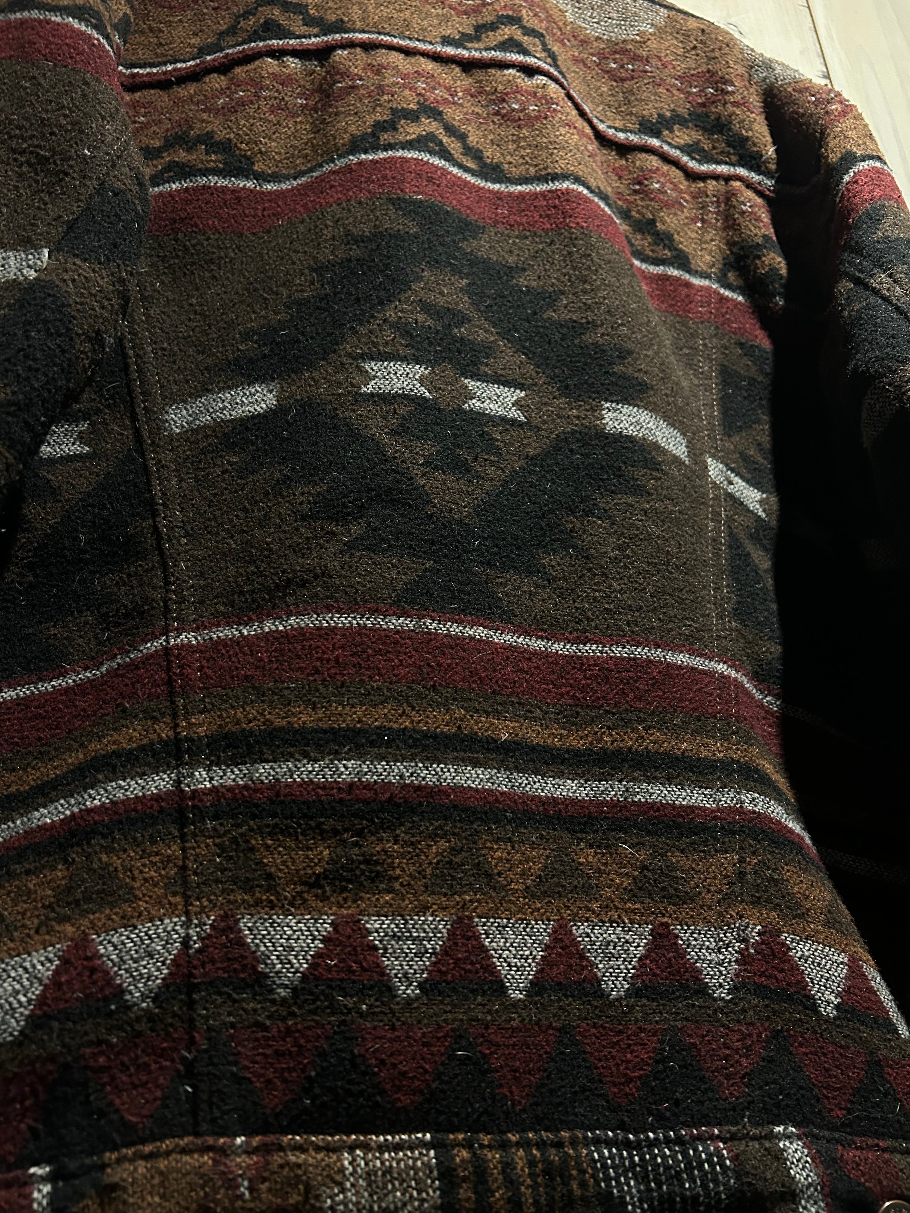 ボディには、ブラウンやボルドー、ブラックを軸にしたネイティブ調の織り柄を採用。プリントではなく織りで表現されたパターンのため奥行きがあり、近くで見た時の表情の豊かさが魅力です。