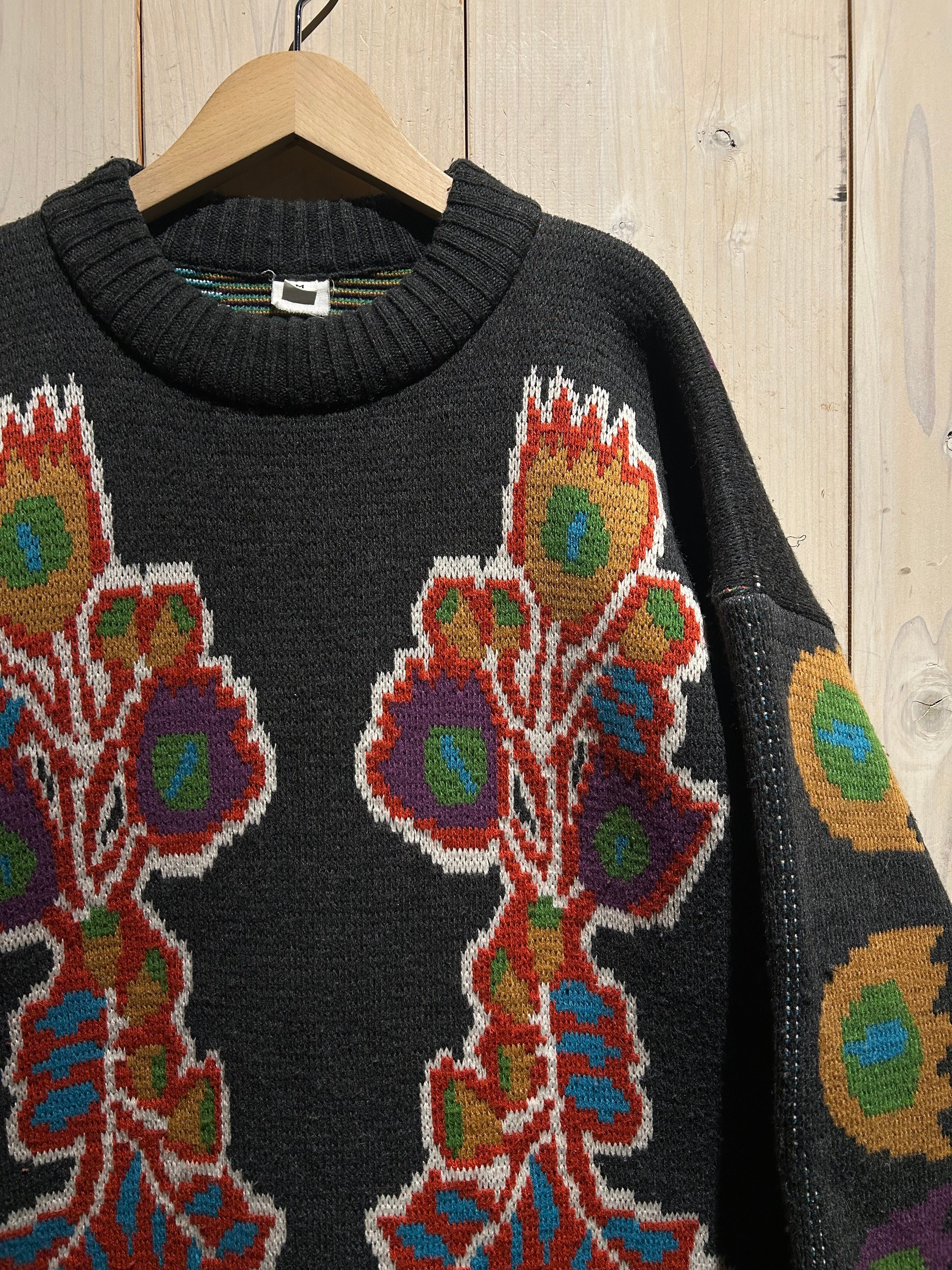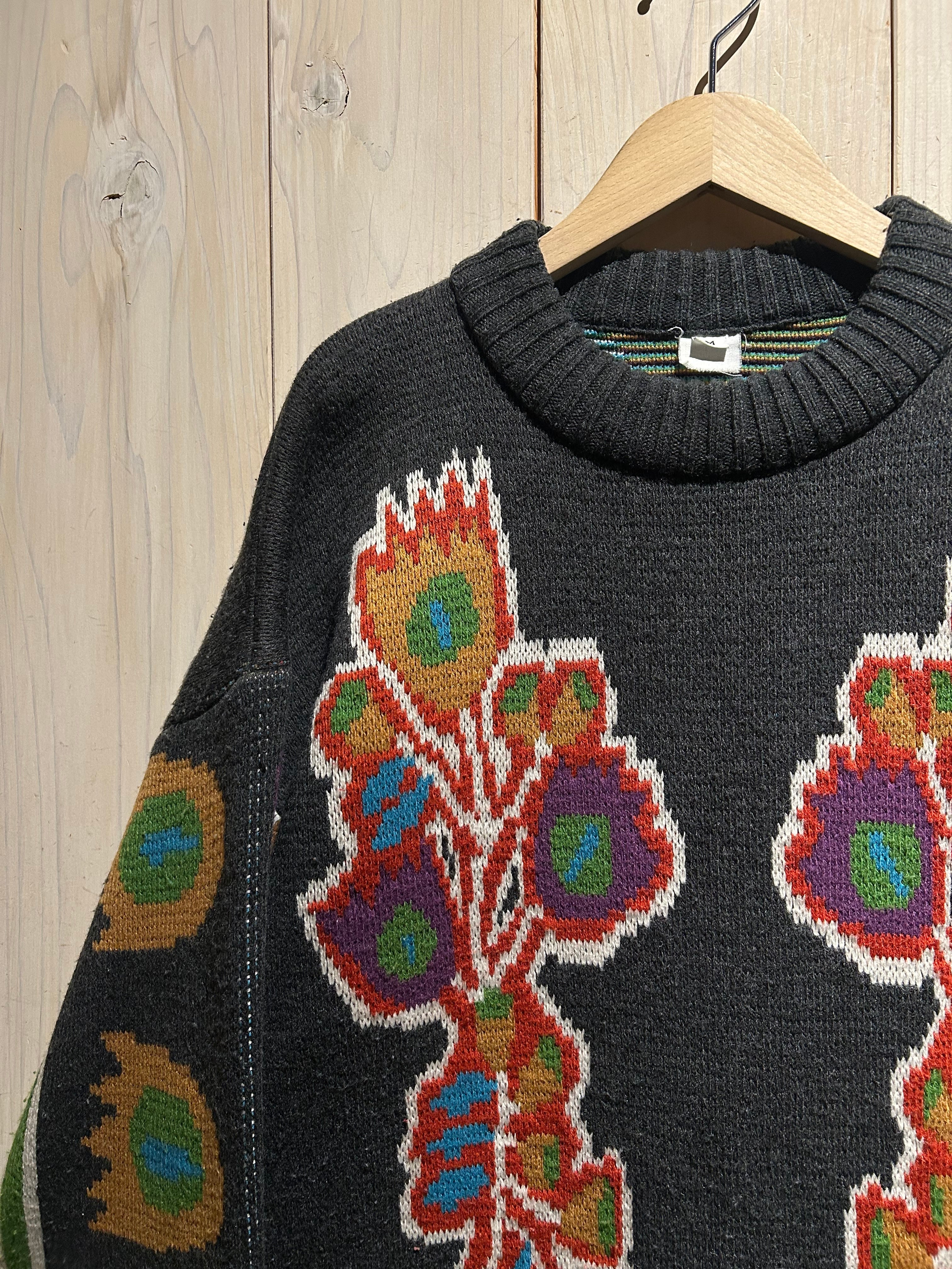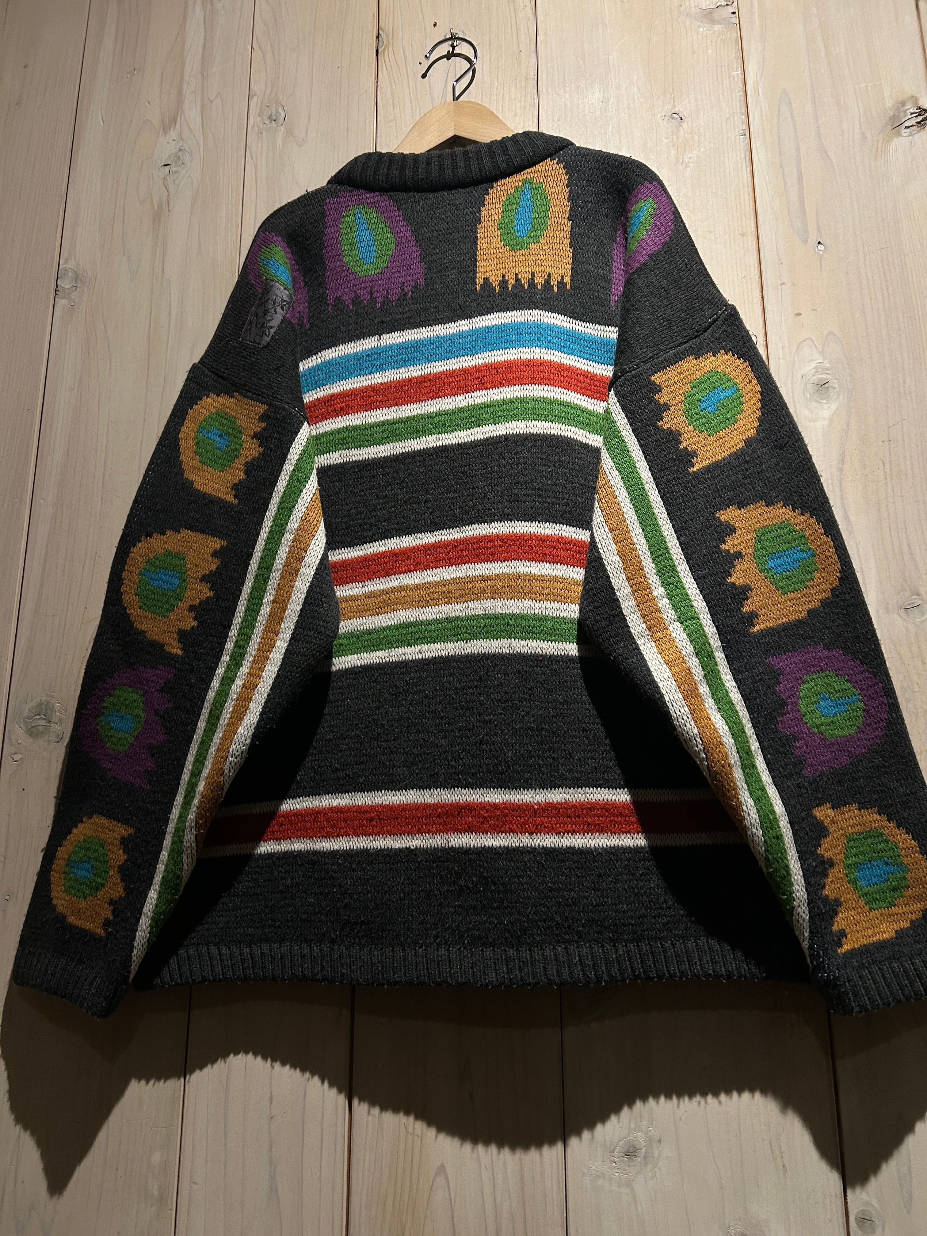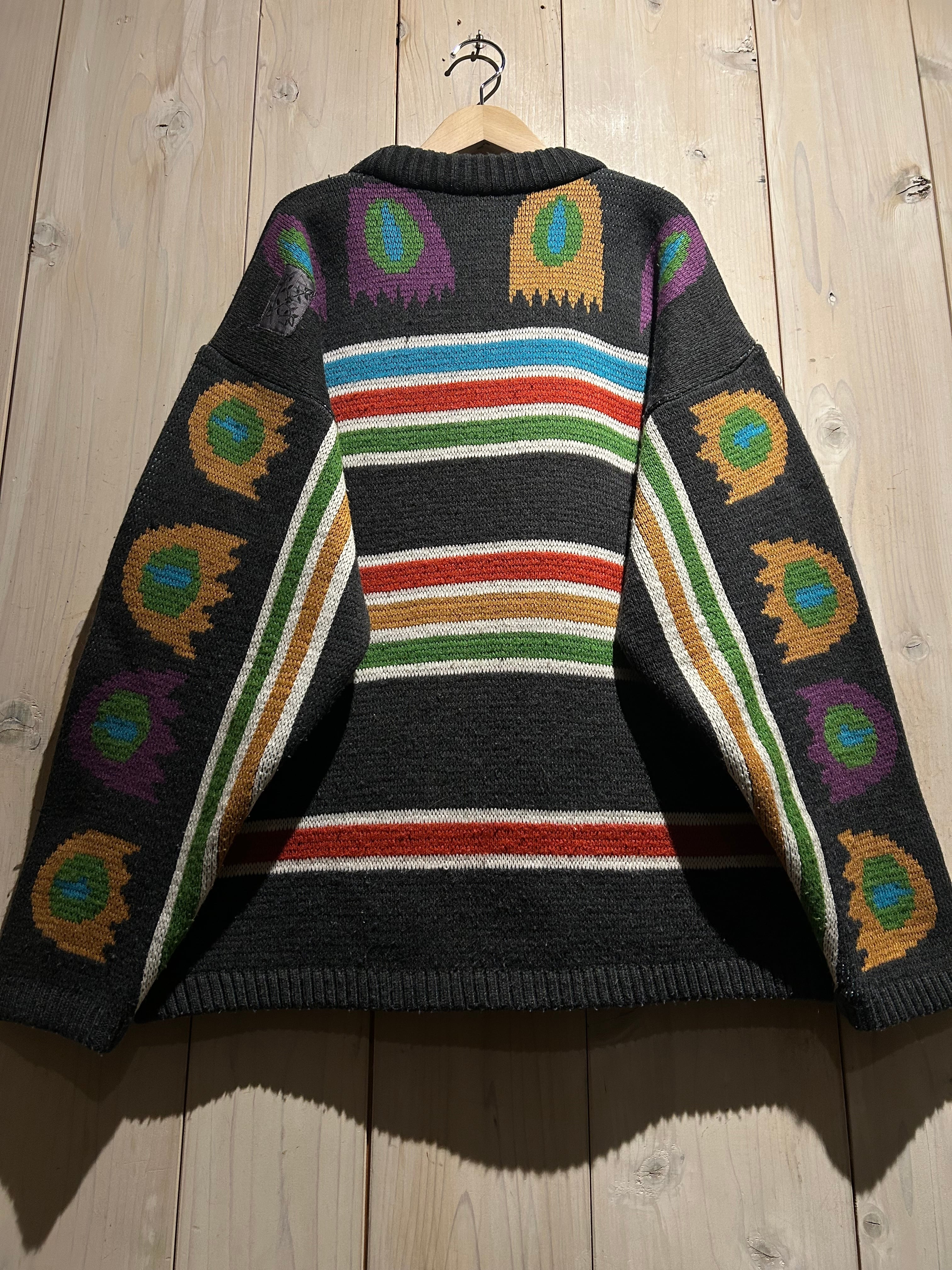 太番手の毛糸を用いた手編みならではの凹凸ある編み地が特徴的で、機械編みにはないラフさと温もりが感じられる仕上がり。スキーニットらしいクラフト感と実用性を併せ持った、存在感のある表情が魅力です。