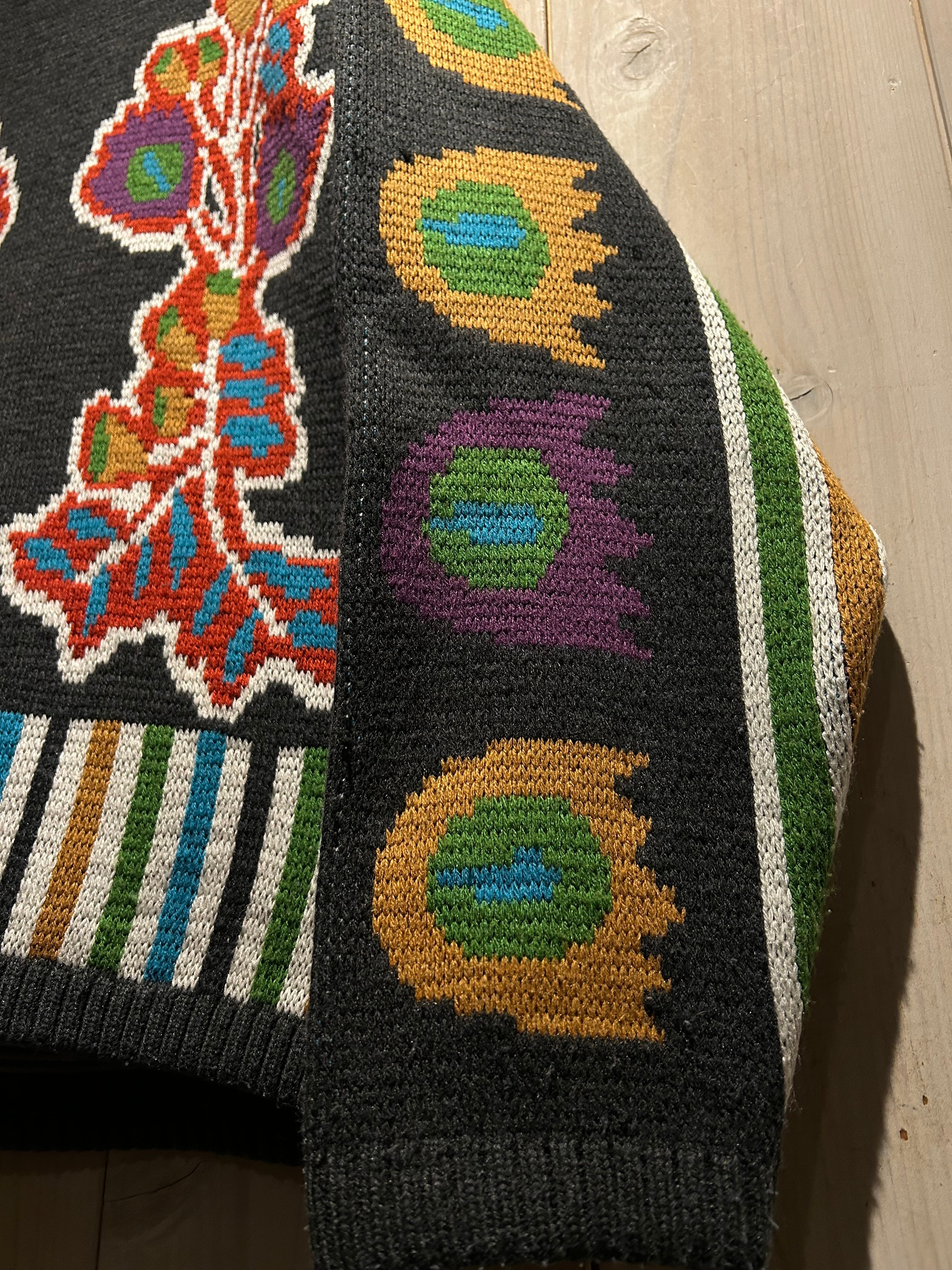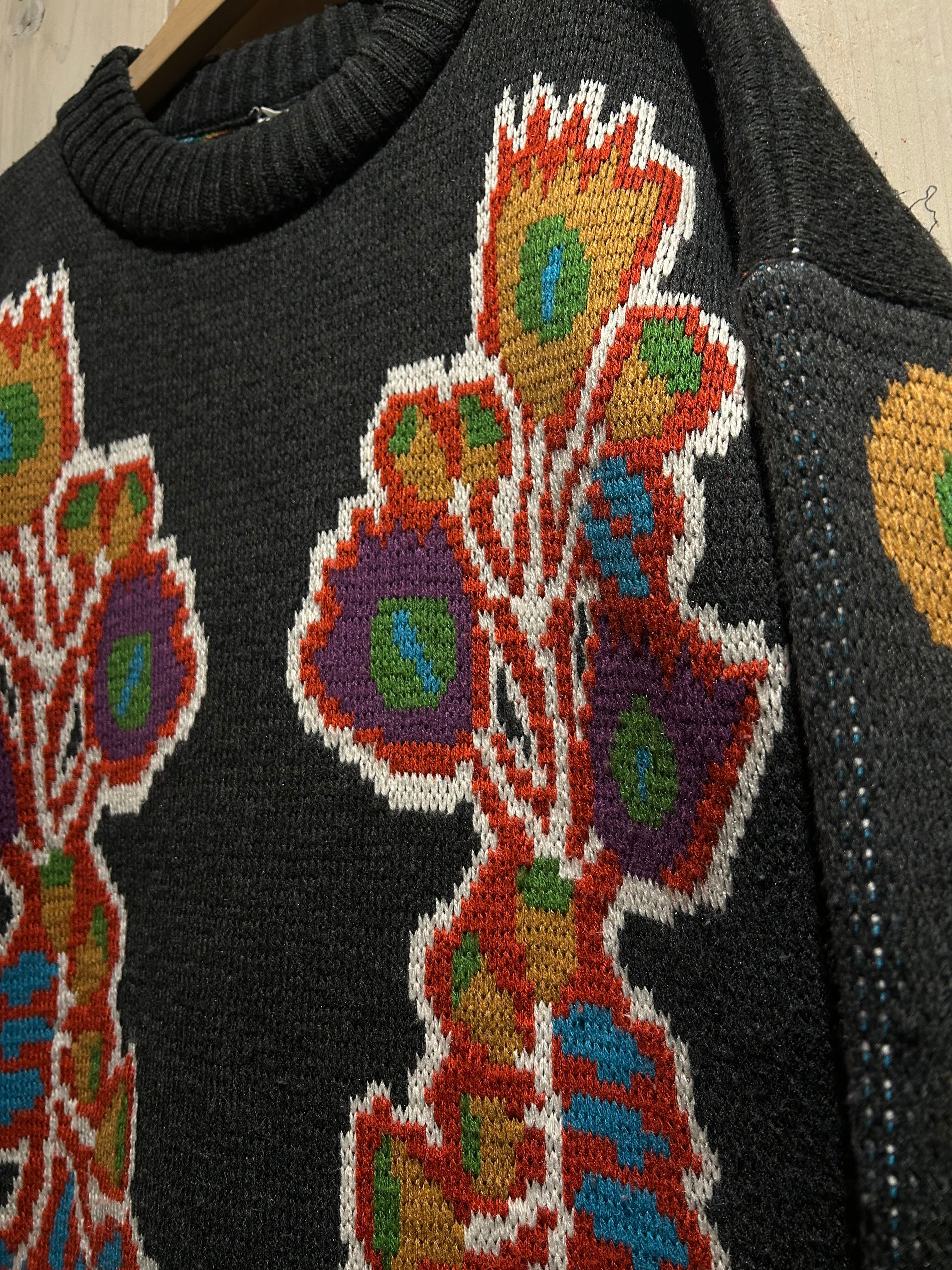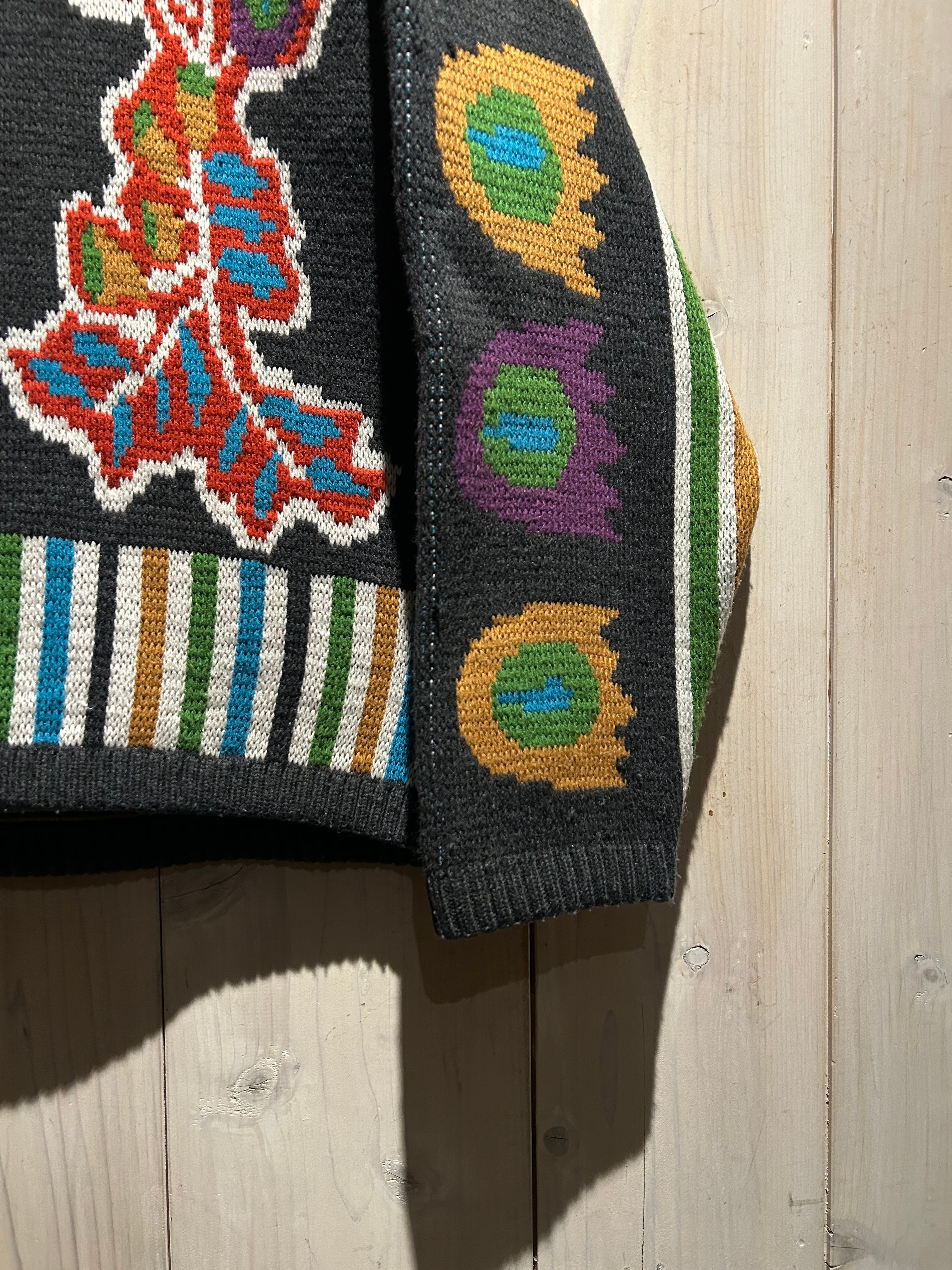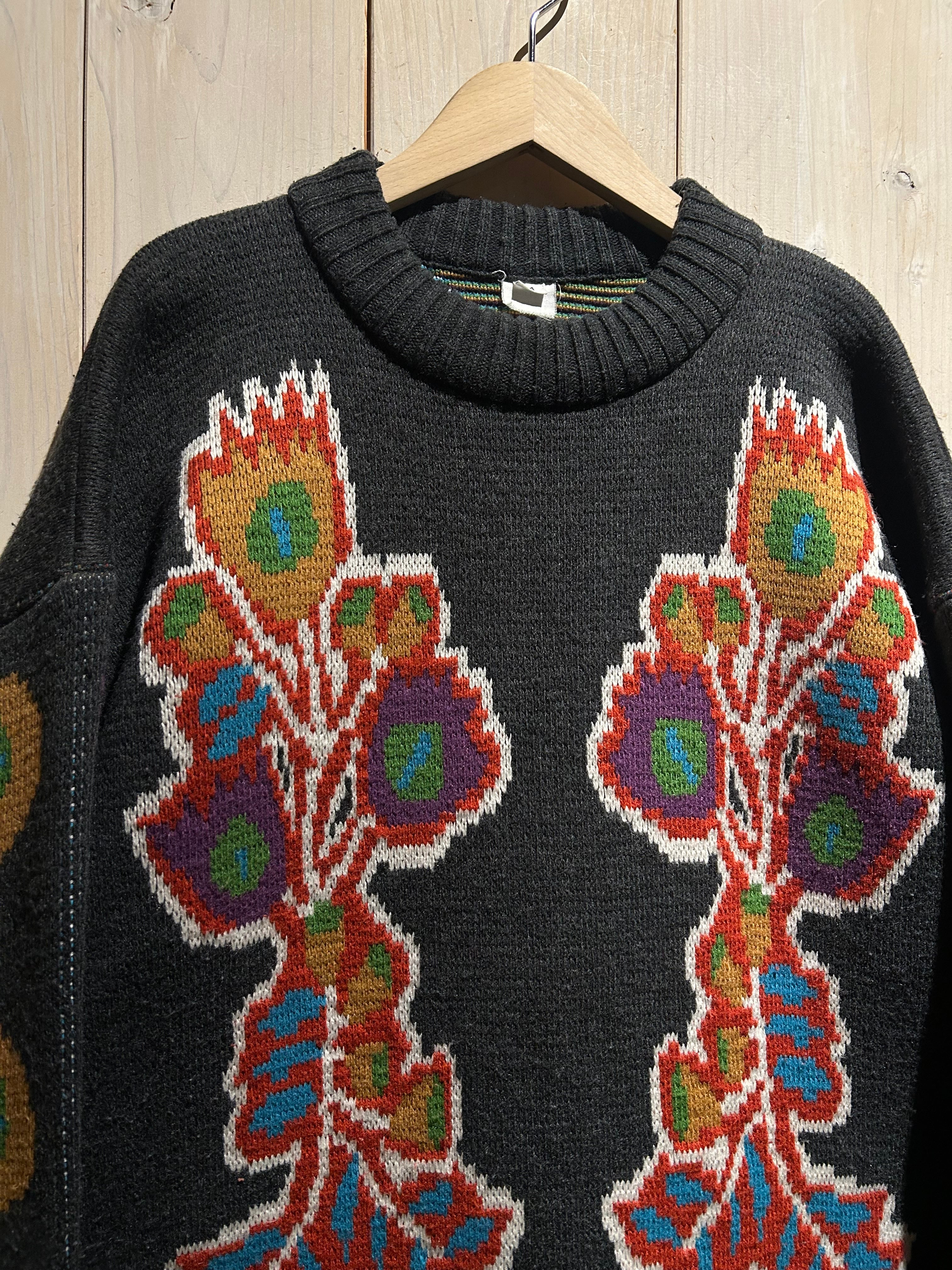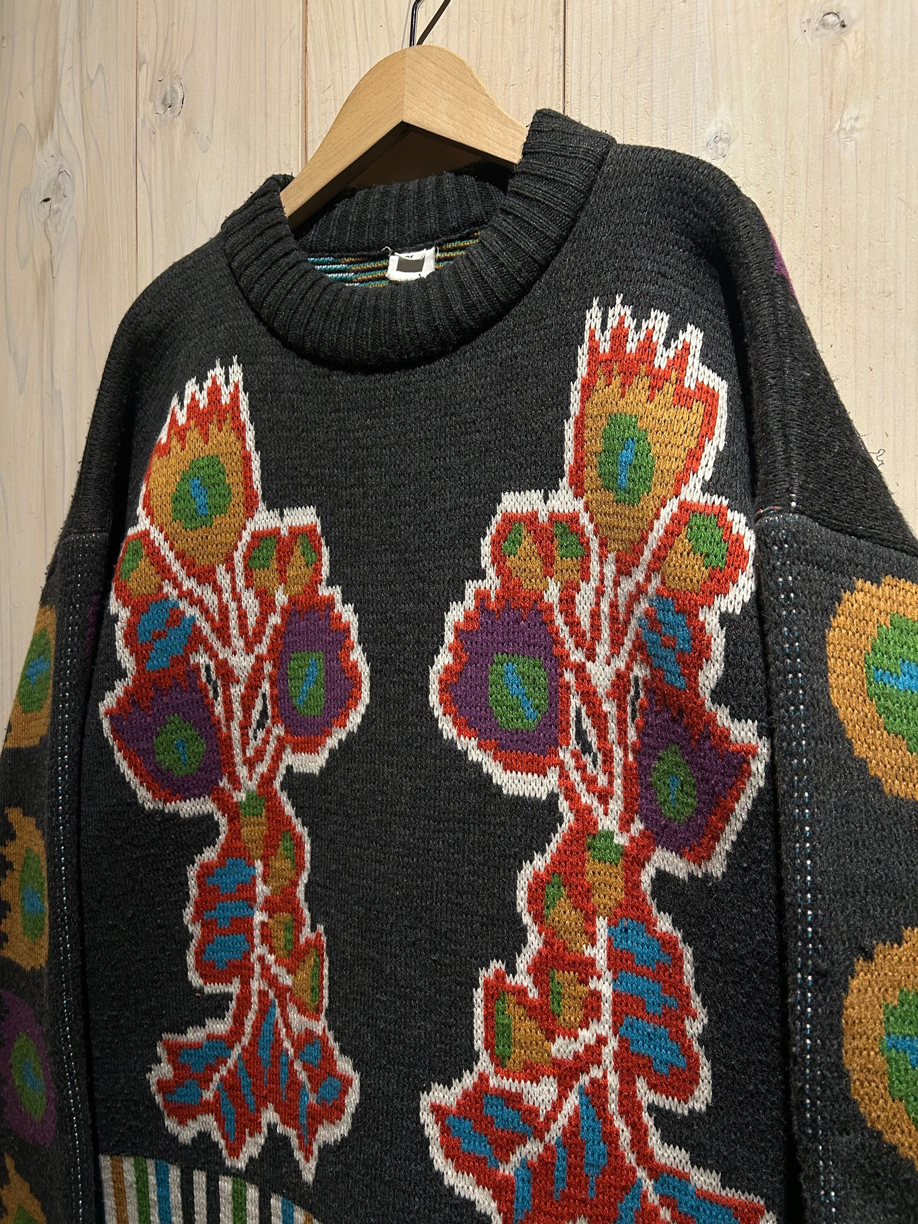 太番手の毛糸を用いた手編みならではの凹凸ある編み地が特徴的で、機械編みにはないラフさと温もりが感じられる仕上がり。スキーニットらしいクラフト感と実用性を併せ持った、存在感のある表情が魅力です。