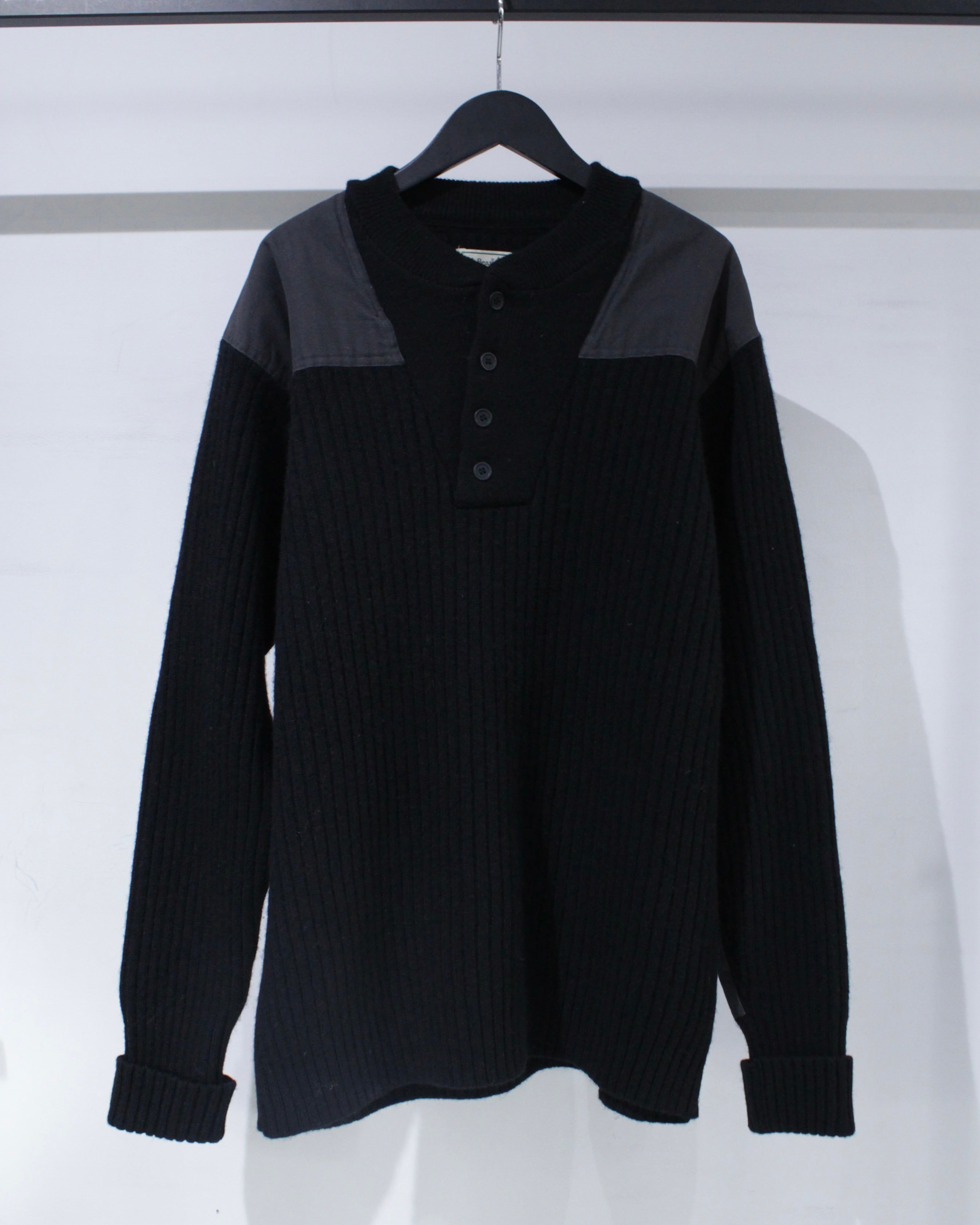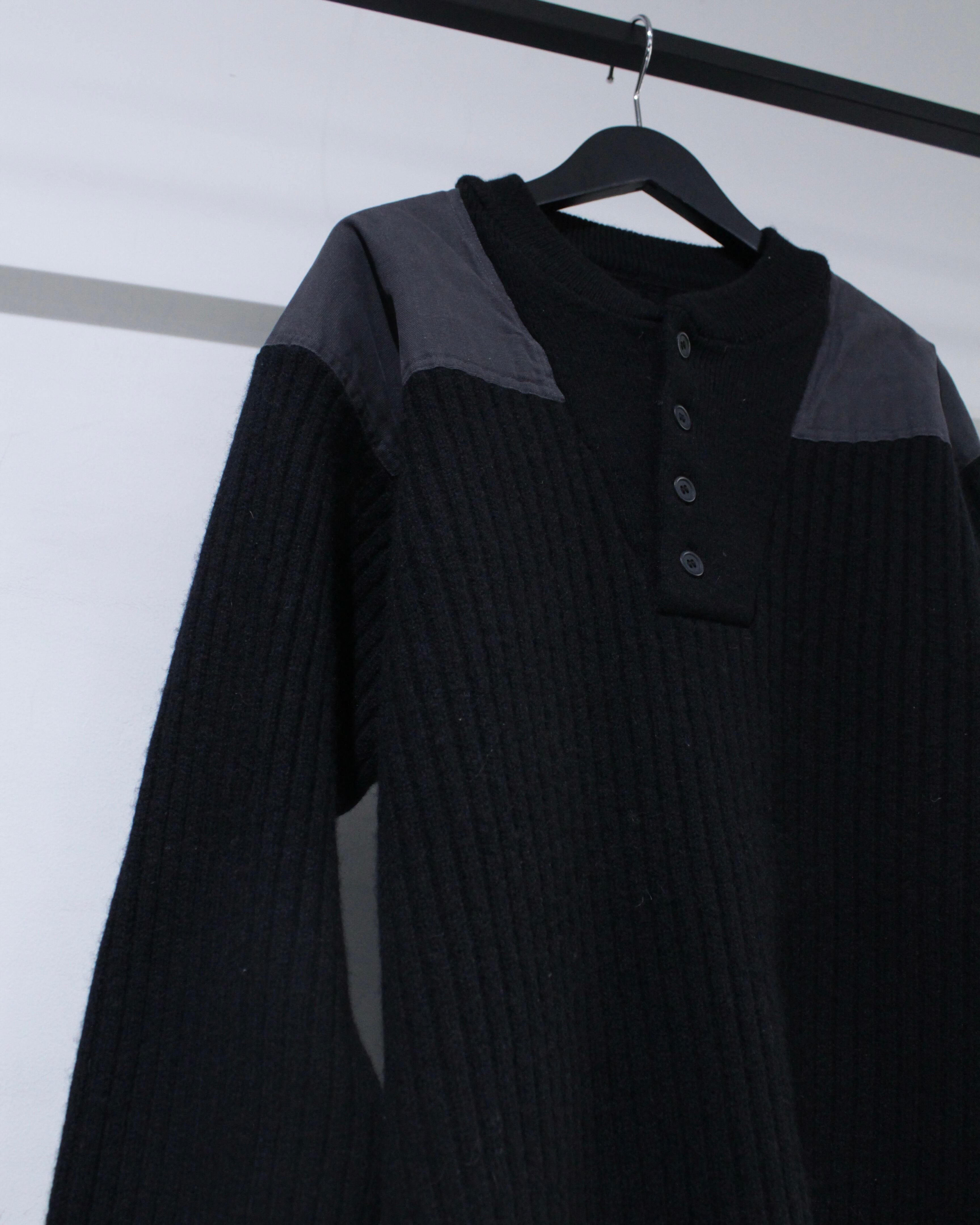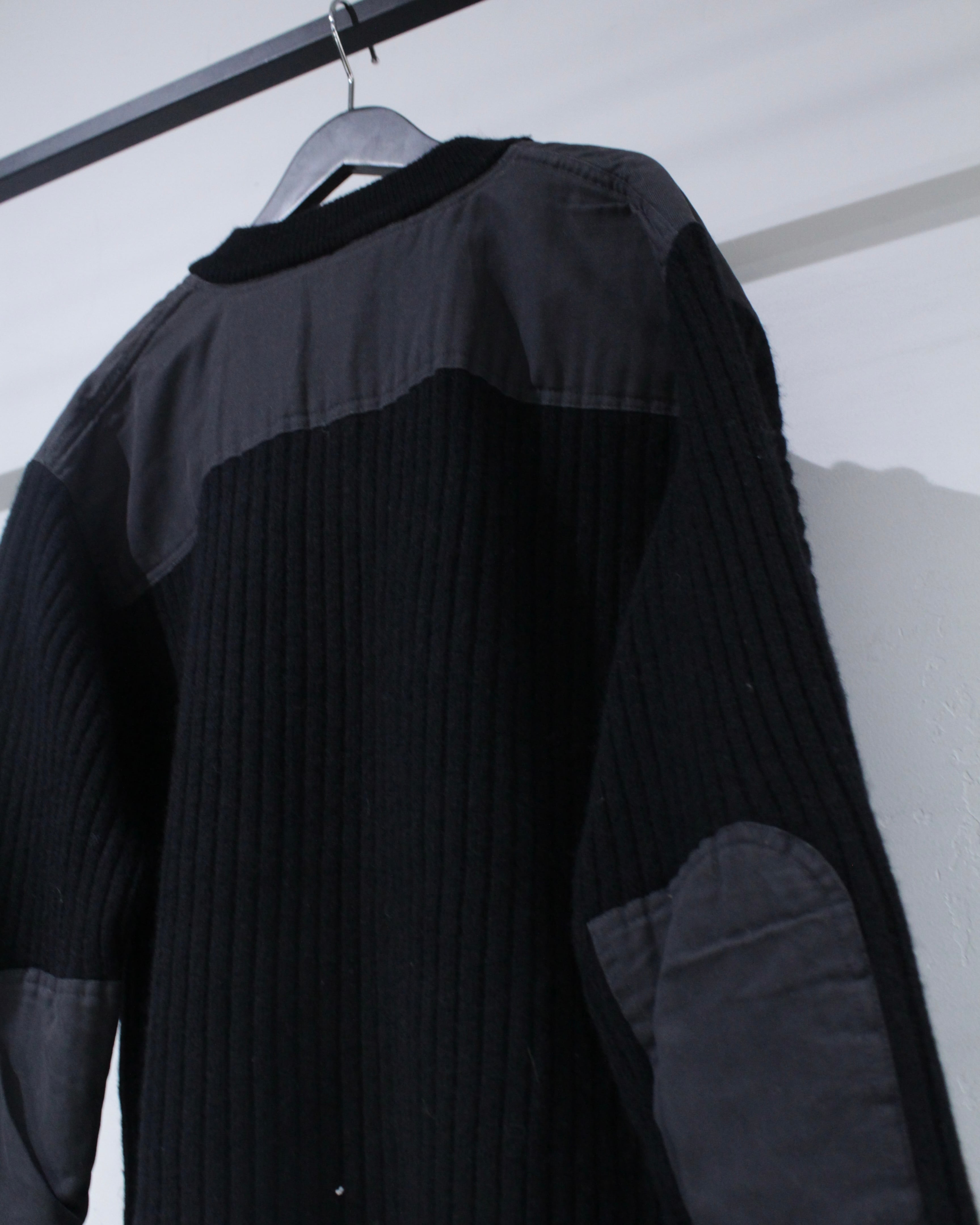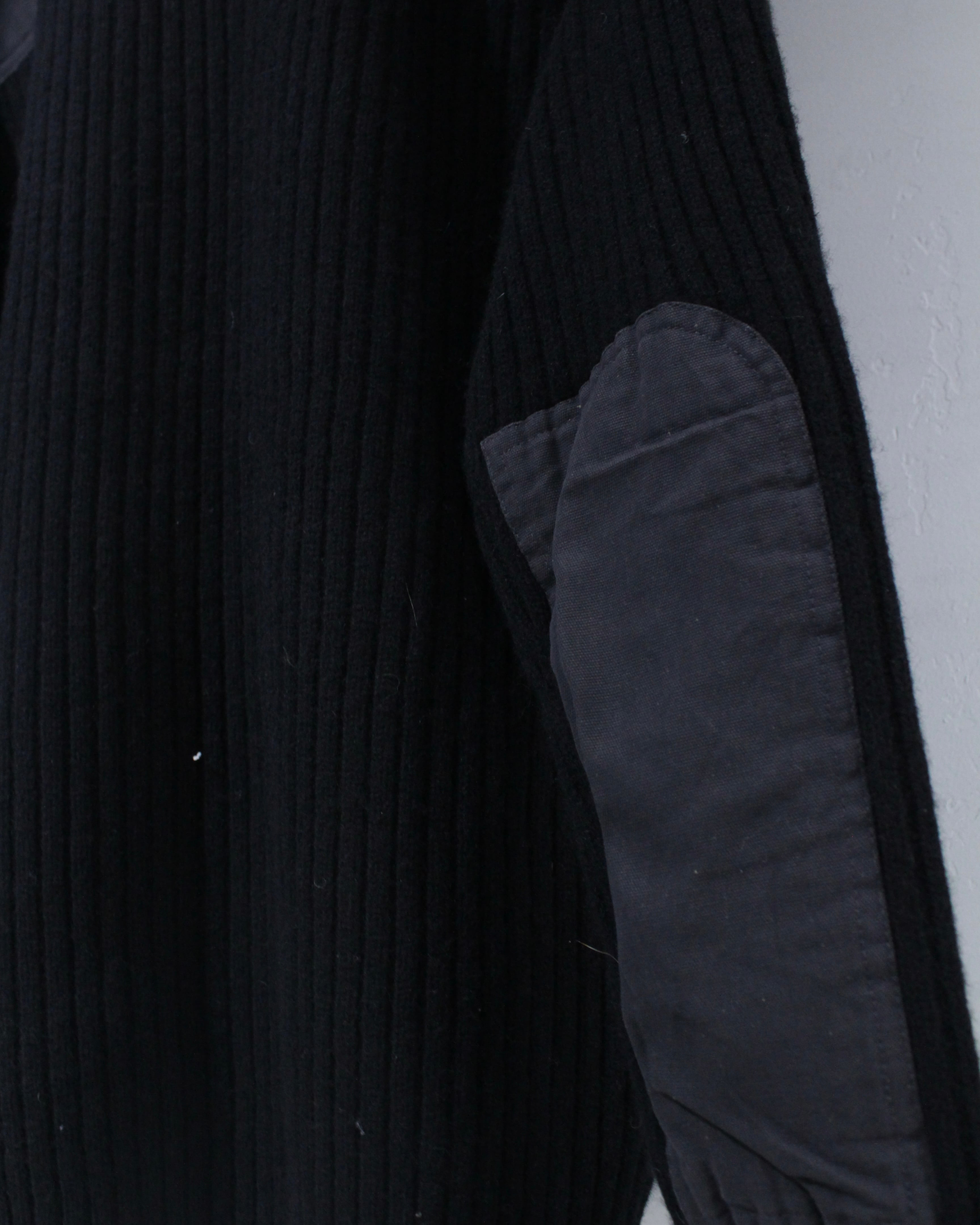 縦畝の立ったリブ編みボディに、肩と肘部分は異素材で切り替えられた、シンプルながらも表情のある1着に仕上げられています。