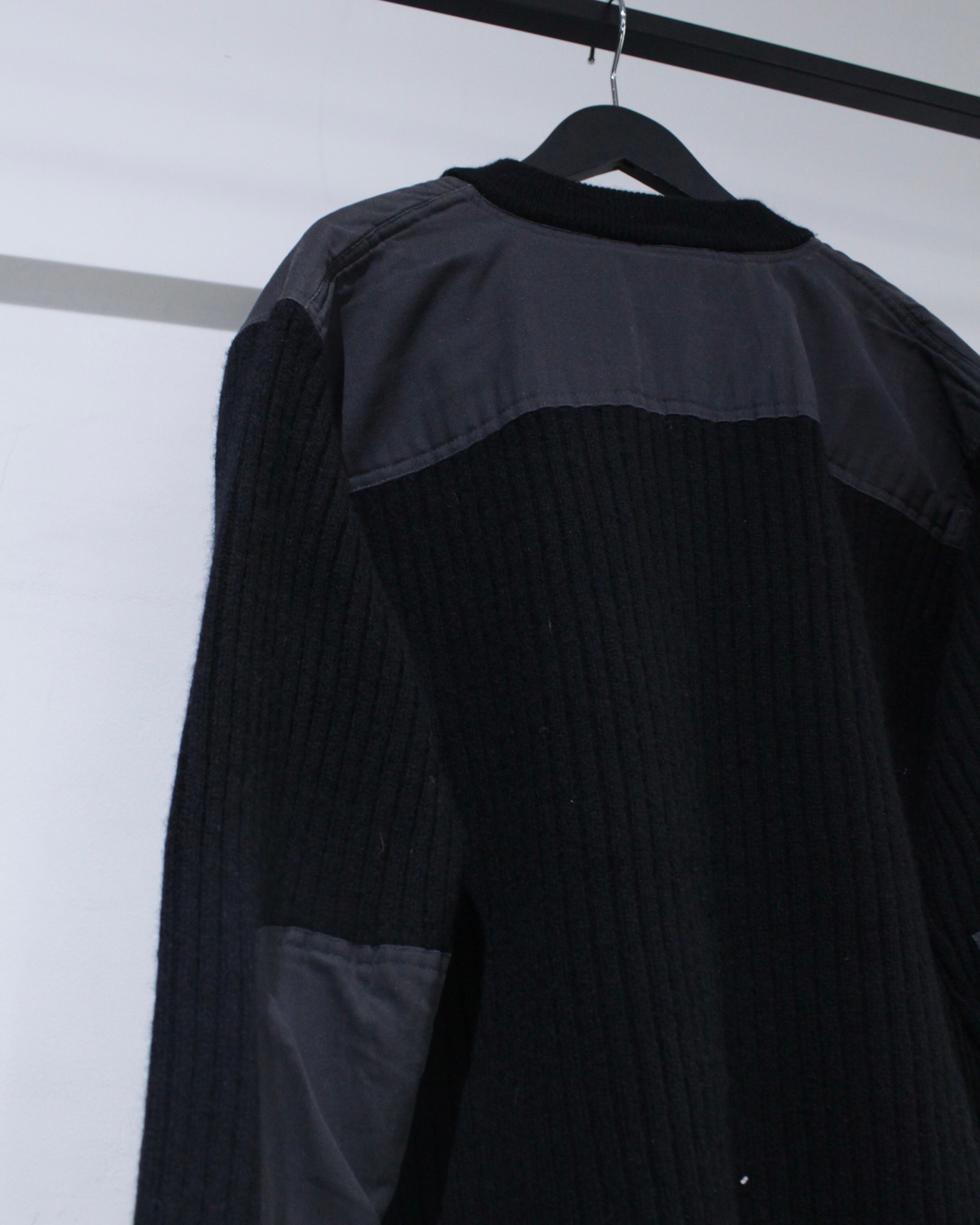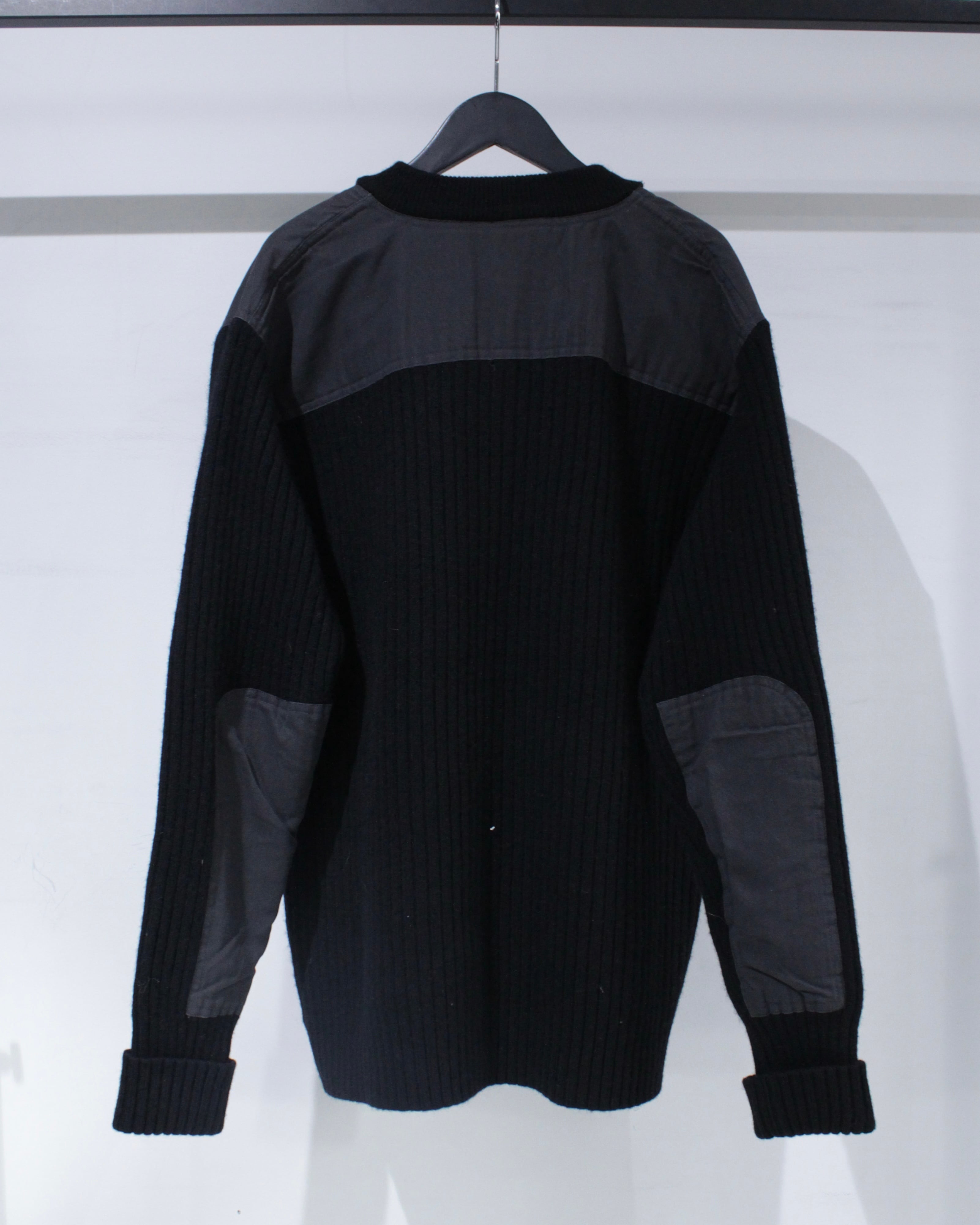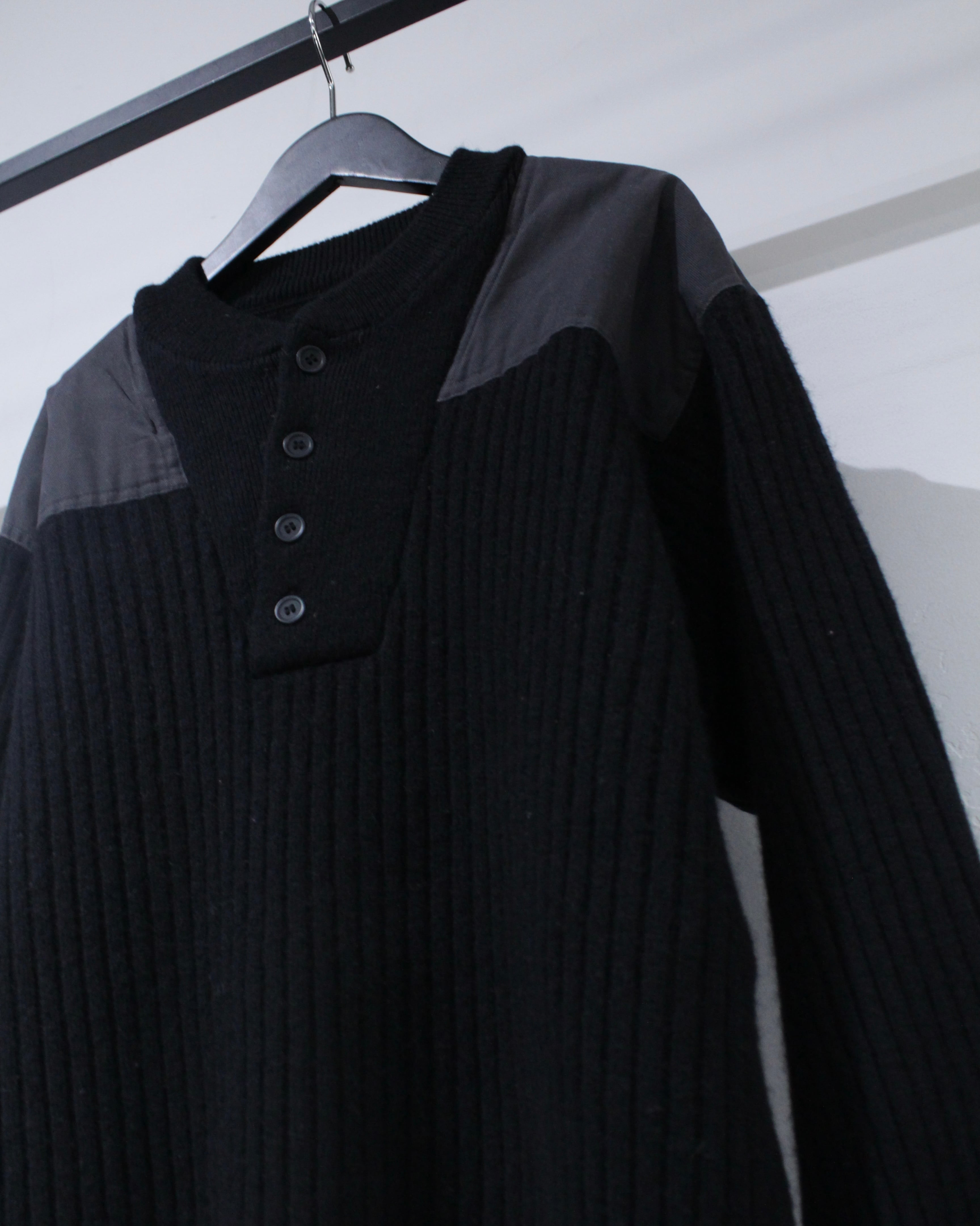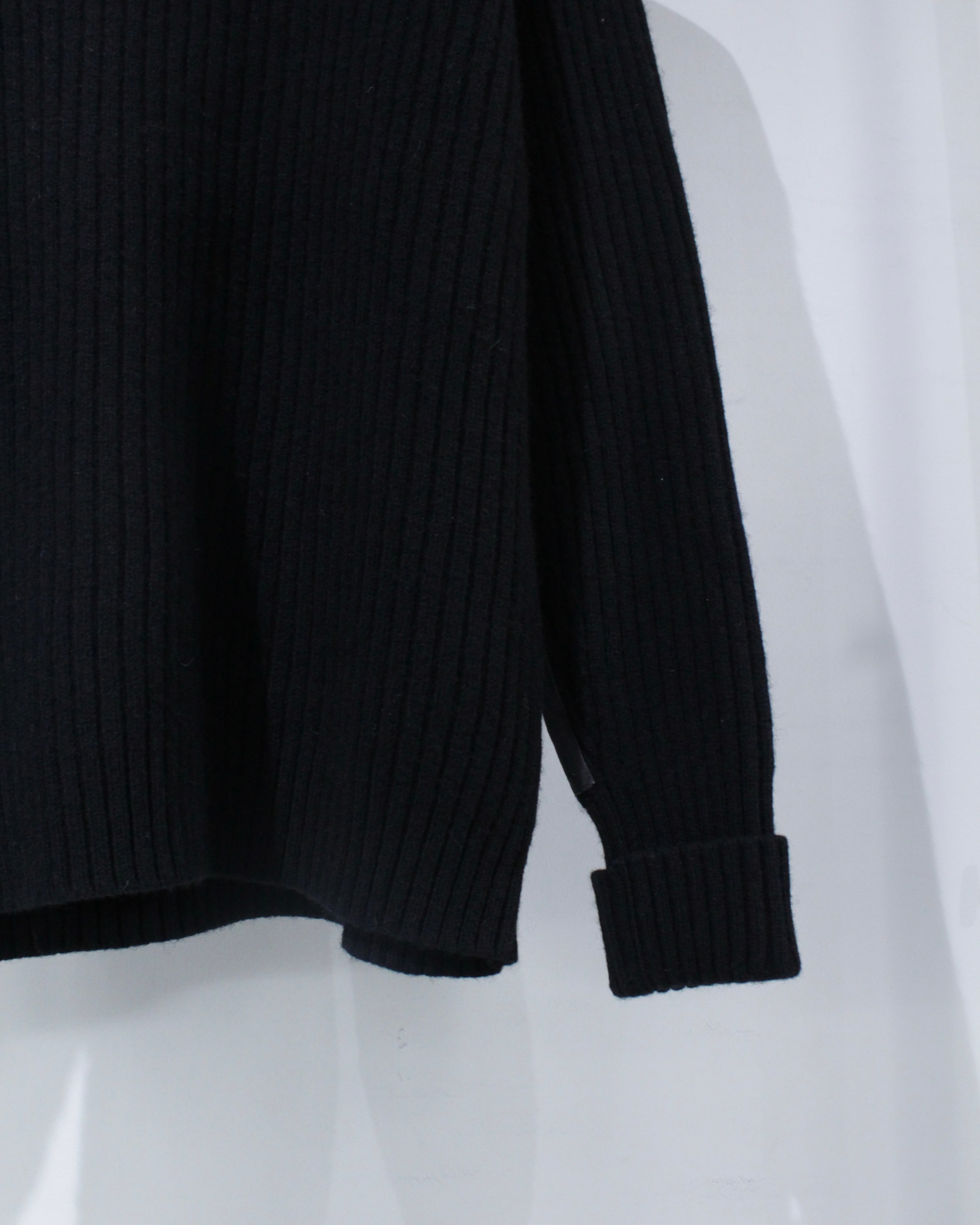 縦畝の立ったリブ編みボディに、肩と肘部分は異素材で切り替えられた、シンプルながらも表情のある1着に仕上げられています。