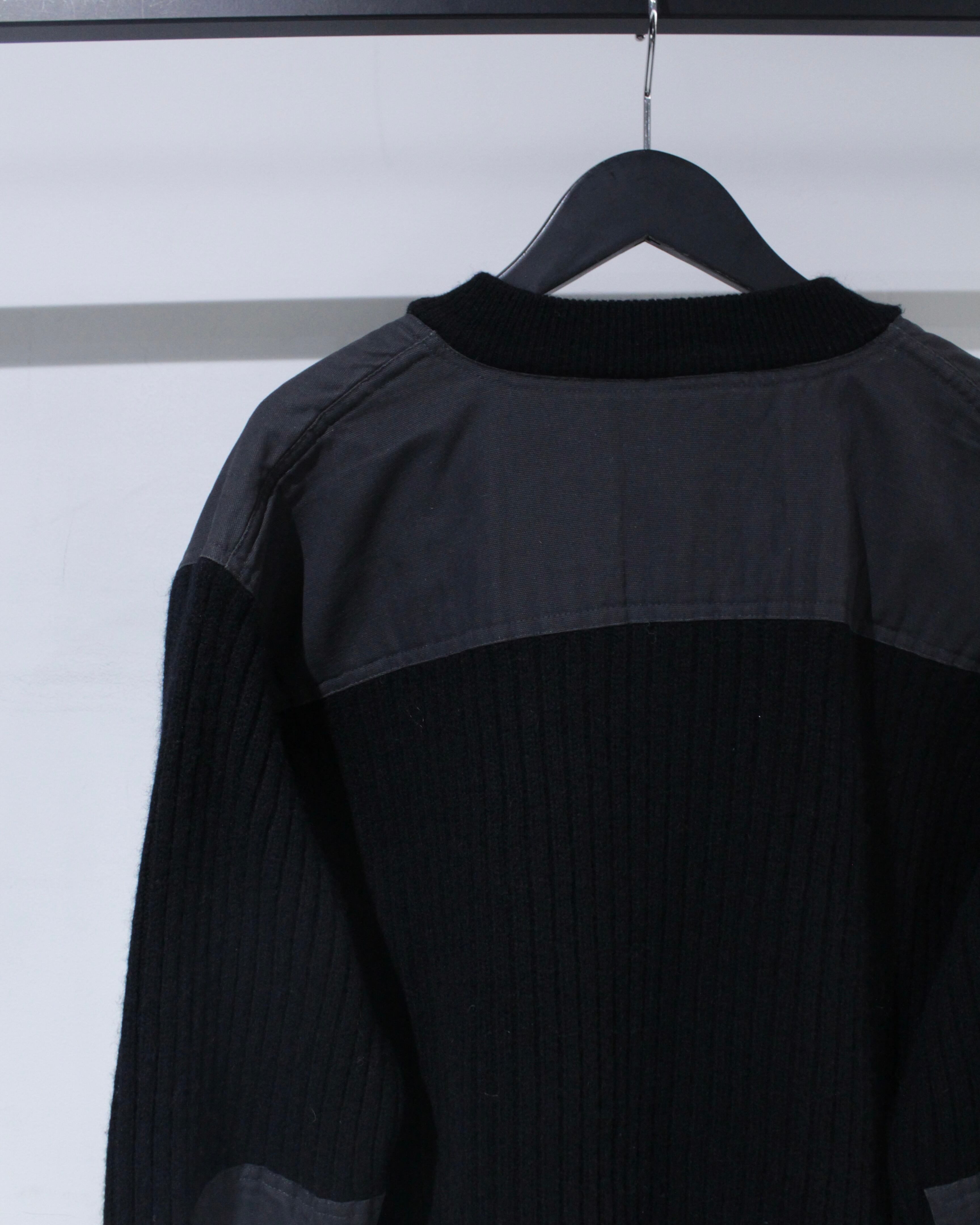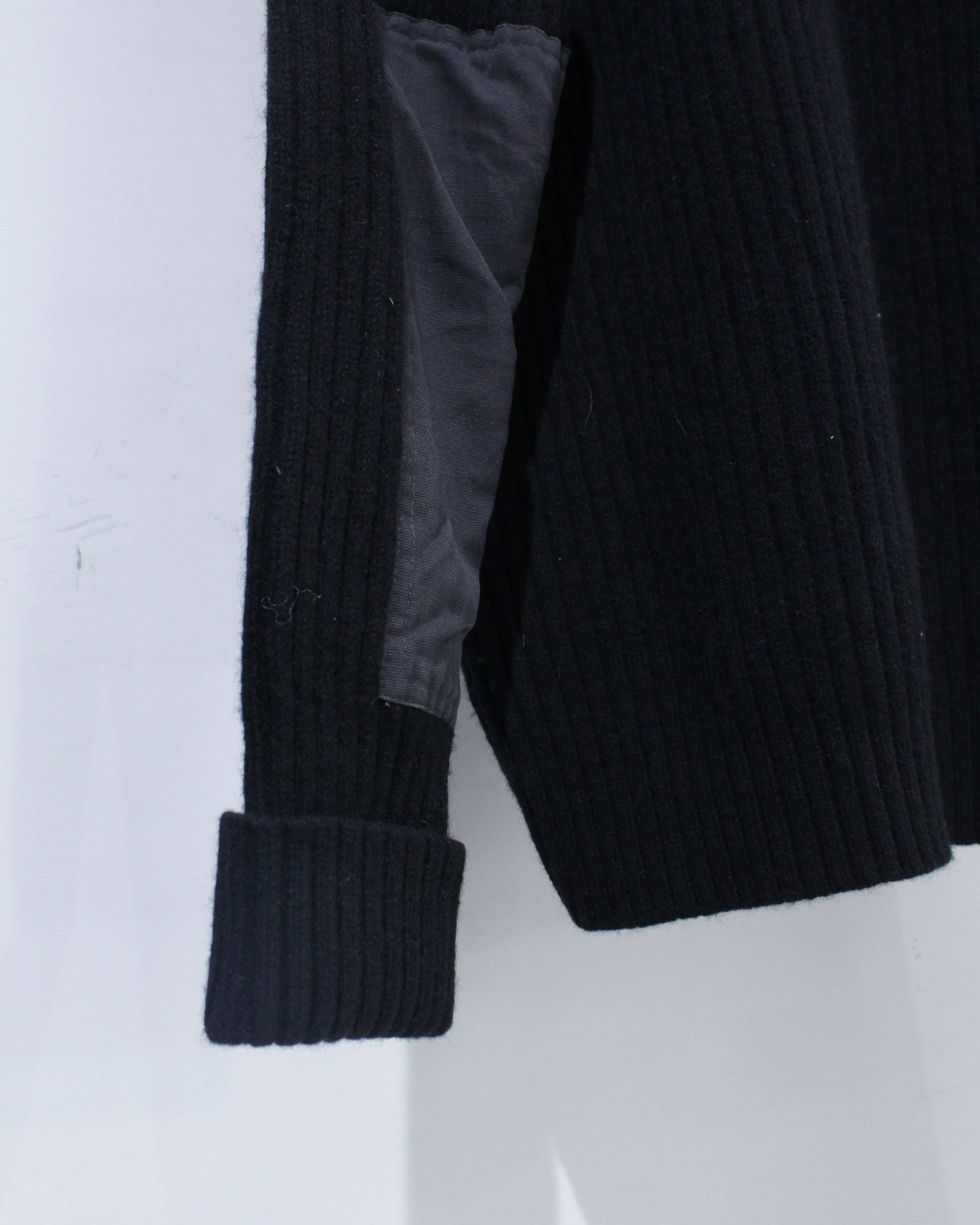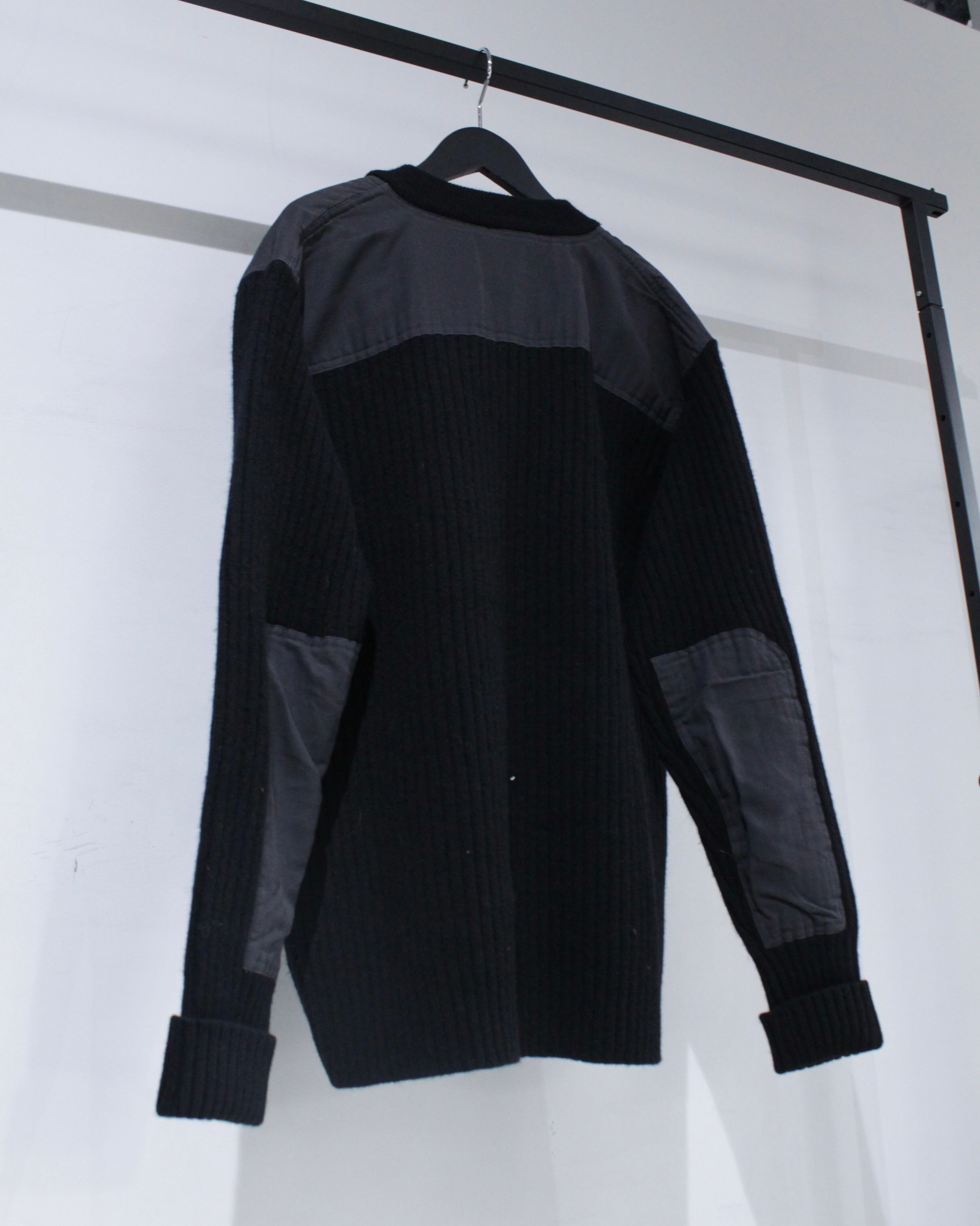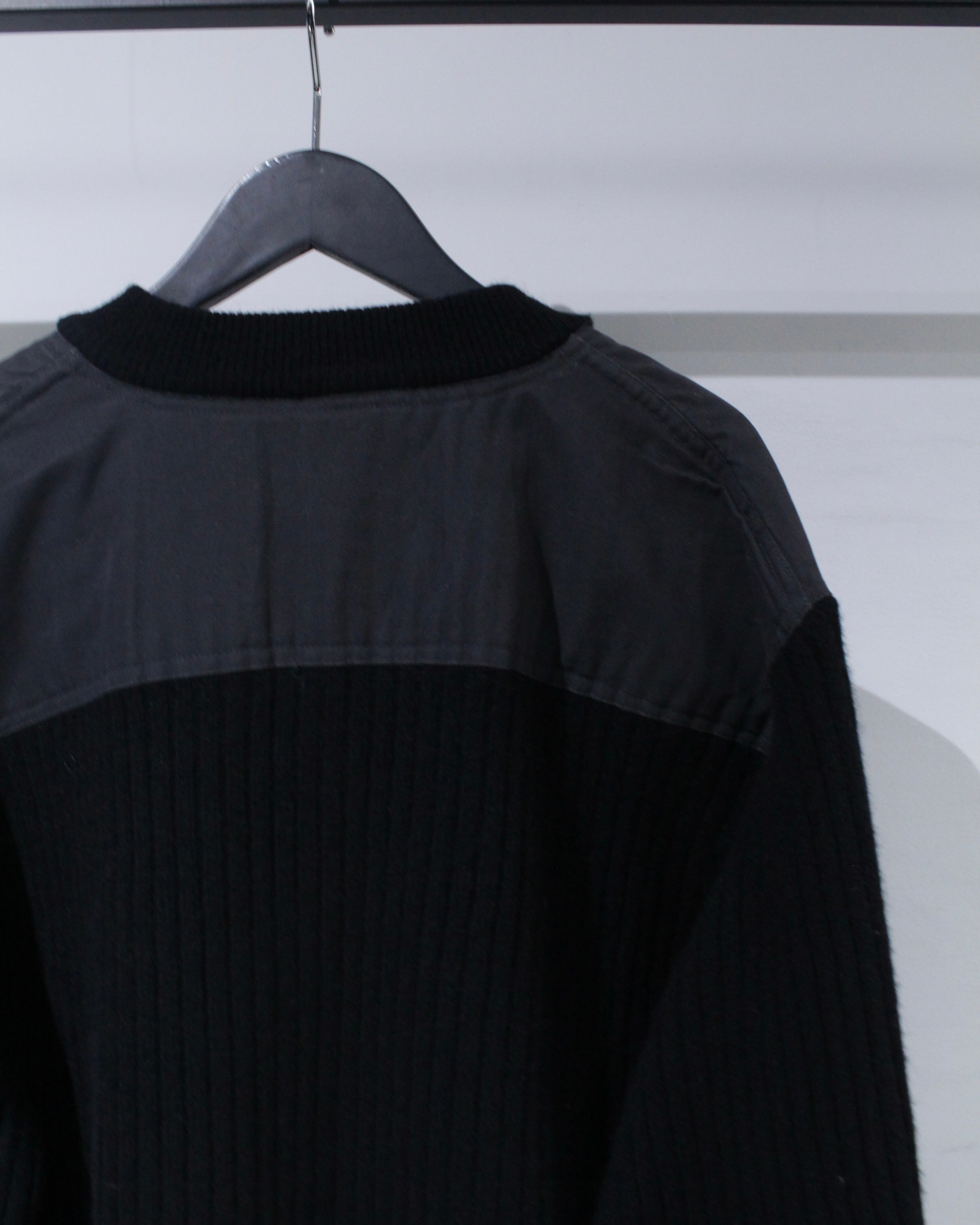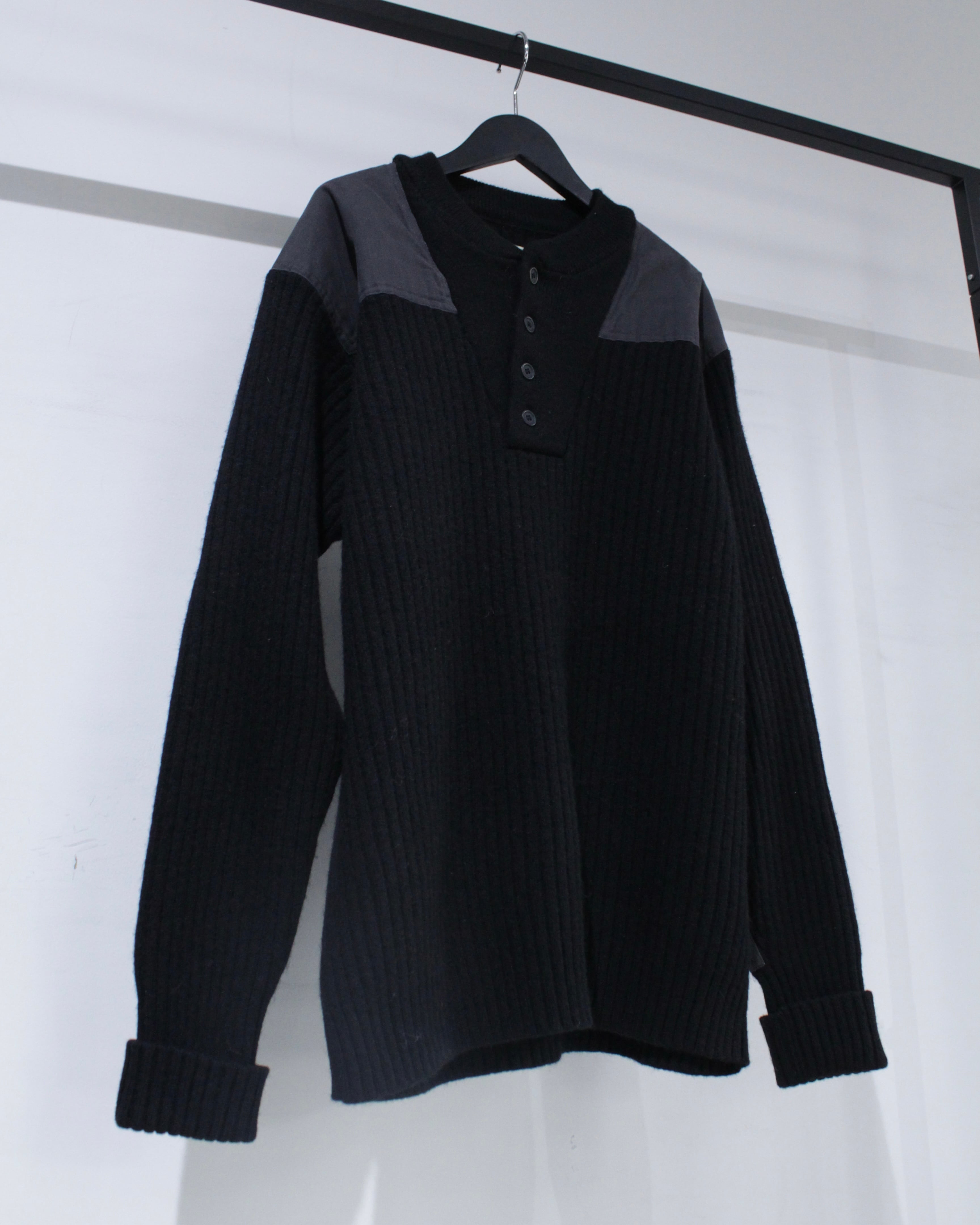 縦畝の立ったリブ編みボディに、肩と肘部分は異素材で切り替えられた、シンプルながらも表情のある1着に仕上げられています。