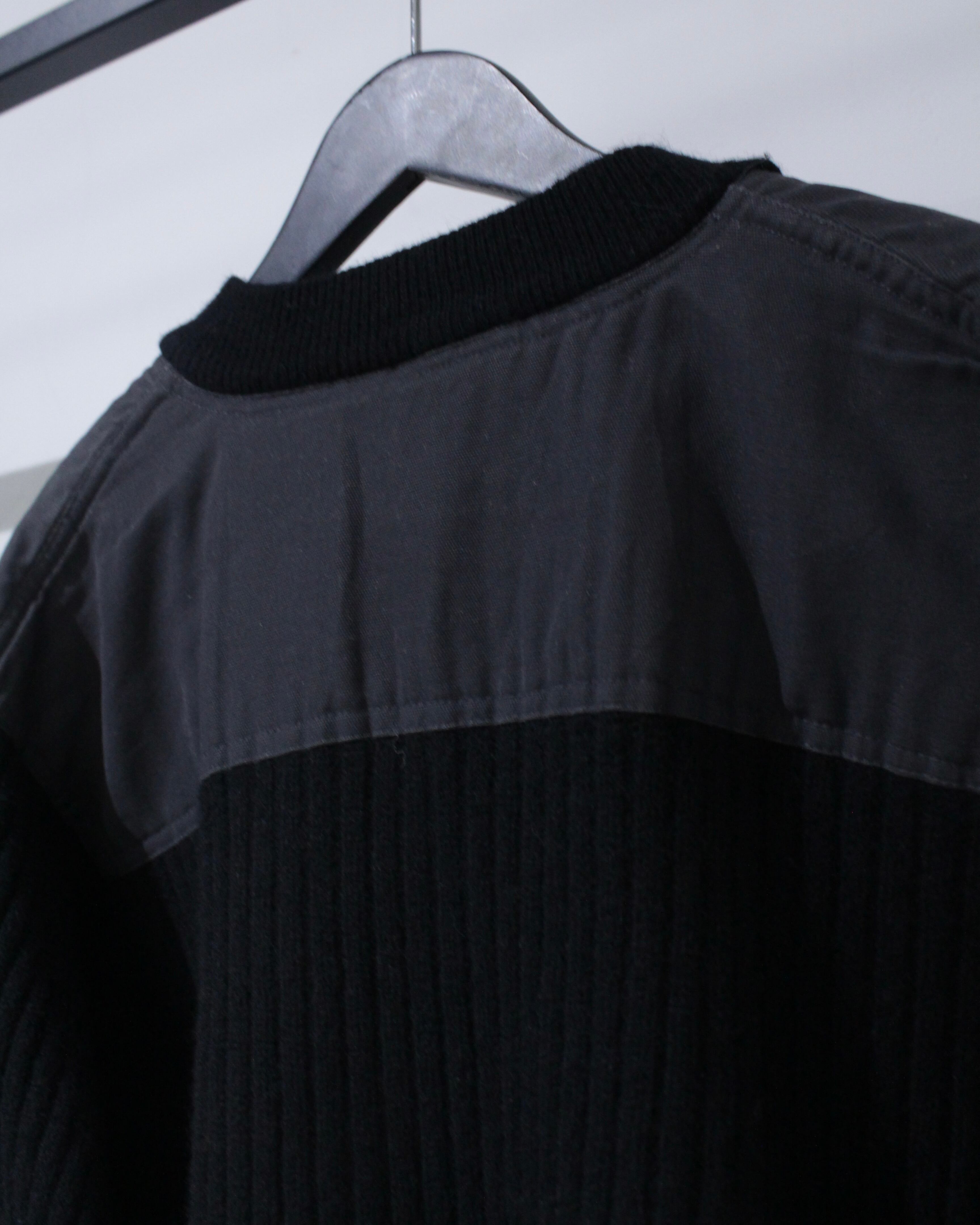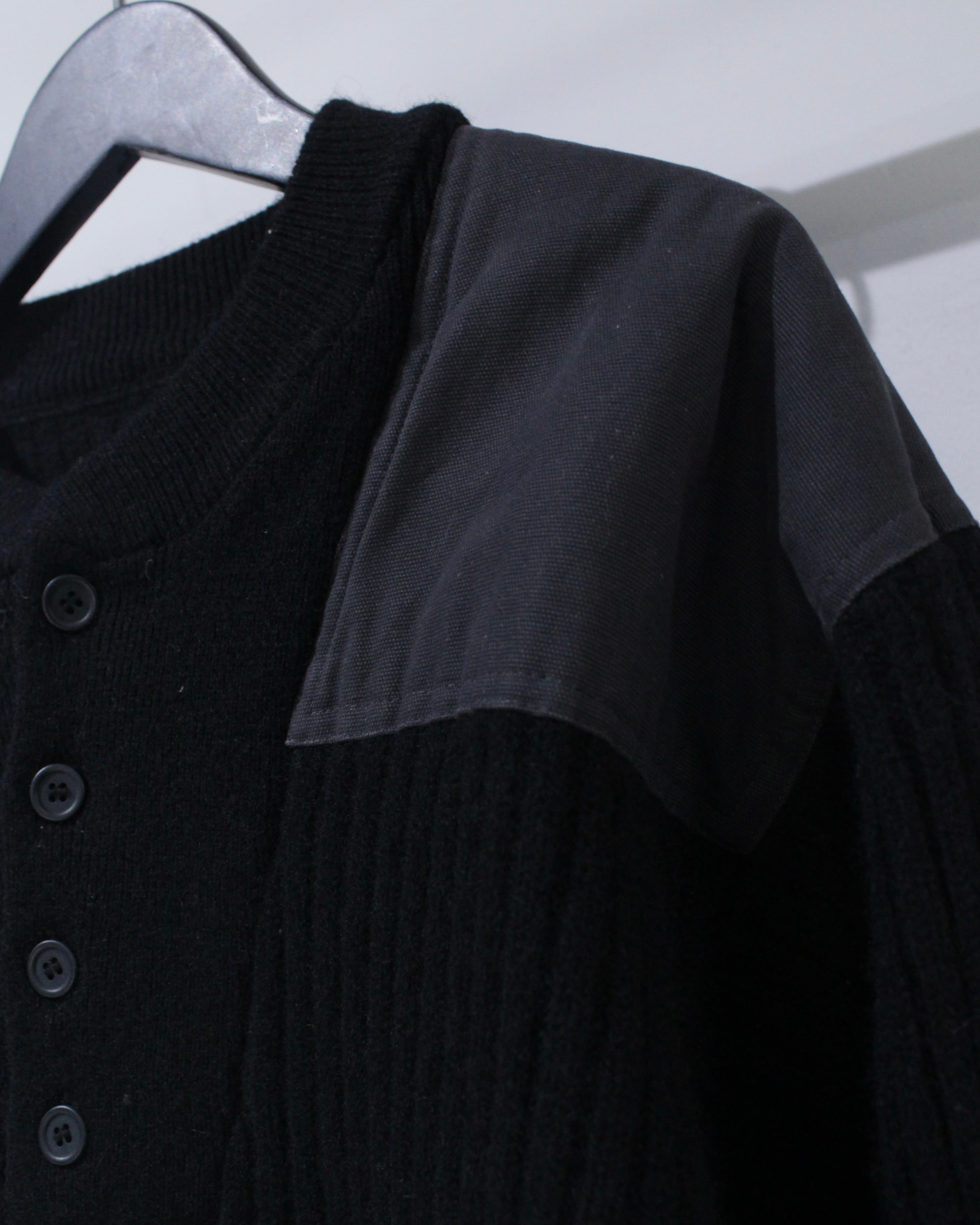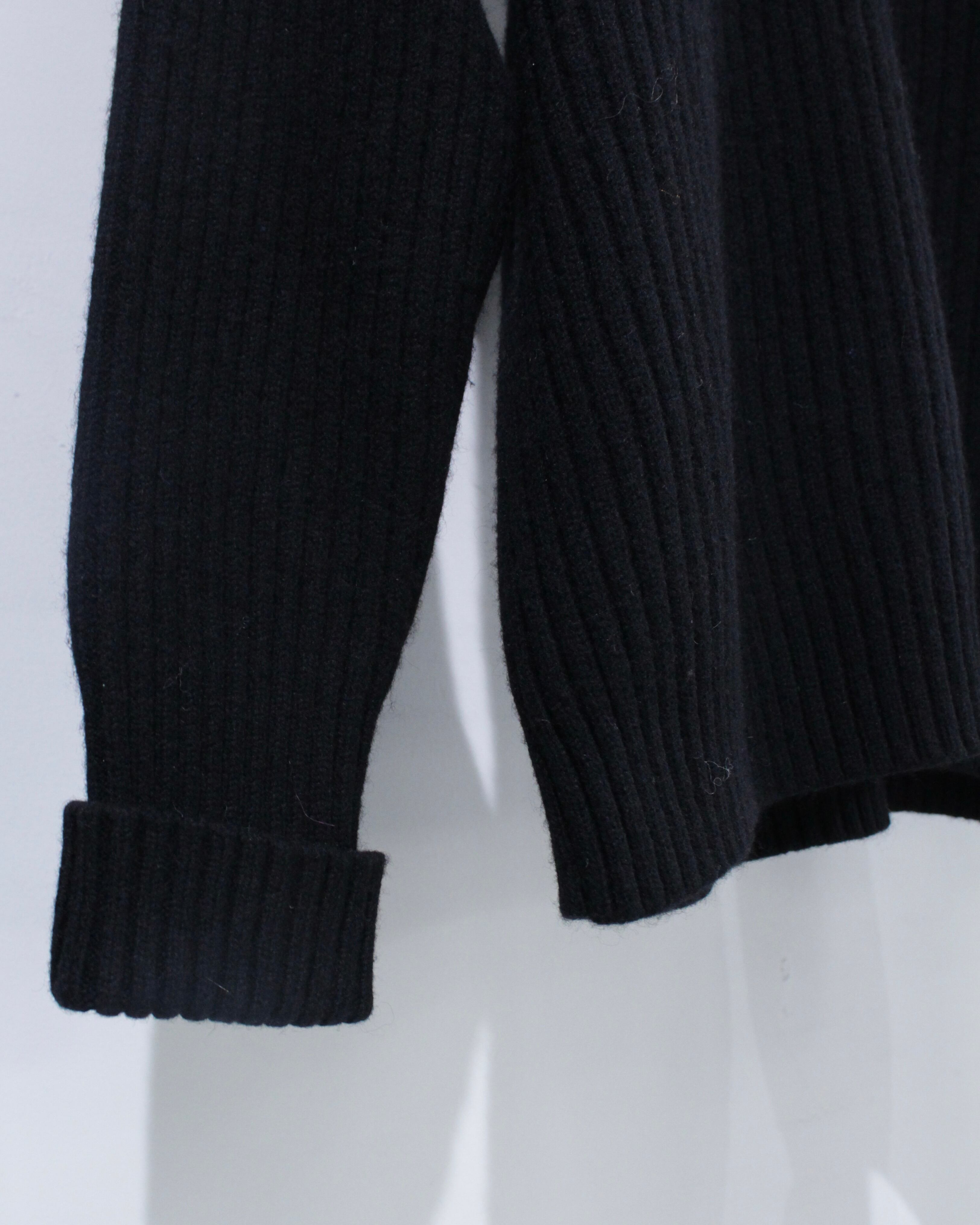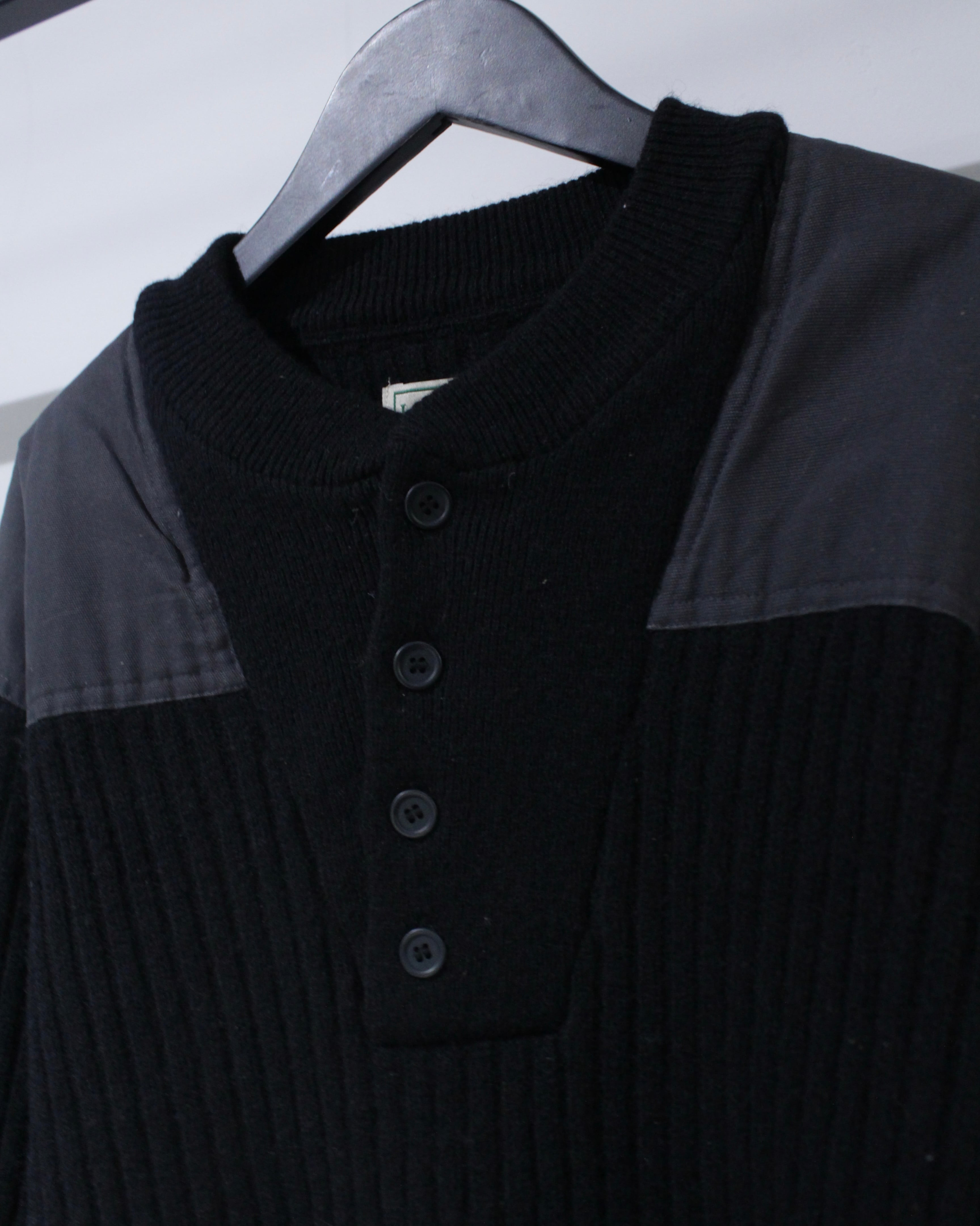 縦畝の立ったリブ編みボディに、肩と肘部分は異素材で切り替えられた、シンプルながらも表情のある1着に仕上げられています。