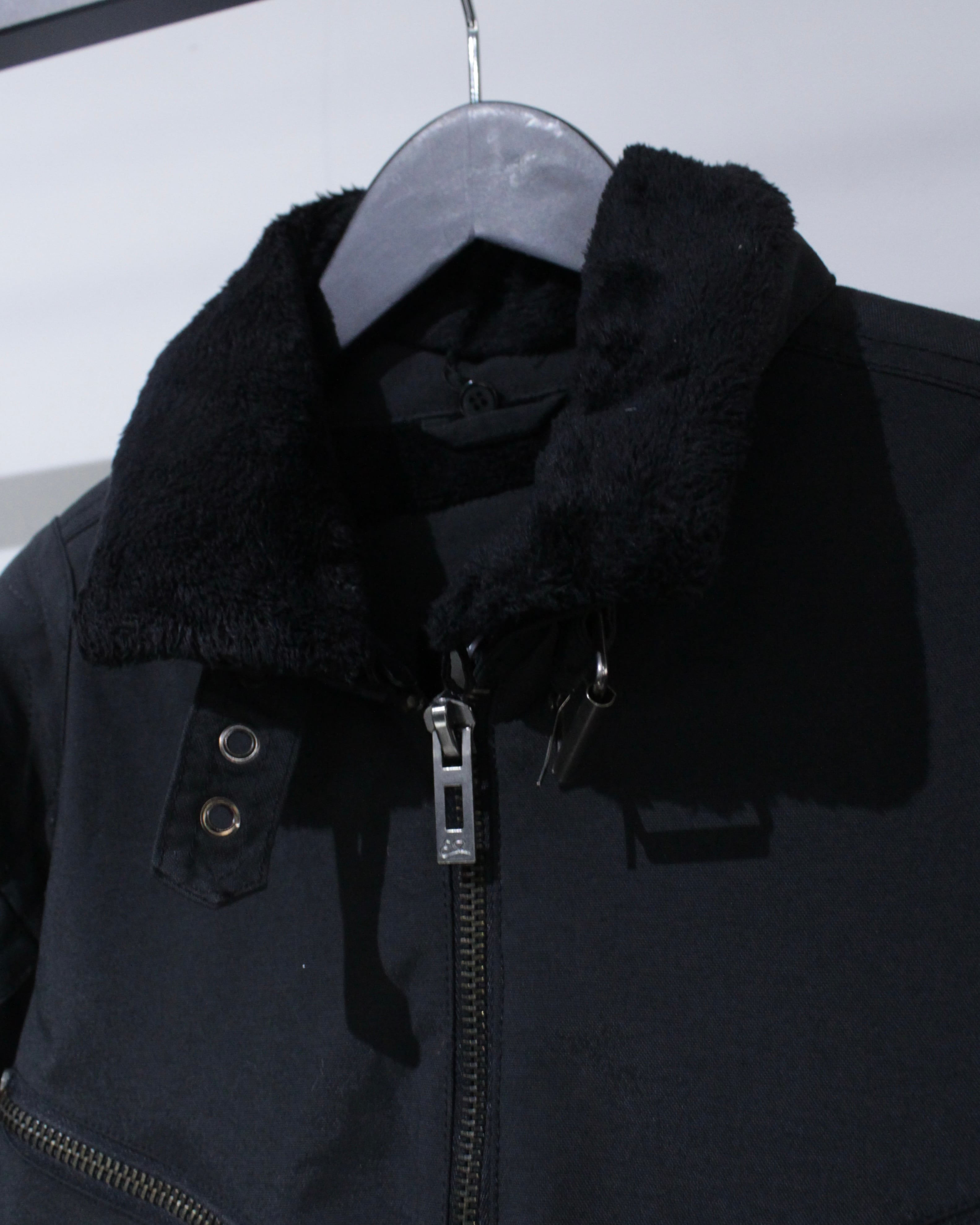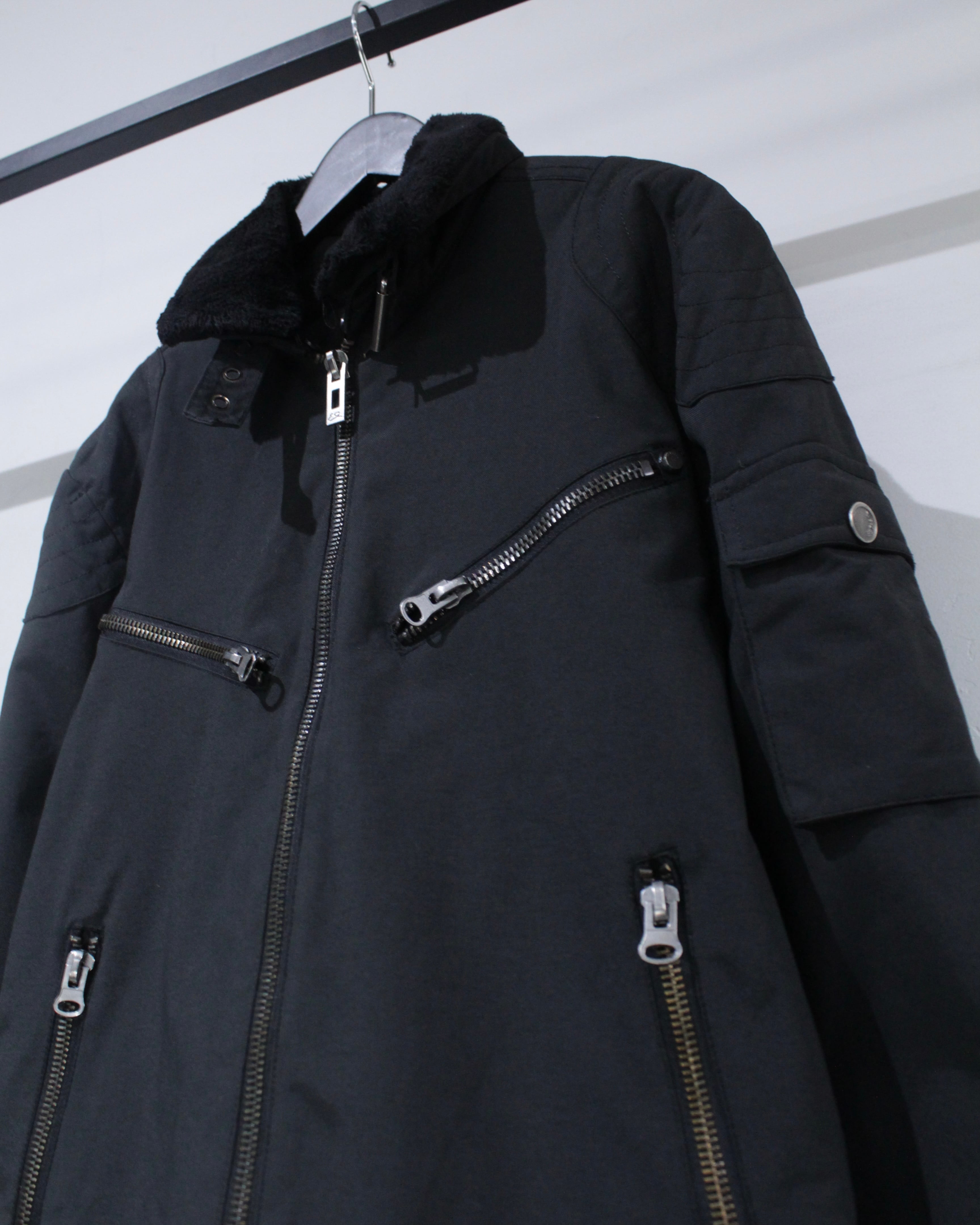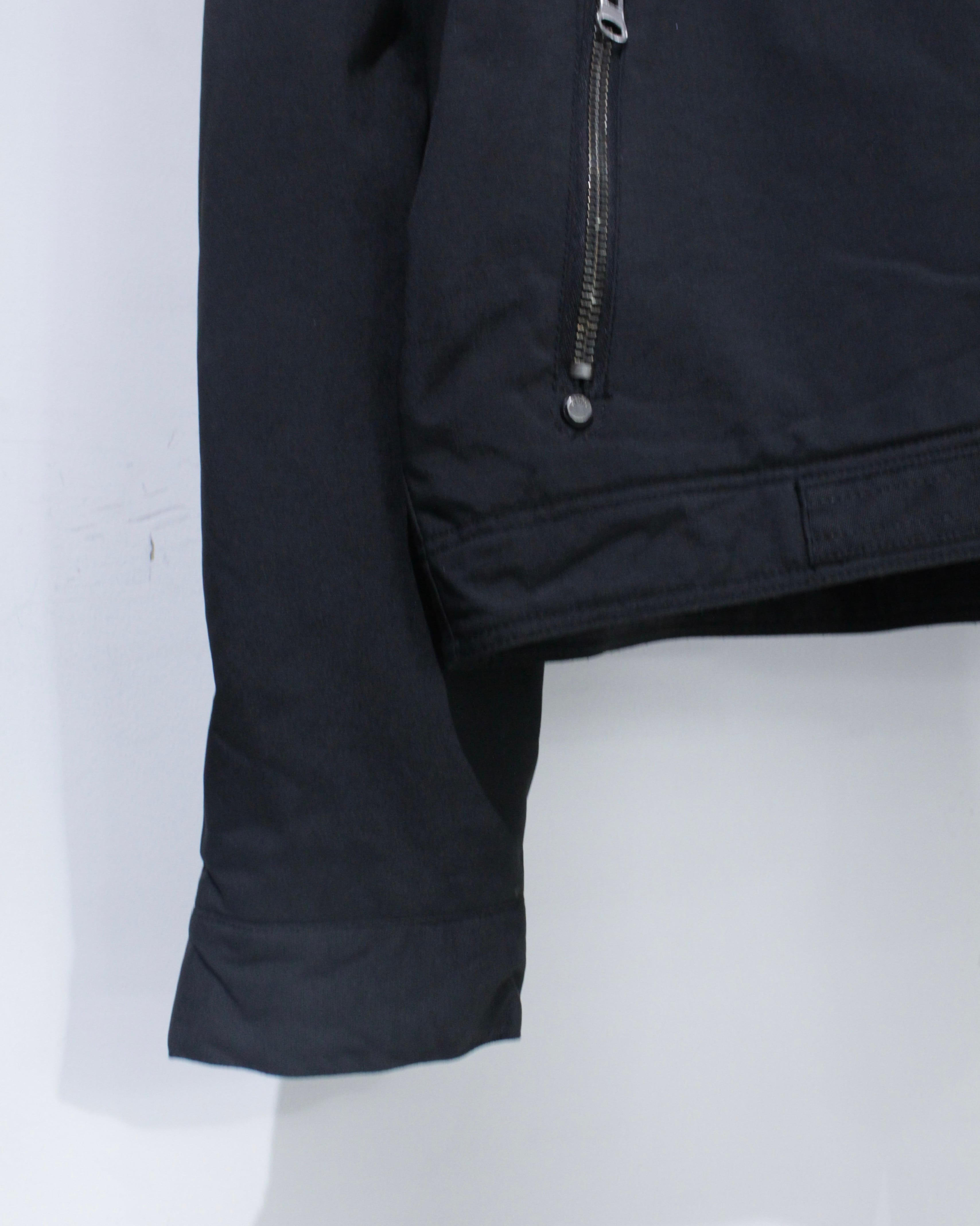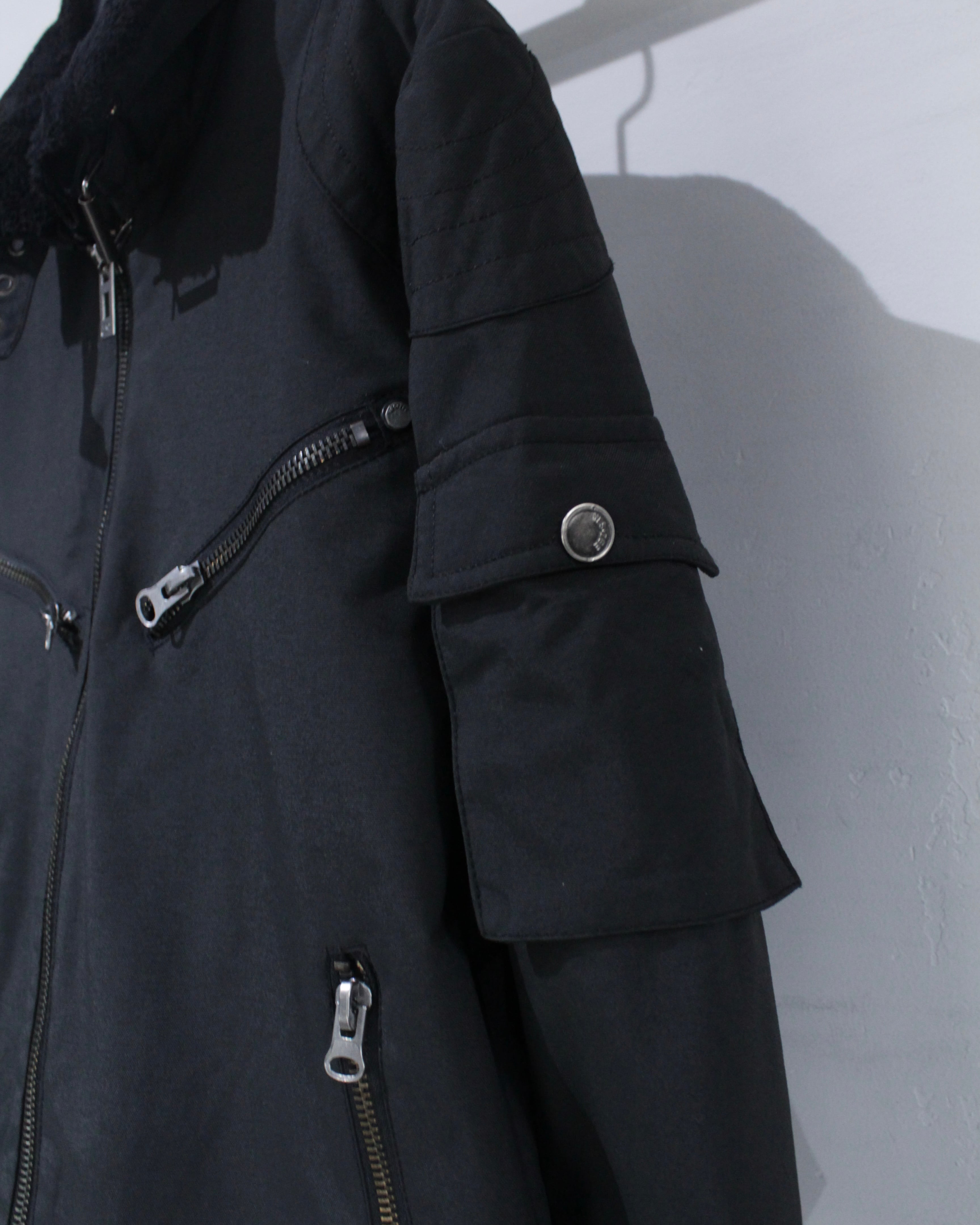フロントには斜めに配されたジップポケットと、下部の縦ジップポケットを配置。視覚的なアクセントとしても機能するジップ使いが、この1着のキャラクターをしっかりと主張します。