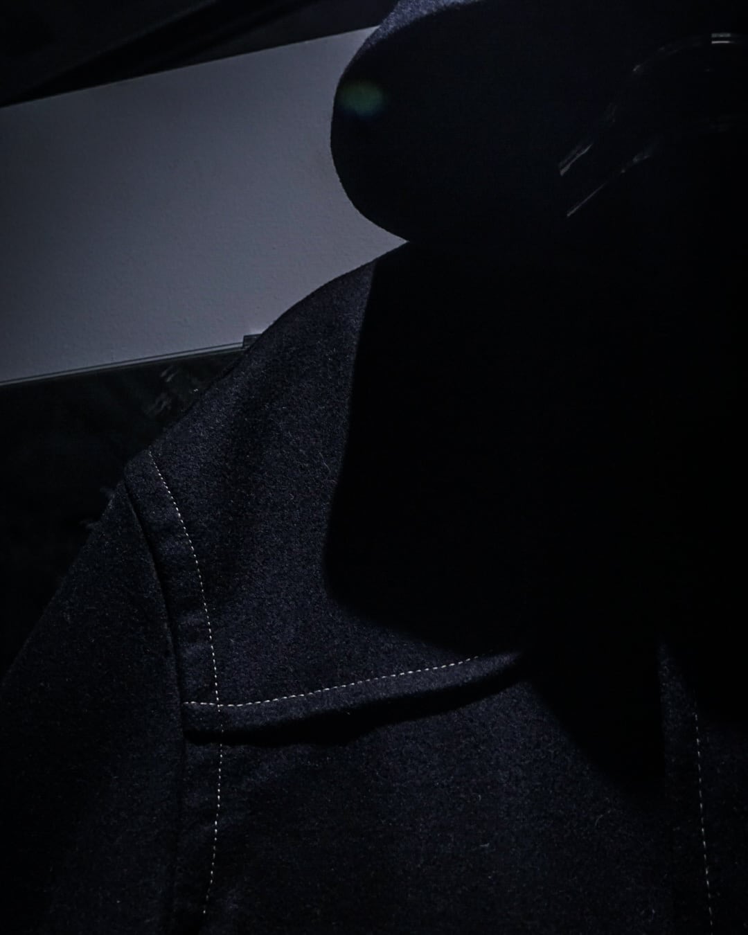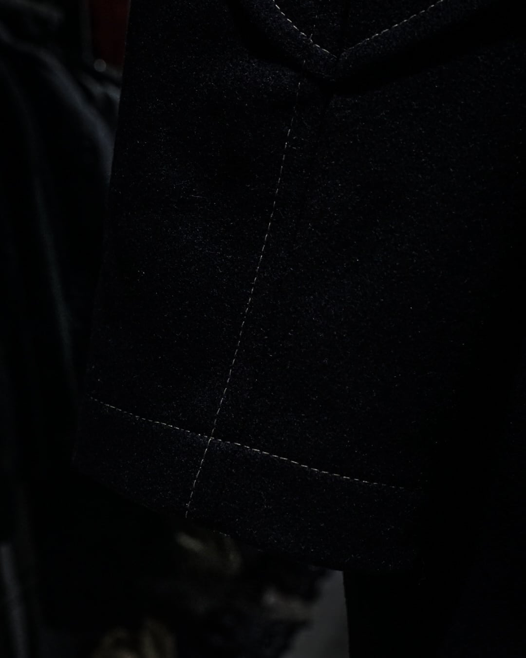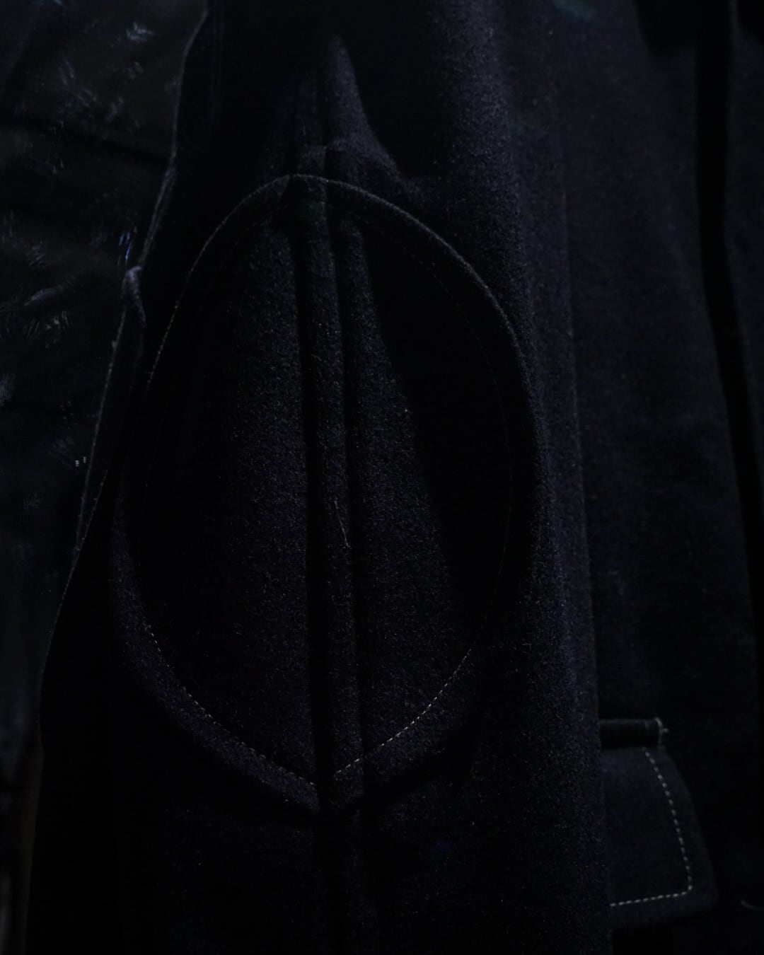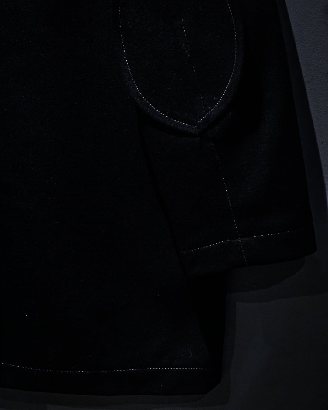 ボディには上質なブラックウールを使用。重厚感のある素材に、随所へ走らせたホワイトステッチがコントラストとして効き、クラシックでありながらどこかモダンな表情を見せます。