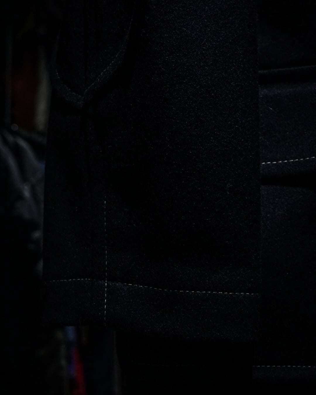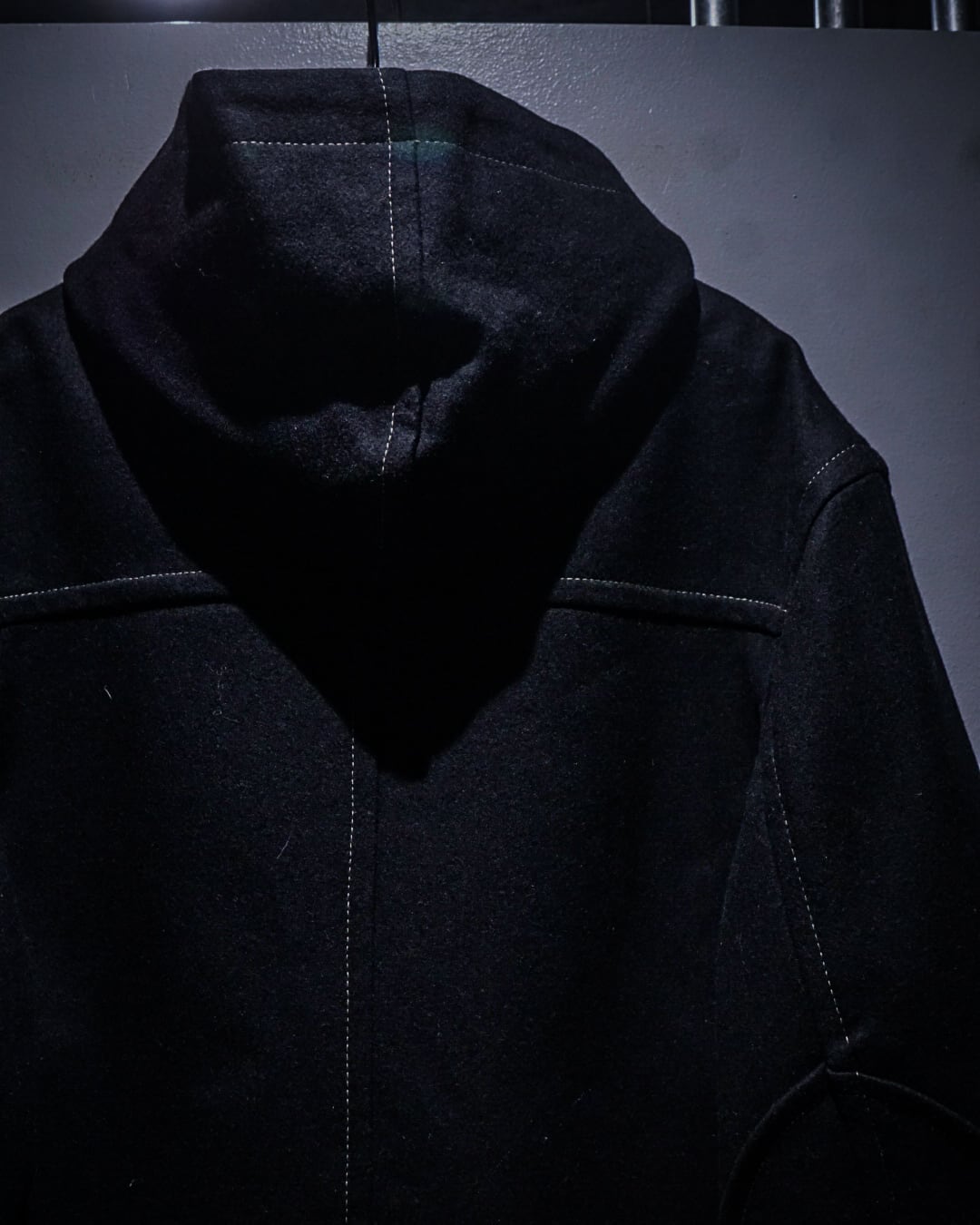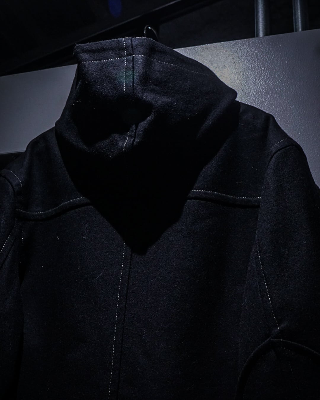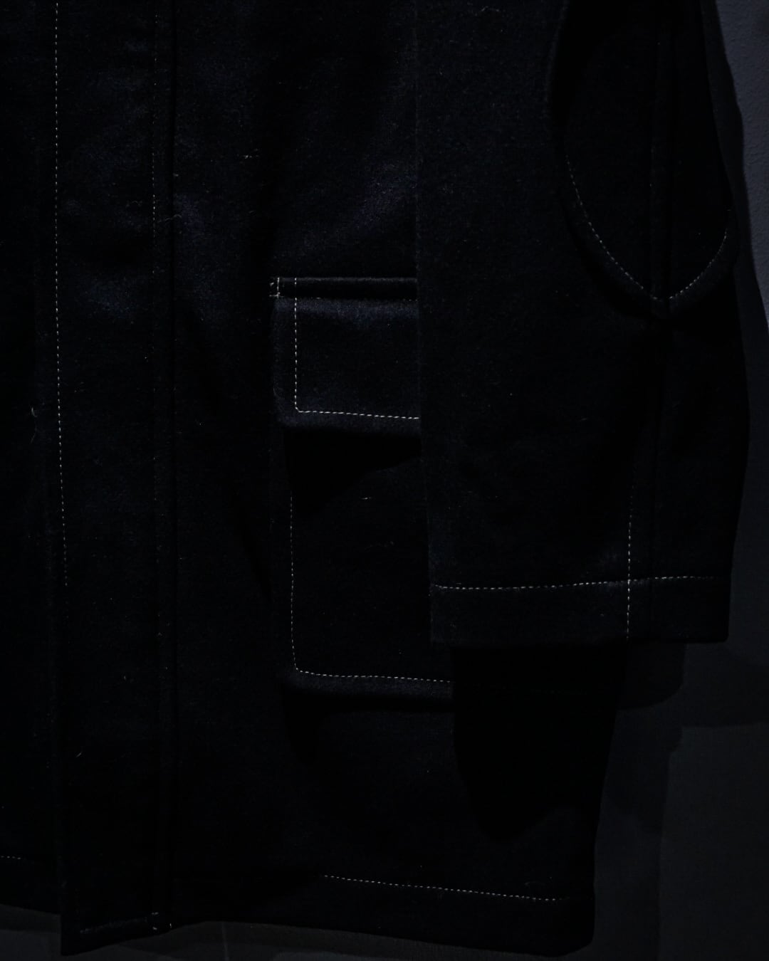 ボディには上質なブラックウールを使用。重厚感のある素材に、随所へ走らせたホワイトステッチがコントラストとして効き、クラシックでありながらどこかモダンな表情を見せます。