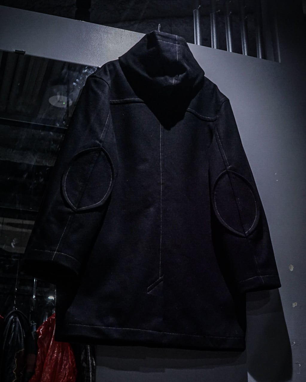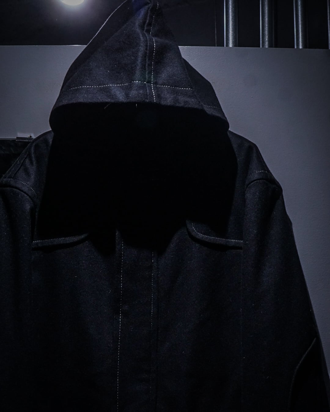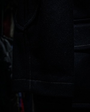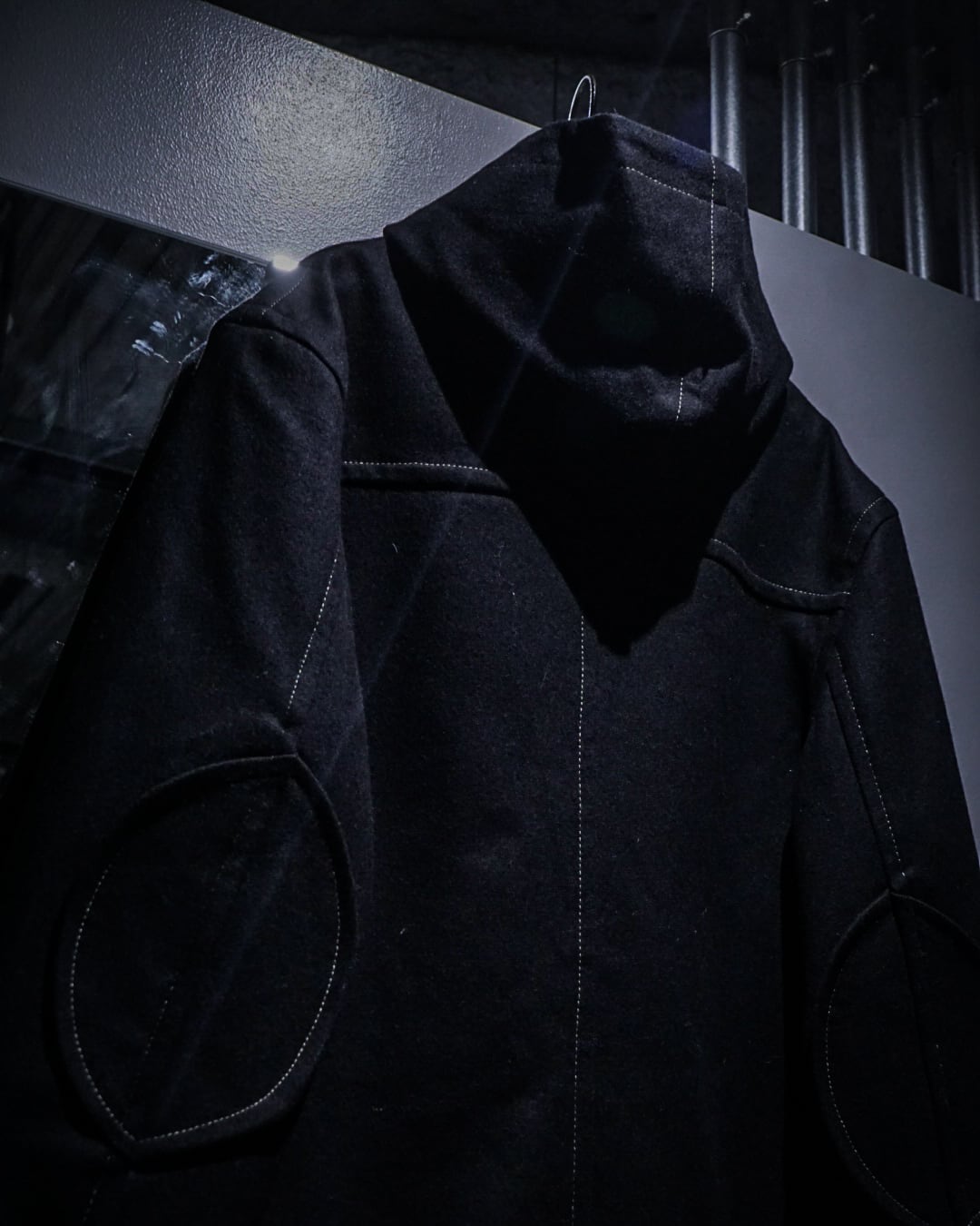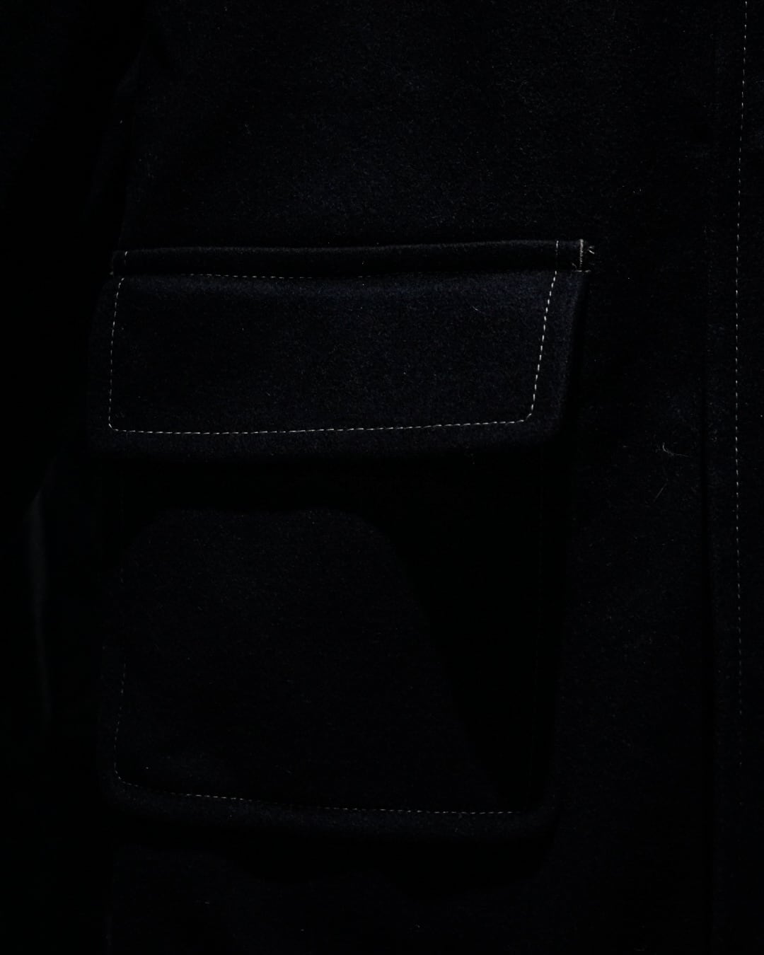 ボディには上質なブラックウールを使用。重厚感のある素材に、随所へ走らせたホワイトステッチがコントラストとして効き、クラシックでありながらどこかモダンな表情を見せます。