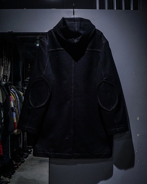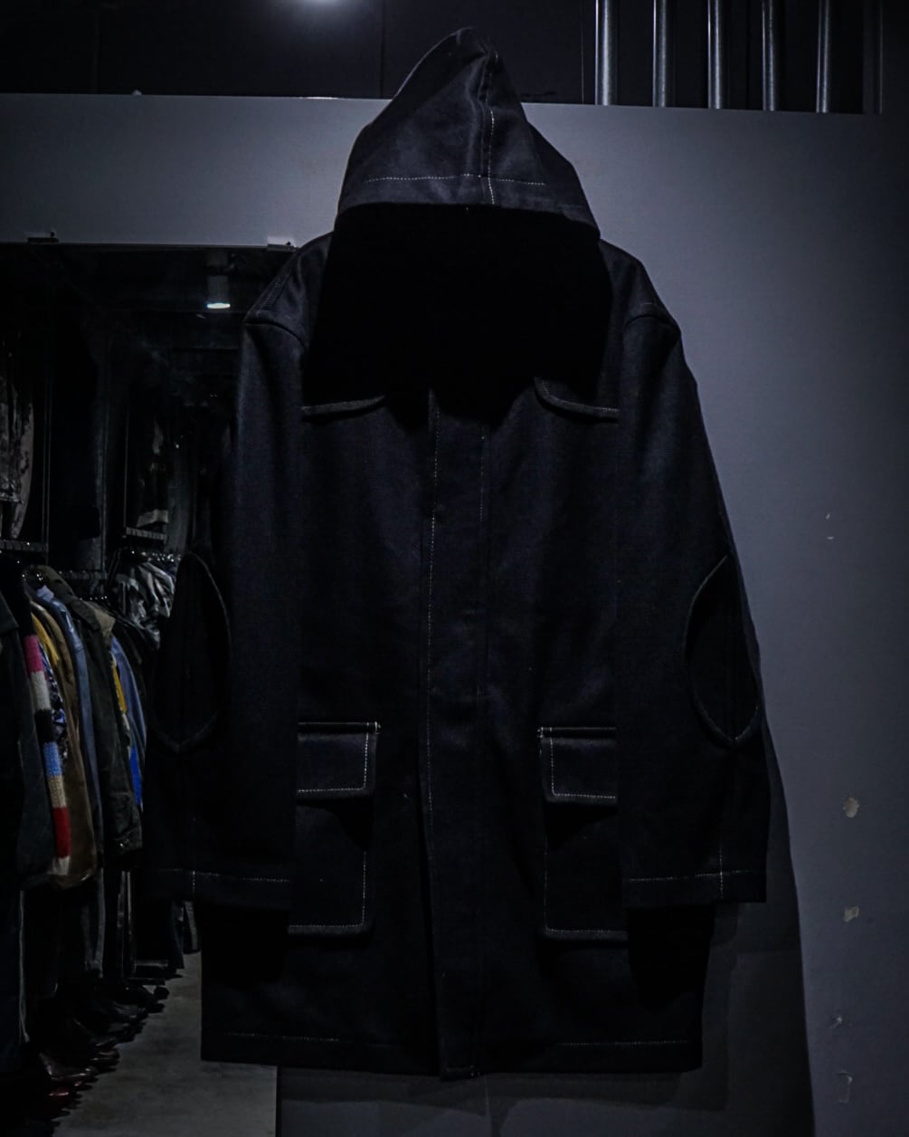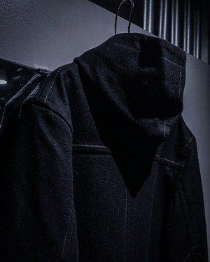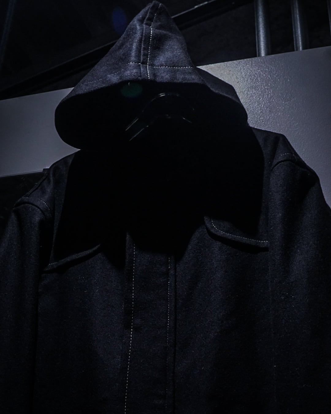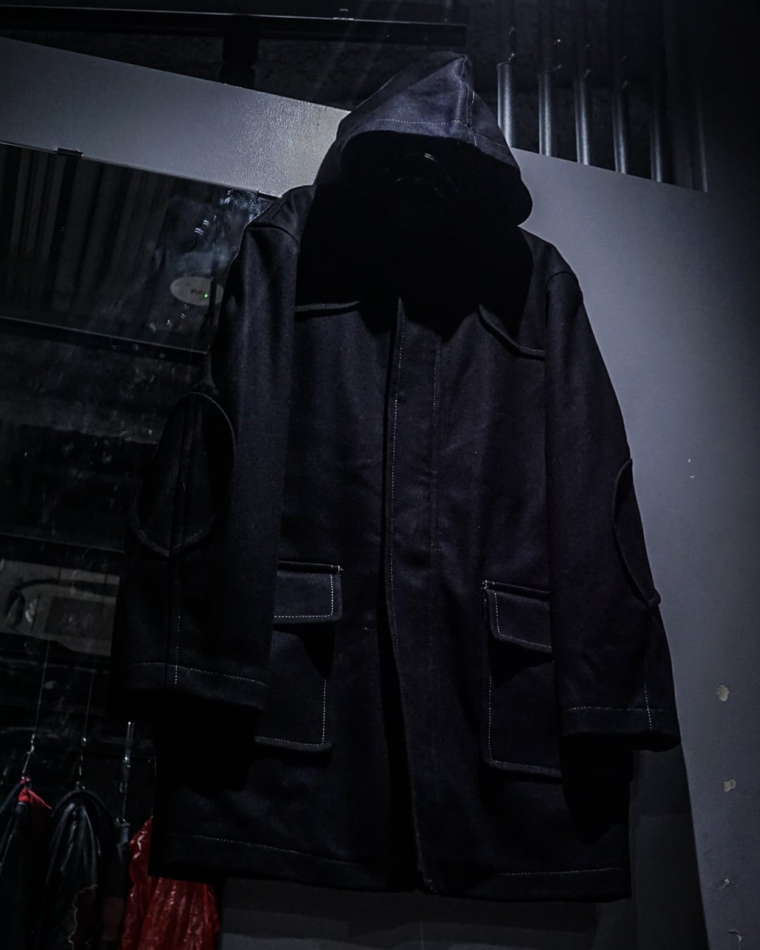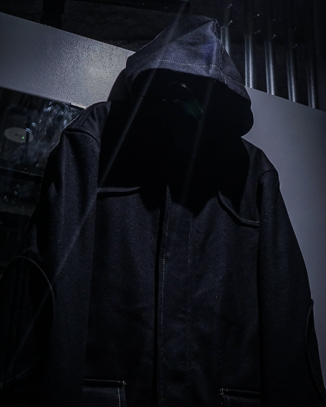 ボディには上質なブラックウールを使用。重厚感のある素材に、随所へ走らせたホワイトステッチがコントラストとして効き、クラシックでありながらどこかモダンな表情を見せます。