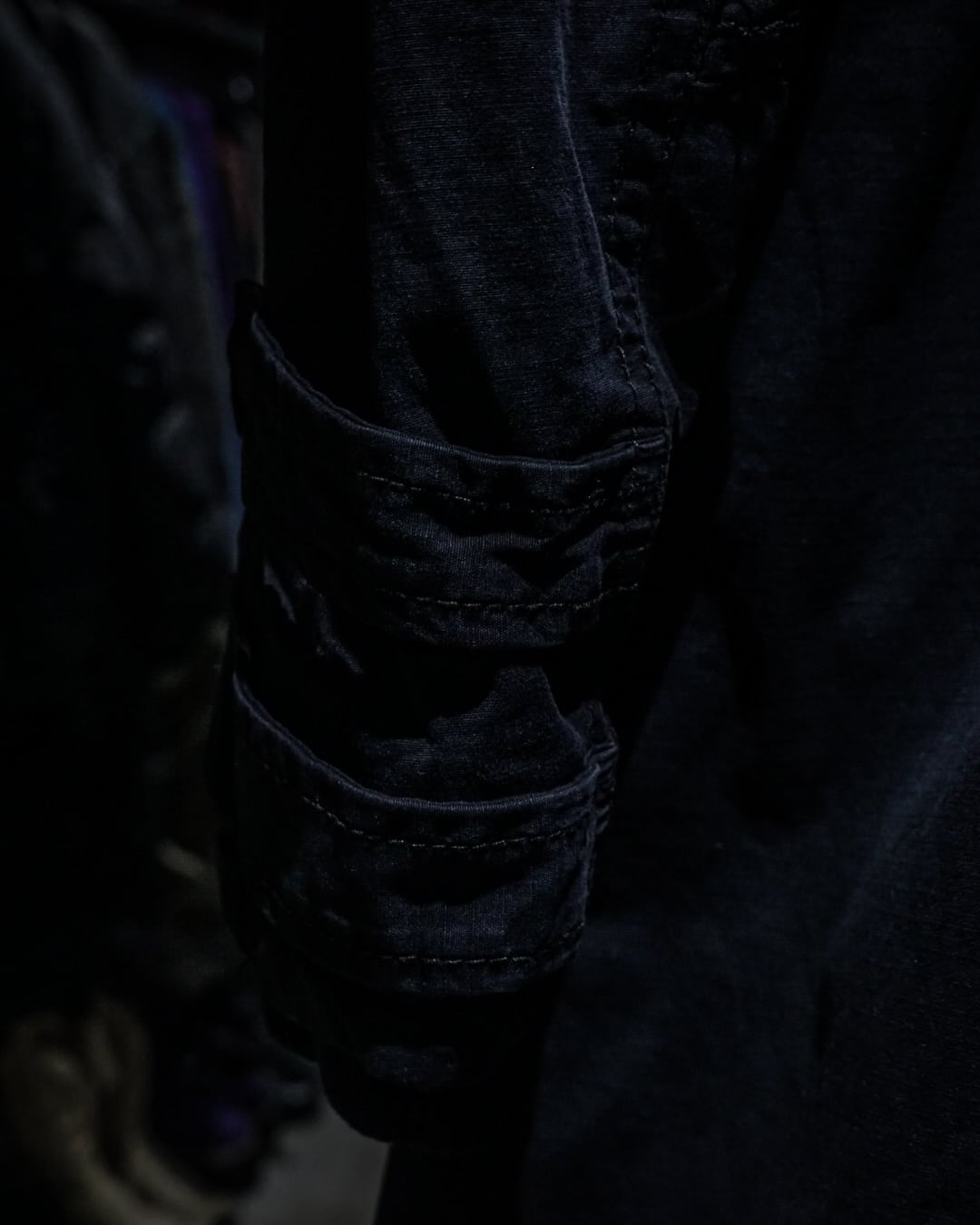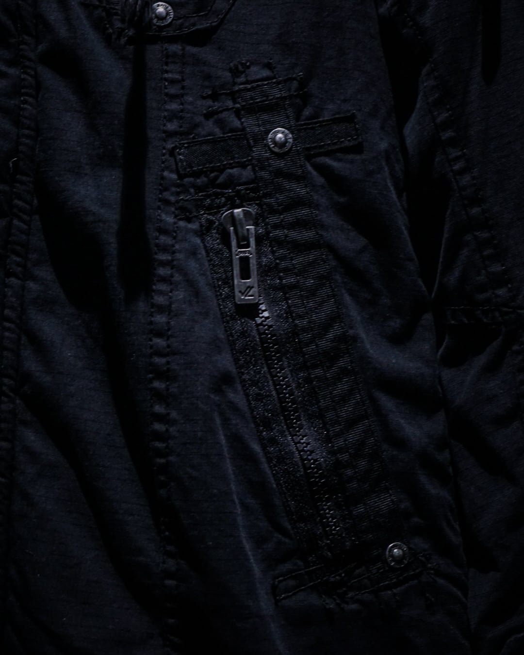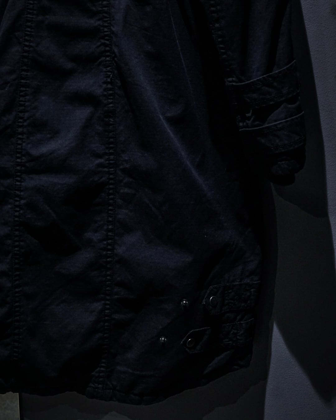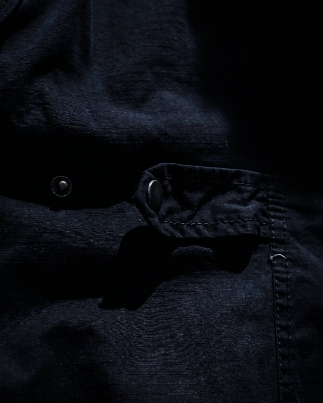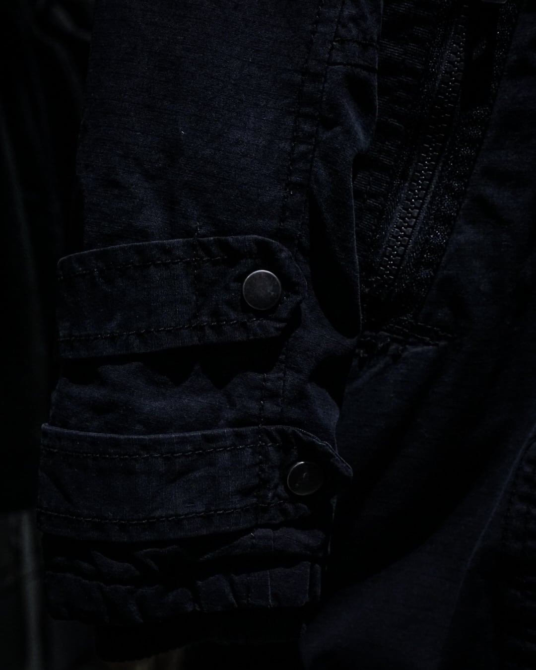 ボディにはコットンのリップストップ素材を採用。フェードの効いたブラックが奥行きのある表情を生み、ミリタリー由来の無骨さにモードな空気感を重ねた仕上がりです。着用を重ねることで、さらに風合いが増していく点も魅力。