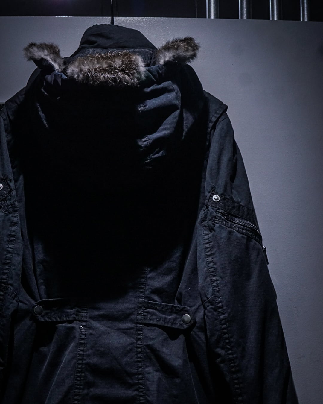 フロントはジップ×ボタンの比翼仕立て。ジップポケットやアームのユーティリティポケット、脇下のベンチレーション、裾と背面のアジャスターベルトなど、機能的なディテールを余すことなく搭載。フードにはフワッフワのリアルラビットファーを施し、取り外し可能という抜かりのない仕様です。