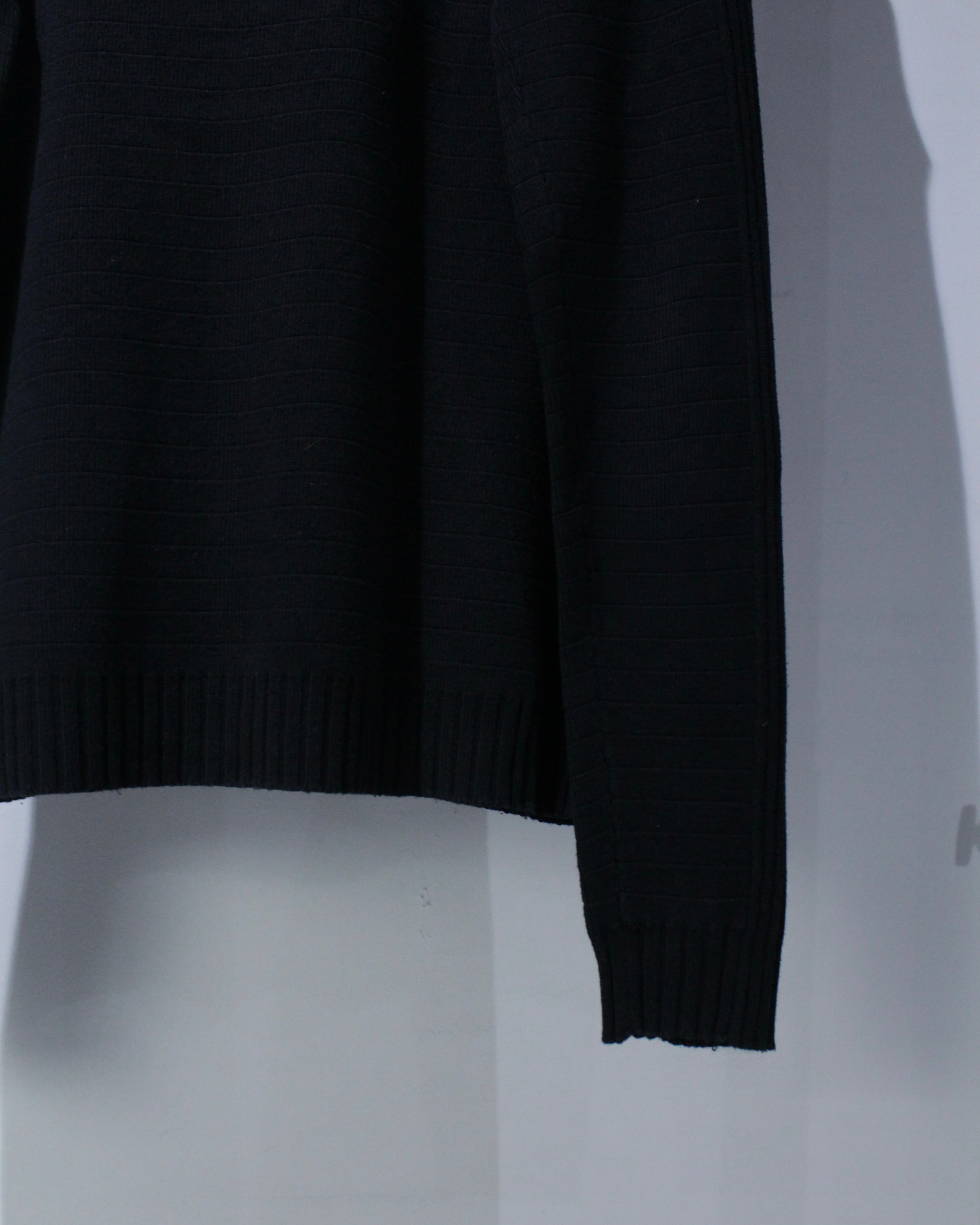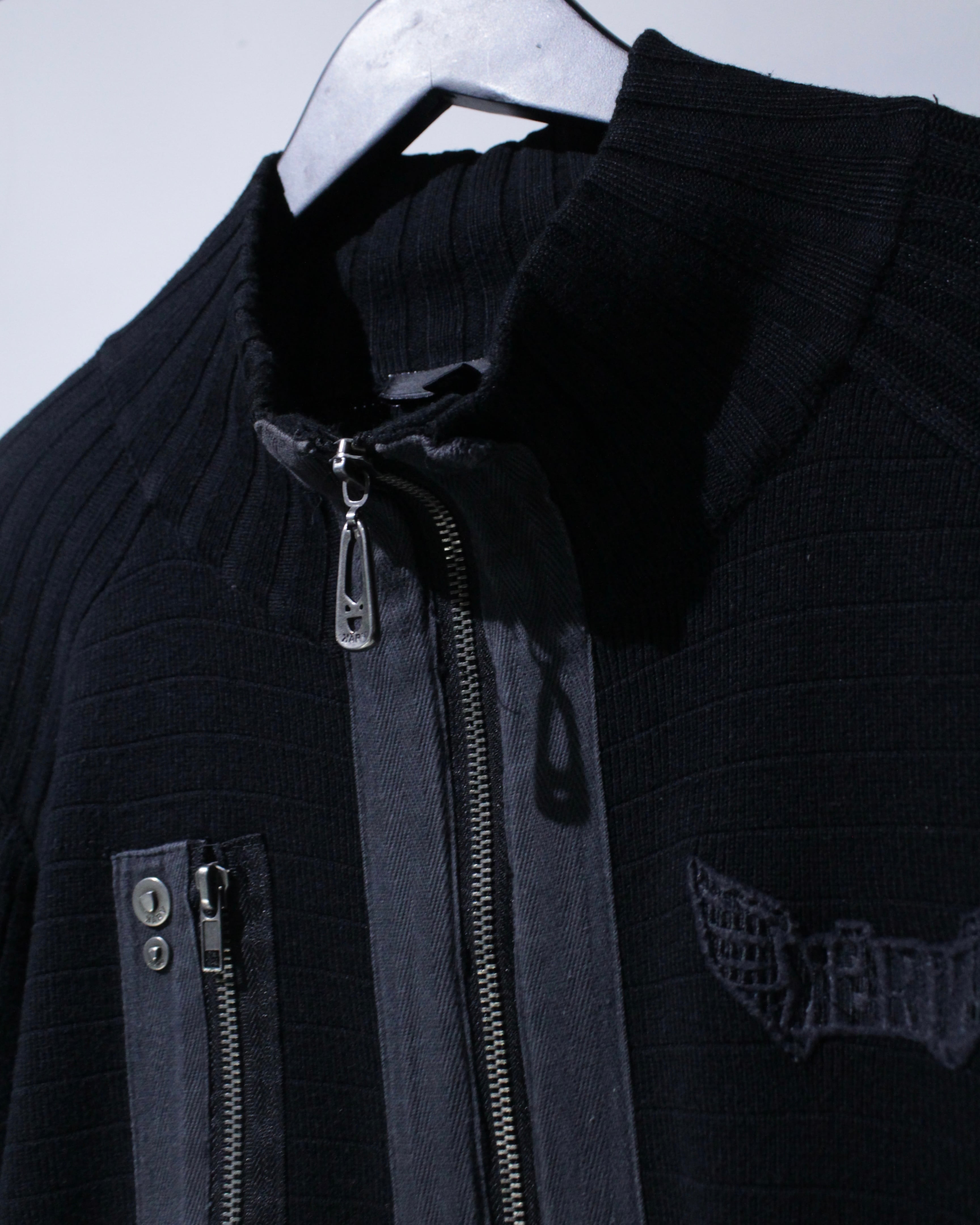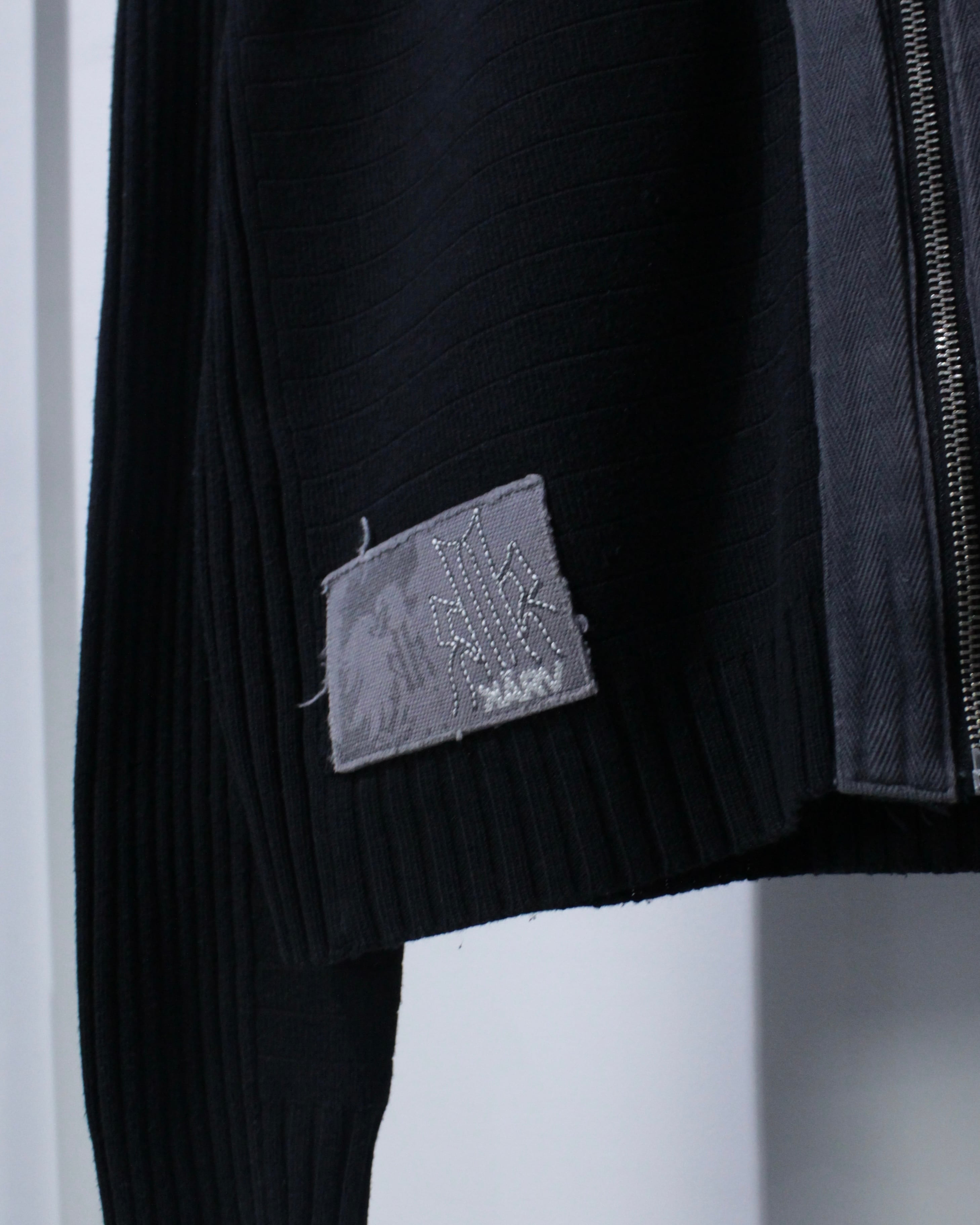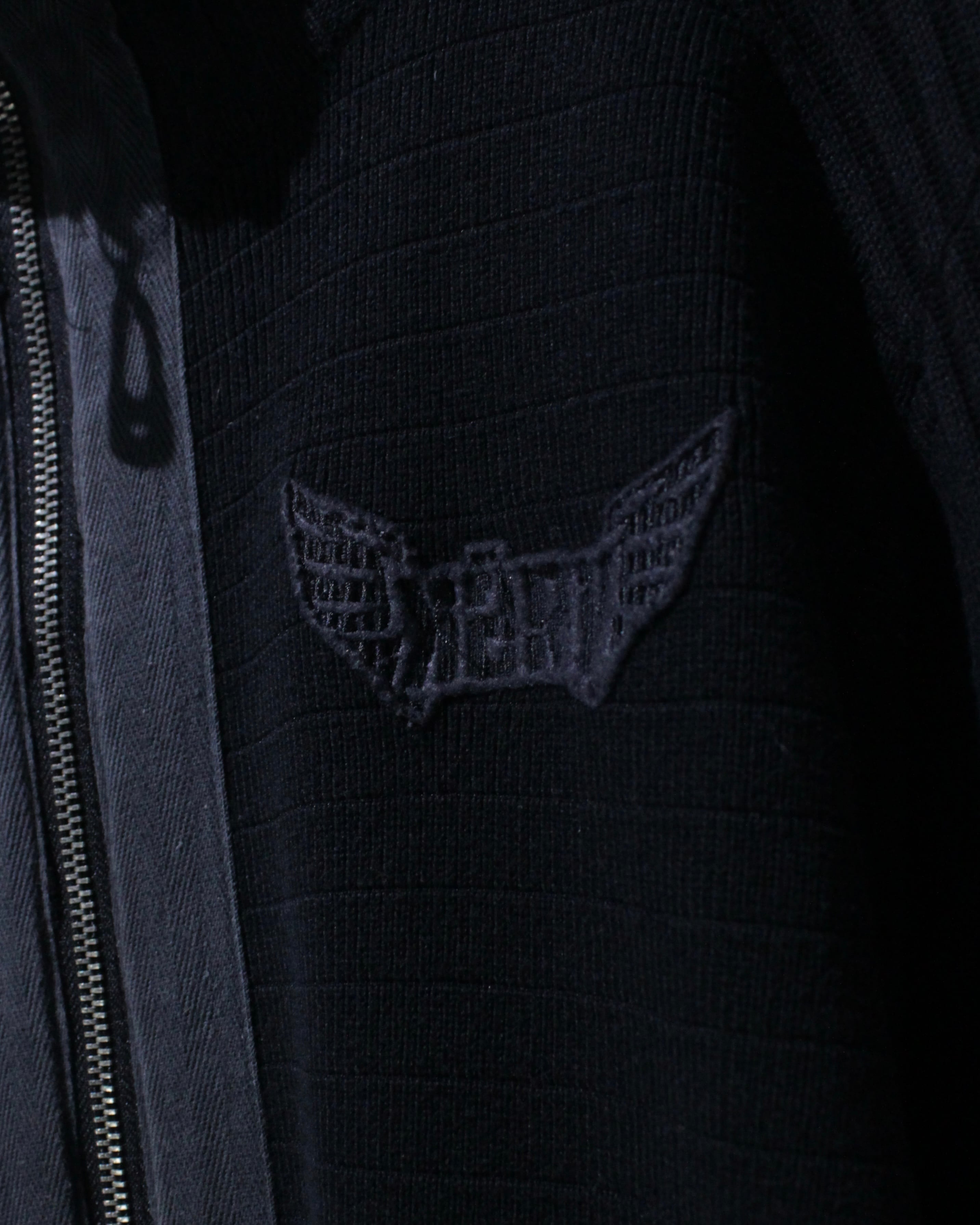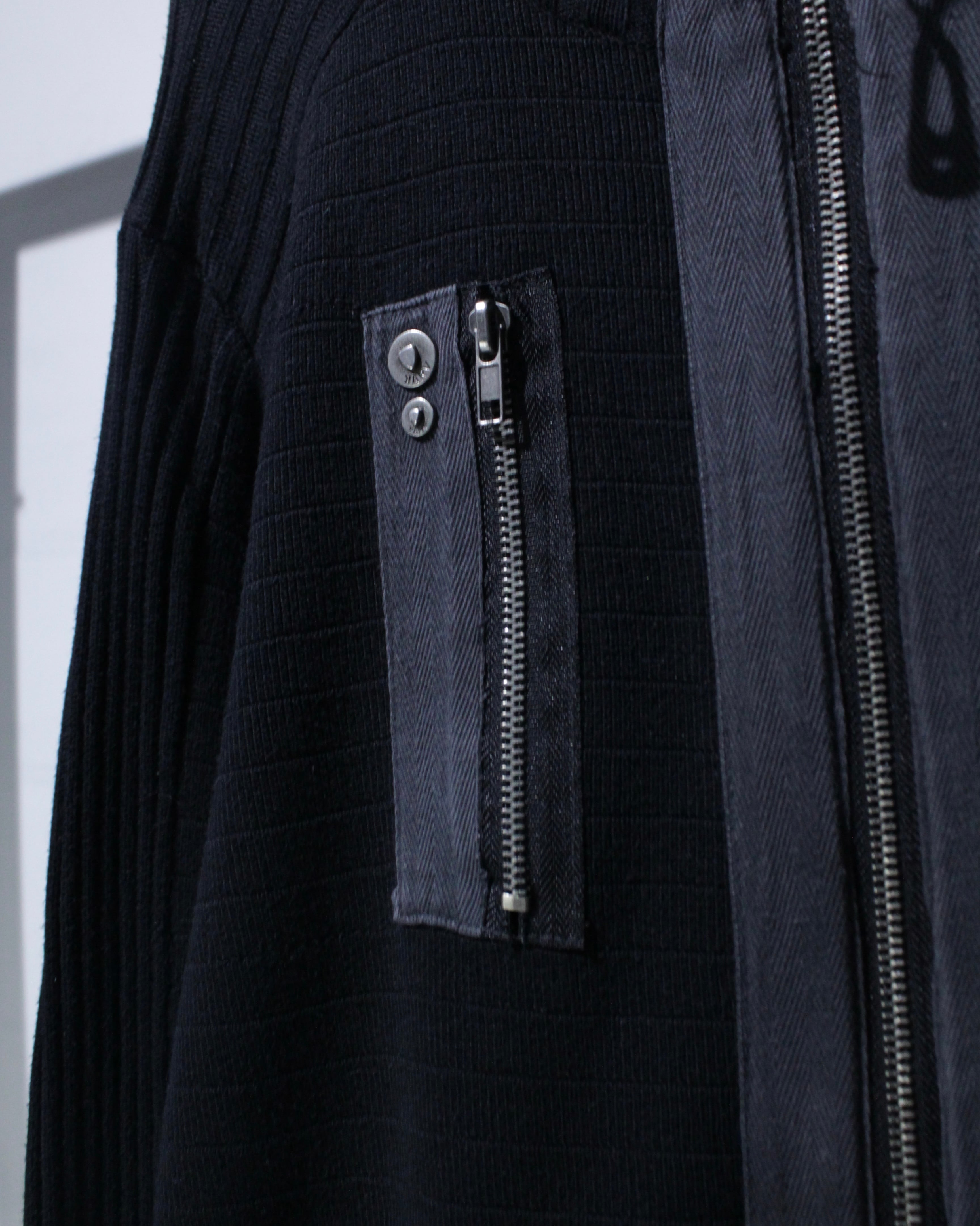 ボディには畝感のある肉厚ニット素材を採用し、ブラックを基調としたソリッドなカラーリングに、異素材で切り替えられたフロントジップのヘリンボーンテープがアクセントとして効いています。