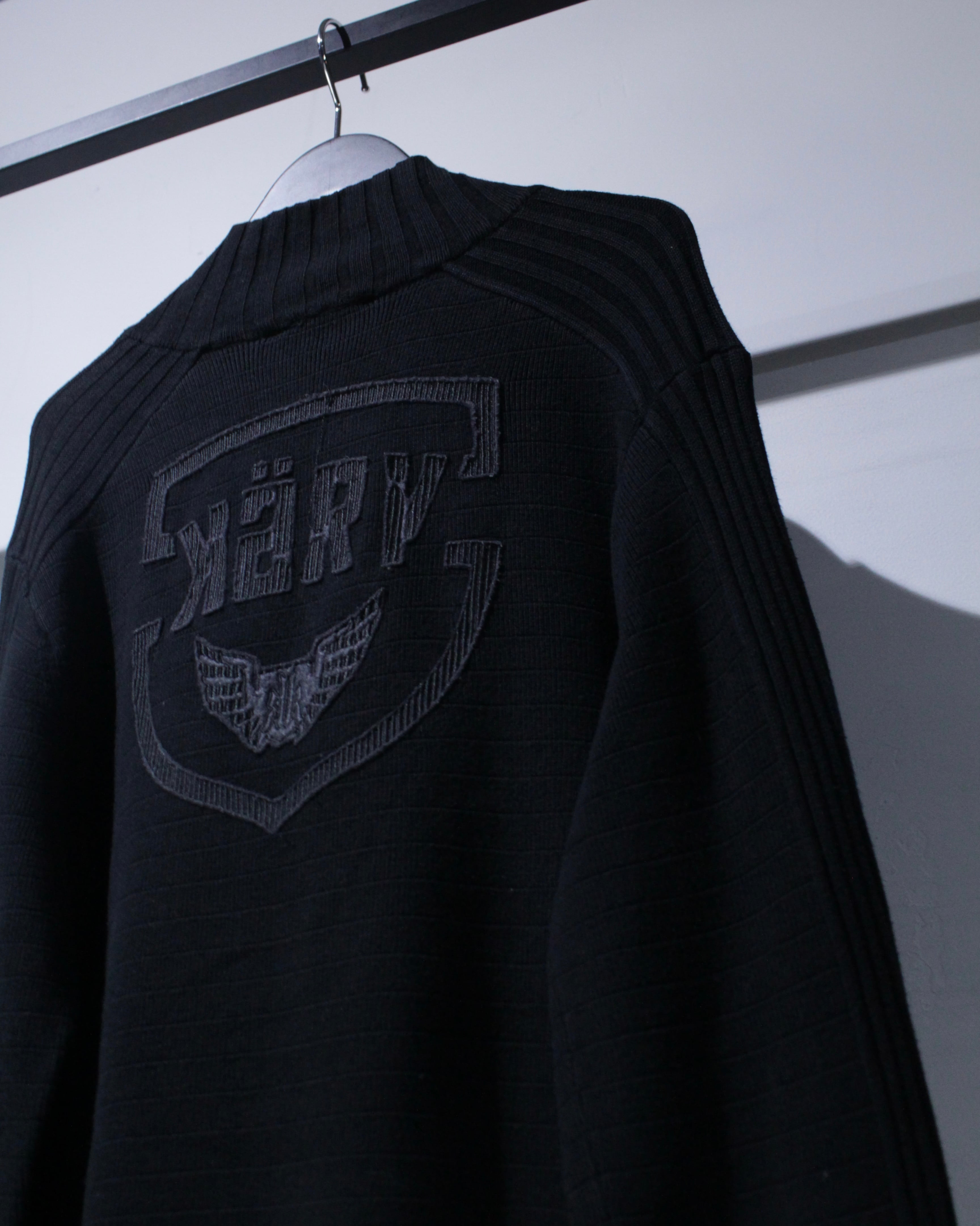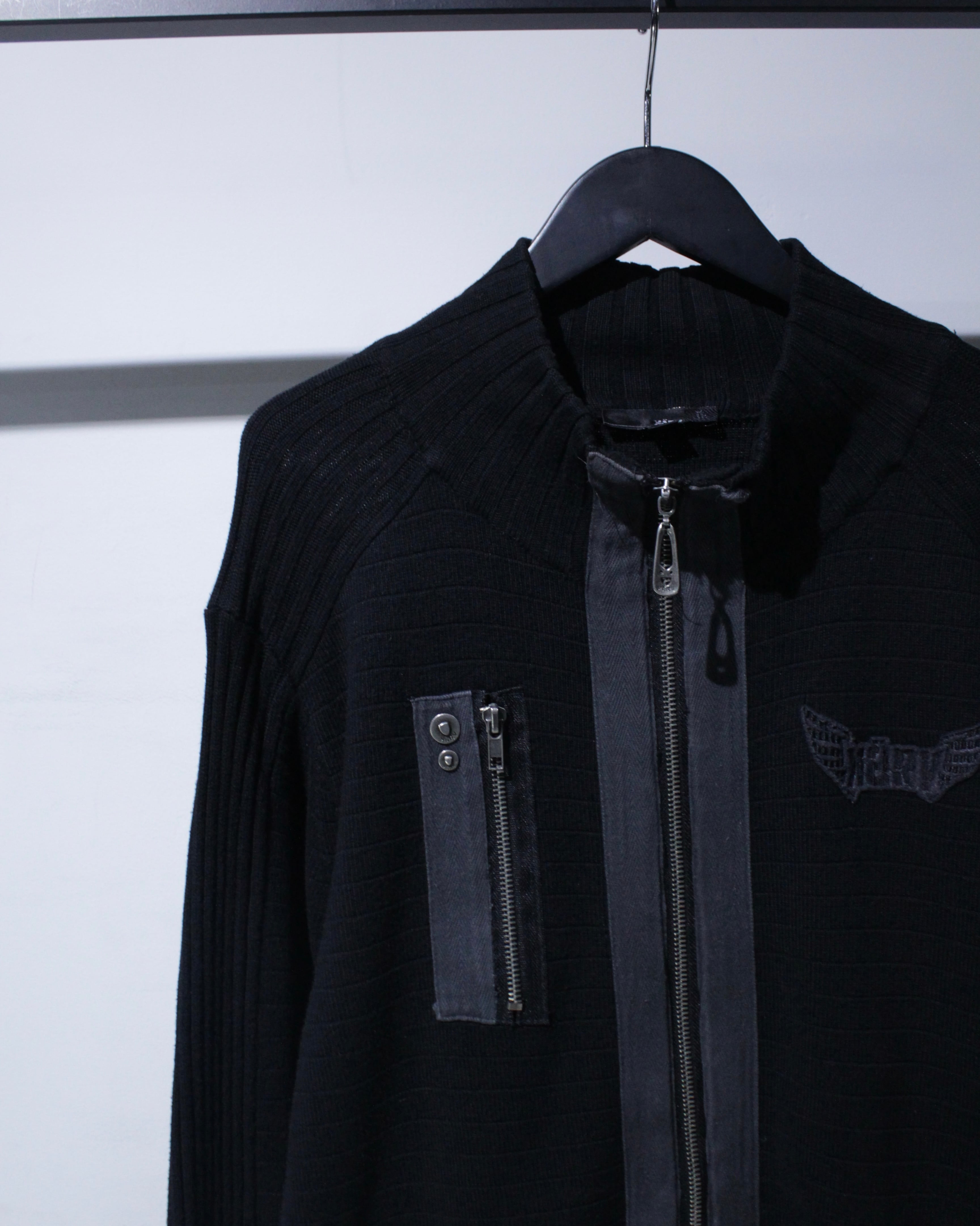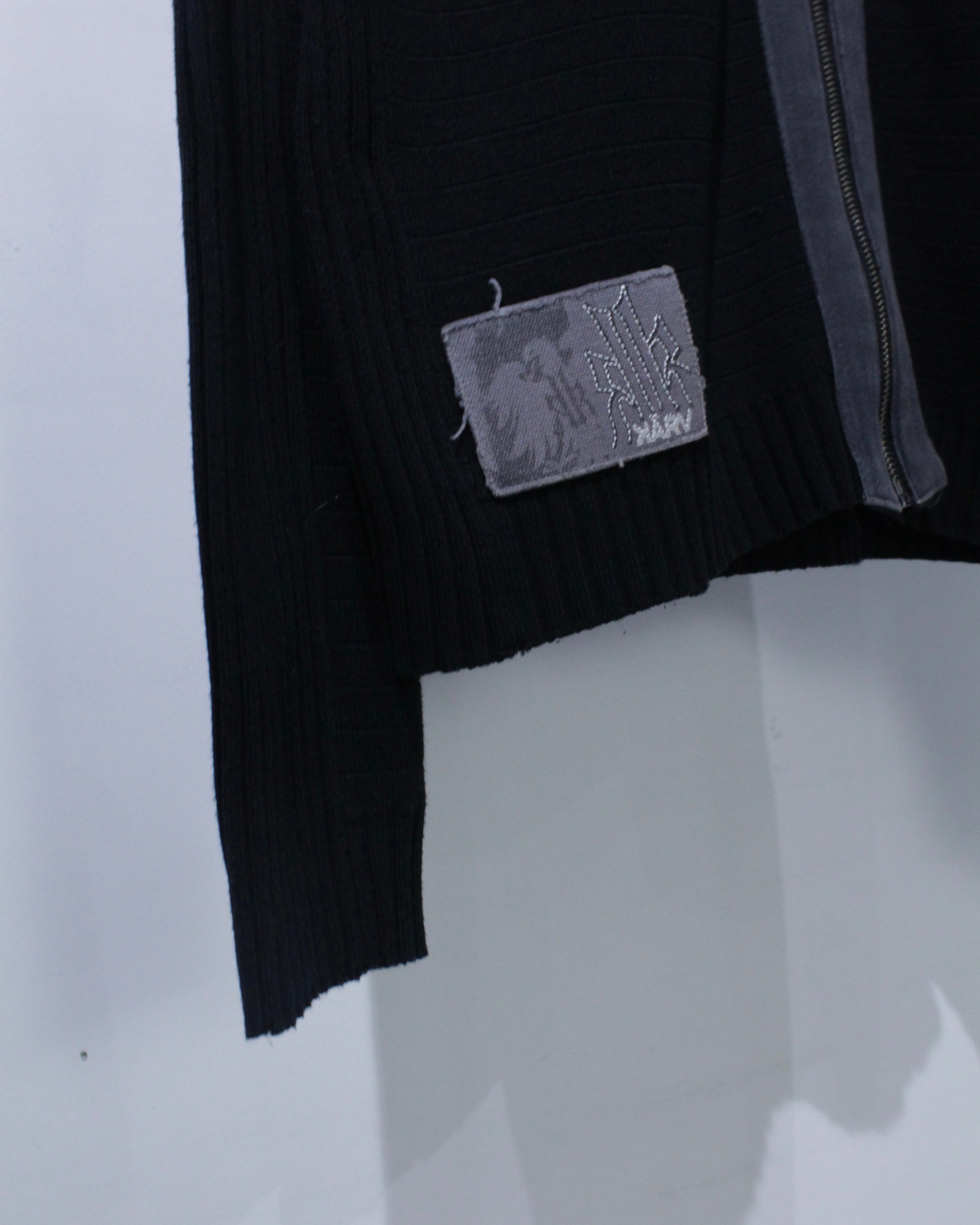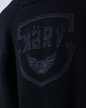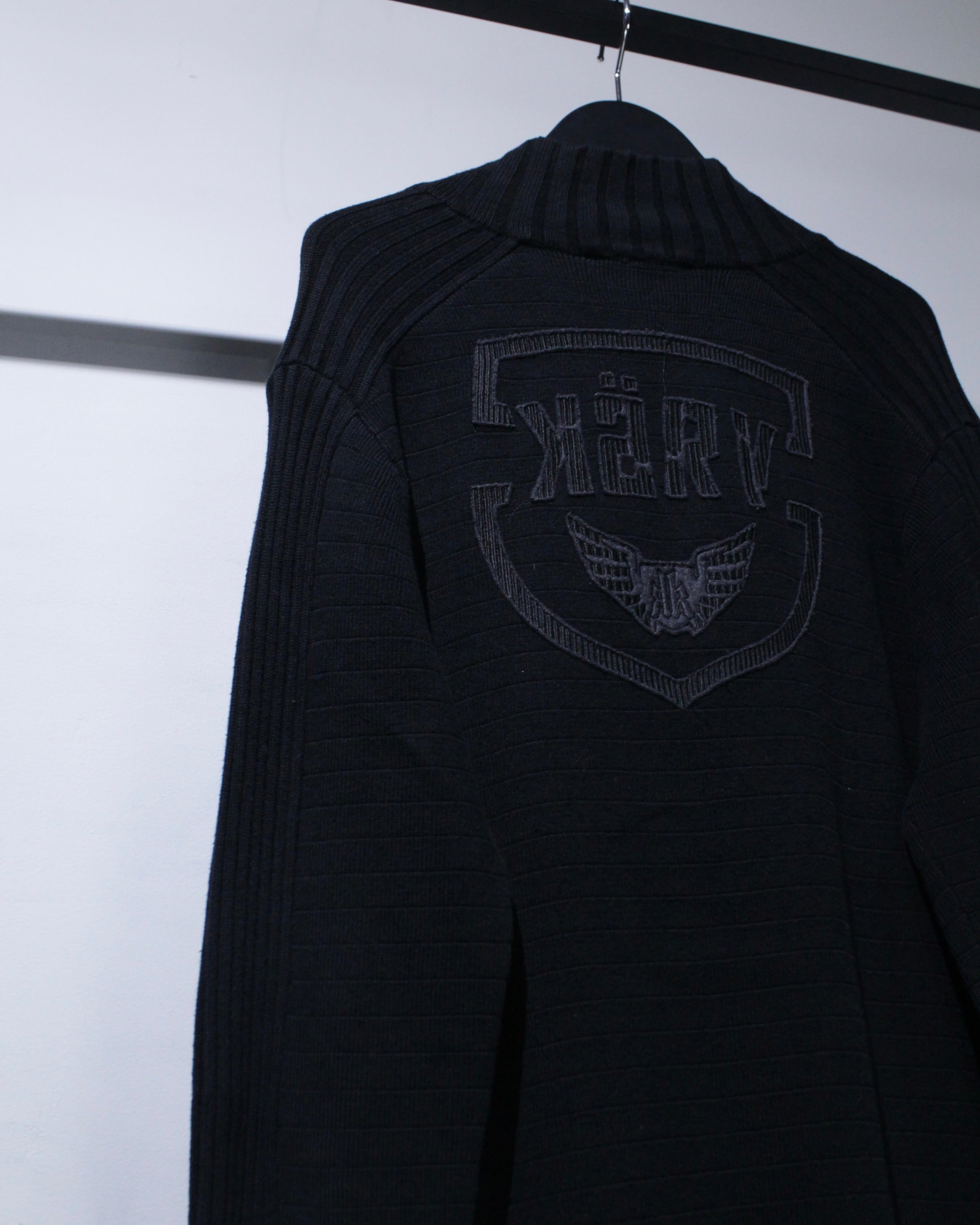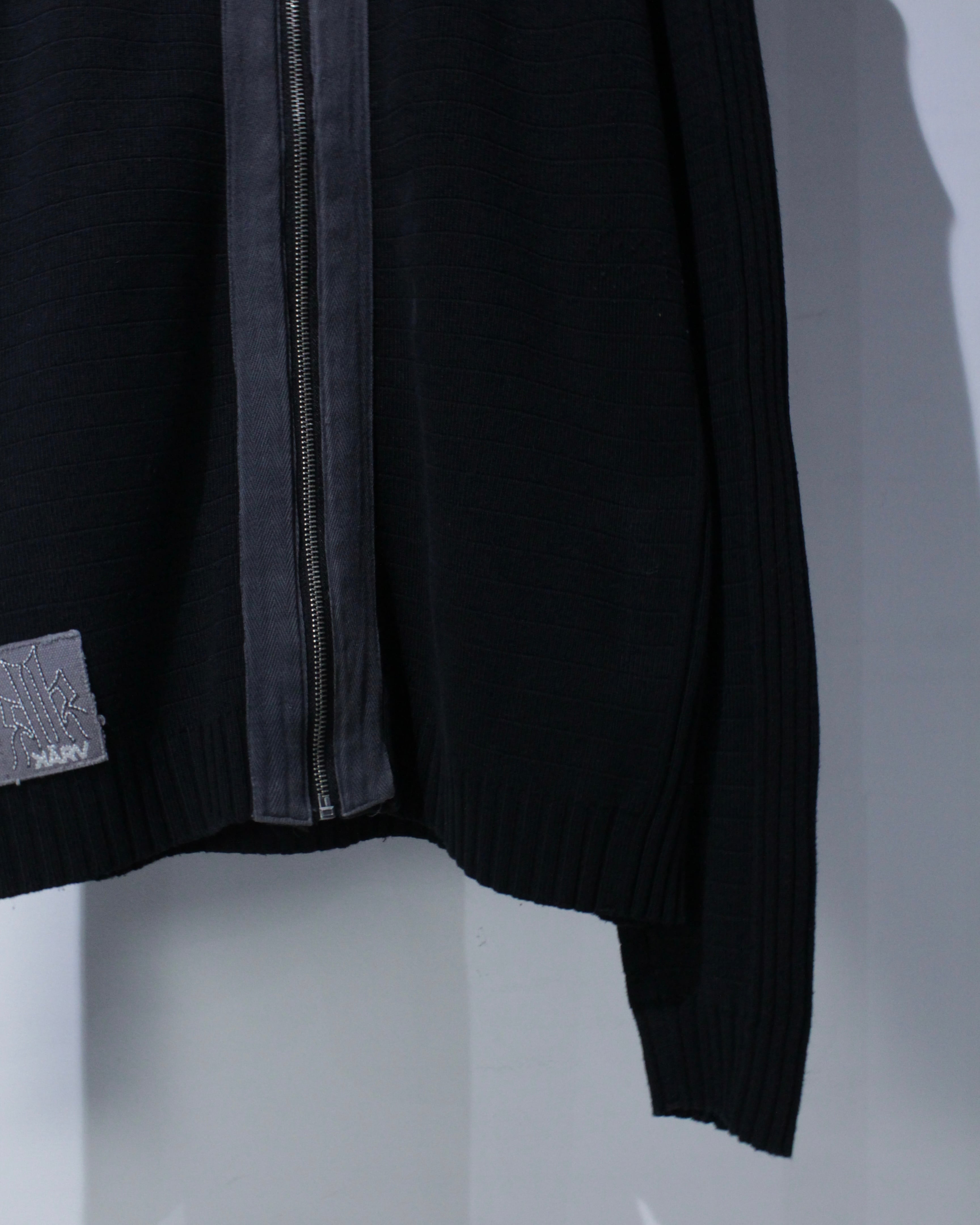 ボディには畝感のある肉厚ニット素材を採用し、ブラックを基調としたソリッドなカラーリングに、異素材で切り替えられたフロントジップのヘリンボーンテープがアクセントとして効いています。