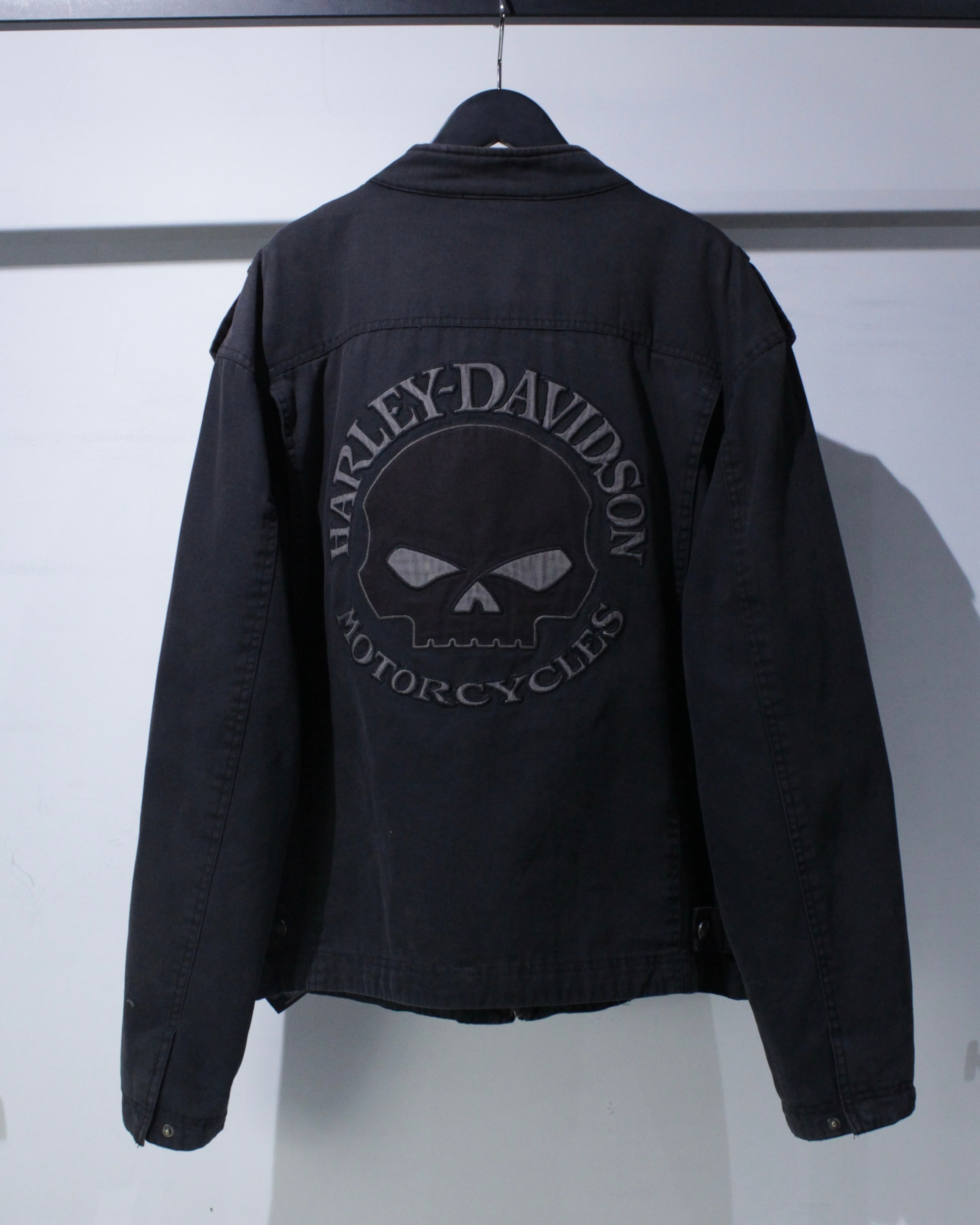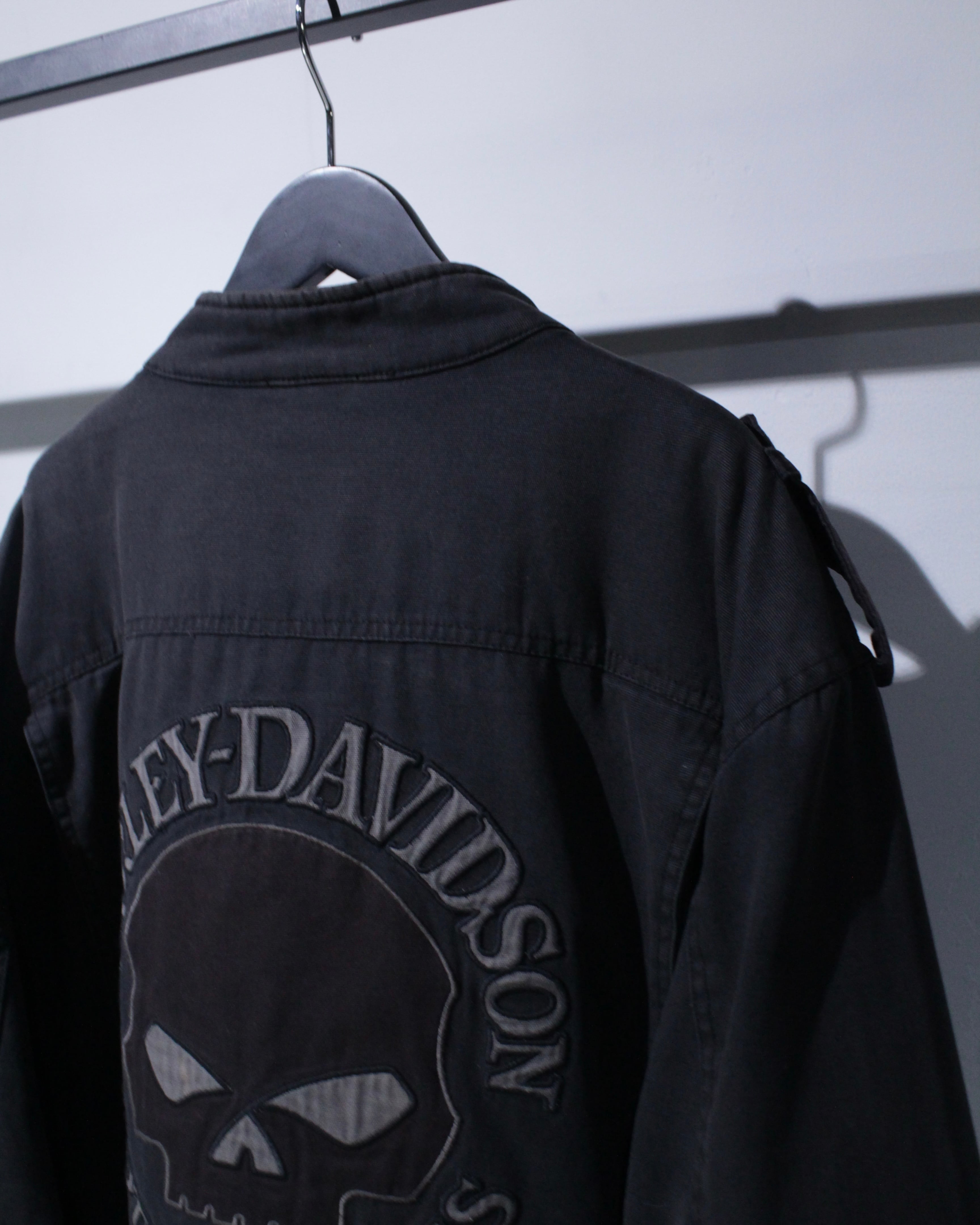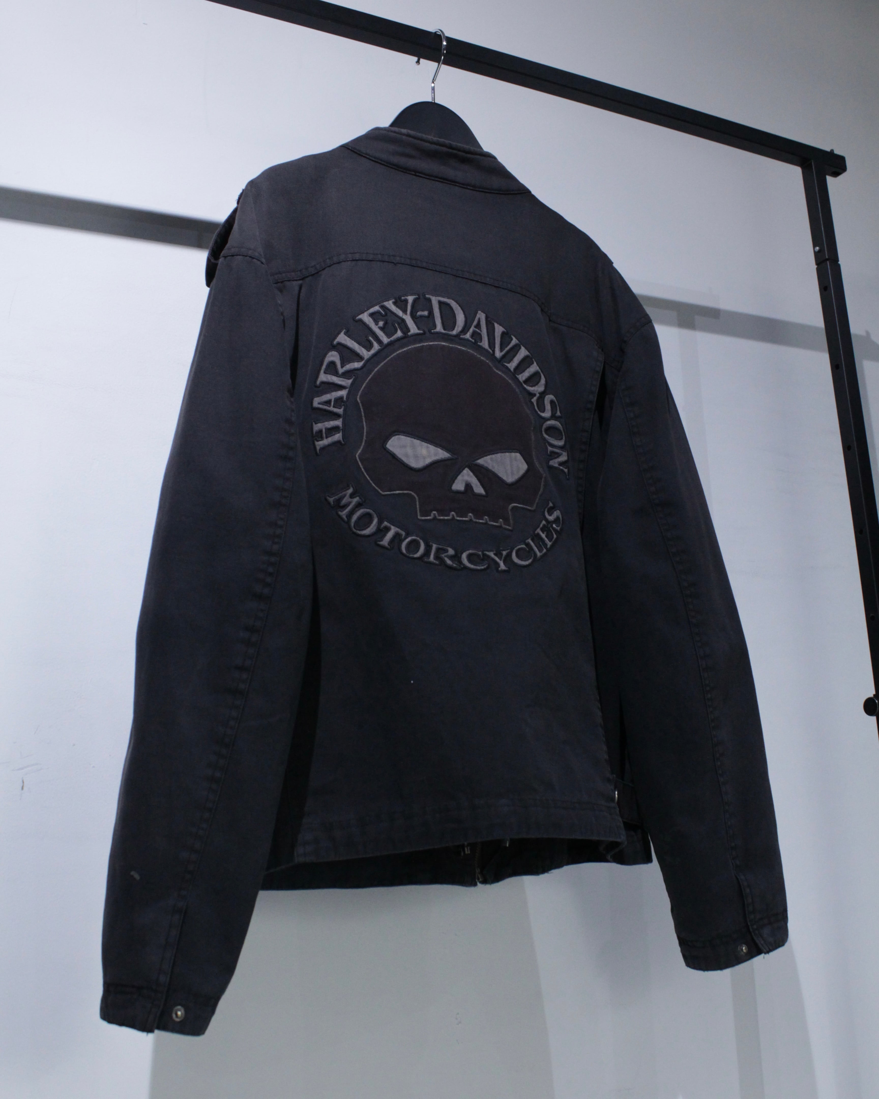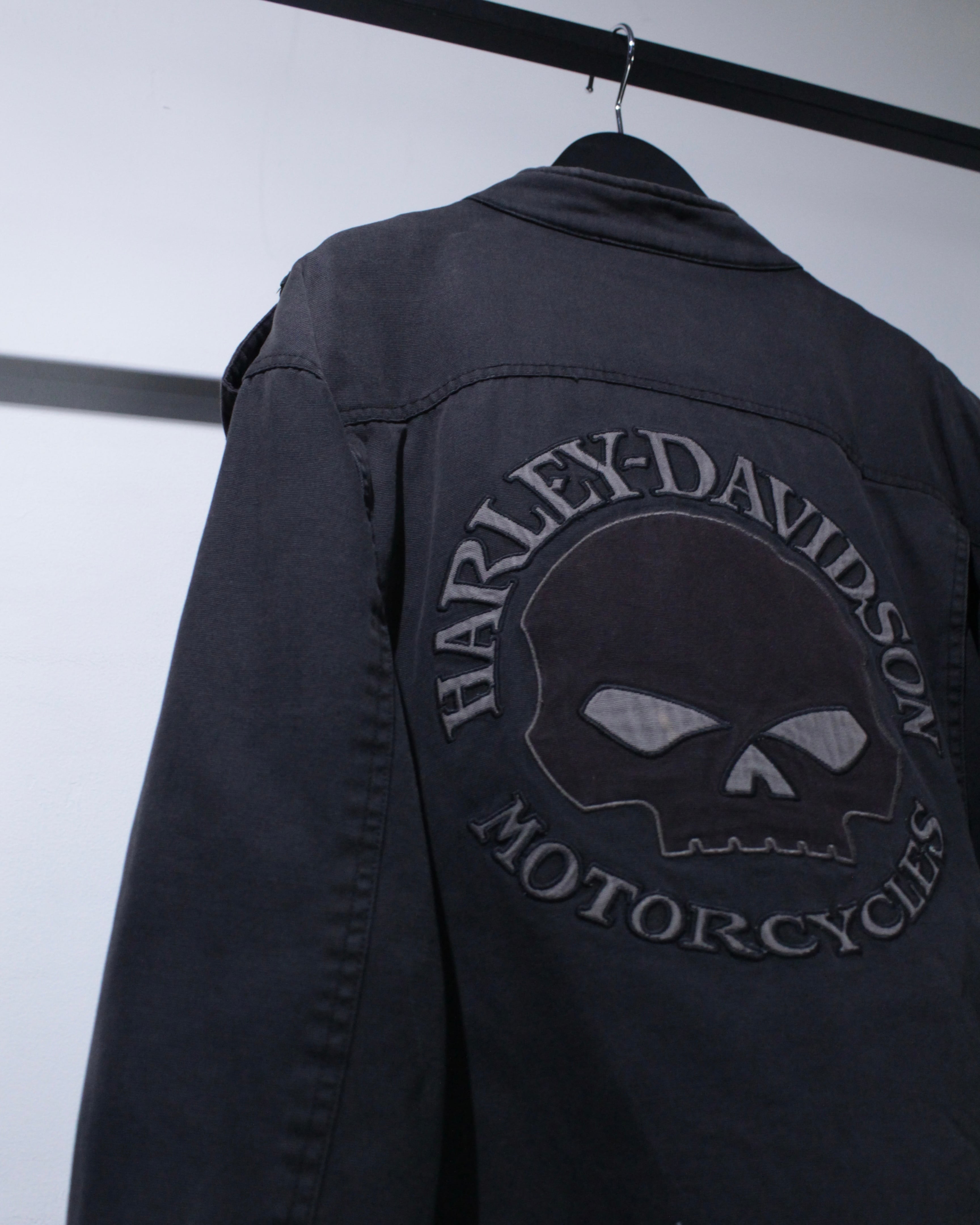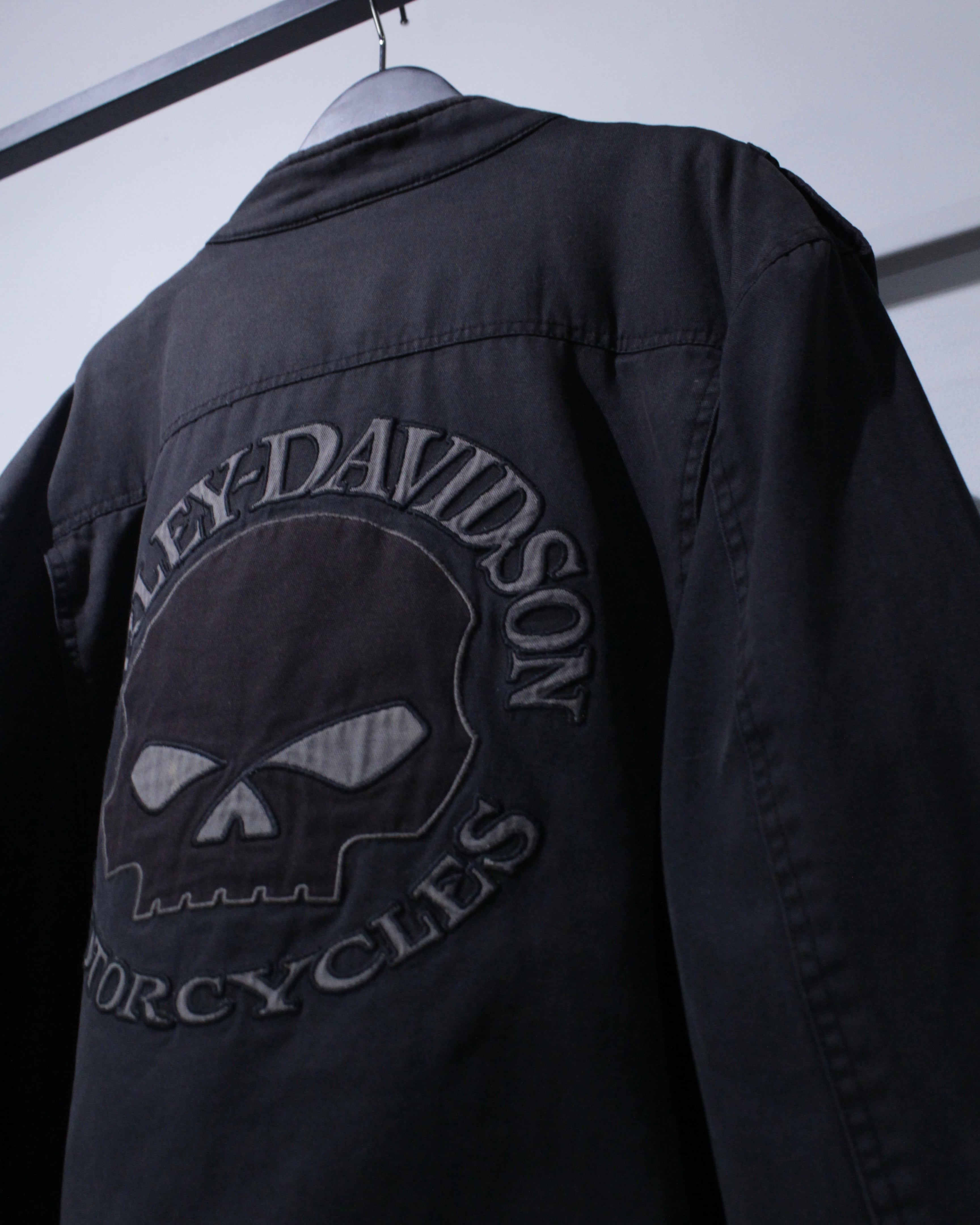 柔らかさとタフさを兼ね備えたコットンボディをベースに、ライダースらしいシングル仕様を採用。背面にはハーレーを象徴するスカルモチーフを大胆に配し、無骨さとアイコニックなムードを両立した1着に仕上がっています。