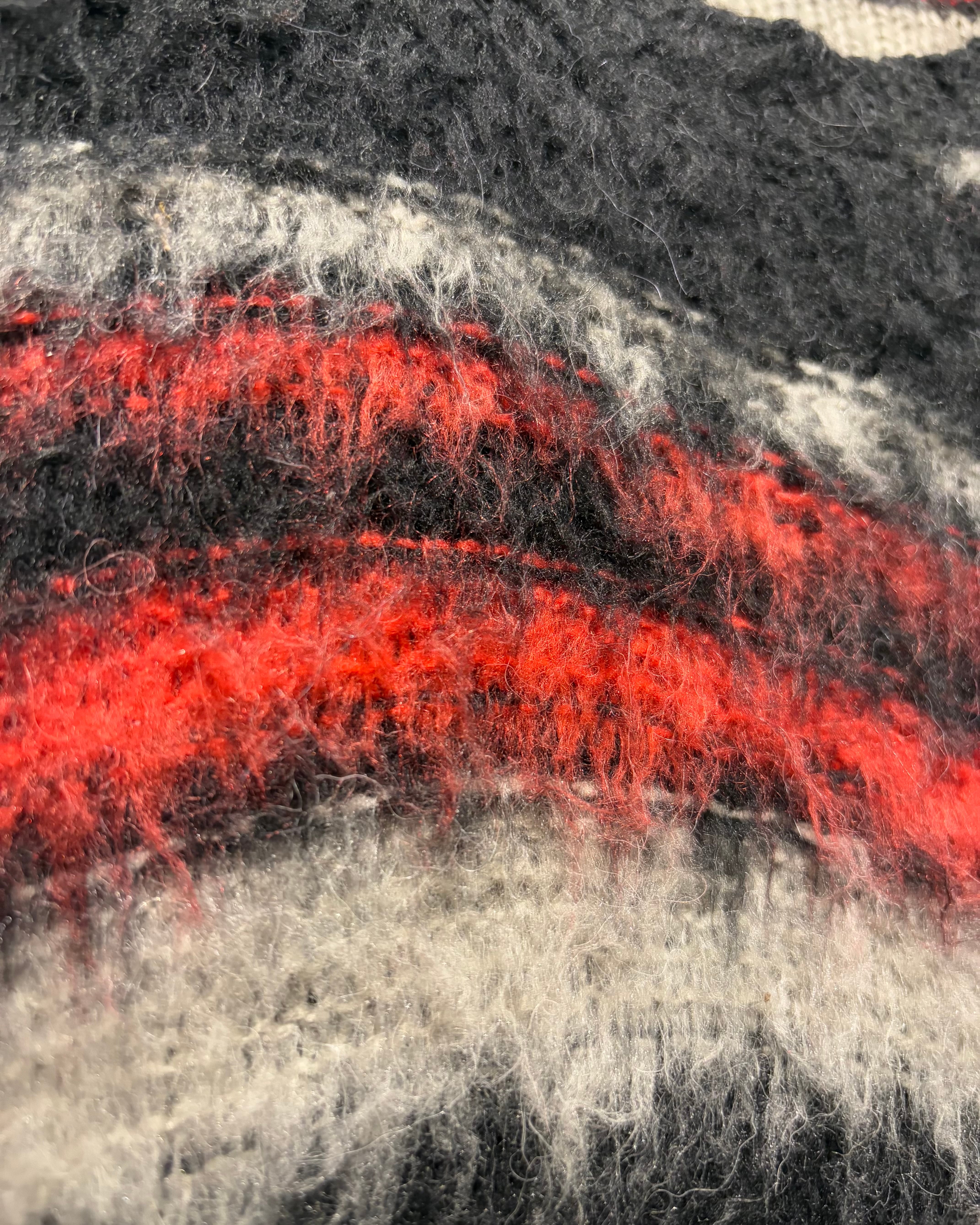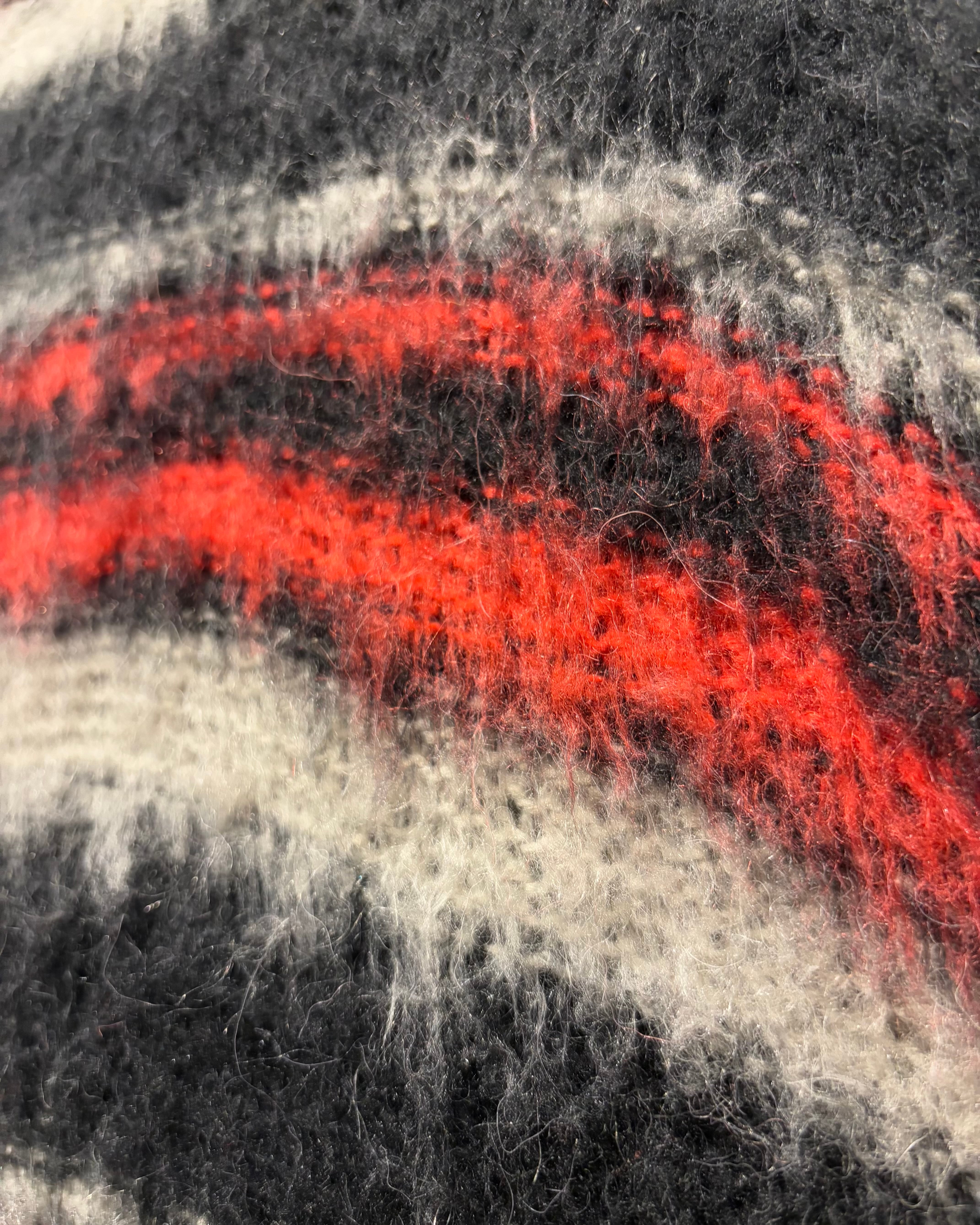 ブラックをベースに、グレー、レッドを差し込んだボーダーの1着。色数を抑えながらもコントラストの効いた配色により、単体でもしっかりと存在感を放っています。
