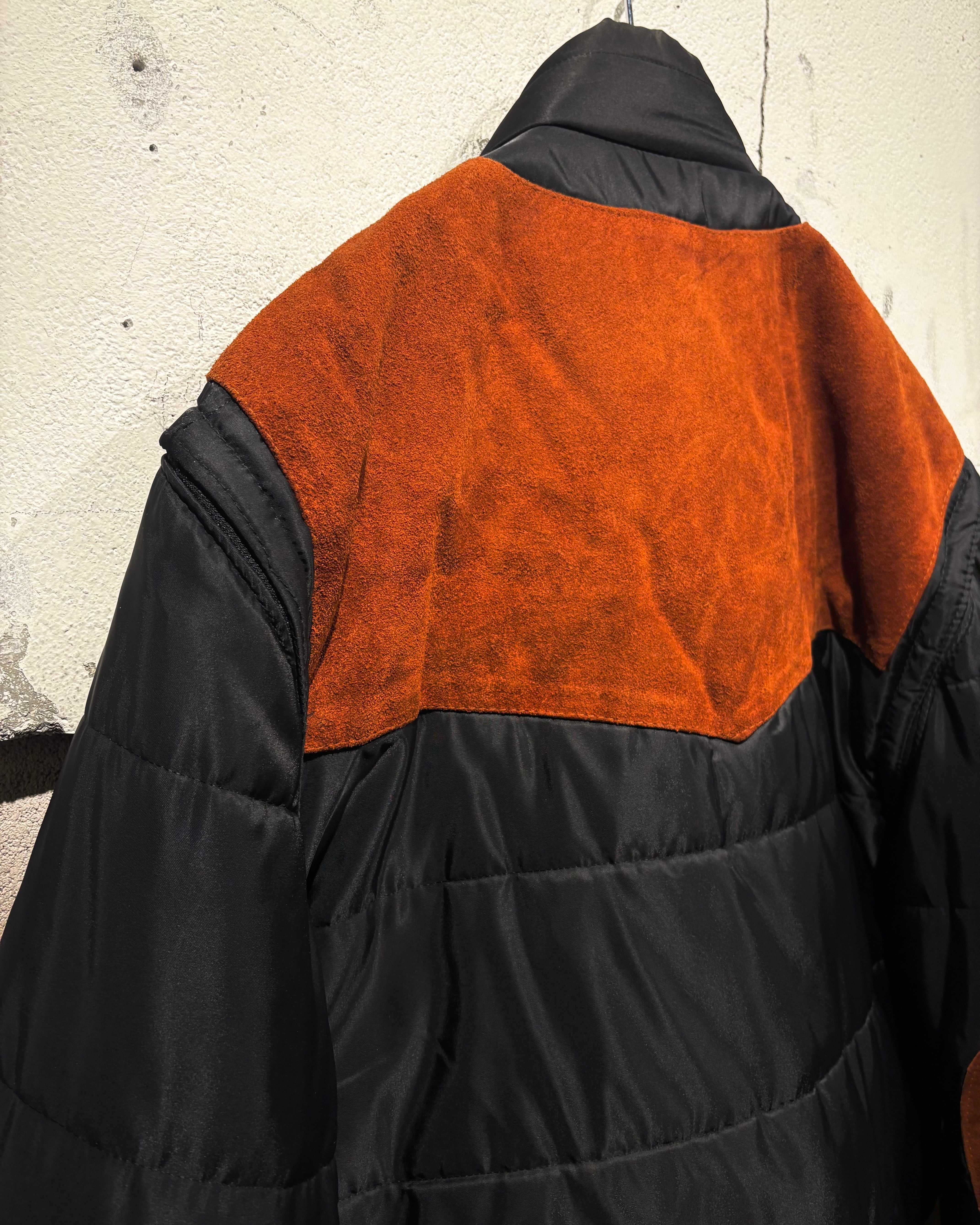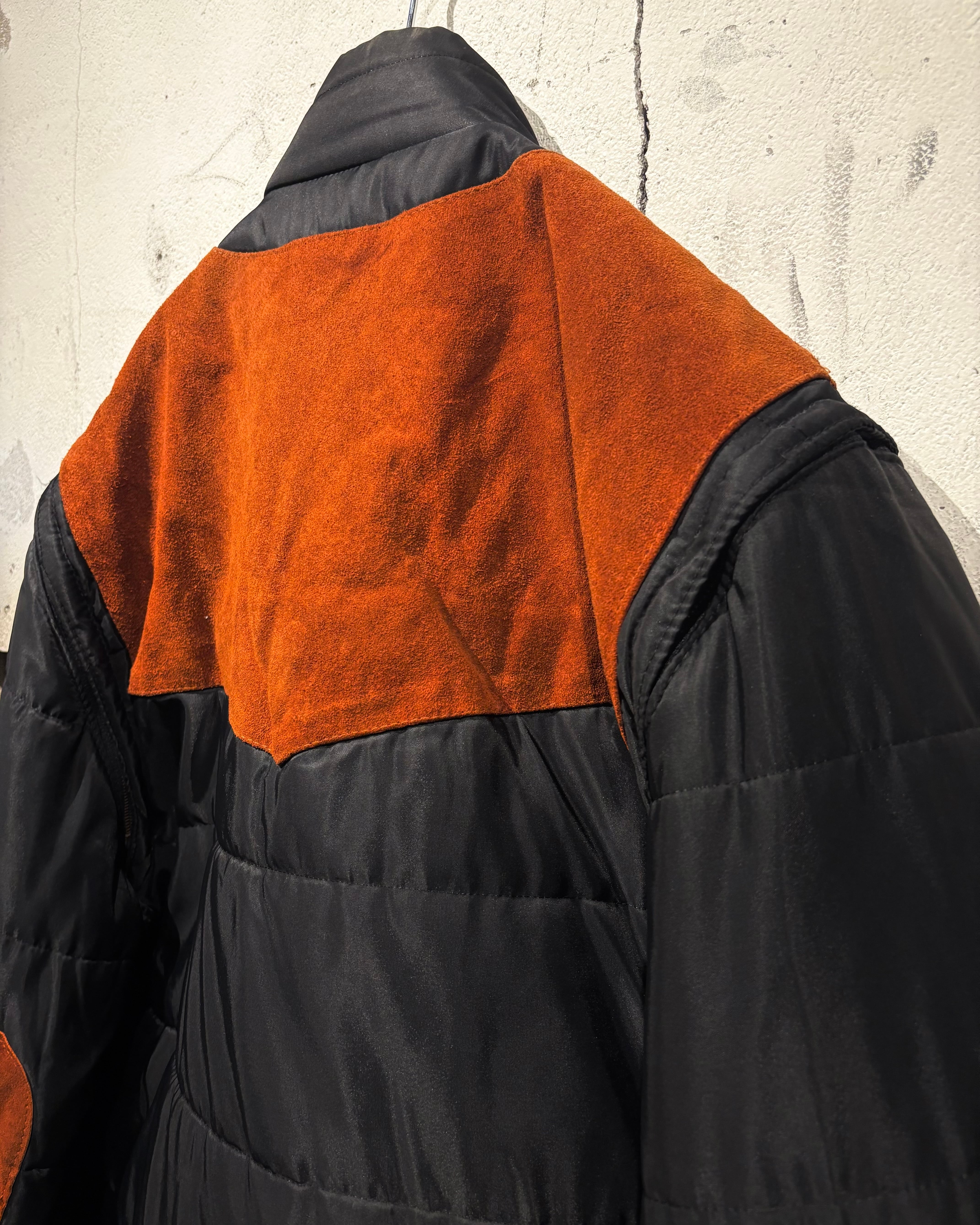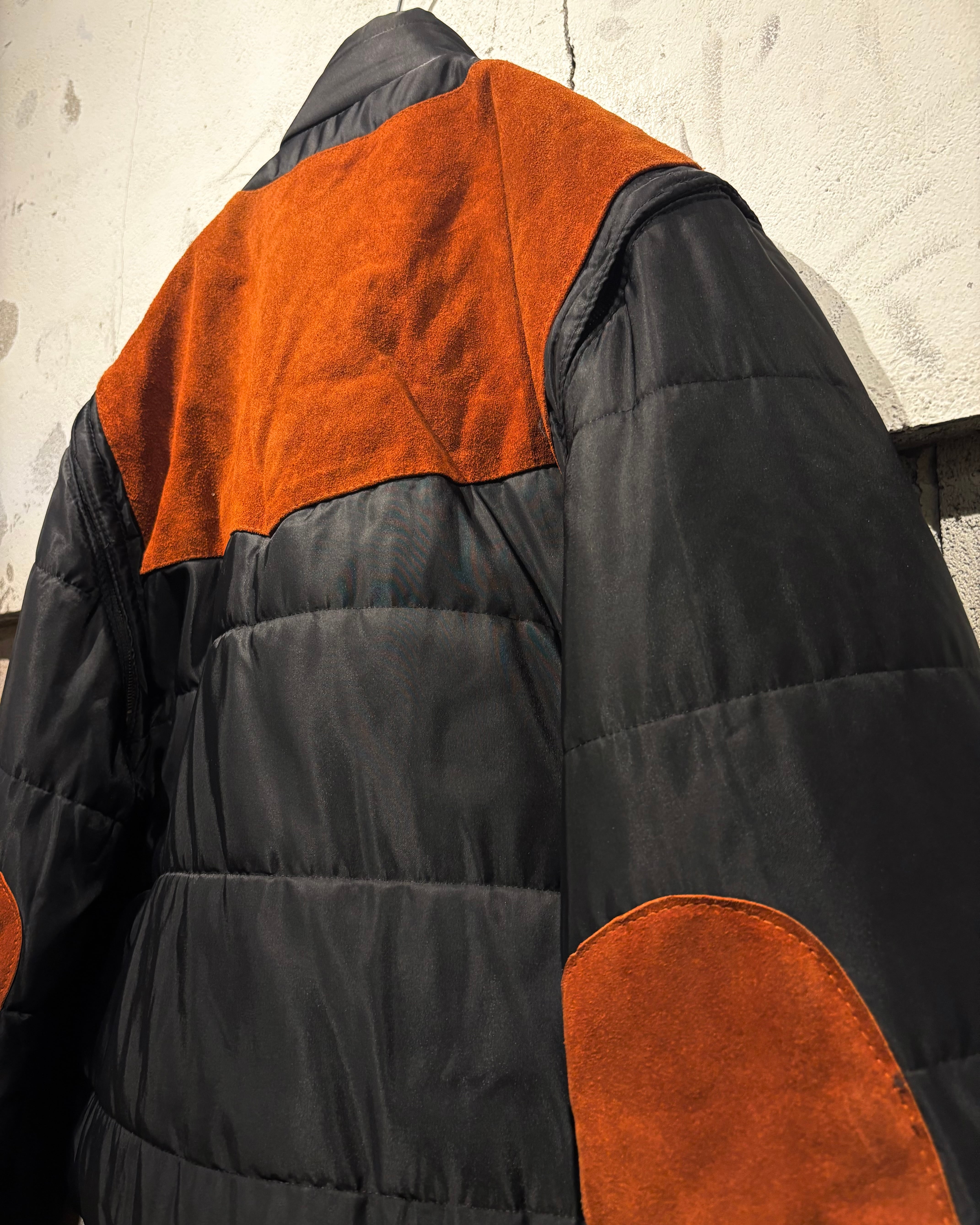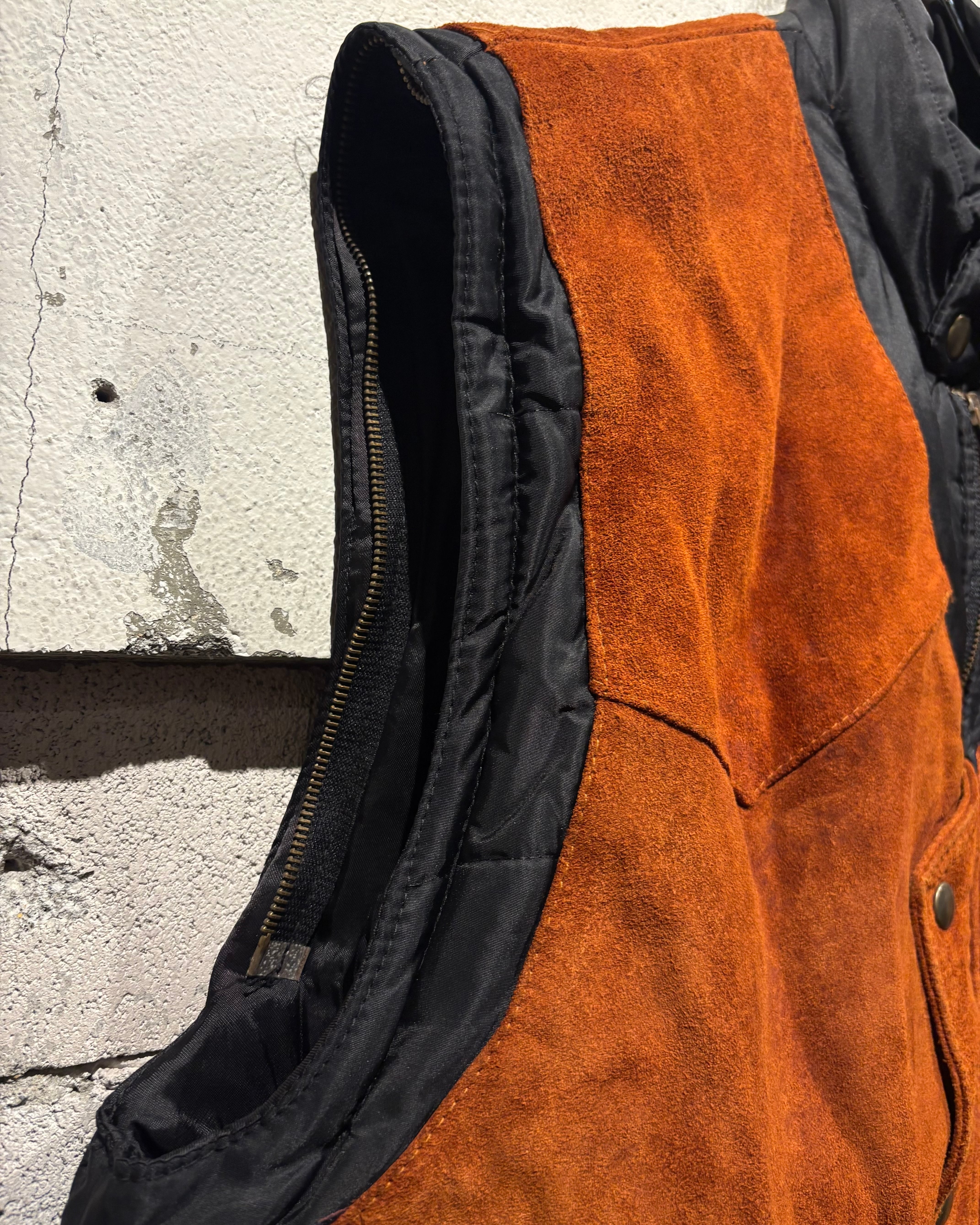 ベースはブラックのナイロンボディ。その上に、ブラウンのスエードレザーベストを重ね着したかのようなデザインで、異素材のコントラストが非常に印象的な1着です。
