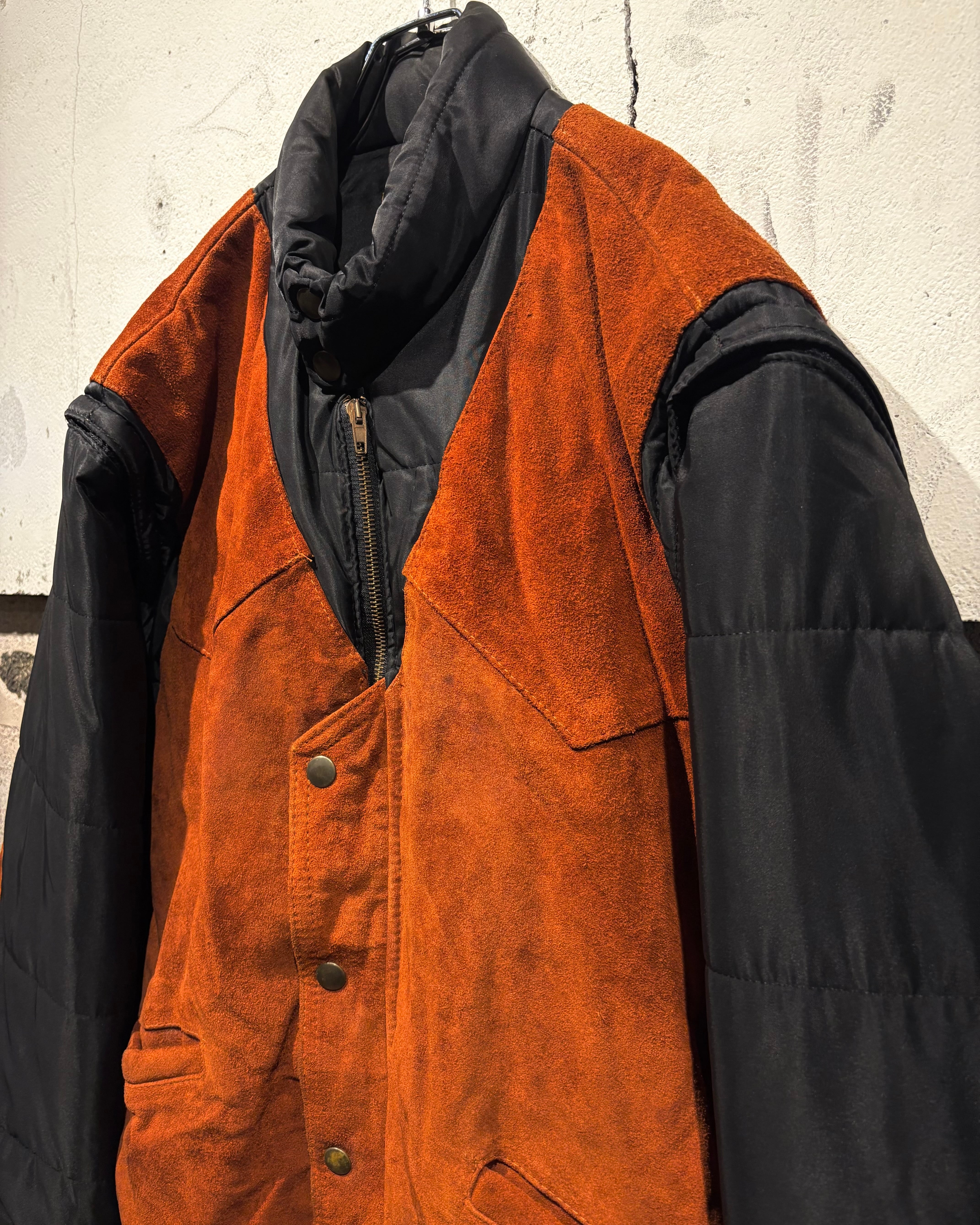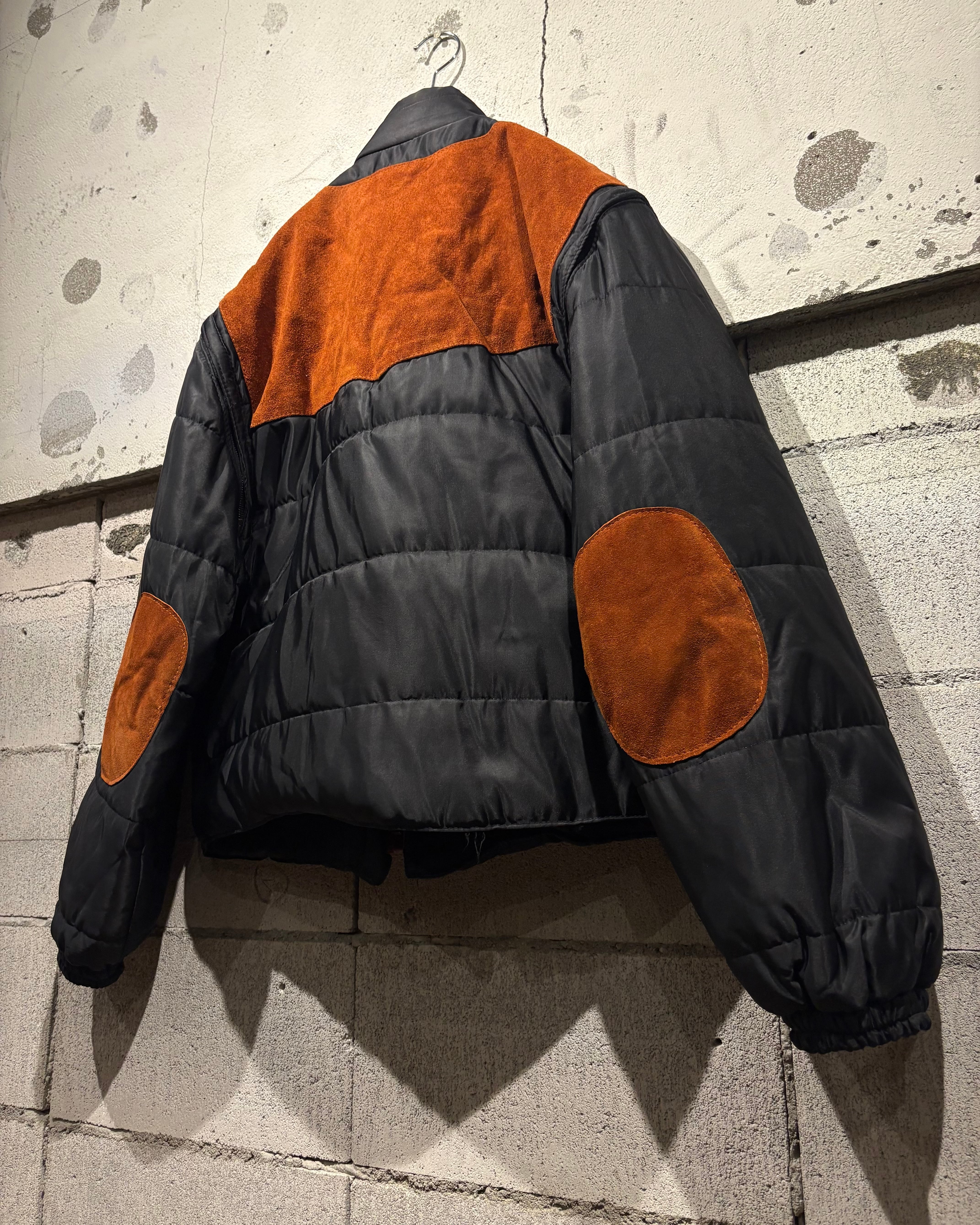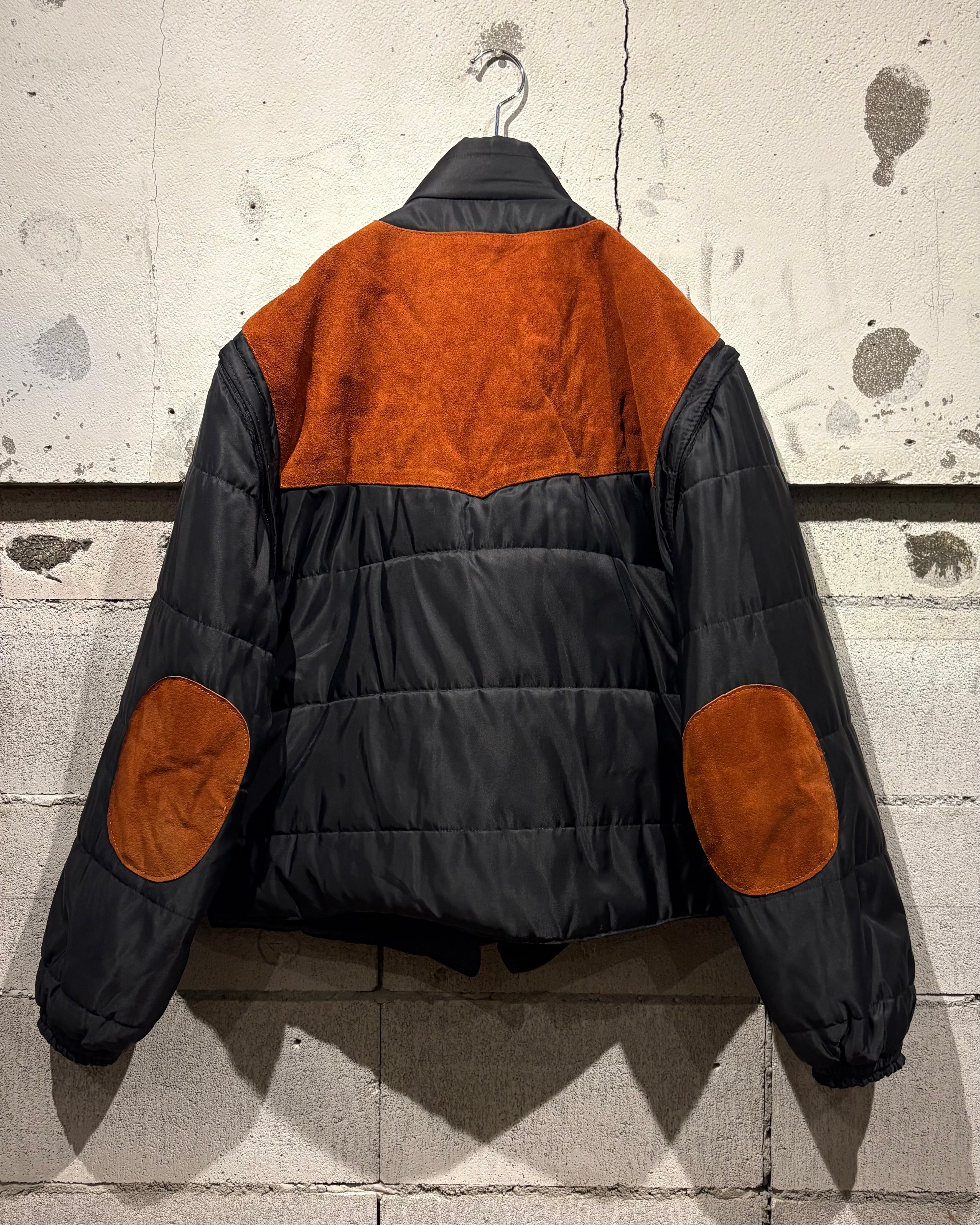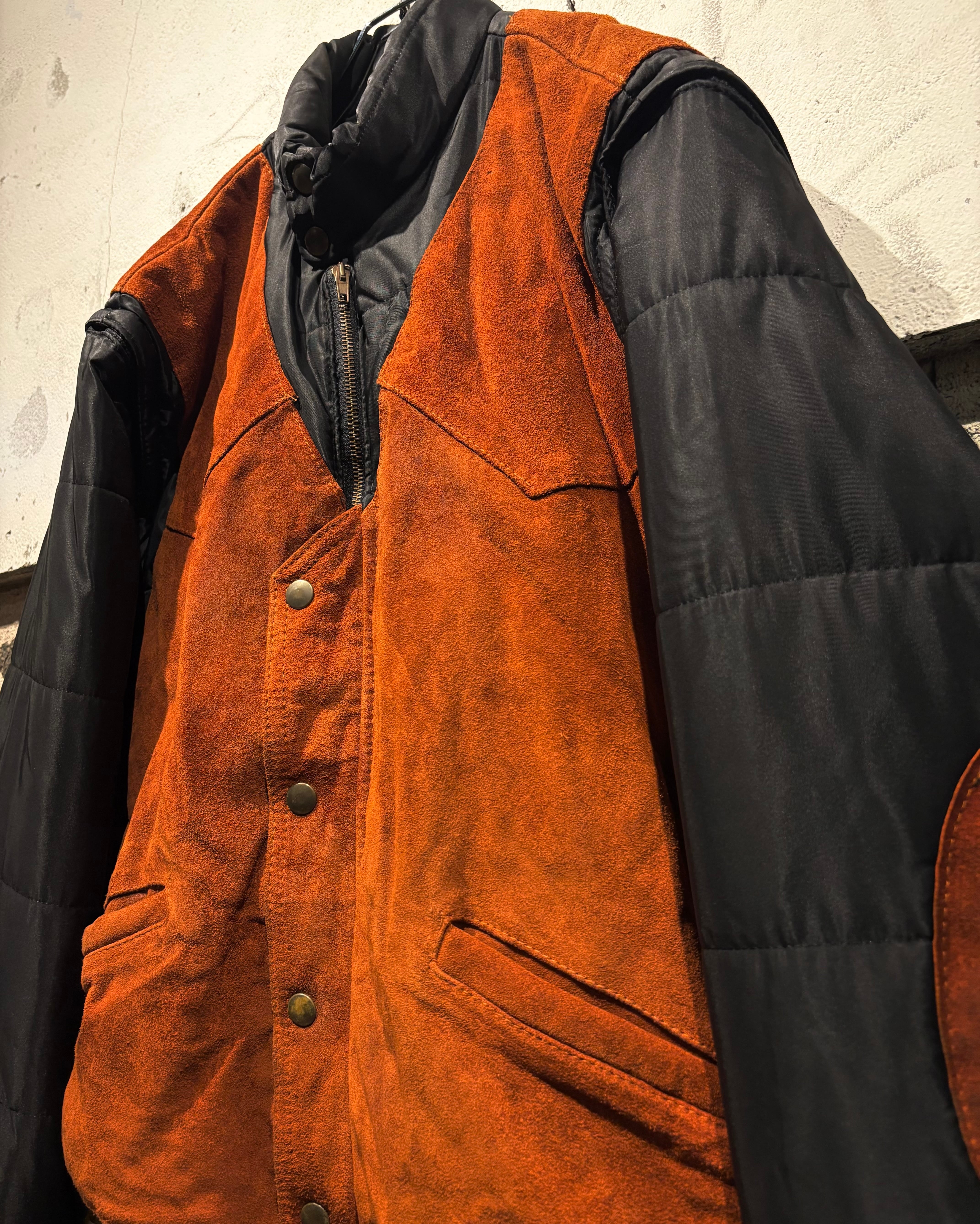 ベースはブラックのナイロンボディ。その上に、ブラウンのスエードレザーベストを重ね着したかのようなデザインで、異素材のコントラストが非常に印象的な1着です。