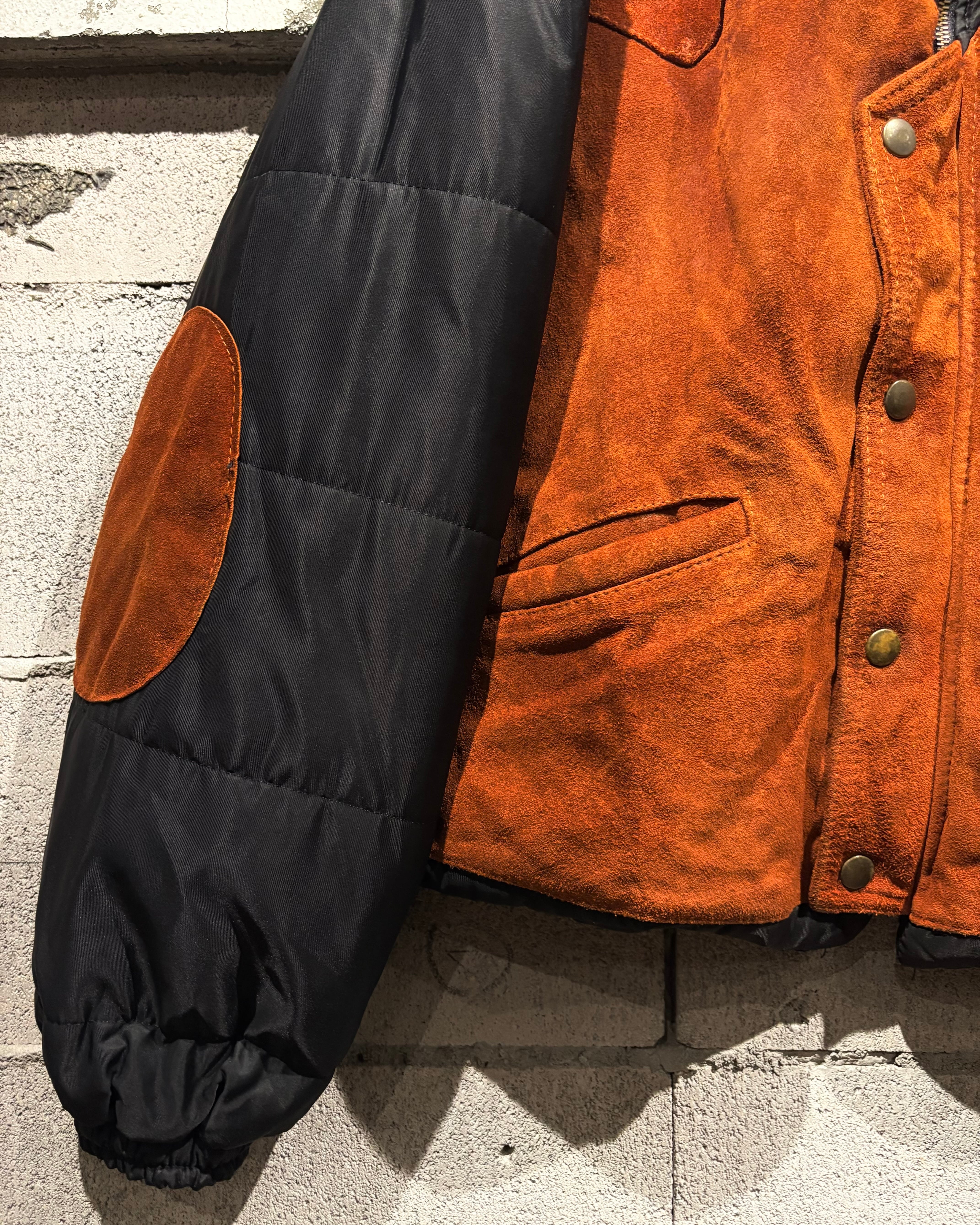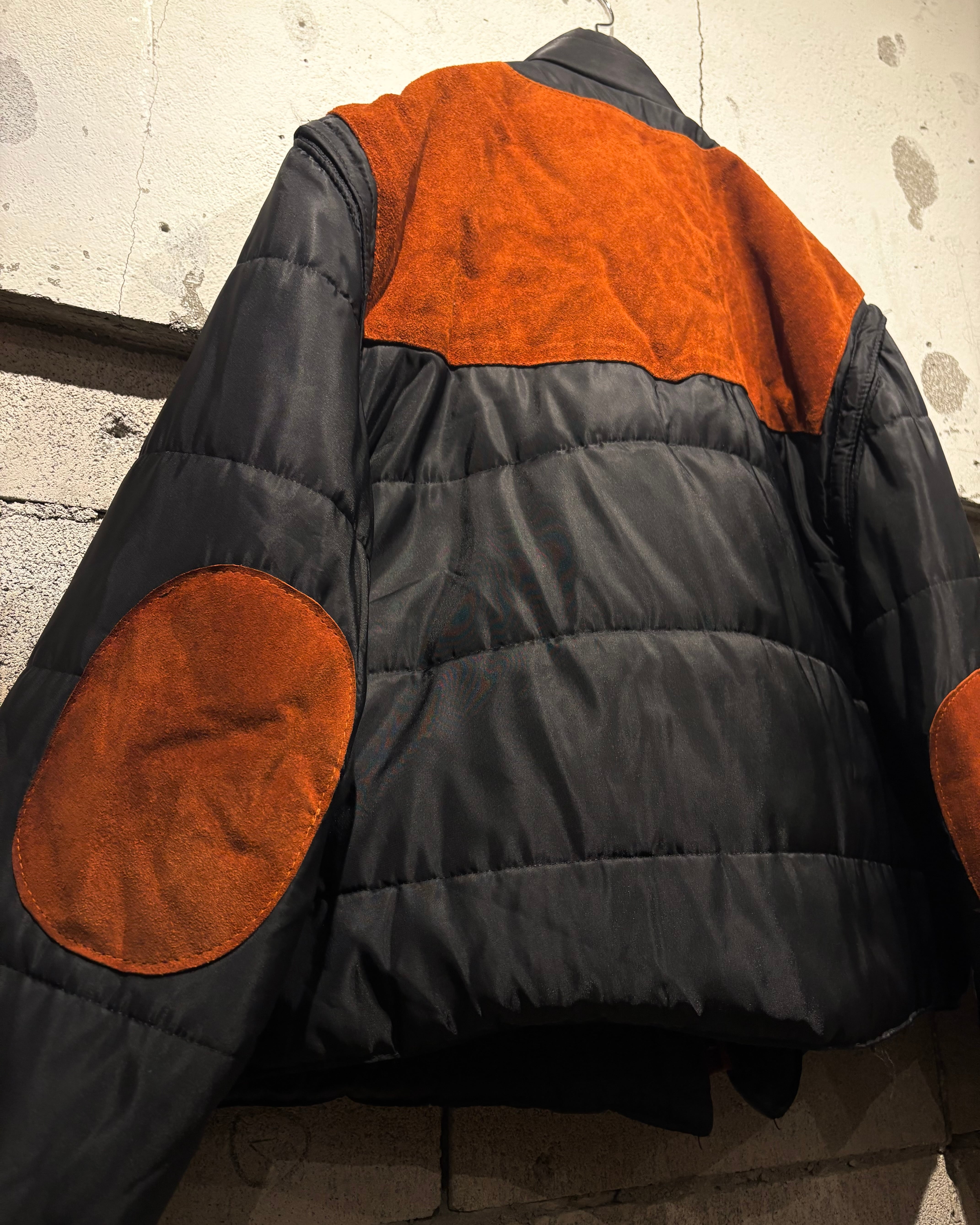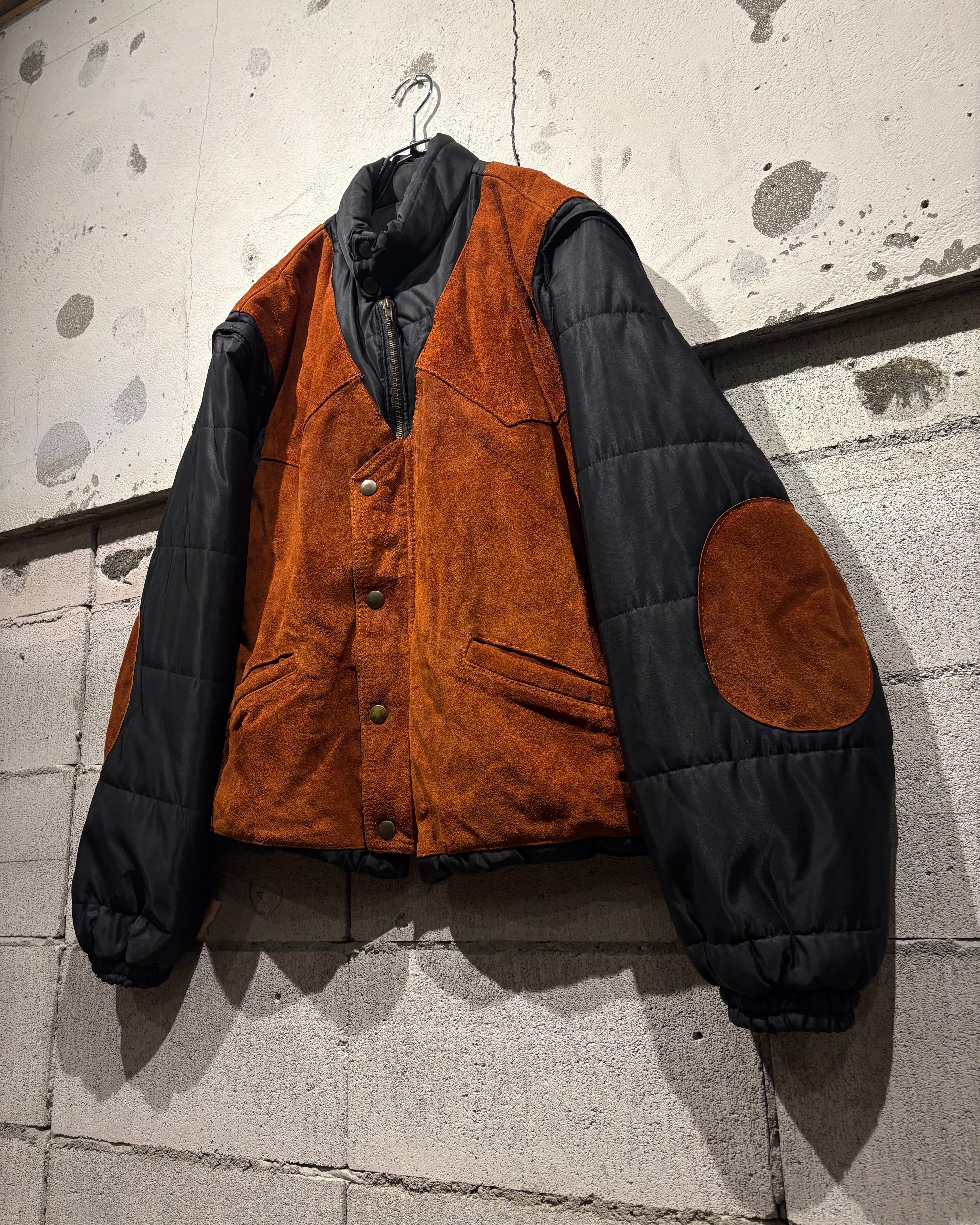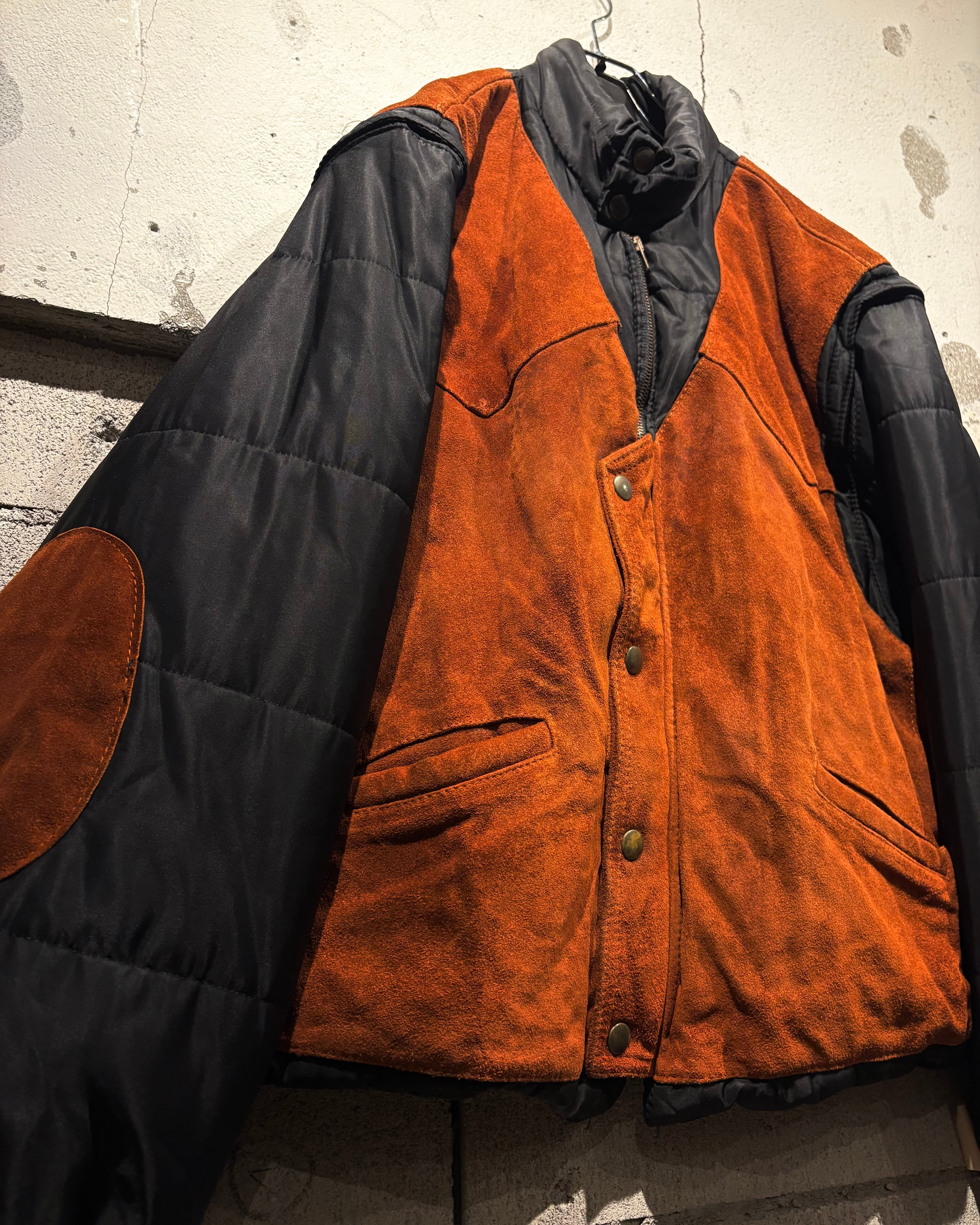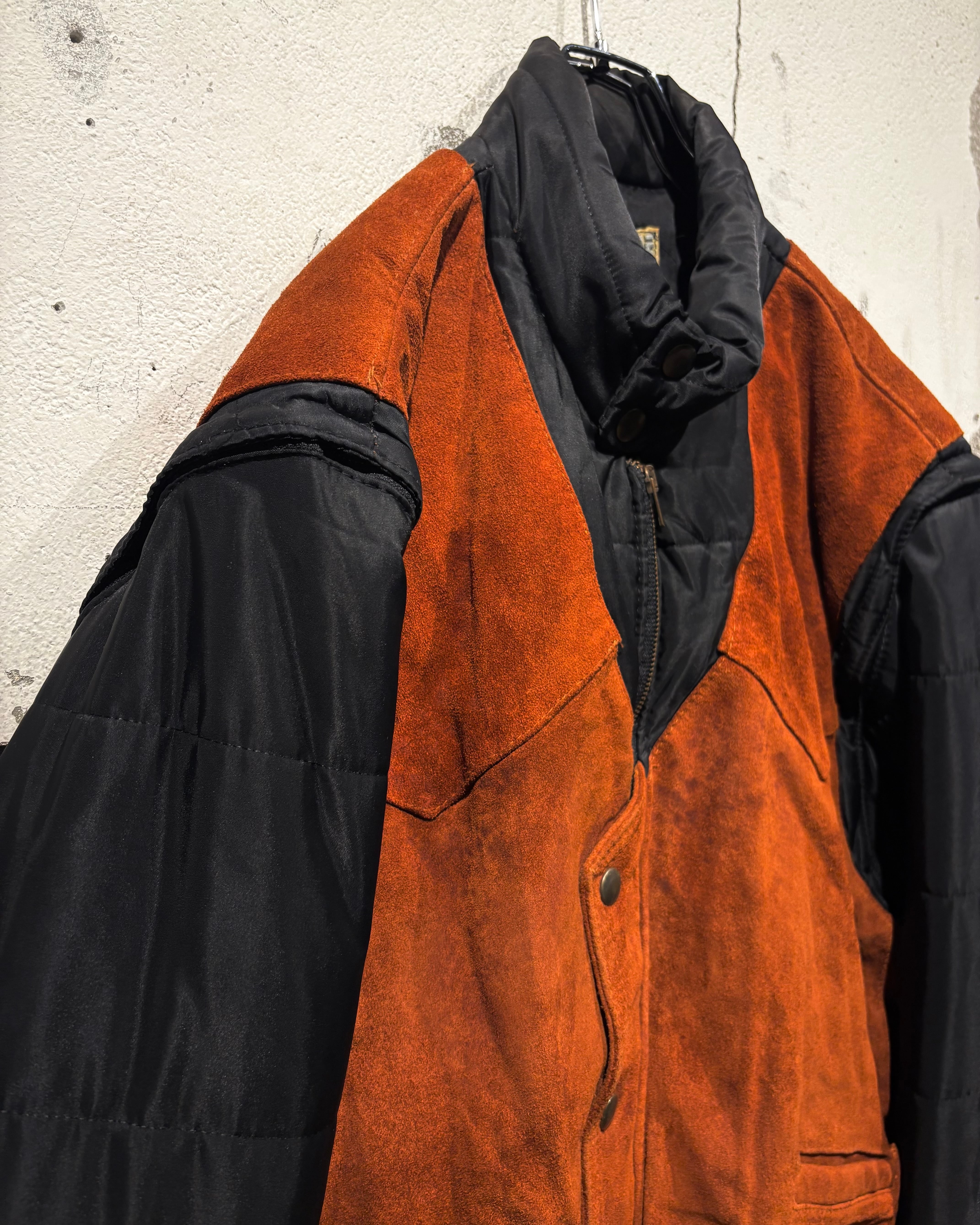ベースはブラックのナイロンボディ。その上に、ブラウンのスエードレザーベストを重ね着したかのようなデザインで、異素材のコントラストが非常に印象的な1着です。