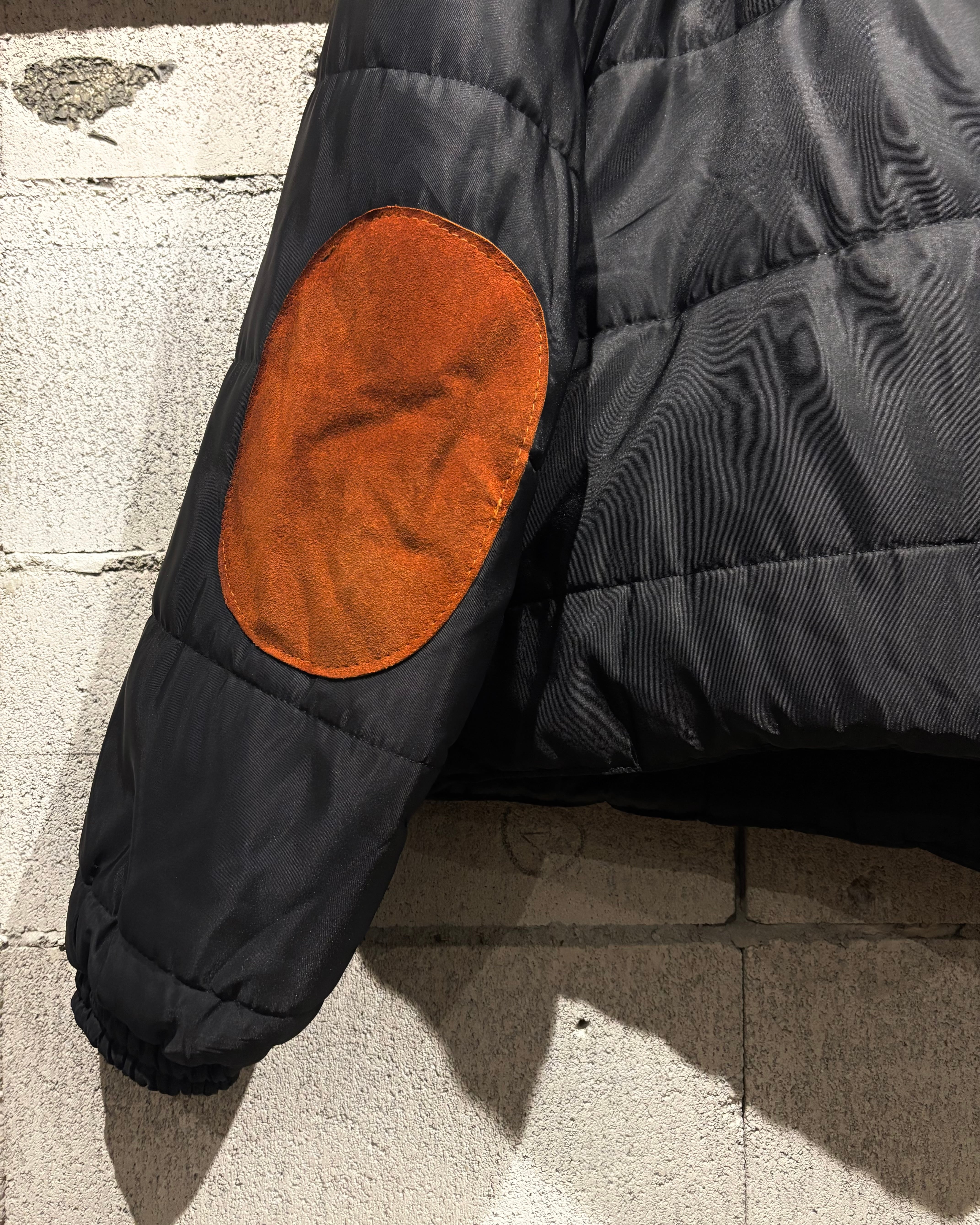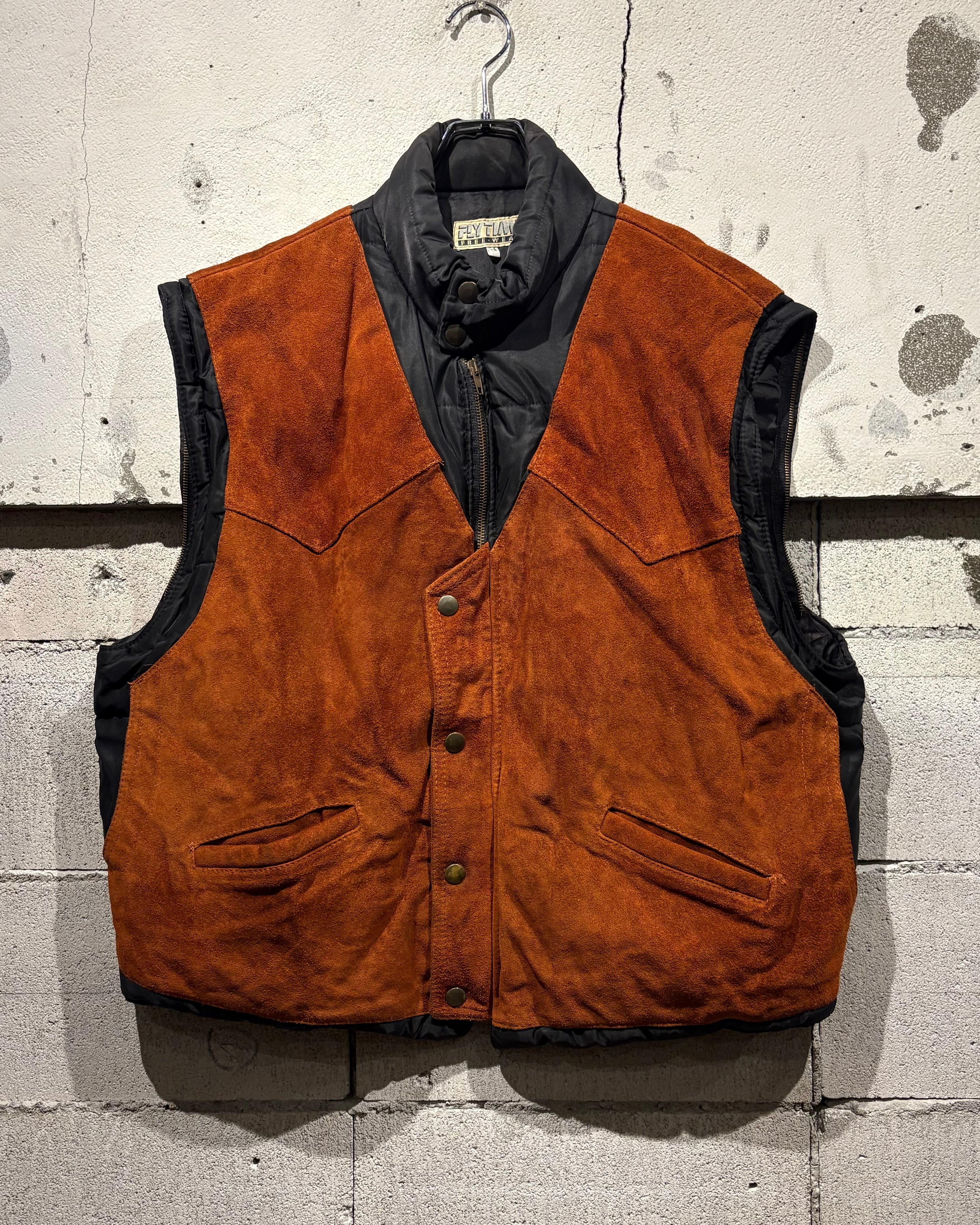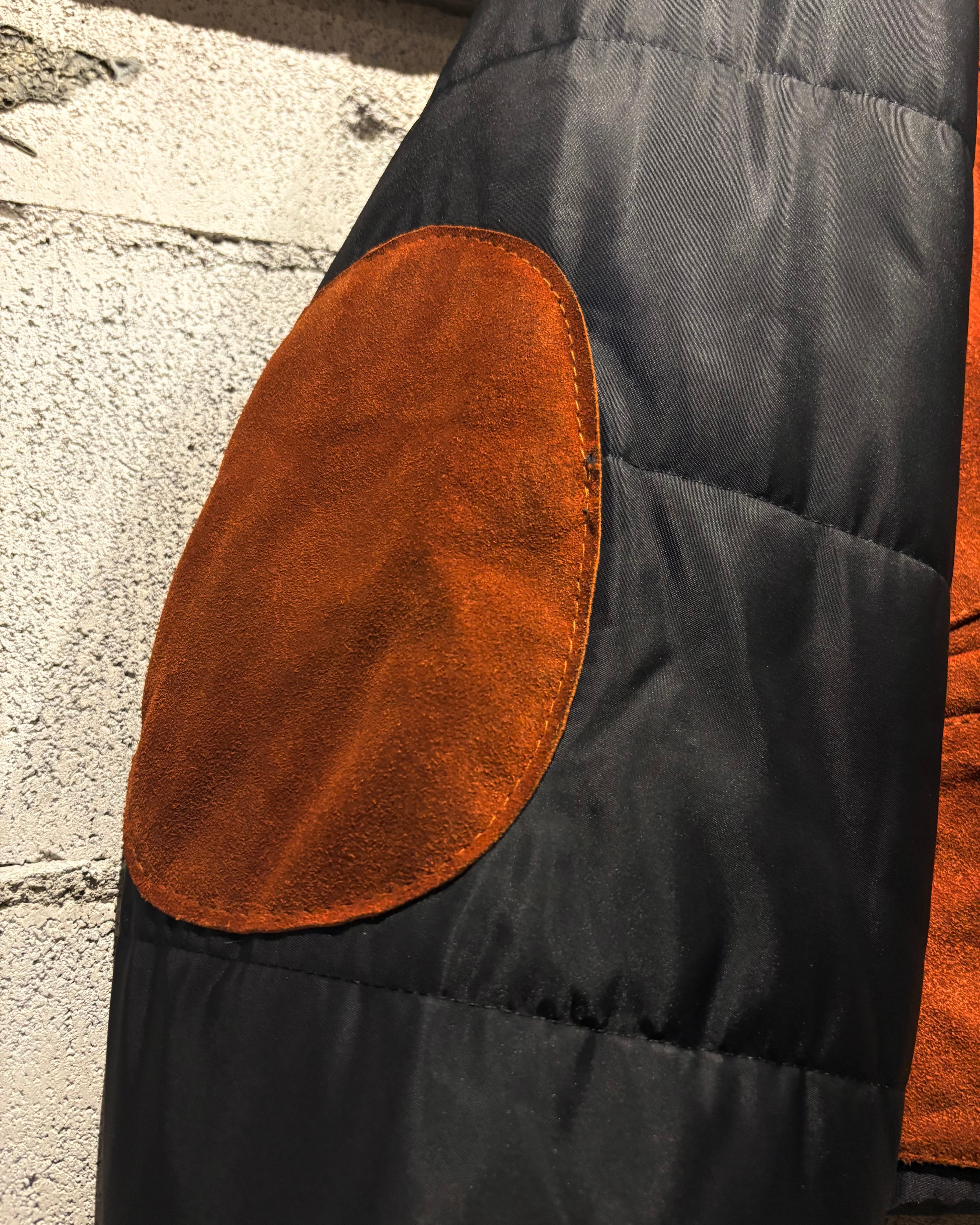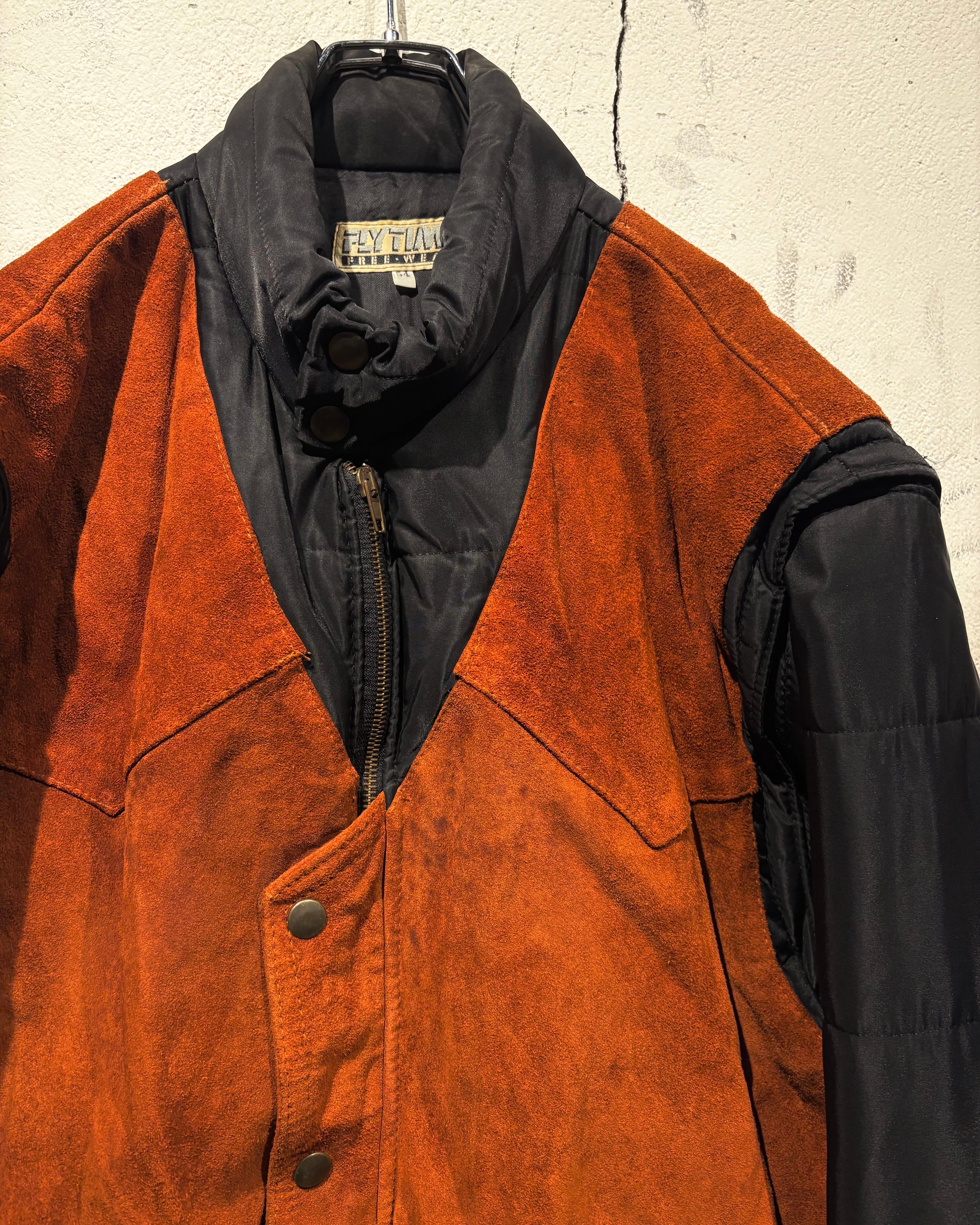 ベースはブラックのナイロンボディ。その上に、ブラウンのスエードレザーベストを重ね着したかのようなデザインで、異素材のコントラストが非常に印象的な1着です。