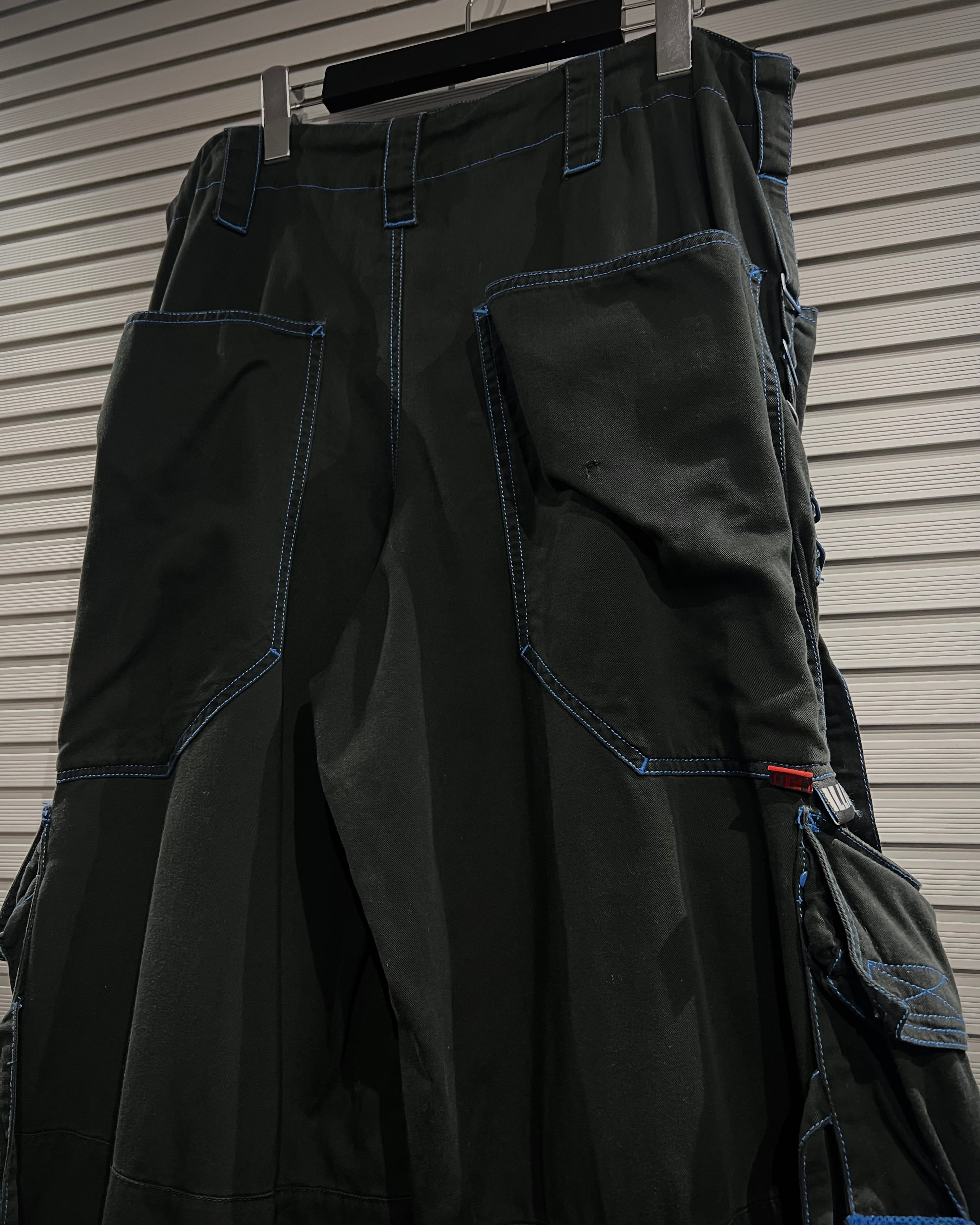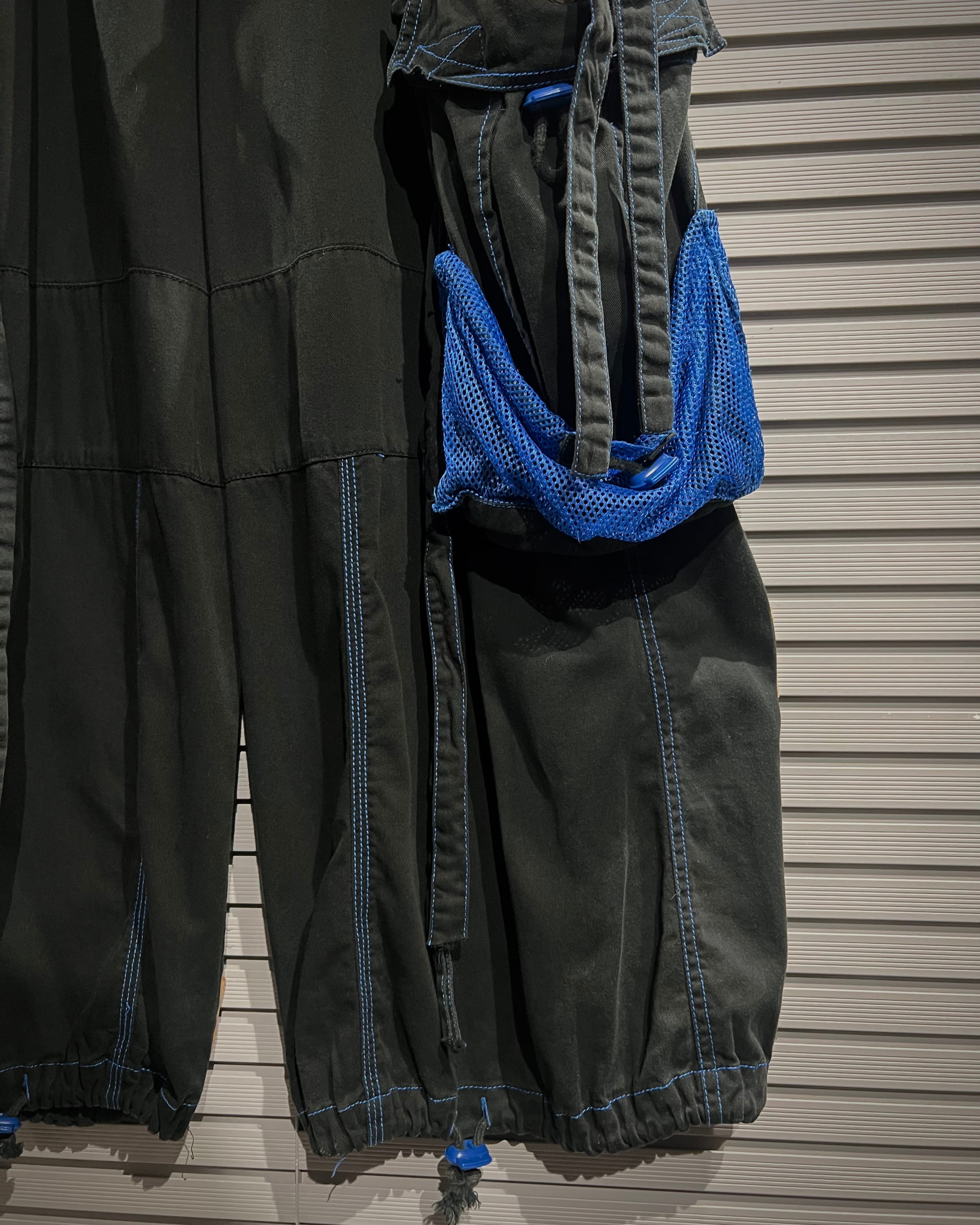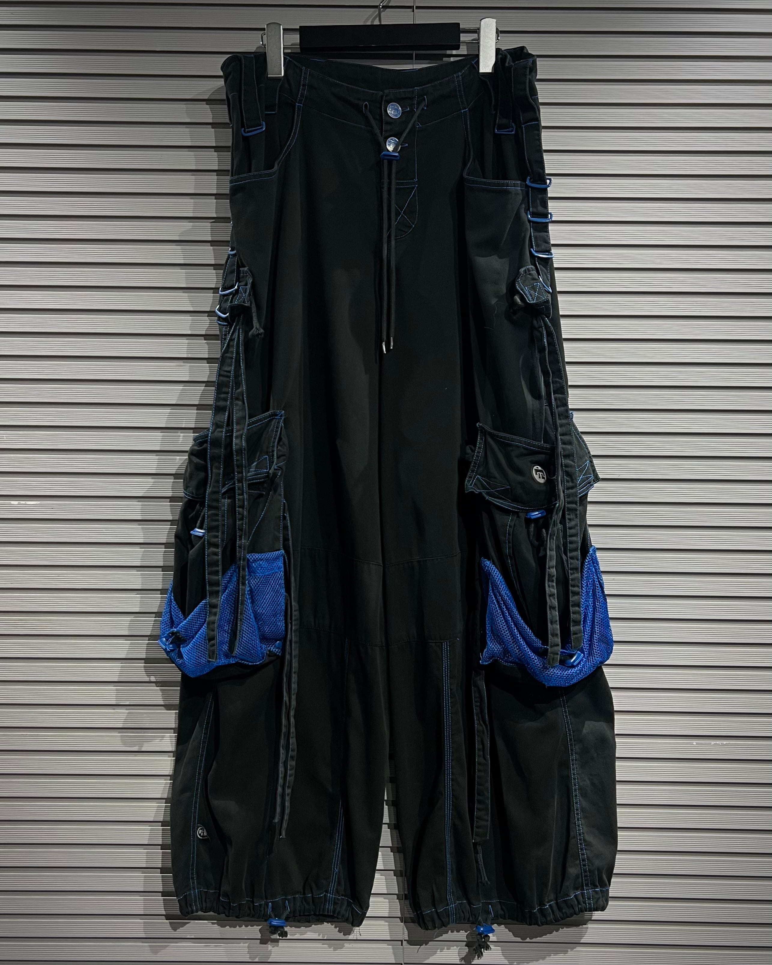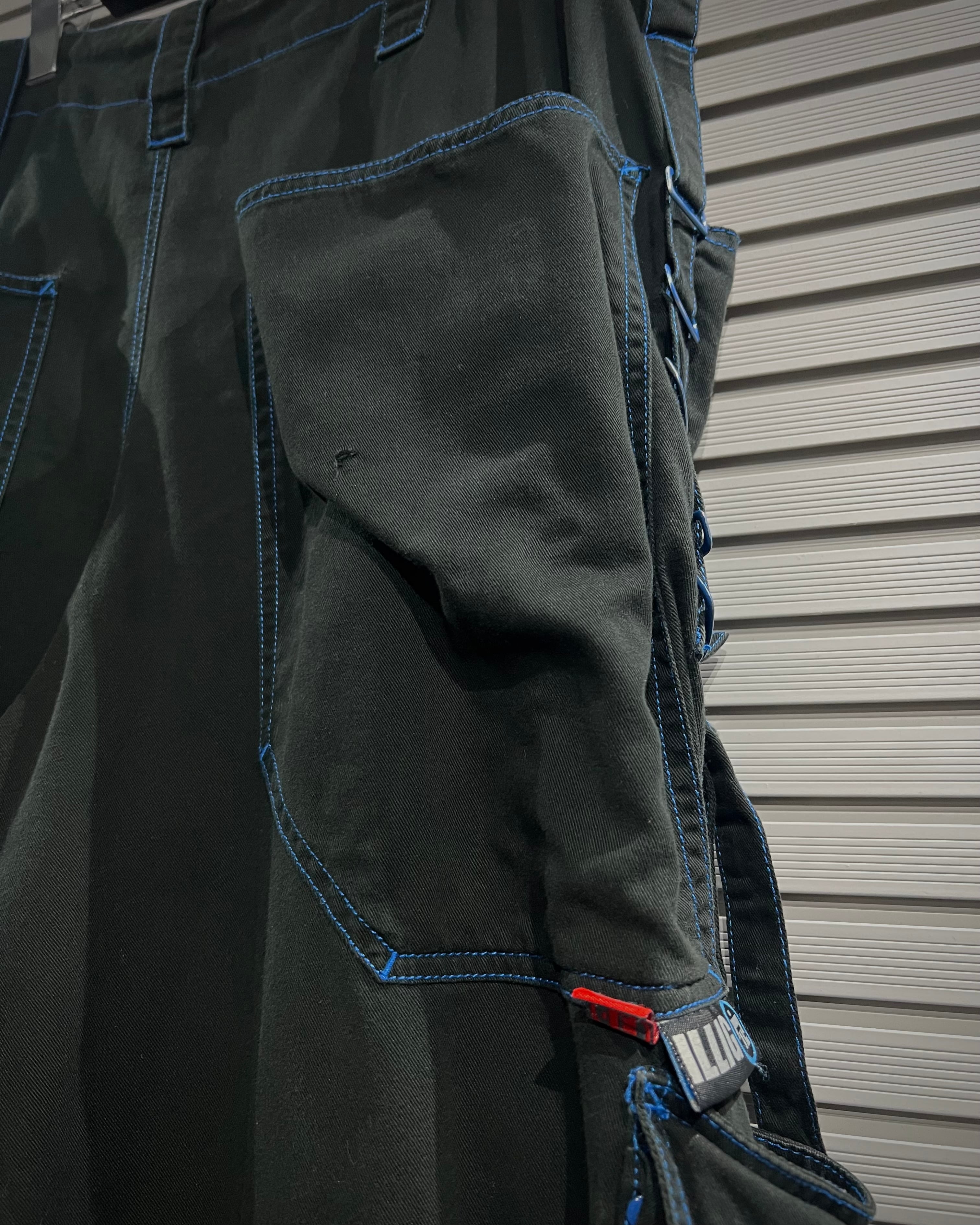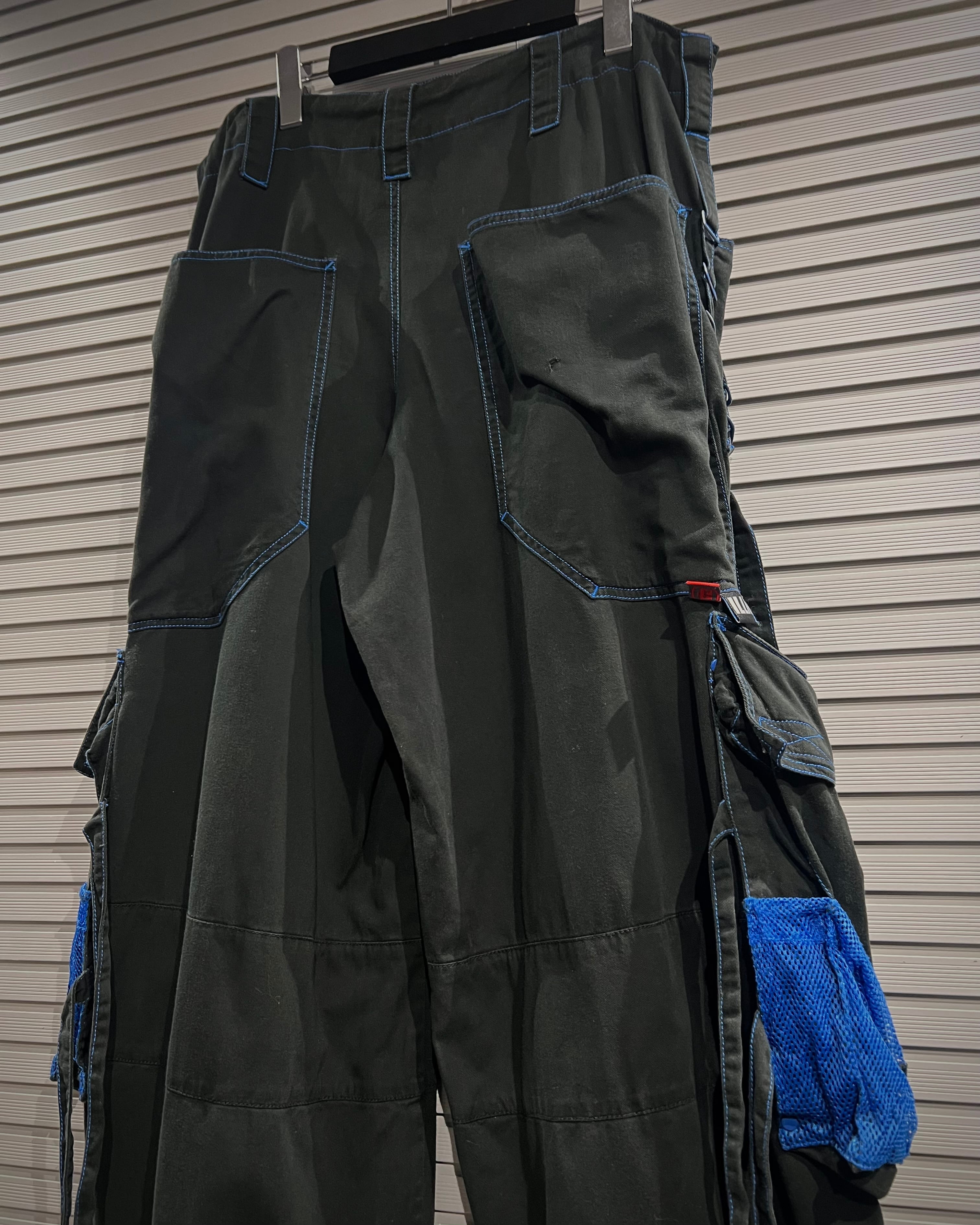 ブラックを基調としたコットンボディに、随所へ配置された立体的なカーゴポケットとストラップディテール。UKテクのパンツを彷彿とするギミックの数々の中に、ブルーのステッチやメッシュポケットが映える、ILLIGらしい攻めたデザインが印象的です。