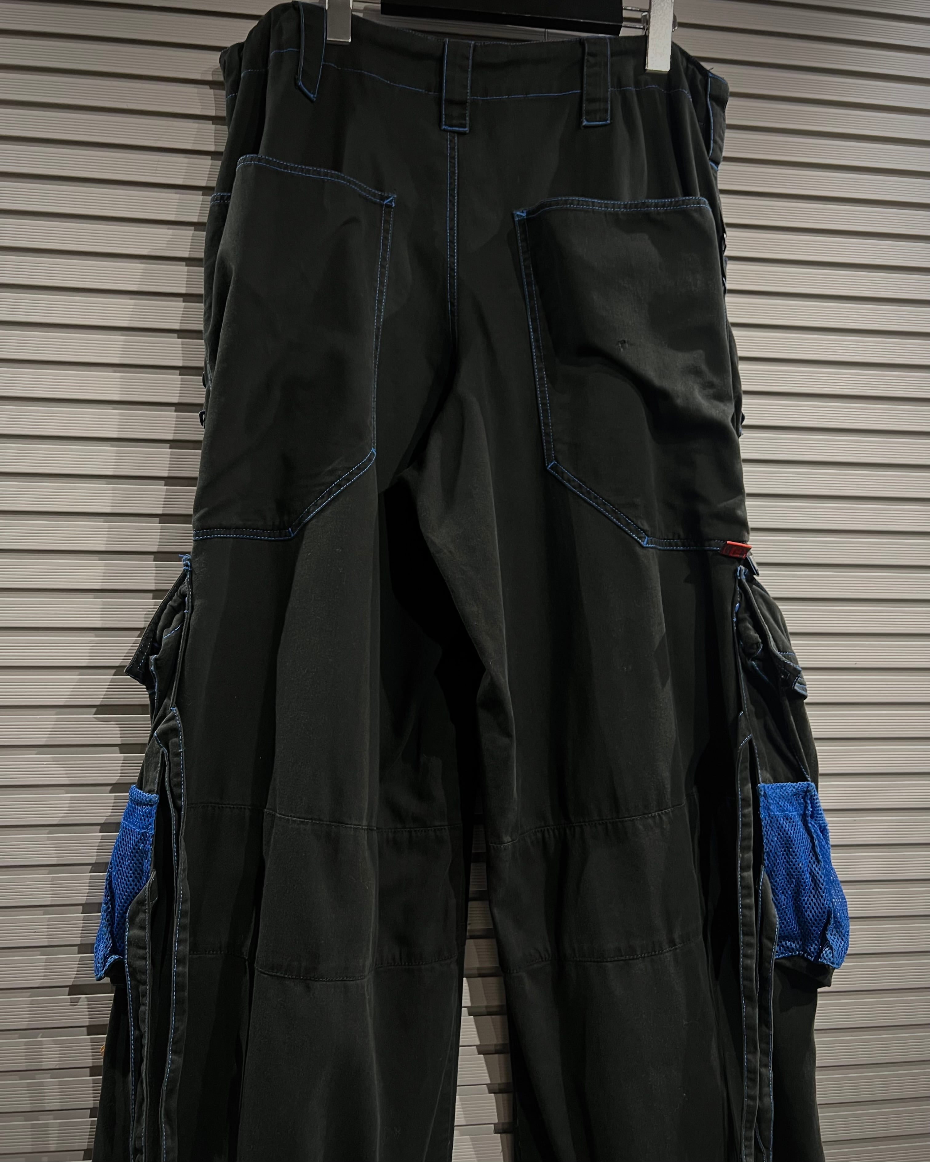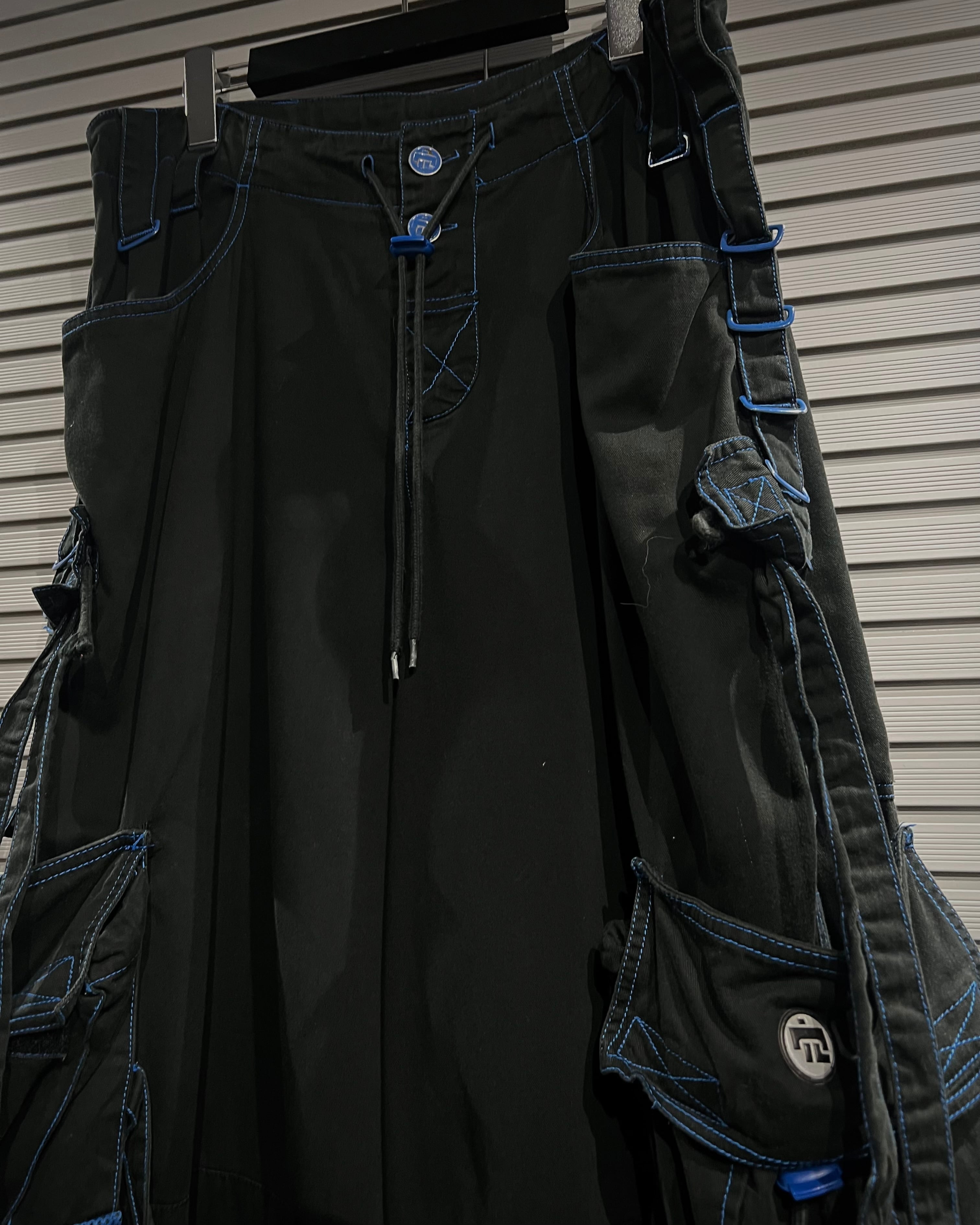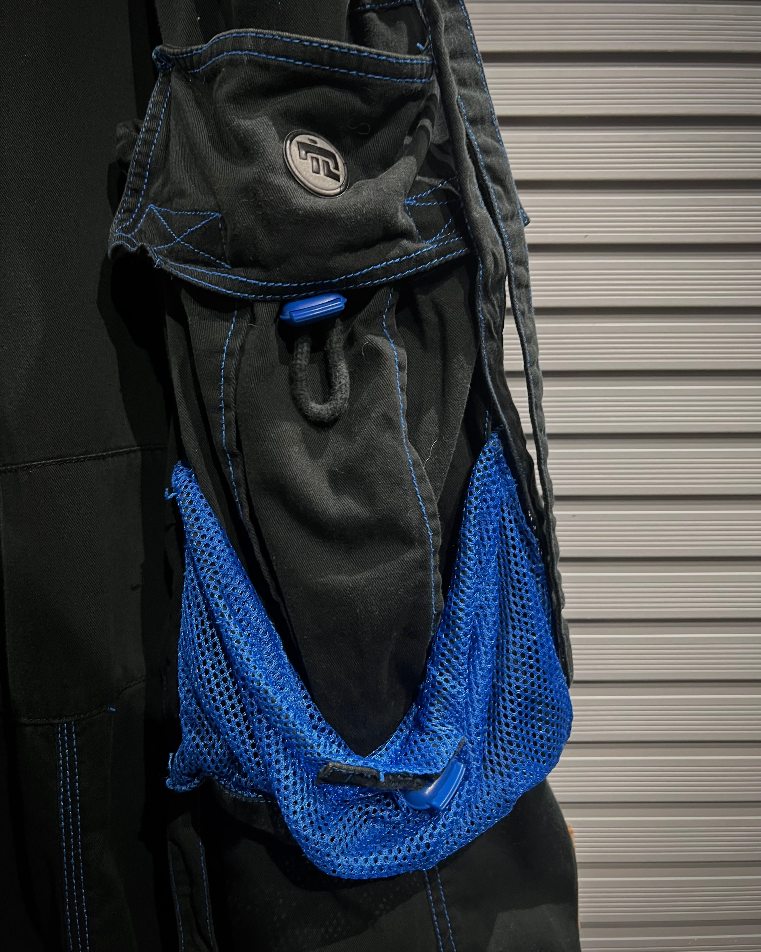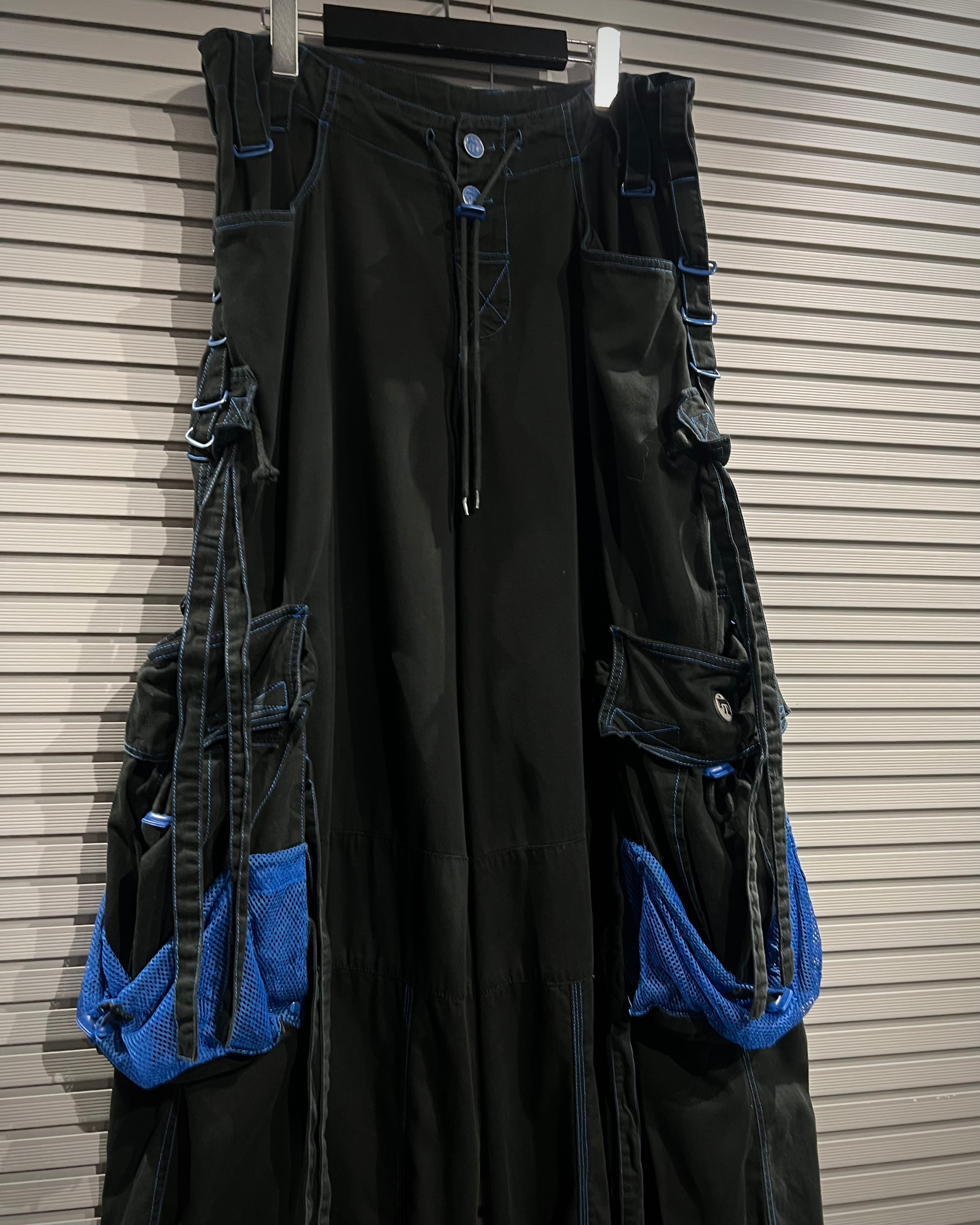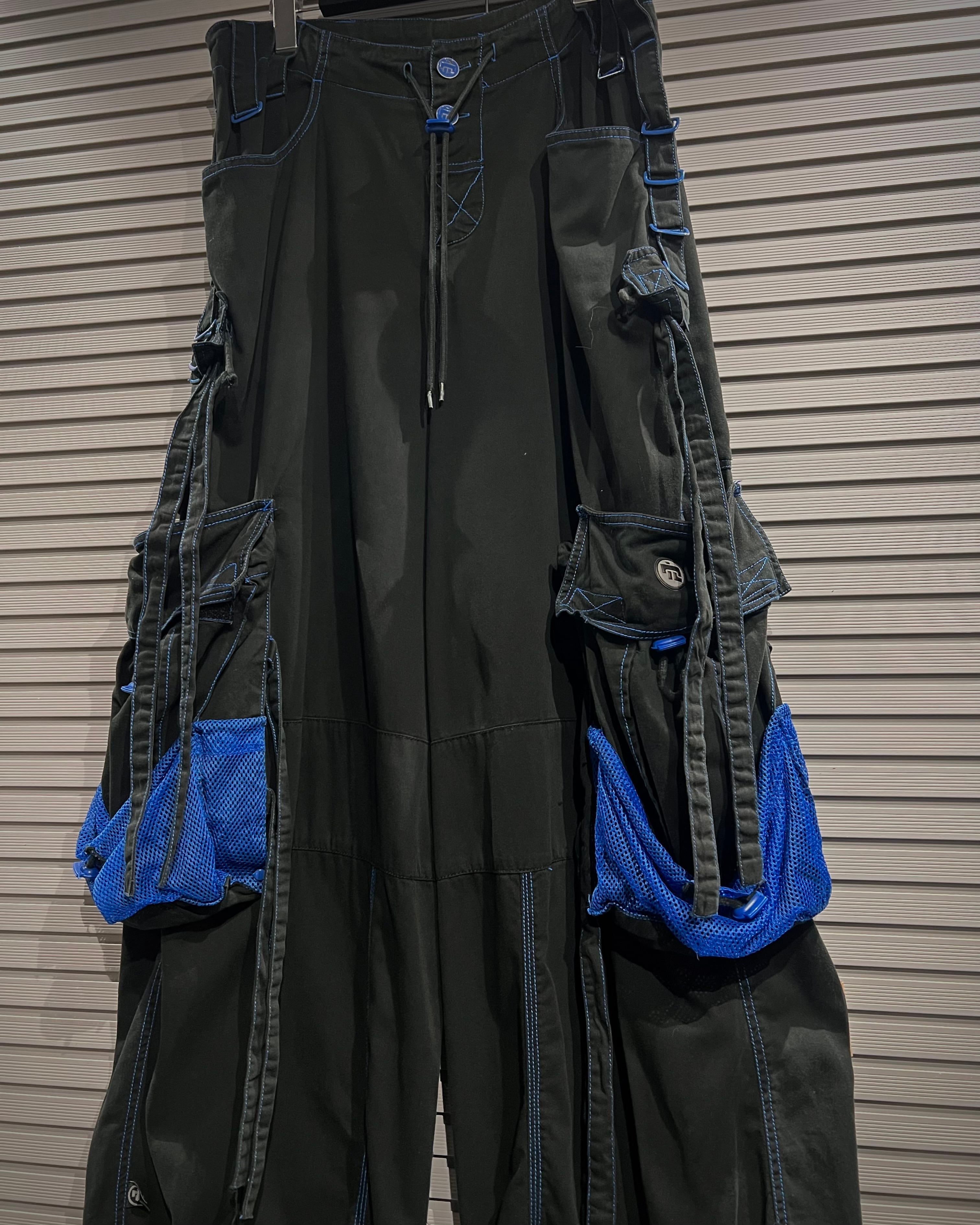 ブラックを基調としたコットンボディに、随所へ配置された立体的なカーゴポケットとストラップディテール。UKテクのパンツを彷彿とするギミックの数々の中に、ブルーのステッチやメッシュポケットが映える、ILLIGらしい攻めたデザインが印象的です。
