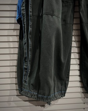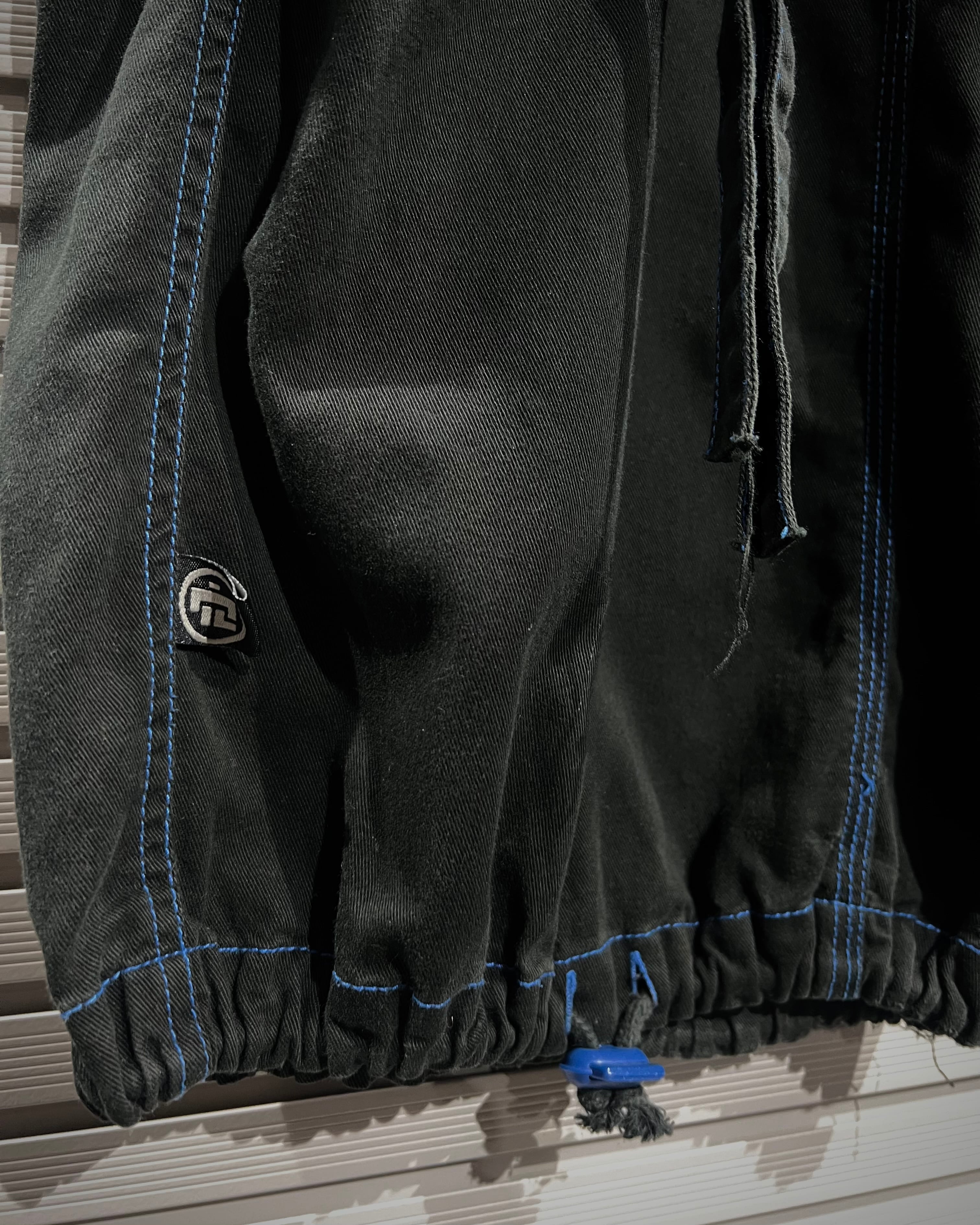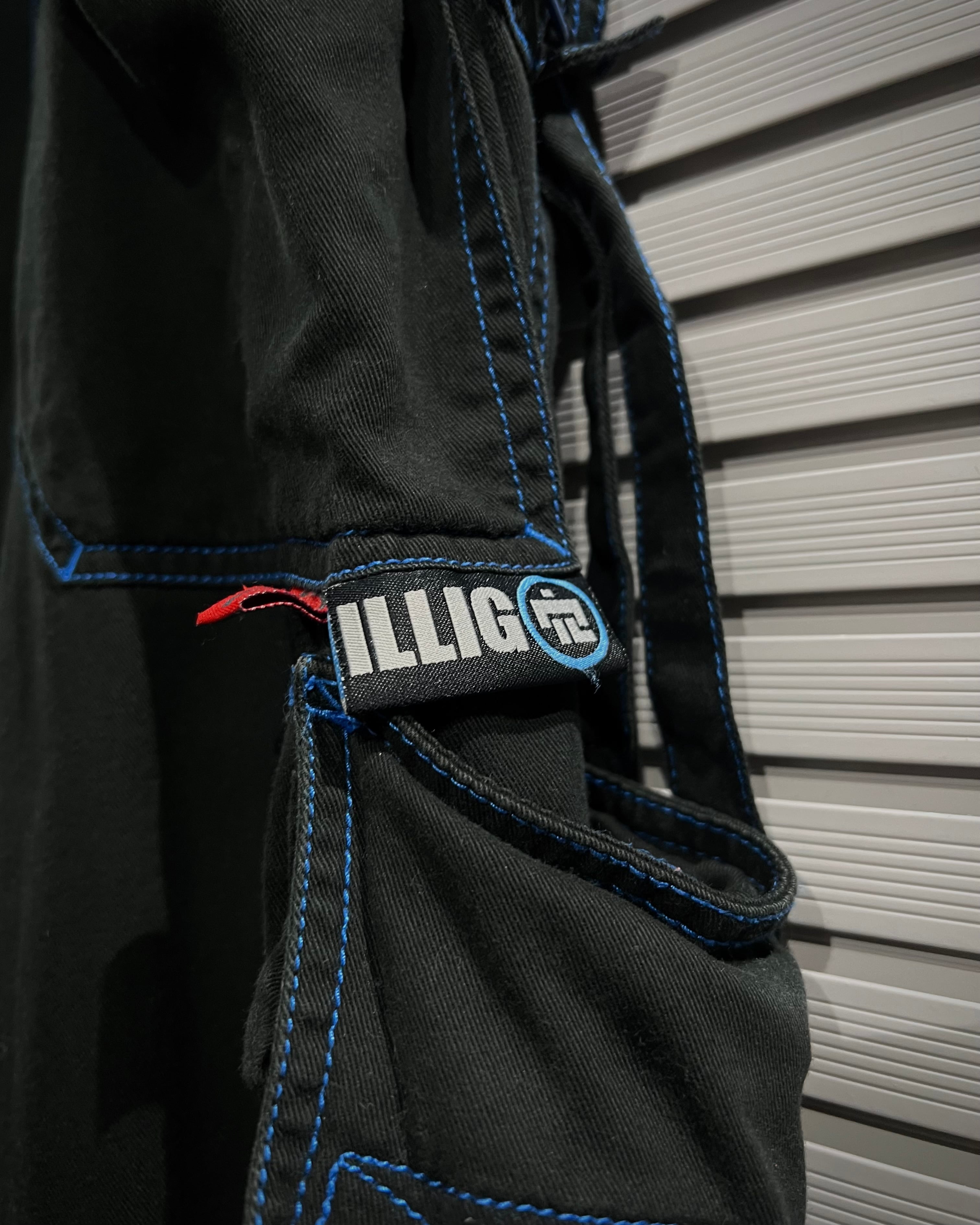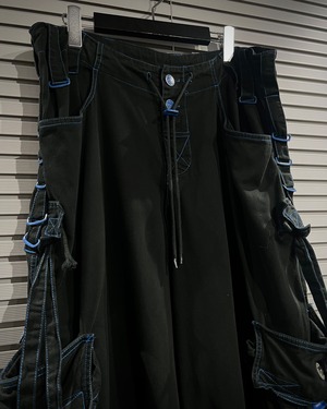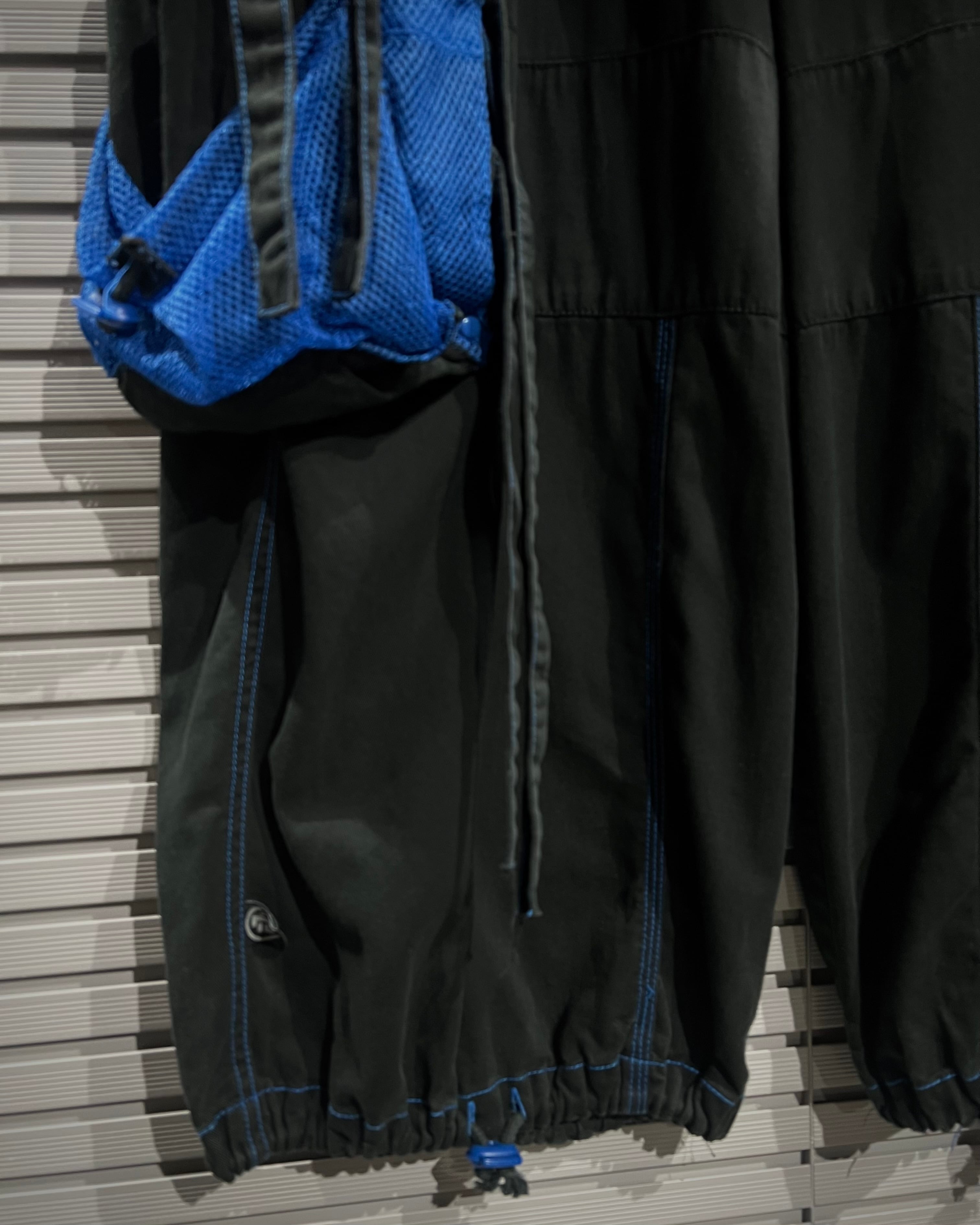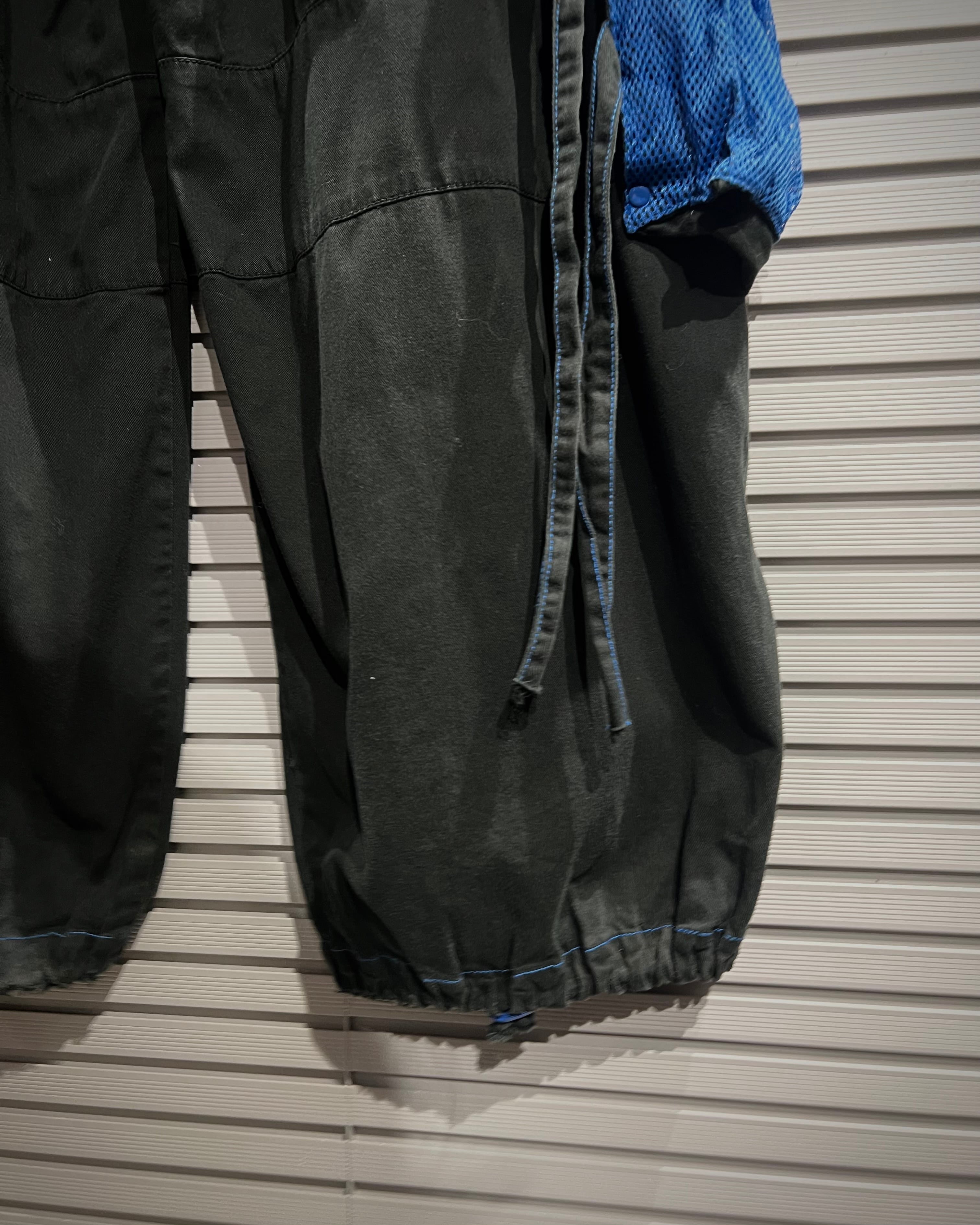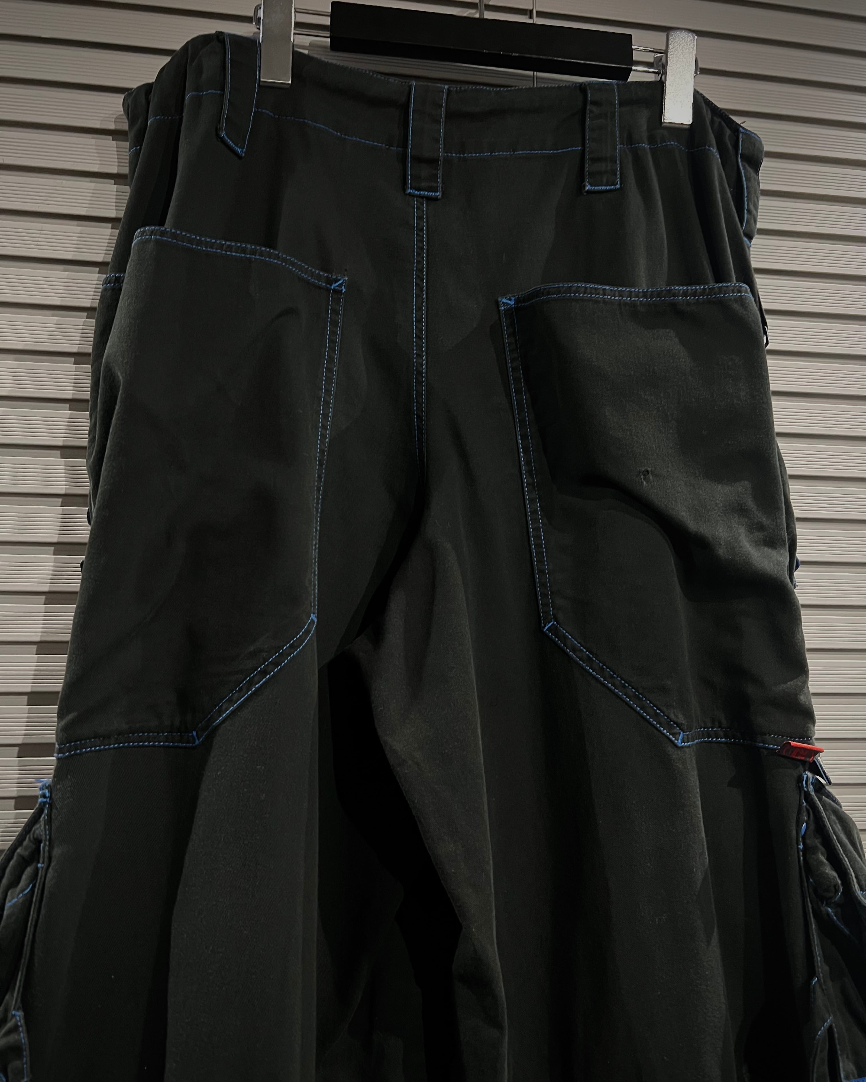 ブラックを基調としたコットンボディに、随所へ配置された立体的なカーゴポケットとストラップディテール。UKテクのパンツを彷彿とするギミックの数々の中に、ブルーのステッチやメッシュポケットが映える、ILLIGらしい攻めたデザインが印象的です。